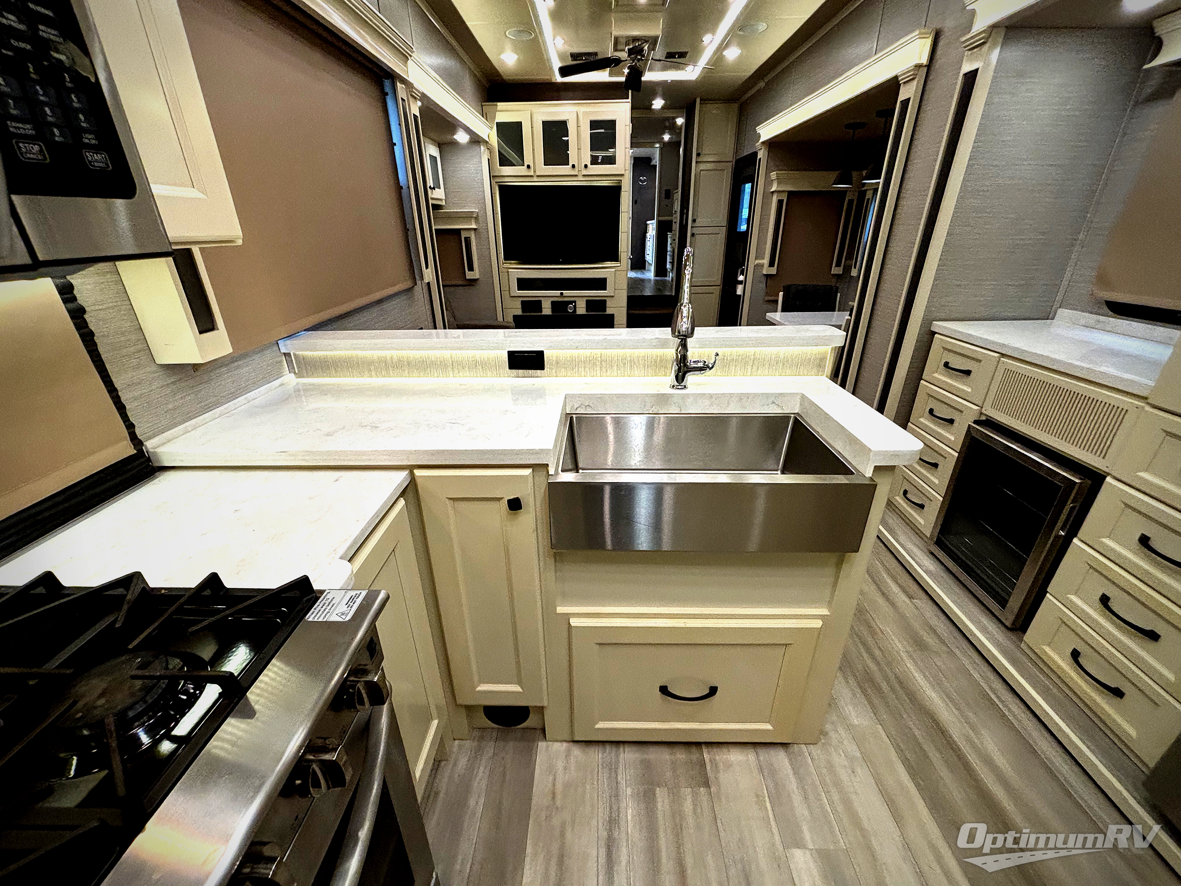 Each Beacon fifth wheel by VanLeigh RV is made with your comfort in mind. From the high-quality Franklin furniture, made in the U.S.A, to the Cool Gel Memory Foam mattress, it's easy to find luxury features at every turn. There is a galley window in each model so you will have a view of the great outdoors as you clean up, and each kitchen includes a stainless steel farm sink, a hand-built pantry to store all your items, plus an LG residential refrigerator with ice and water in the door. You will love the sleek look of the full overlay hardwood cabinetry and faceferames, the hand laid vinyl tile flooring throughout, and the hardwood ceiling decor with recessed LED lighting. Plan to travel year around with the Whisper Quiet A/C system, the 42,000 BTU furnace, and the 7,200 BTU electric fireplace, plus each model is constructed with a fully enclosed and heated underbelly with heat return. The outside of the Beacon features two patio awnings on slide boxes, an LED lighting system, plus dual exterior speakers to keep the party going day or night!
