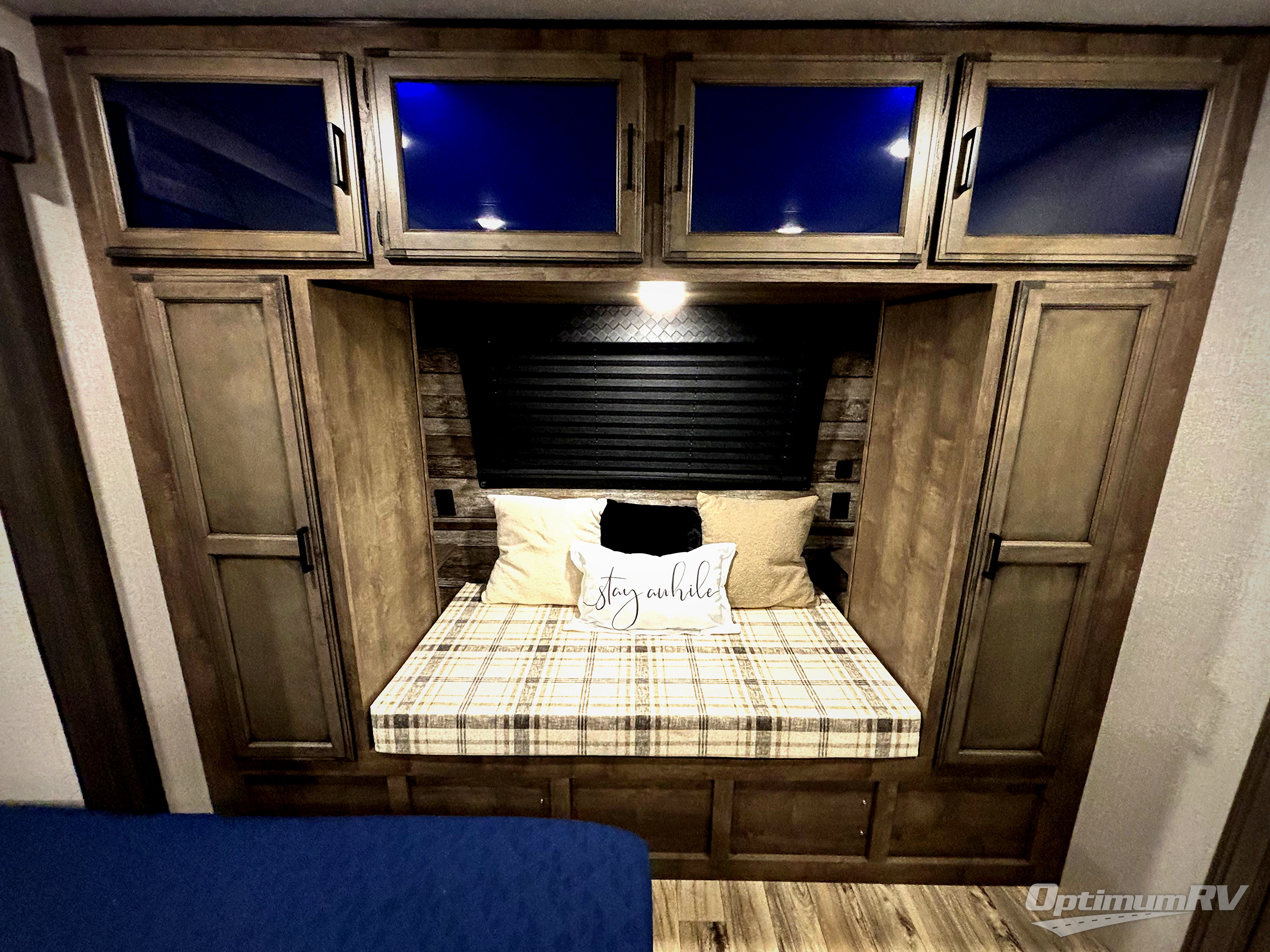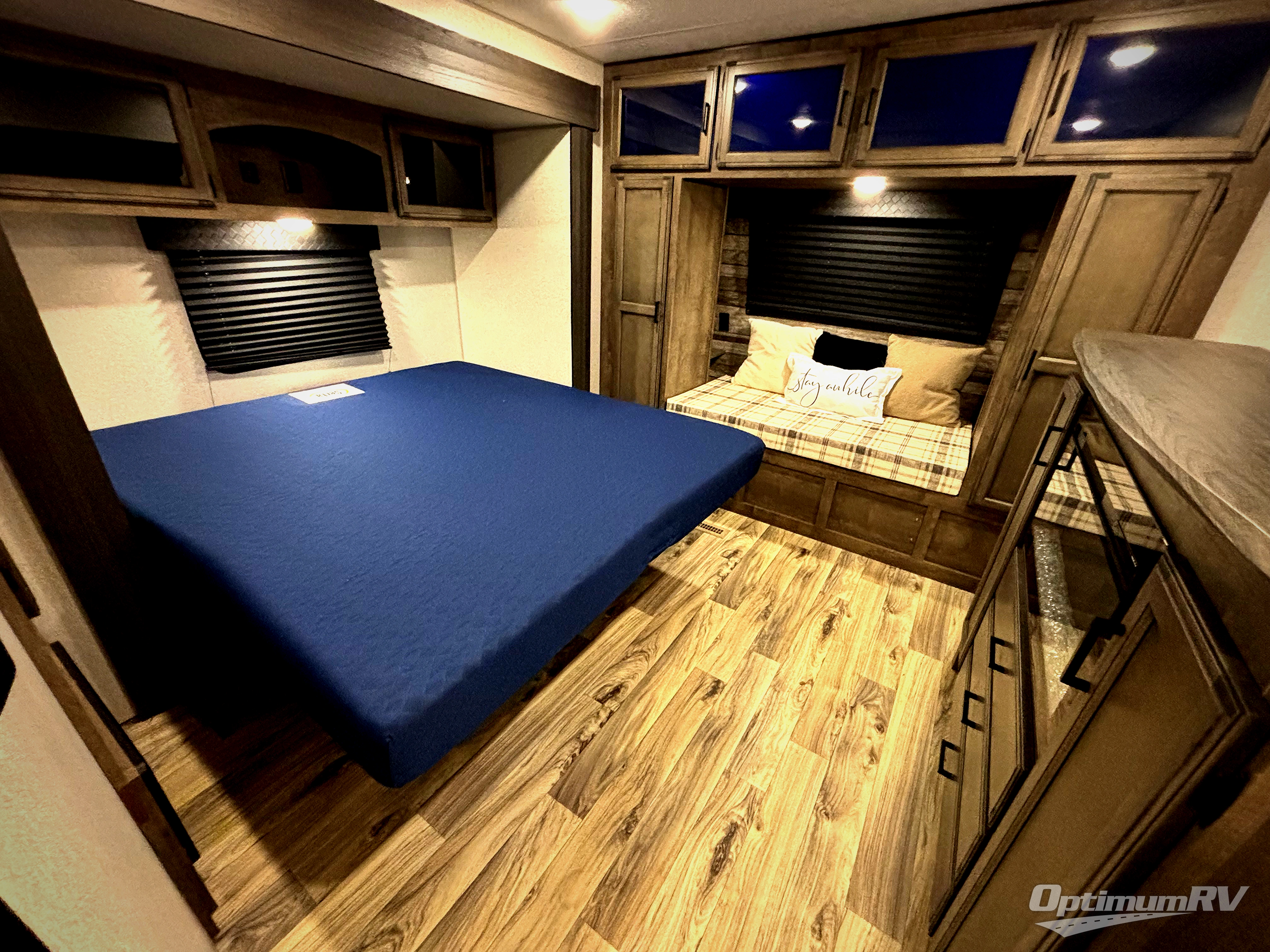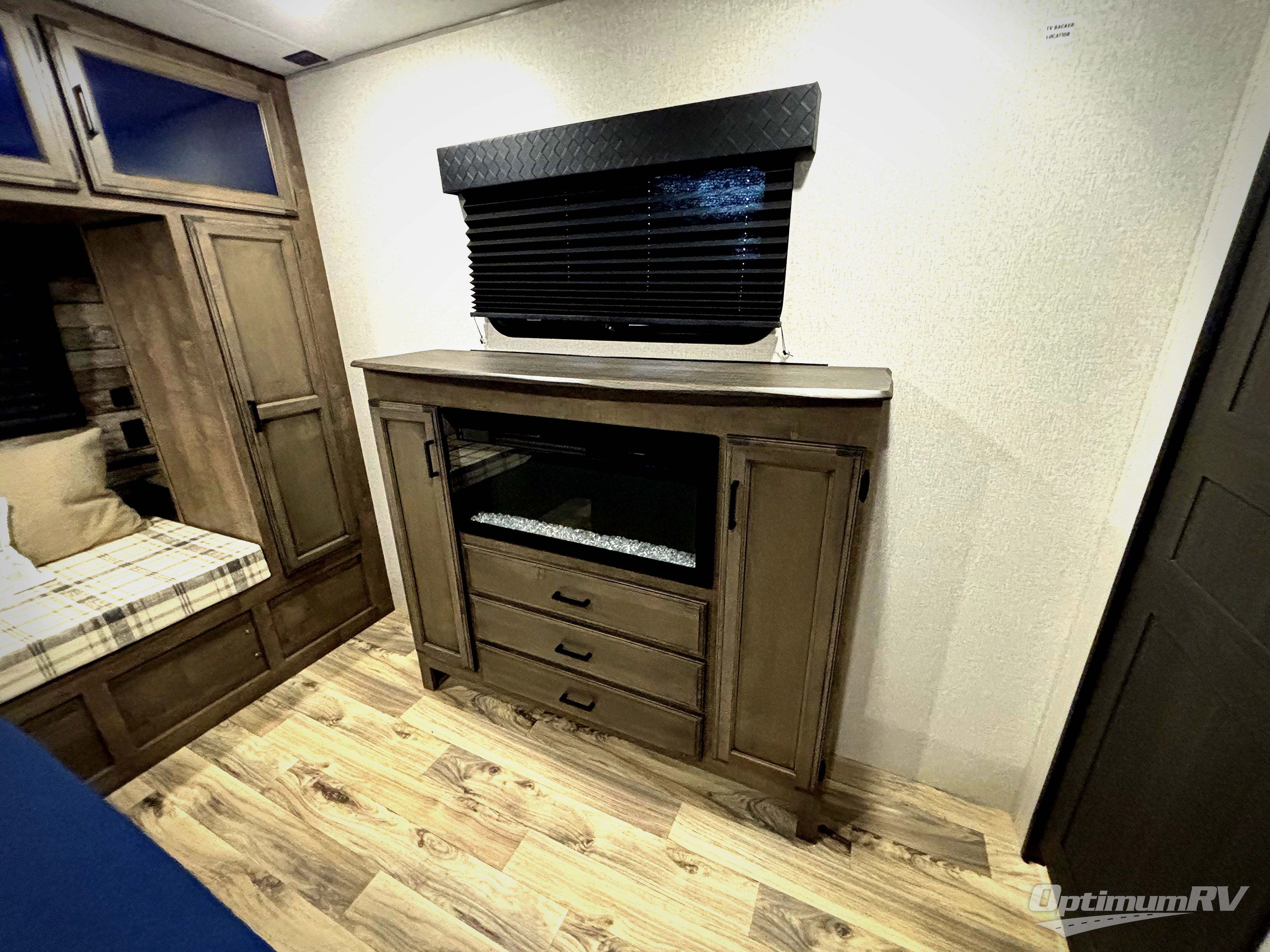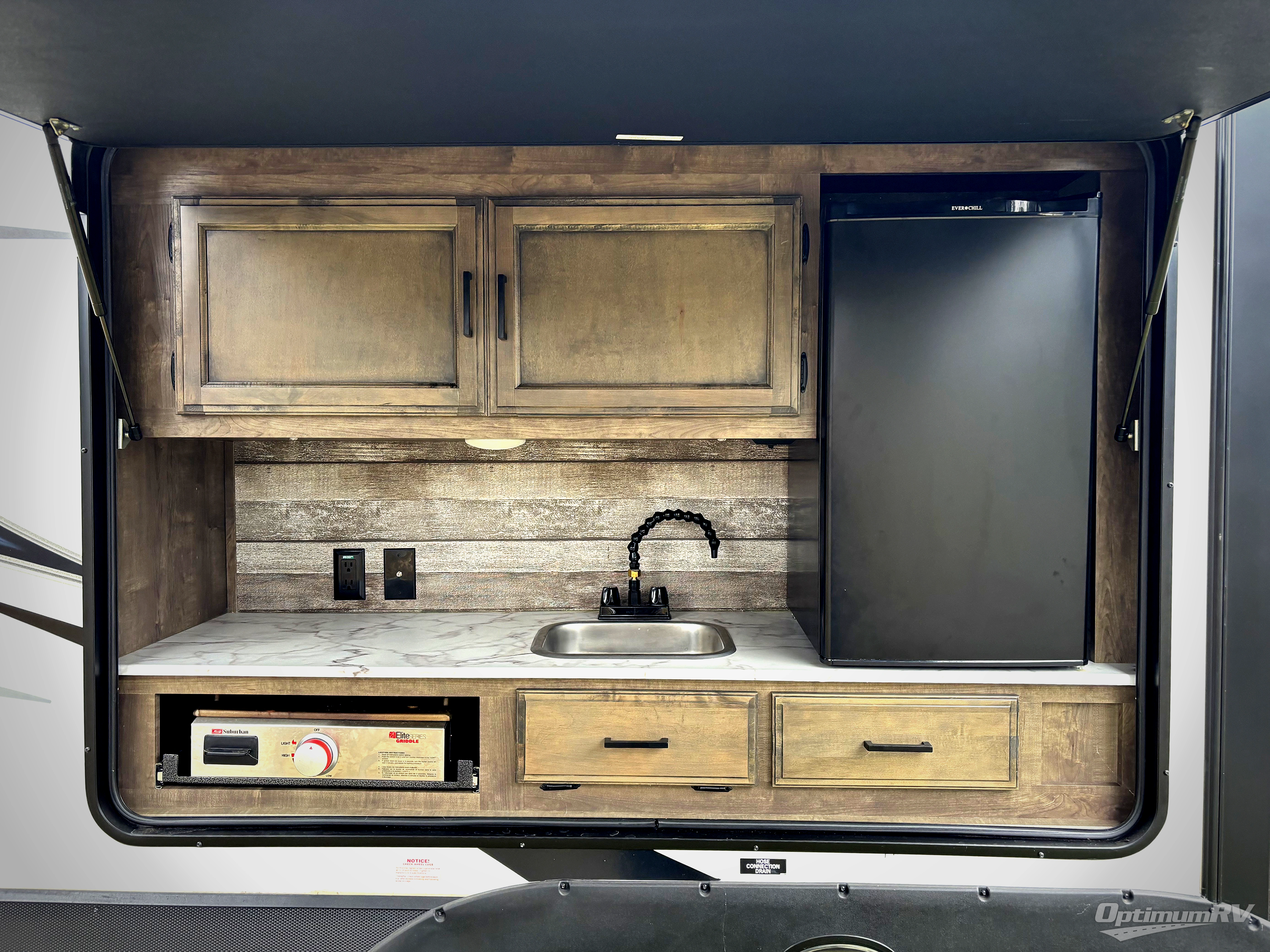 It's a clean decision with a bath and a half to take this travel trailer on your next camping trip! The rear private bunkhouse is decked out with a 28" x 70" bunk bed, a 32" x 70" top bunk, a 28" x 73" flip-up bunk above a 72" sofa with table, and a flip desk to do some school work. The half bathroom has an entrance/exit door so you can get back to cooking at the outdoor campfire café which has two 3 cu. ft. refrigerators, a sink, a griddle, and storage. Your clean up will be a breeze thanks to the kitchen island with a large sink and dish drying sink cover. If you need extra sleeping space then simply convert the 42" grand dinette and 70" sofa into sleeping spaces. Those staying in the front private bedroom will enjoy a good night's rest on the sleep tight queen bed and have the convenience of accessing the dual entry bathroom!