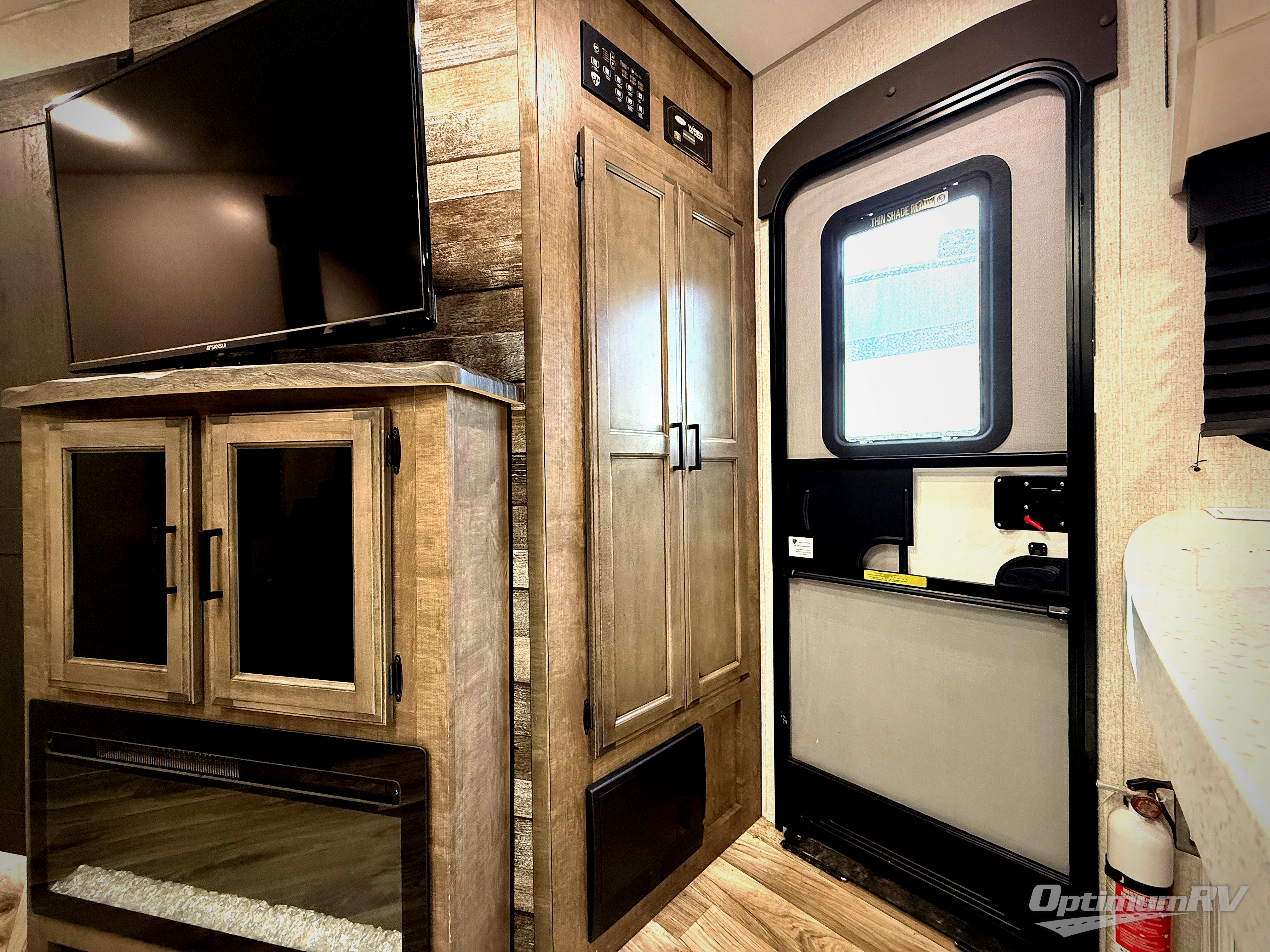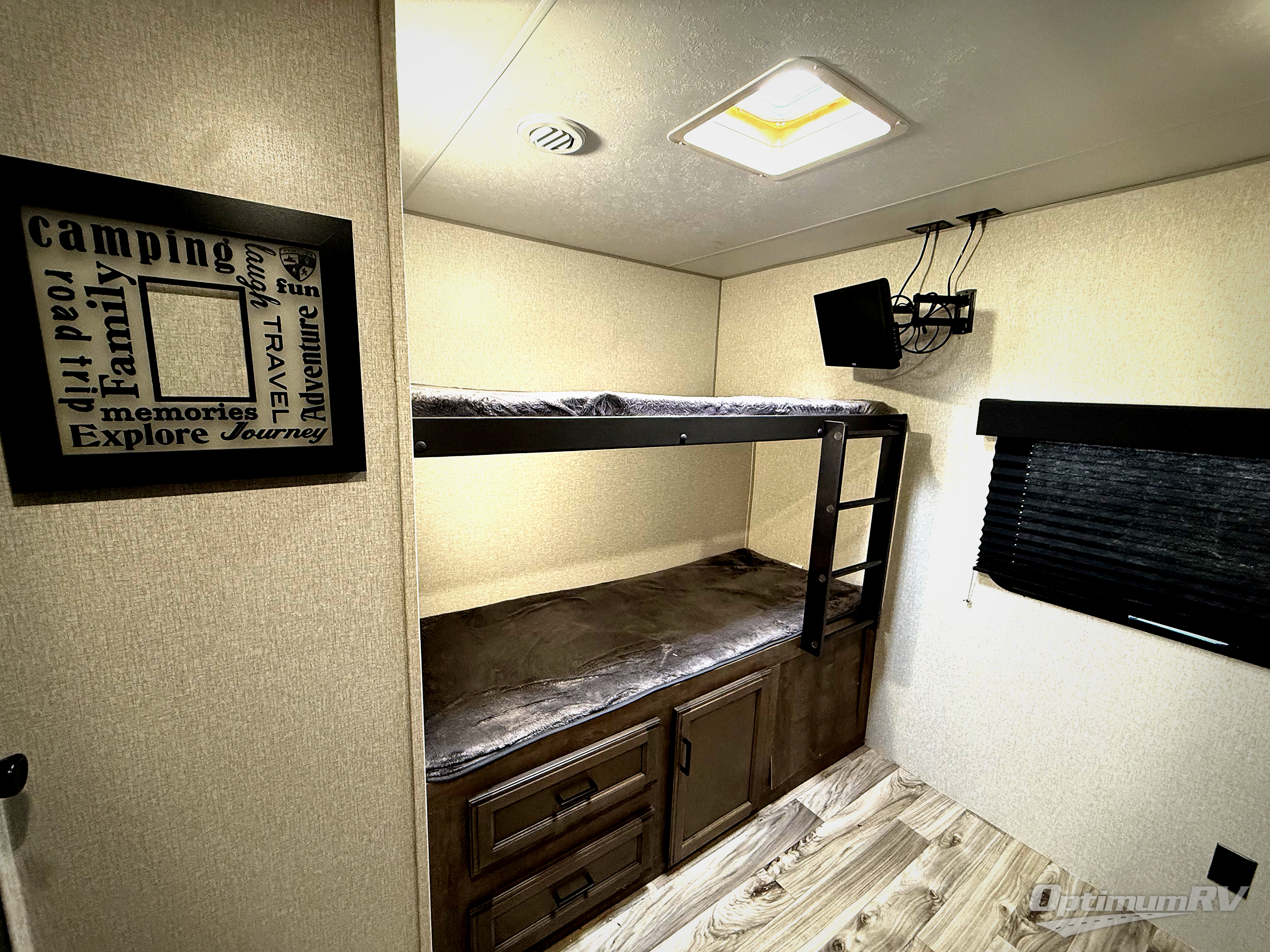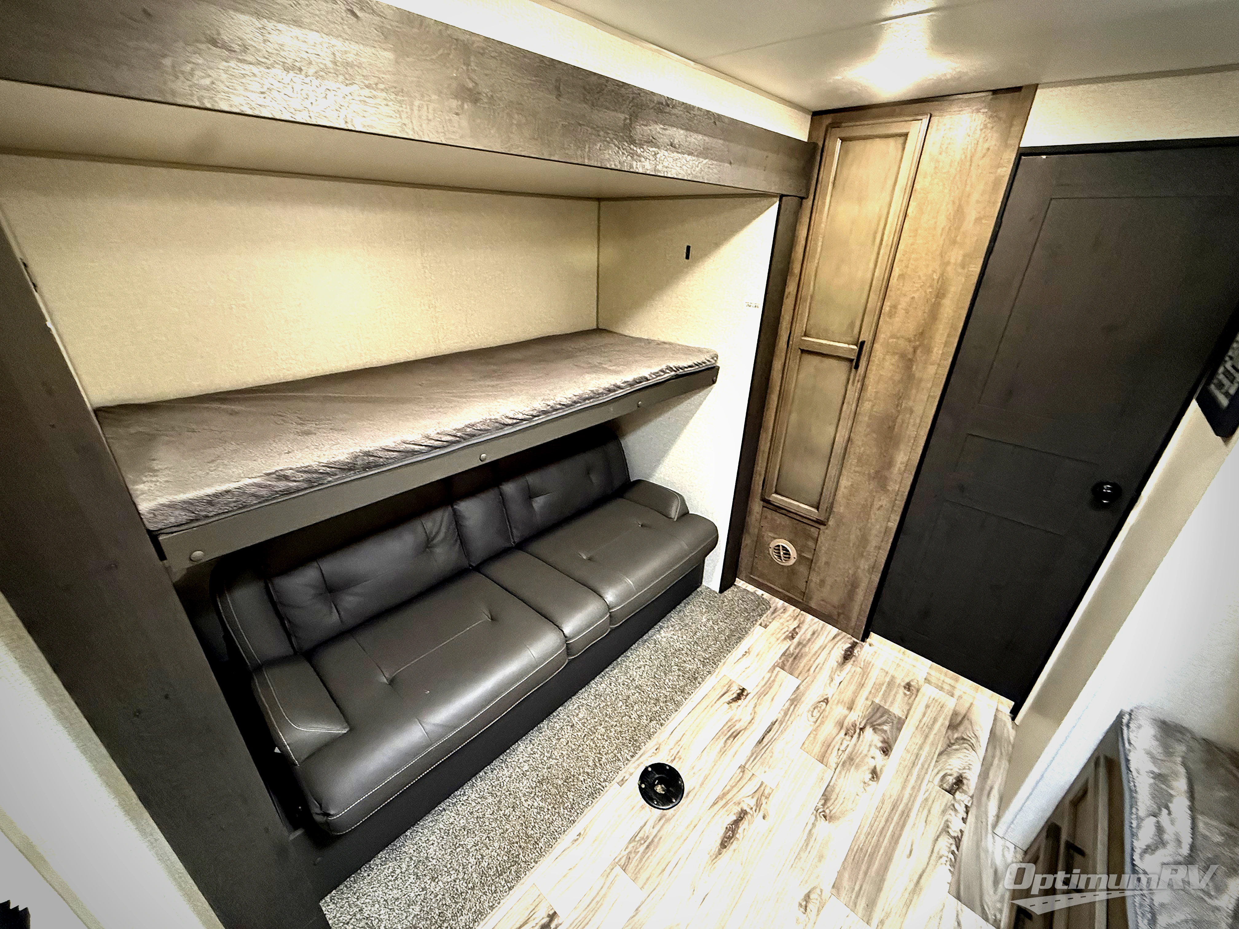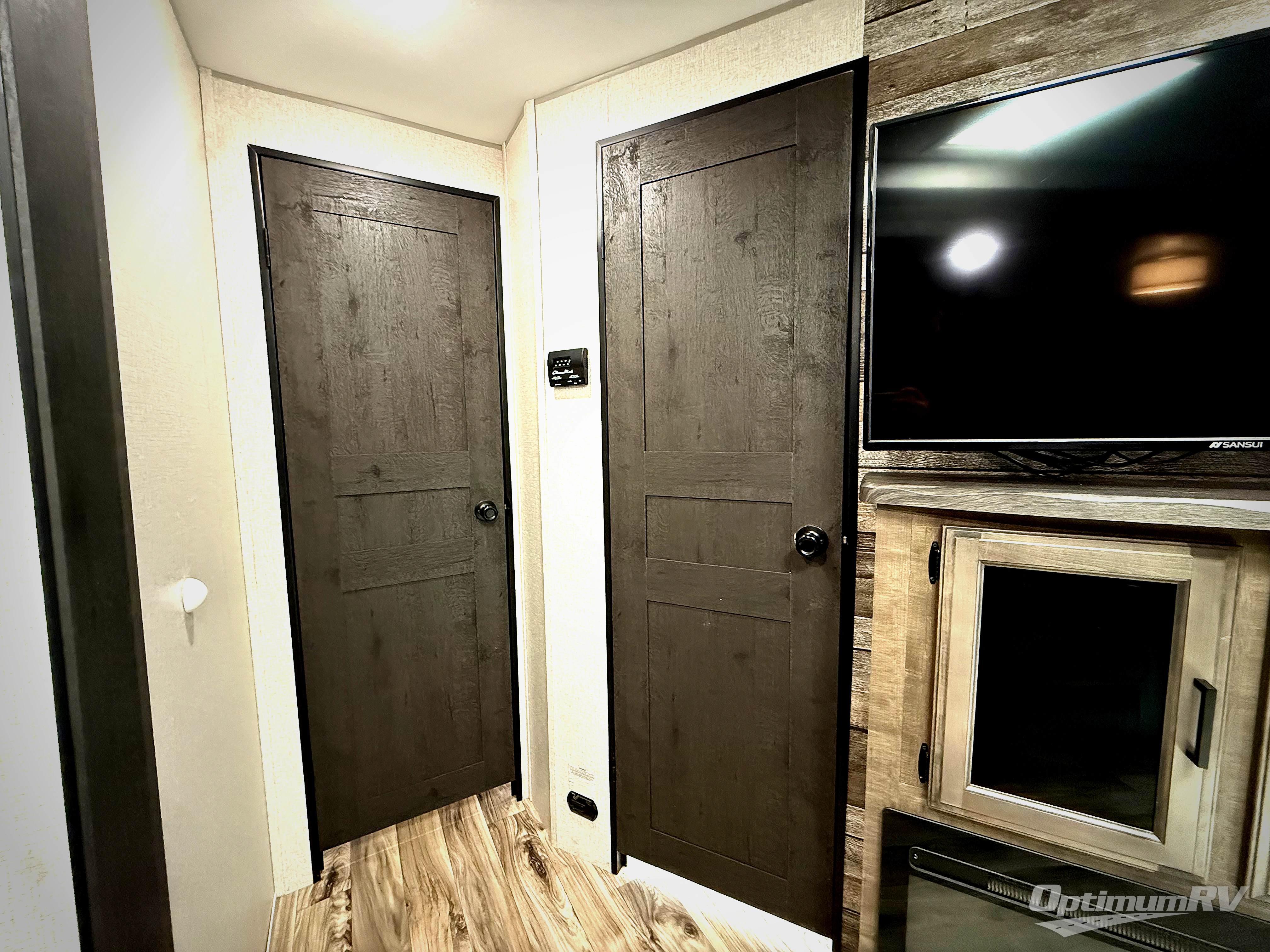 The whole family can camp together in this travel trailer! It features a rear private bunkhouse with a 28" x 70" top bunk above a 40" x 70" bottom bunk, a closet, and a 28" x 73" flip up top bunk above a 70" sofa with table slide. One of the dual entry doors leads directly into the half bathroom with fold-out aluminum steps so you can get back to having fun faster. The chef can prepare their best meals for the crew either indoors with the three burner cooktop or at the exterior campfire café with a 40" TV/DVD/speakers to entertain them while they cook. Everyone can gather together at the 42" grand dinette and 70" tri-fold sofa across from the entertainment center with a fireplace for a cozy evening. The dual entry bathroom is easy to access, especially for those staying in the front private bedroom. You even have a coat closet next to the main entrance to limit the clutter!