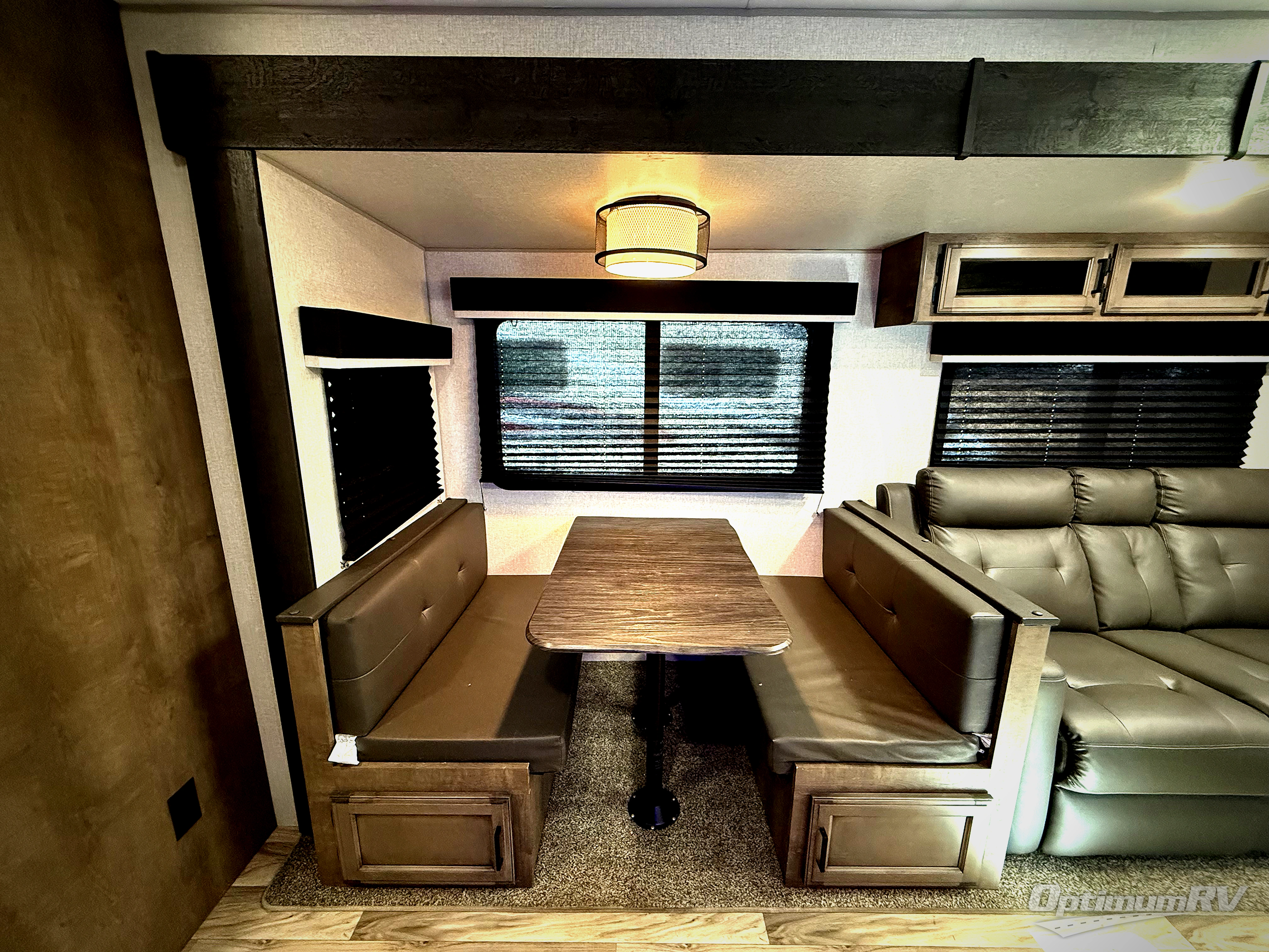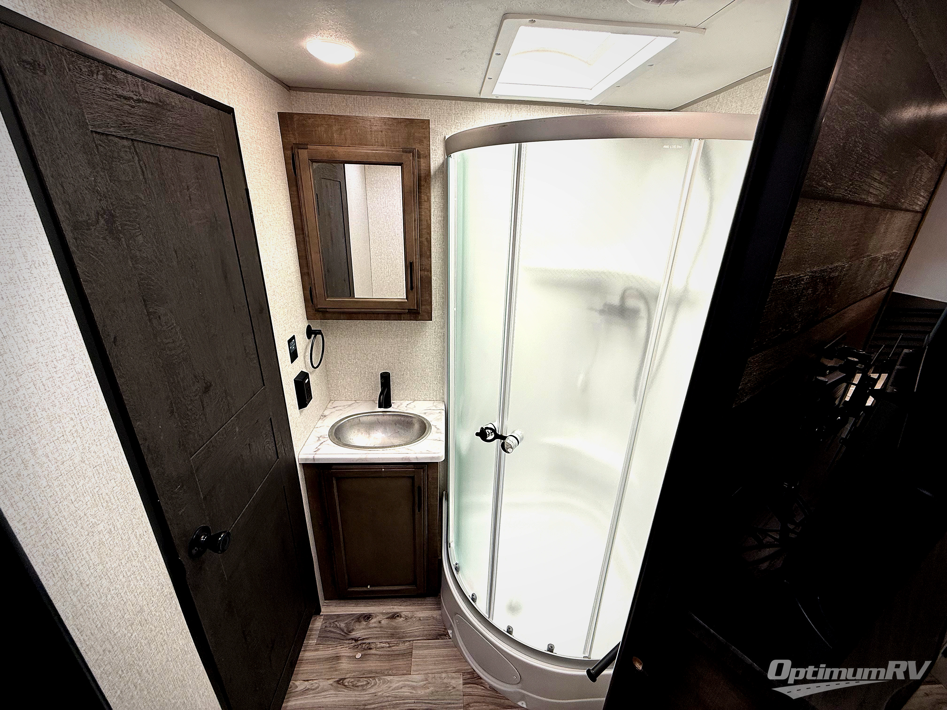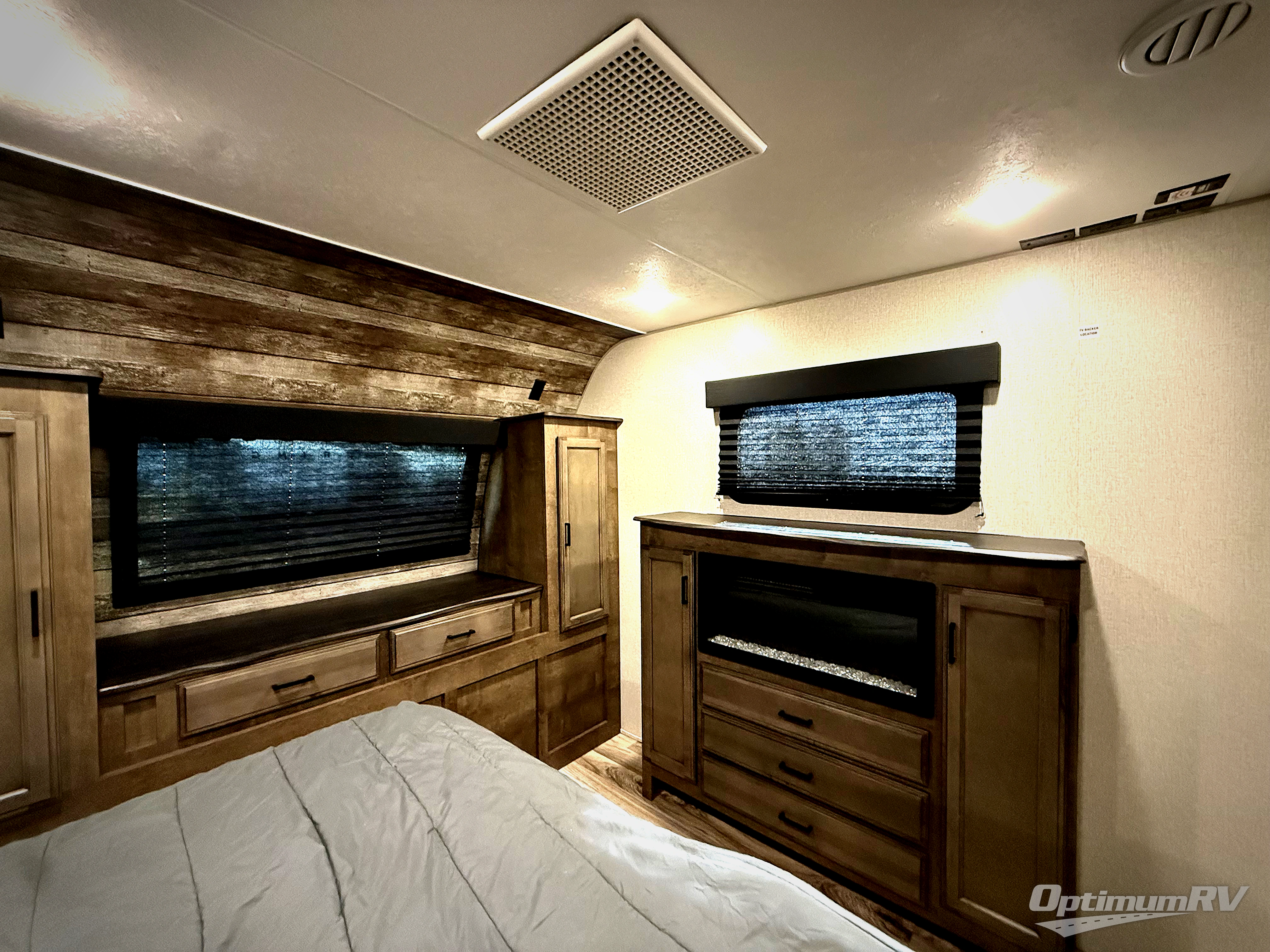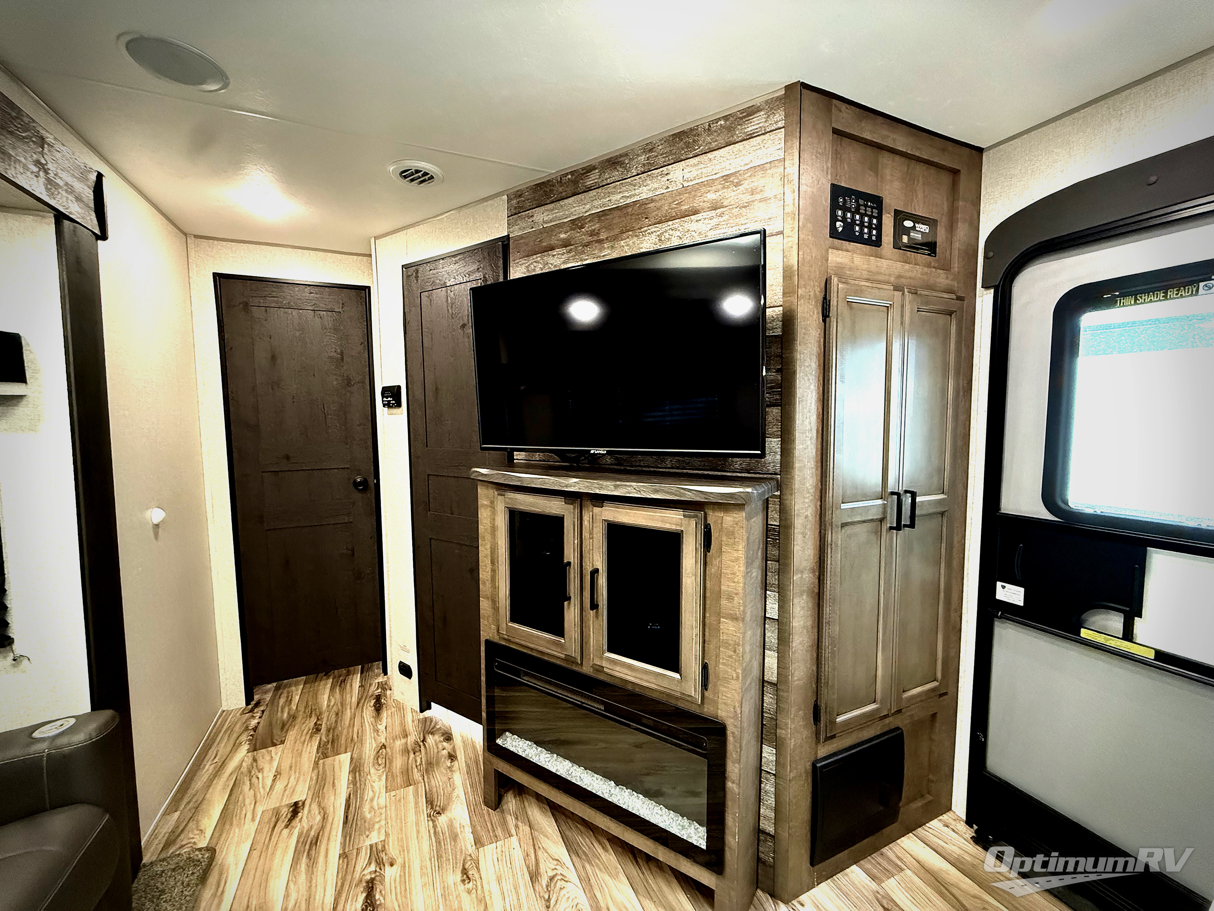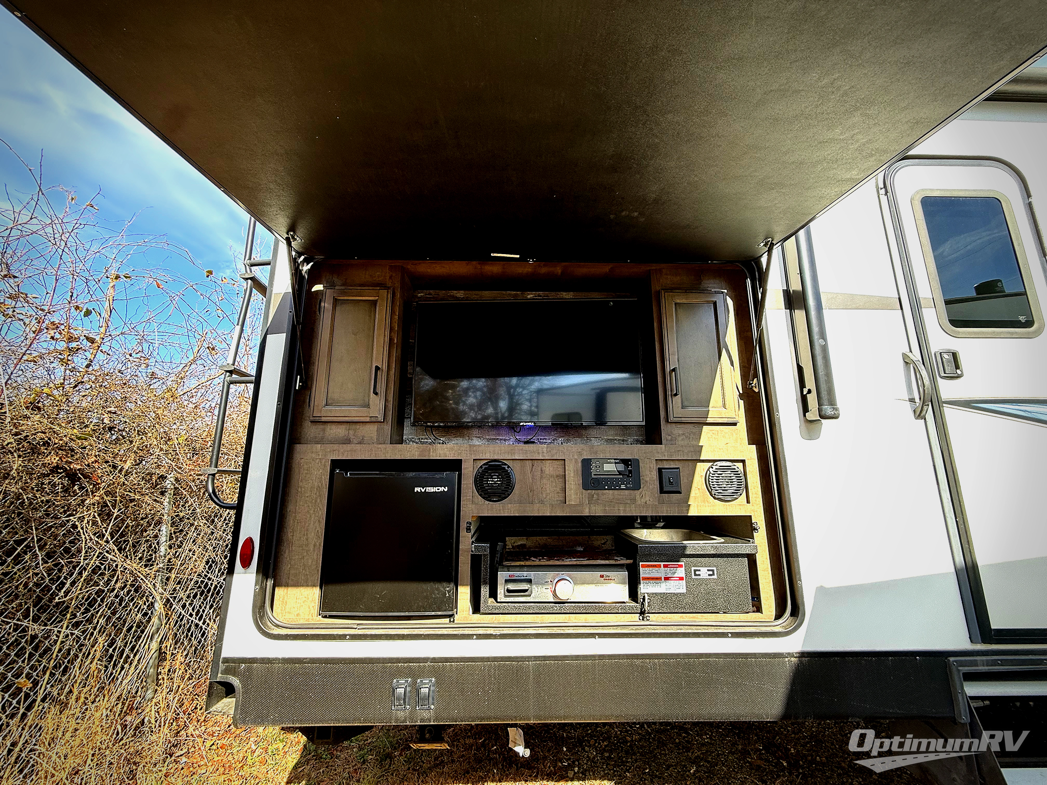 The whole family can camp together in this travel trailer! It features a rear private bunkhouse with a 28" x 70" top bunk above a 40" x 70" bottom bunk, a closet, and a 28" x 73" flip up top bunk above a 70" sofa with table slide. One of the dual entry doors leads directly into the half bathroom with fold-out aluminum steps so you can get back to having fun faster. The chef can prepare their best meals for the crew either indoors with the three burner cooktop or at the exterior campfire café with a 40" TV/DVD/speakers to entertain them while they cook. Everyone can gather together at the 42" grand dinette and 70" tri-fold sofa across from the entertainment center with a fireplace for a cozy evening. The dual entry bathroom is easy to access, especially for those staying in the front private bedroom. You even have a coat closet next to the main entrance to limit the clutter!