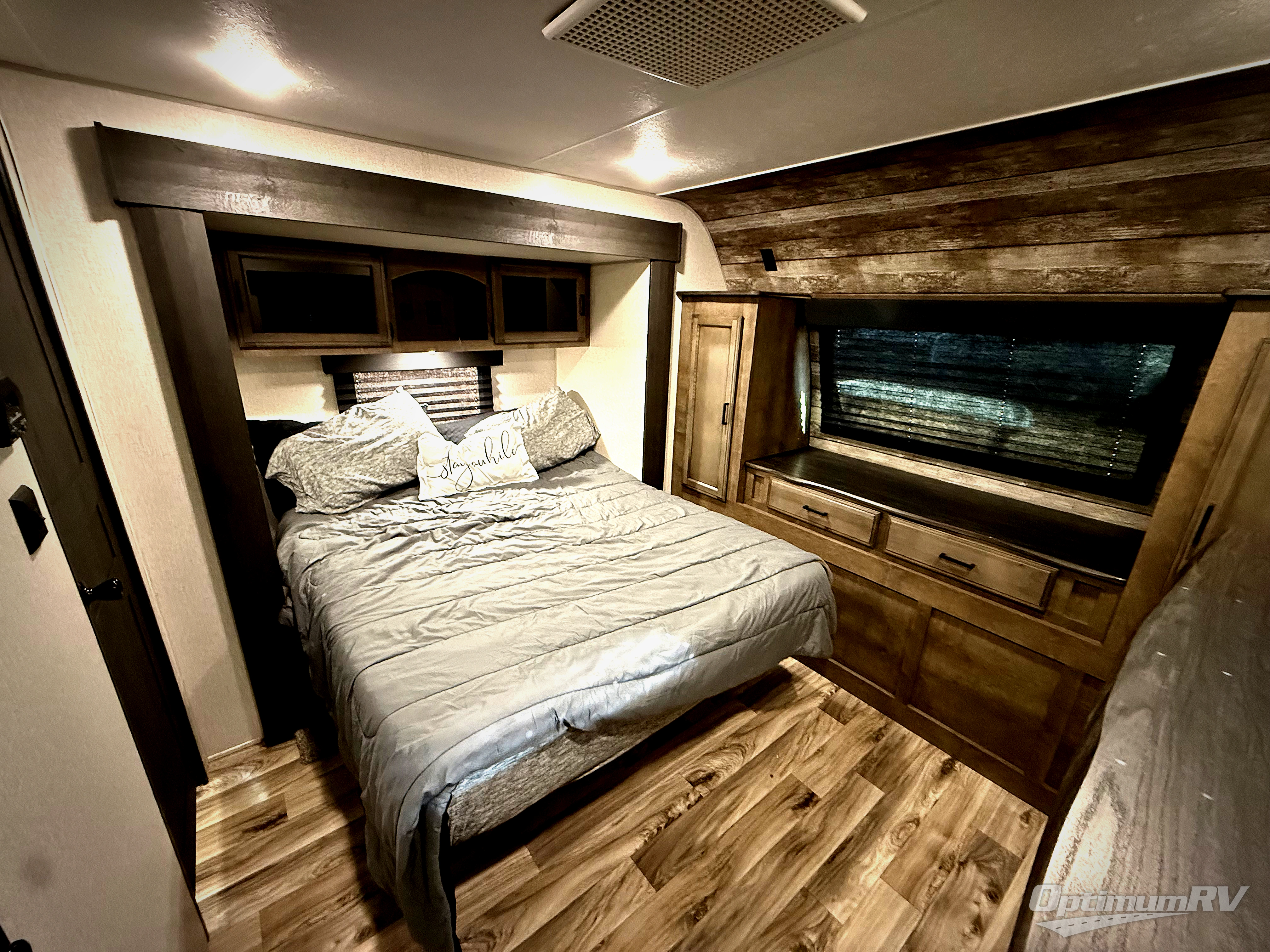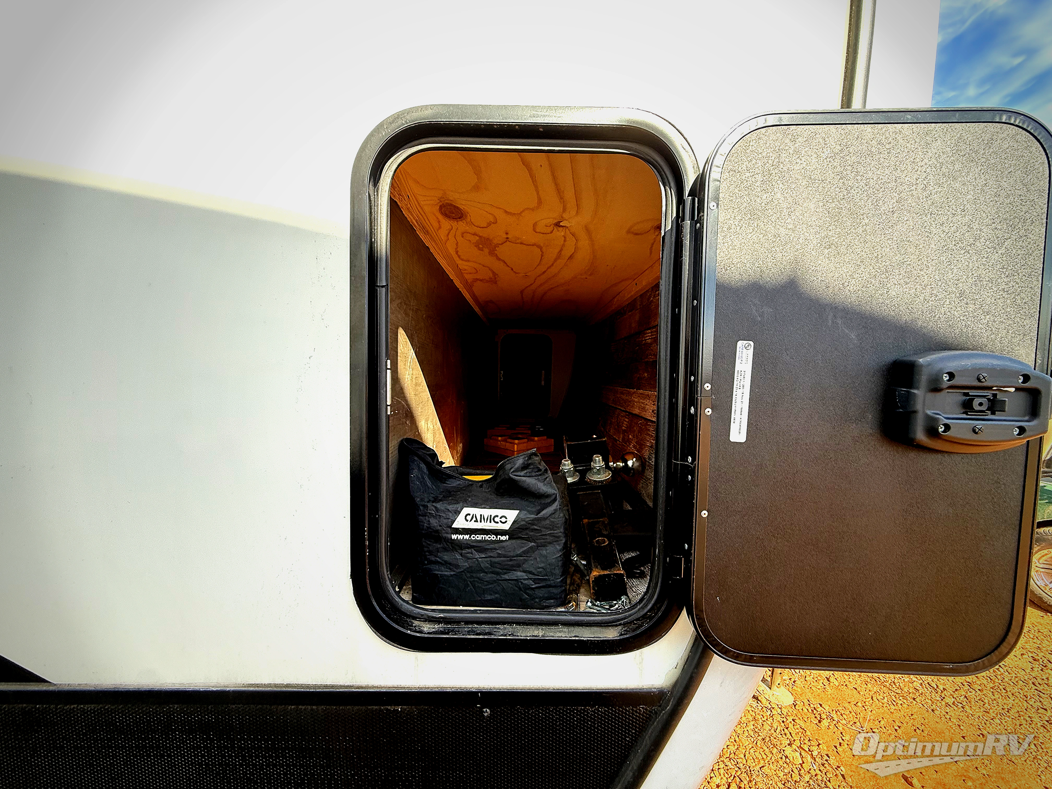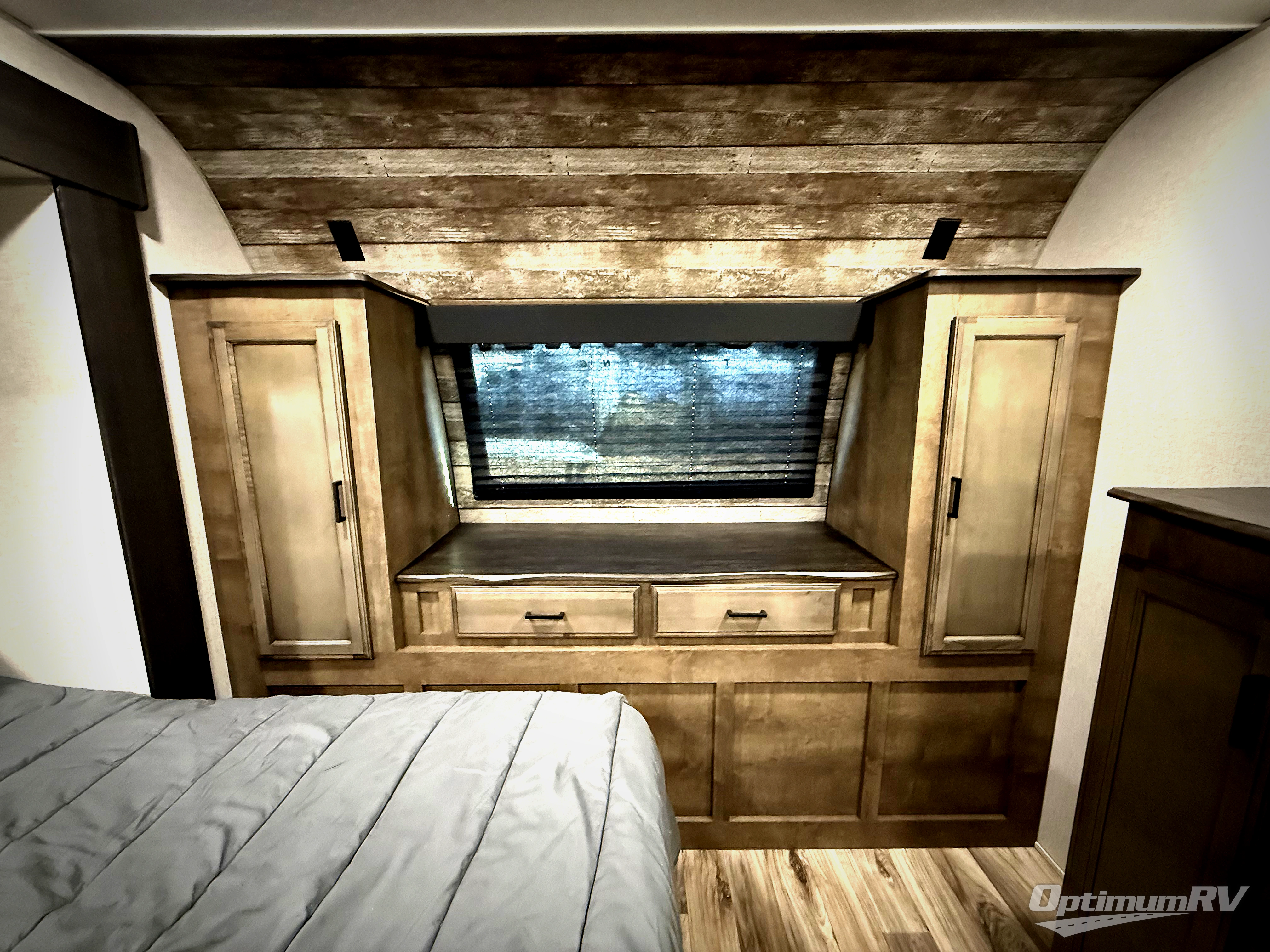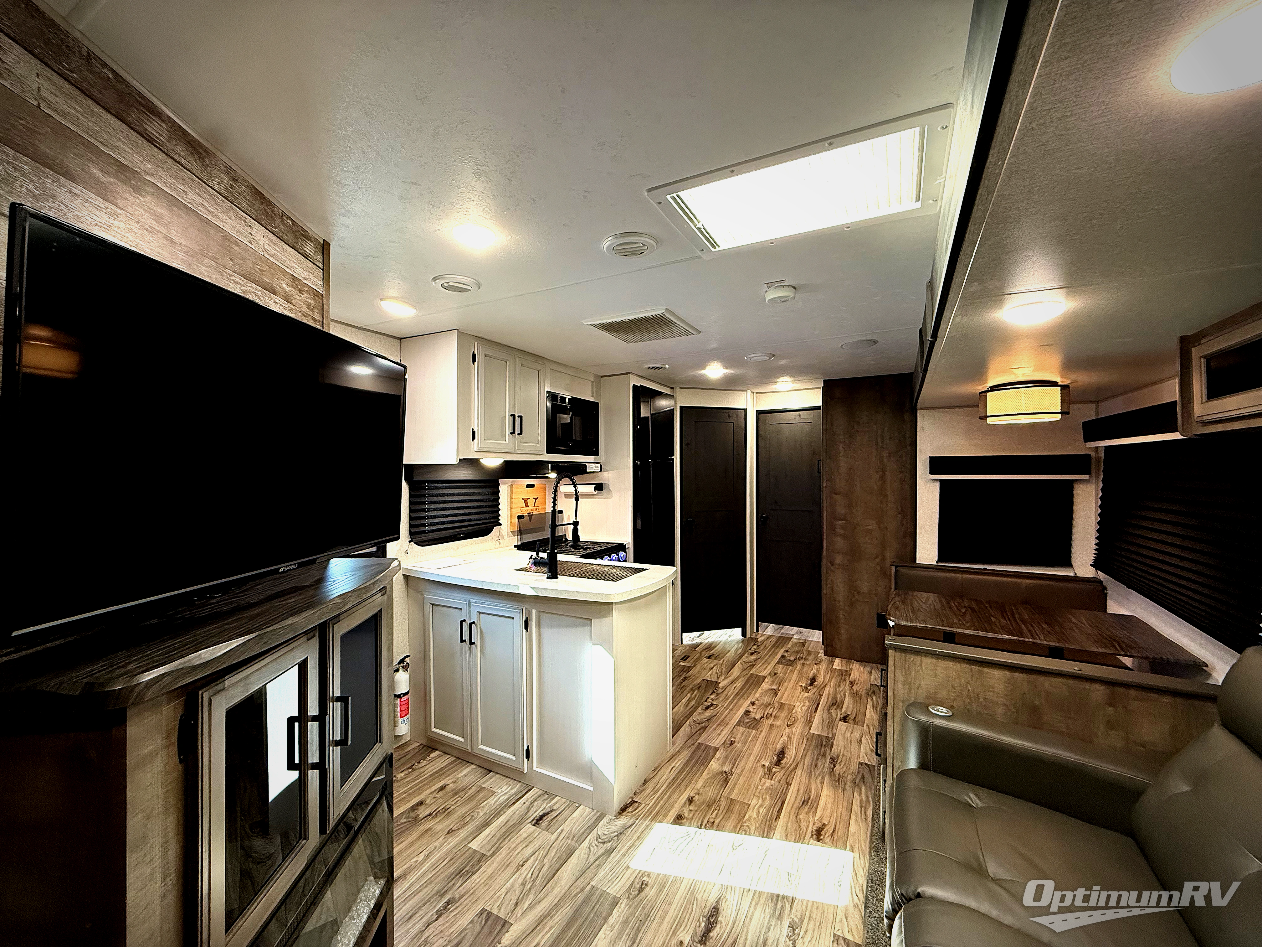 The whole family can camp together in this travel trailer! It features a rear private bunkhouse with a 28" x 70" top bunk above a 40" x 70" bottom bunk, a closet, and a 28" x 73" flip up top bunk above a 70" sofa with table slide. One of the dual entry doors leads directly into the half bathroom with fold-out aluminum steps so you can get back to having fun faster. The chef can prepare their best meals for the crew either indoors with the three burner cooktop or at the exterior campfire café with a 40" TV/DVD/speakers to entertain them while they cook. Everyone can gather together at the 42" grand dinette and 70" tri-fold sofa across from the entertainment center with a fireplace for a cozy evening. The dual entry bathroom is easy to access, especially for those staying in the front private bedroom. You even have a coat closet next to the main entrance to limit the clutter!