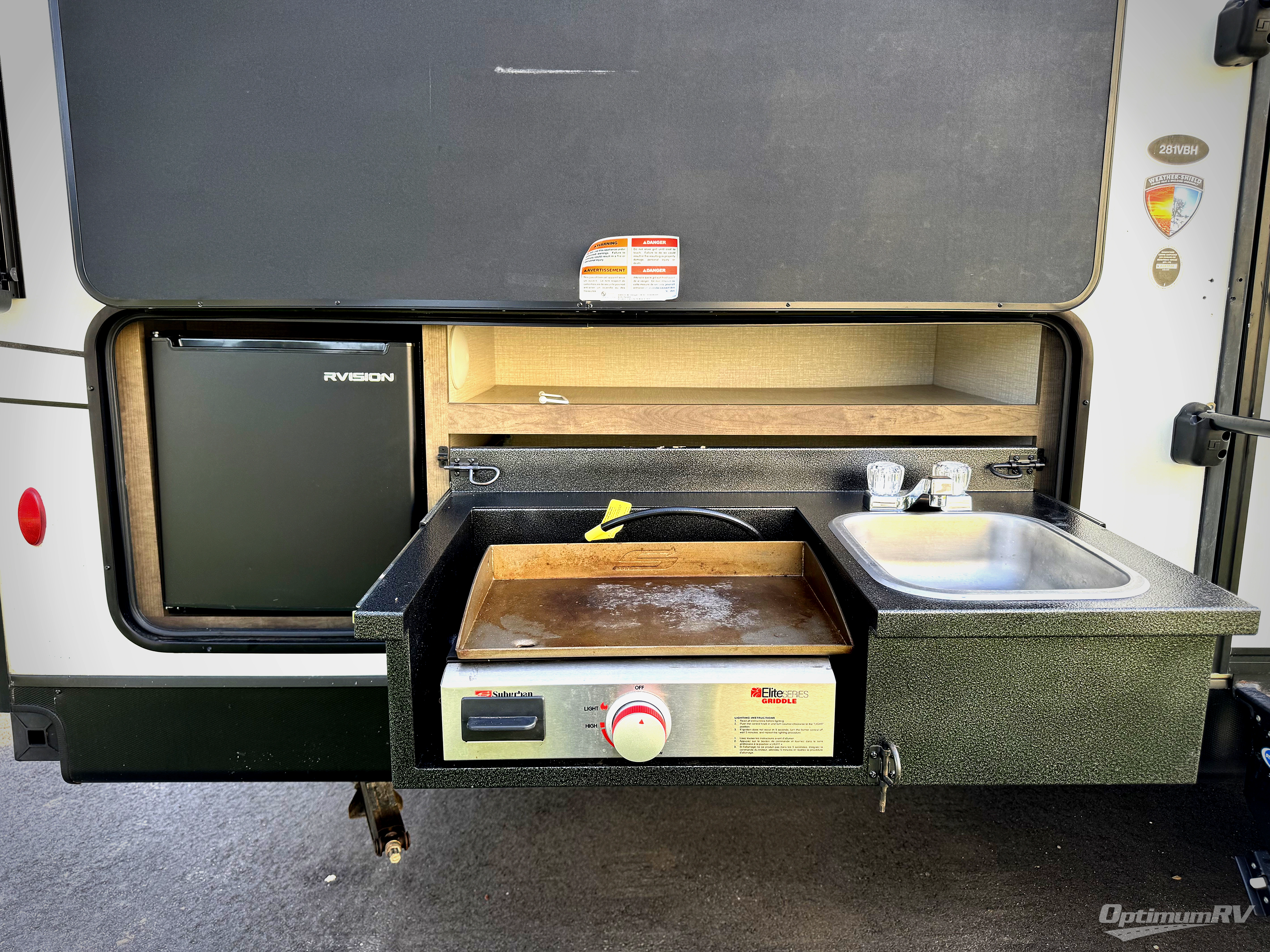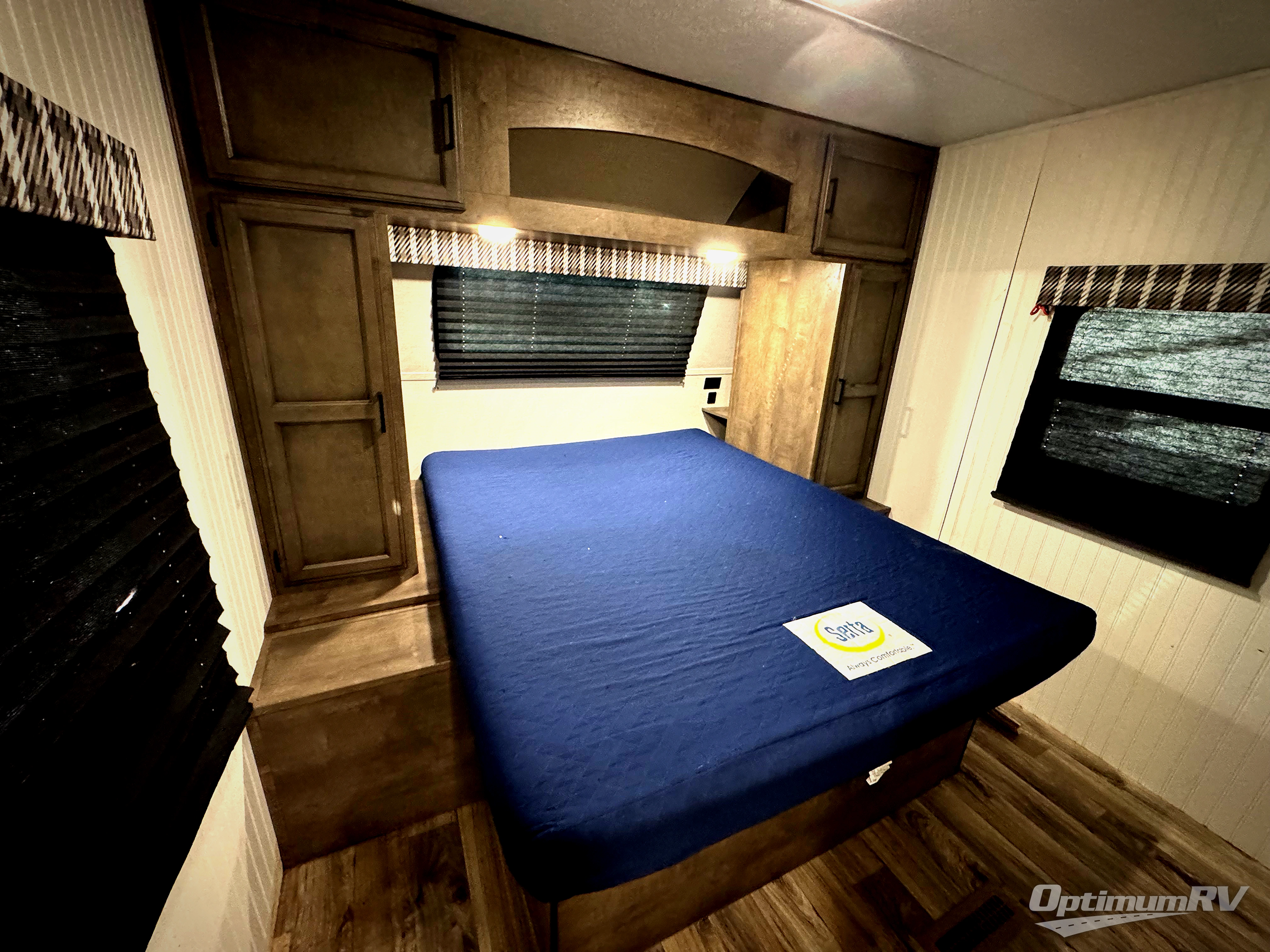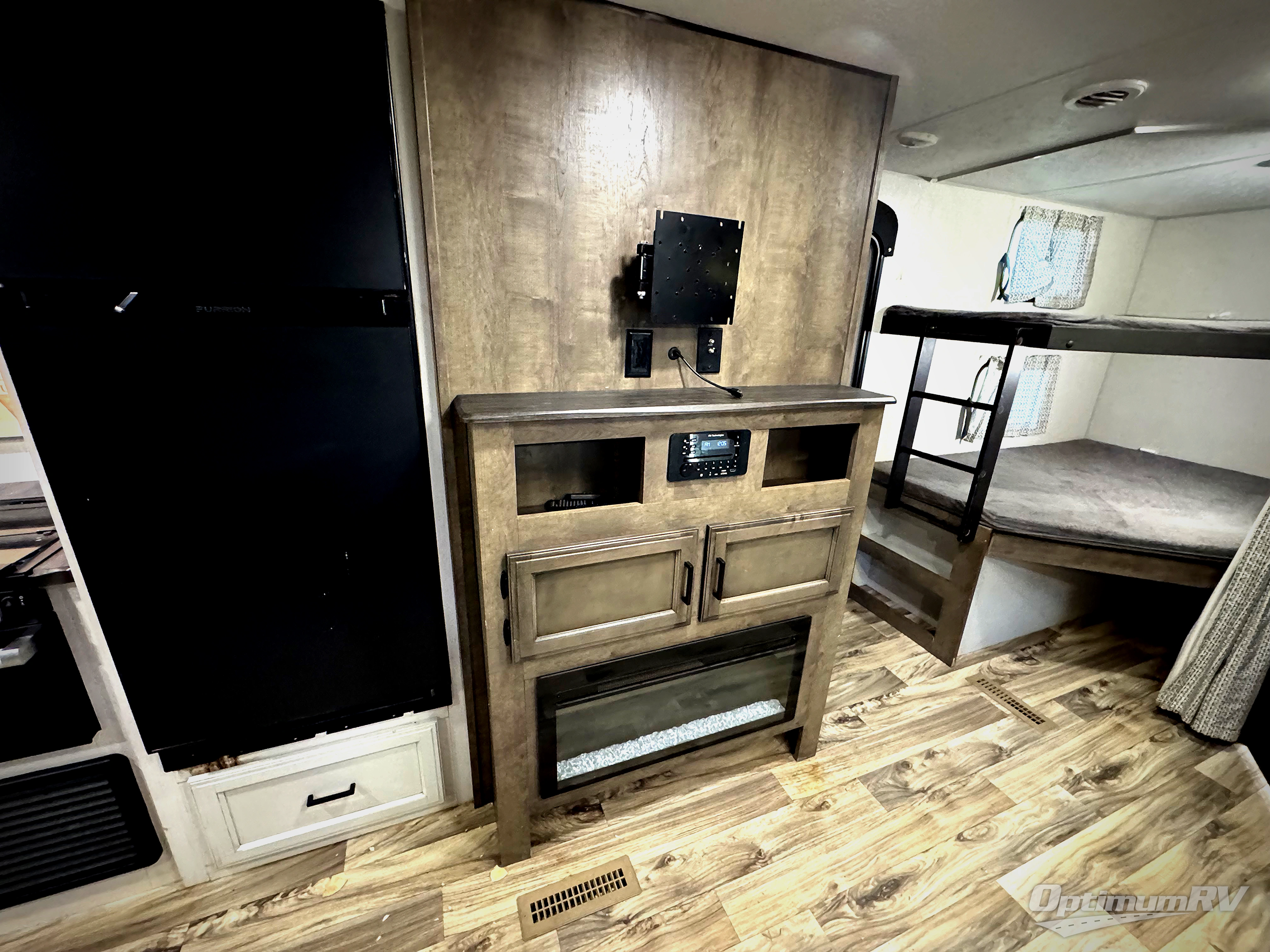 The whole family will have a fun time camping in this travel trailer! You will appreciate having your own privacy with the front private bedroom that has a sleep tight queen bed to lay your head at night and wardrobes on either side to hang your clothes. The kids can sleep on the set of 51" x 75" double bed over double bunk beds and can even invite a friend or two to tag along and sleep on either the 70" sofa or the 42" booth dinette once they are converted. Everyone can freshen up in the rear corner bathroom with the 30" x 36" shower. Behind the entertainment center is a walk-in pantry with coat hooks so you can store your jacket and canned goods in one place. The chef will enjoy cooking at the outside campfire café with the griddle, the refrigerator, and the sink!