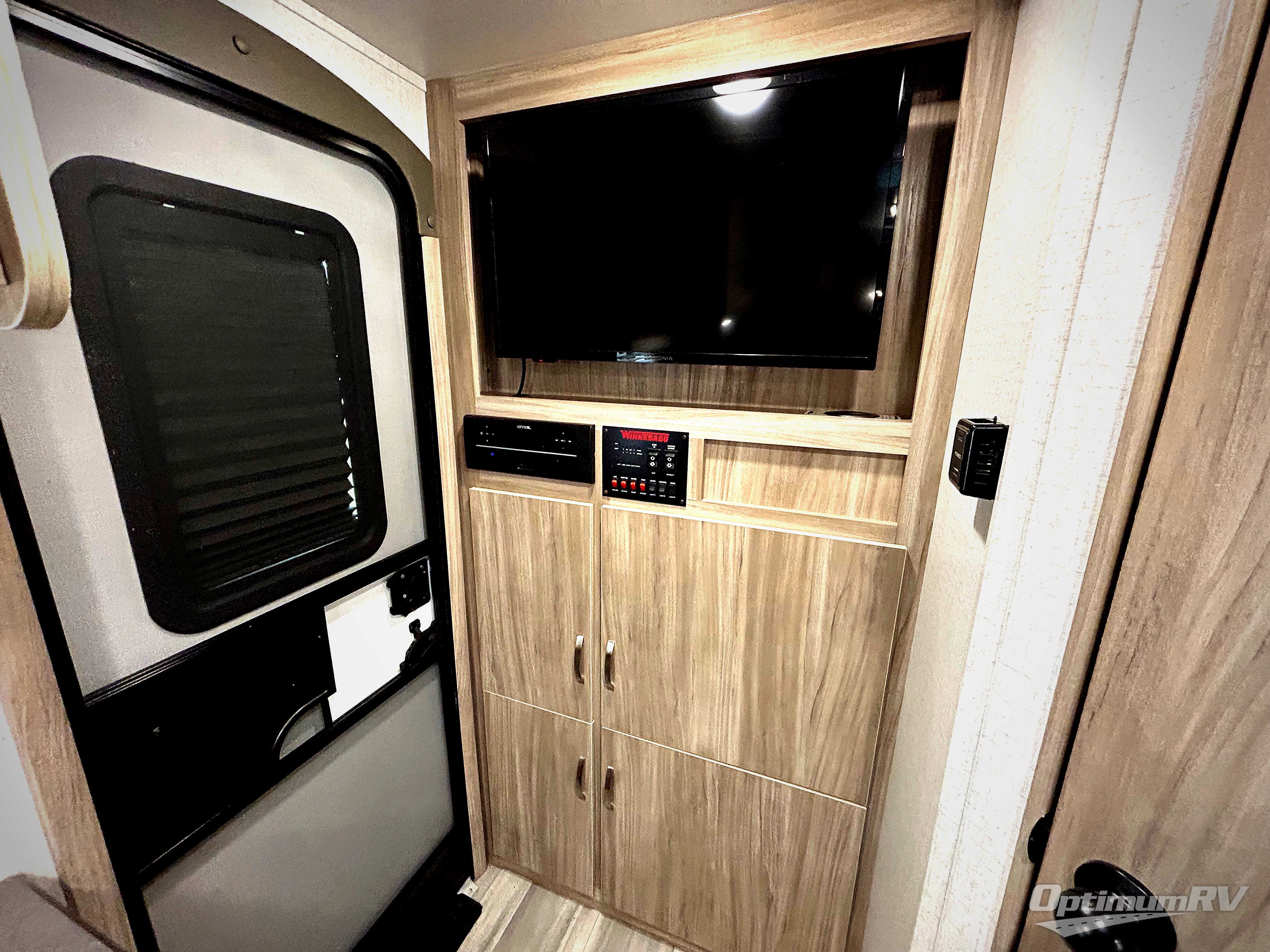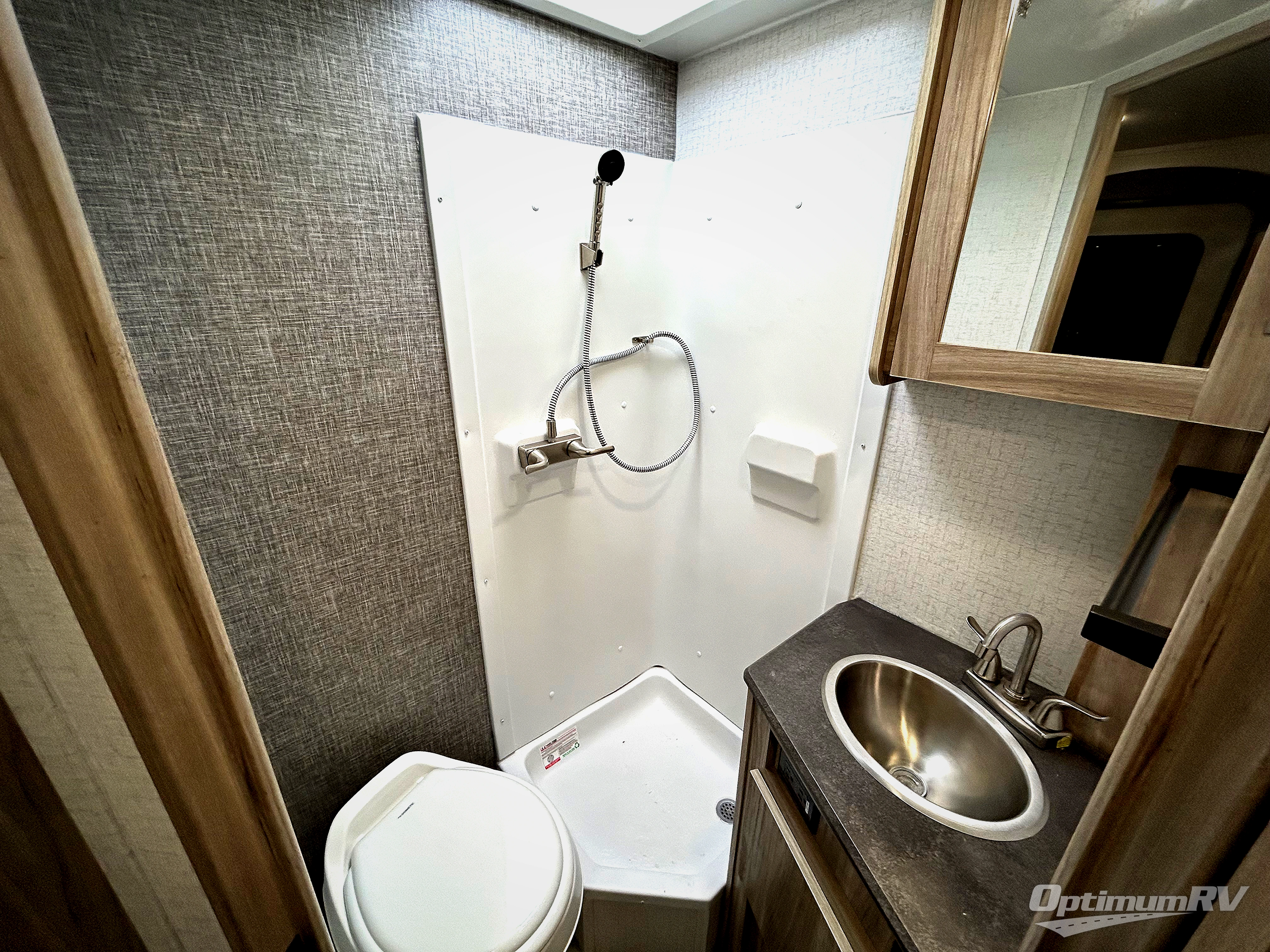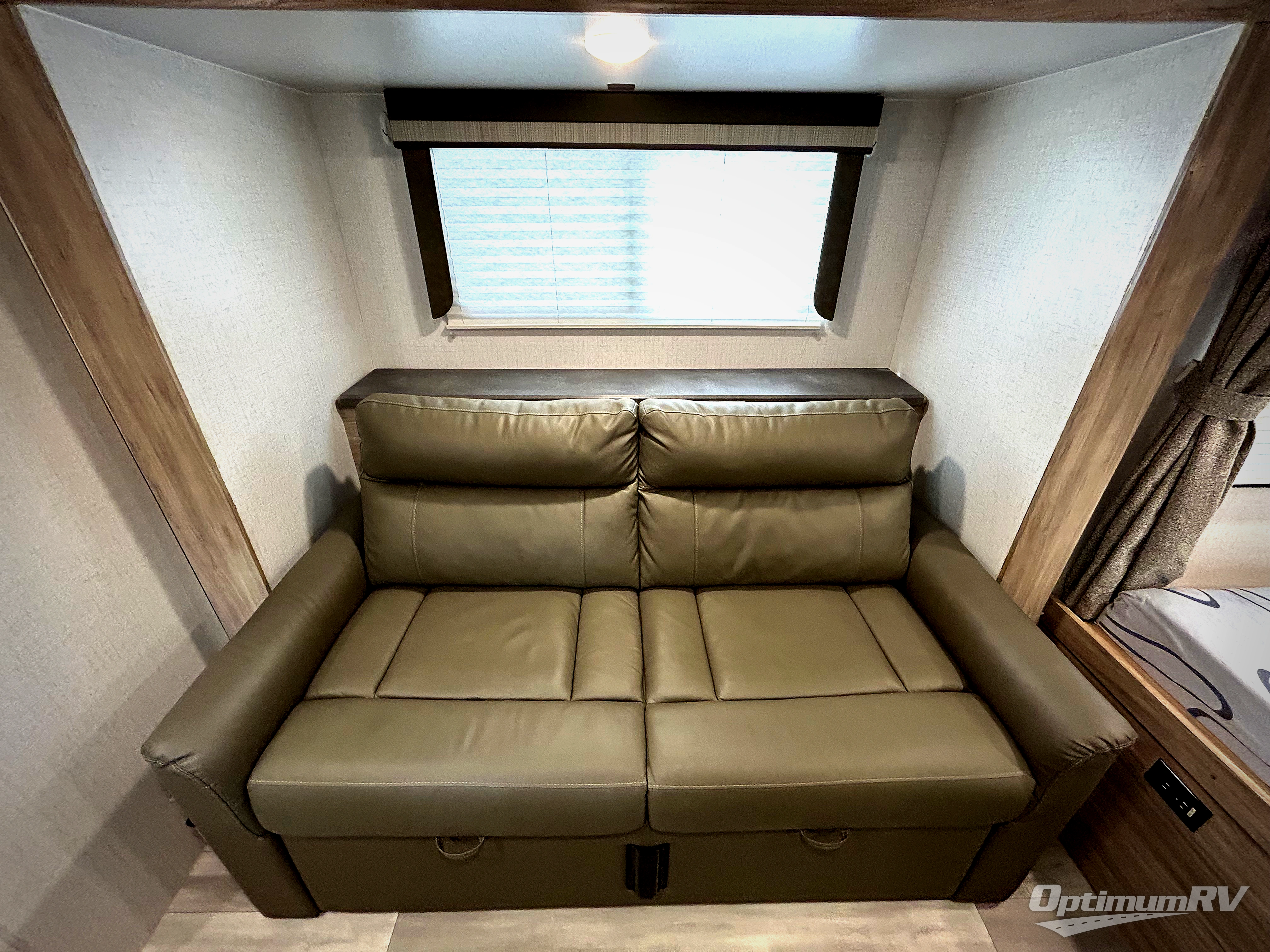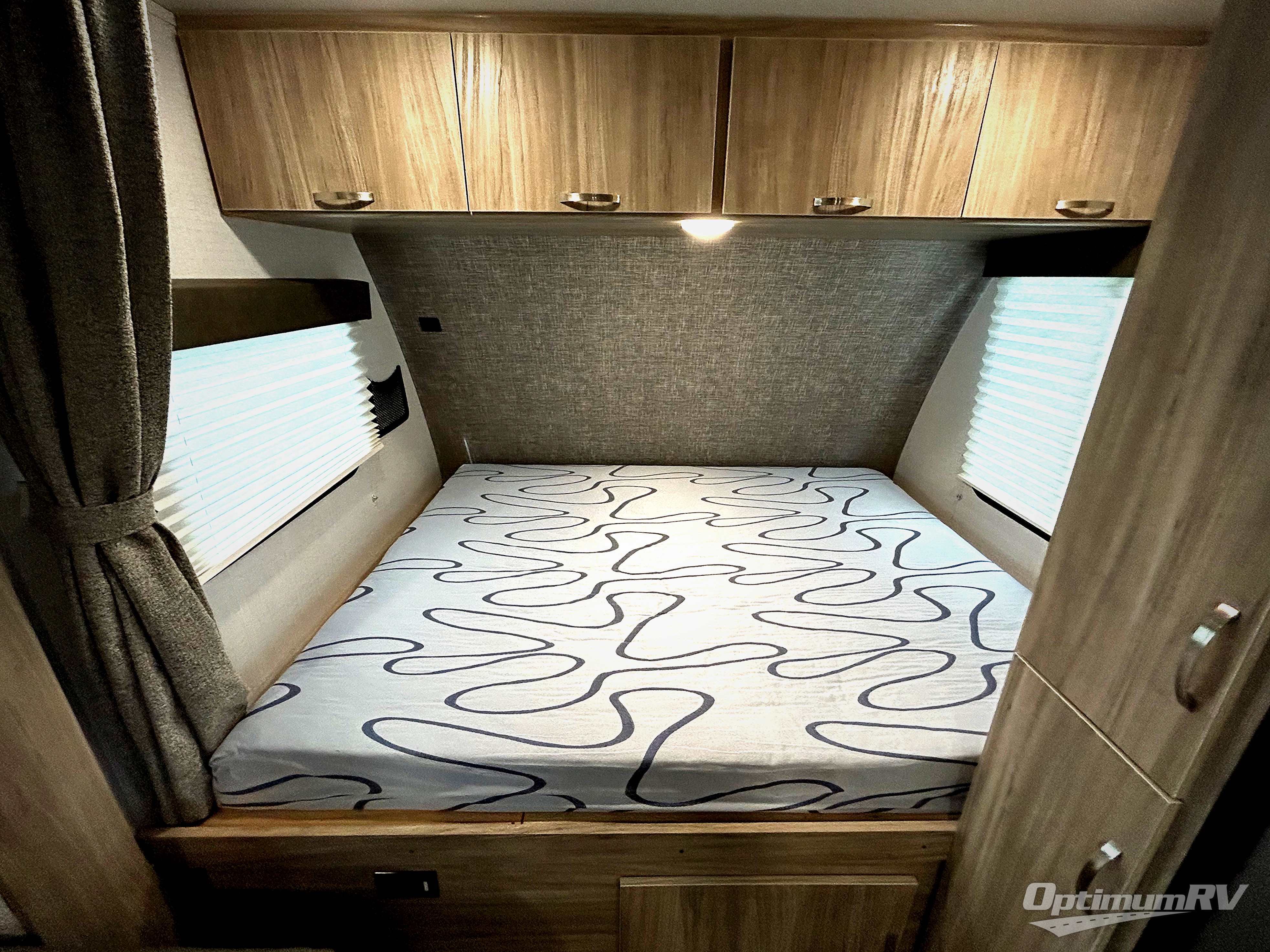 Don't pass your chance to camp comfortably with your spouse in this travel trailer! Up front there is a 60" x 74" RV queen bed with a divider curtain for privacy at night. Scramble up some eggs with the three burner cooktop and grab a cup of orange juice from the 10.3 cu. ft. refrigerator then head to the 44" x 72" booth dinette slide to enjoy your meal. The dinette can also transforms into an extra sleeping space if you want a tag along guest. Everyone can freshen up in the rear corner bathroom and watch their favorite movies on the LED TV!