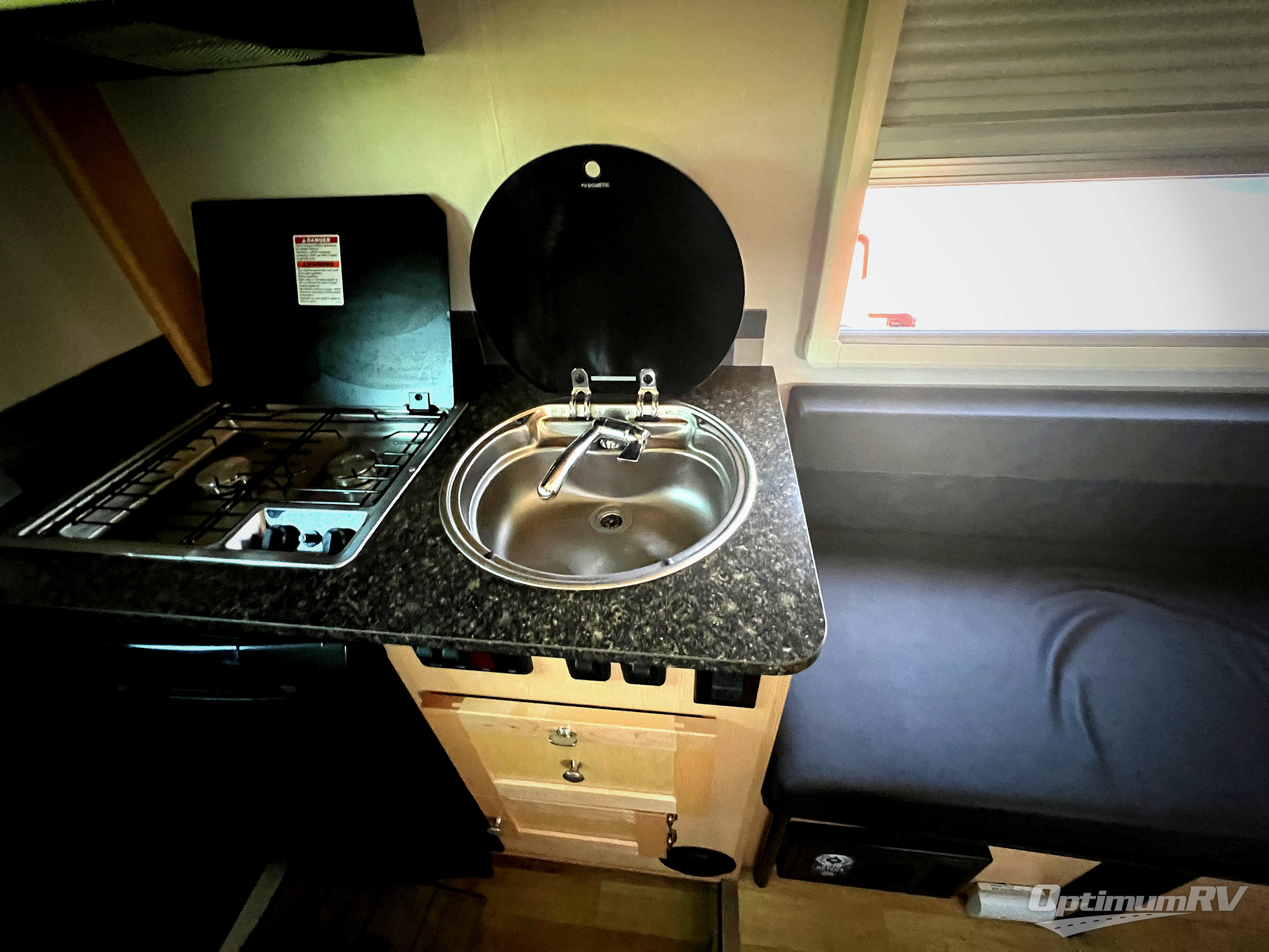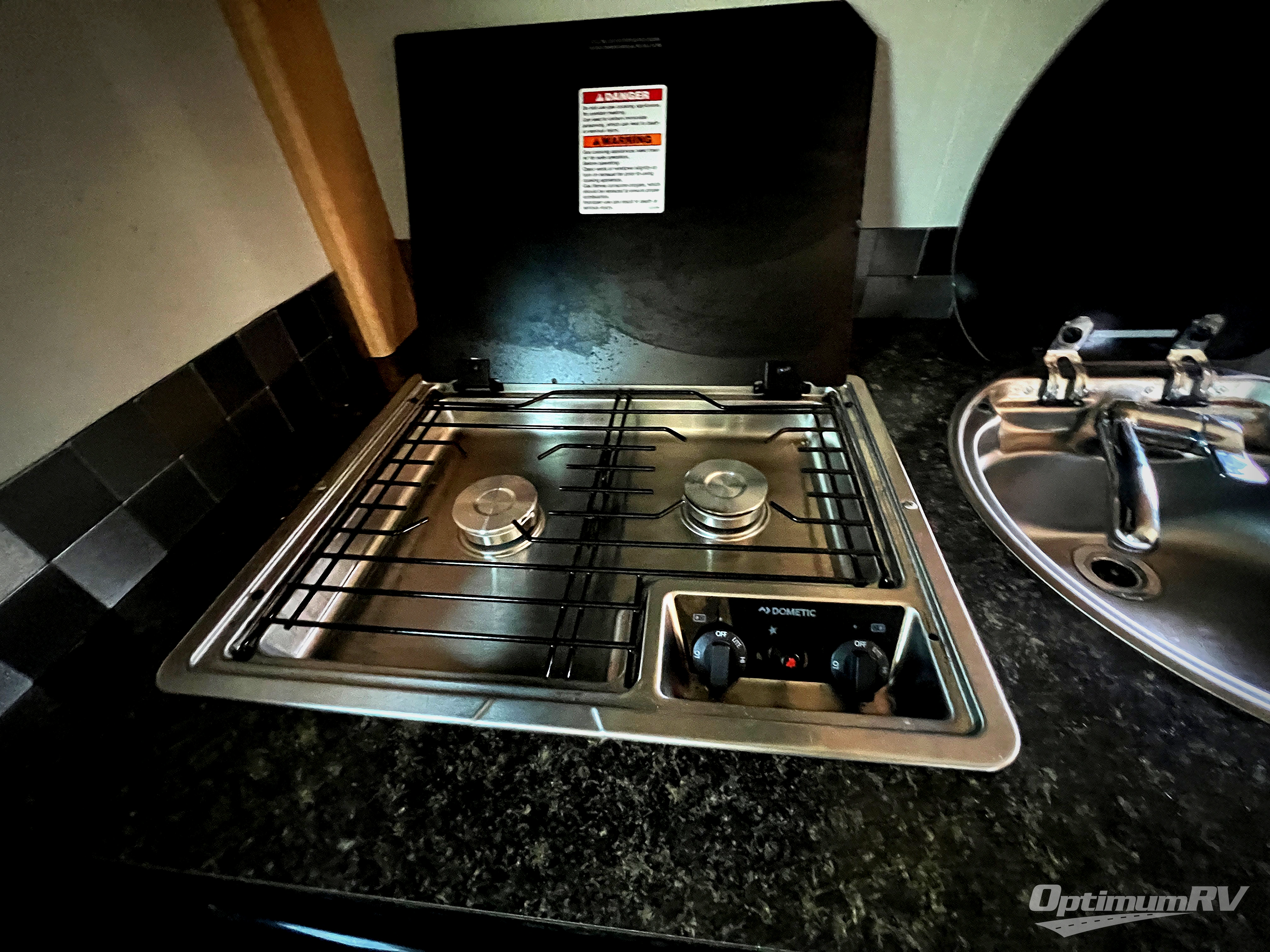 You'll love this travel trailer that features a little more interior space for a more at-home feel. There are two dinette seats with a table where you can dine each day, and this area can fold down to create a 72" x 77" bed size. You might even even want to watch movies in bed with the 23" flat screen TV! This model includes a cassette toilet so you don't have to use the camp's facilities in the middle of the night, and you can make breakfast on the two burner cooktop in the morning.
