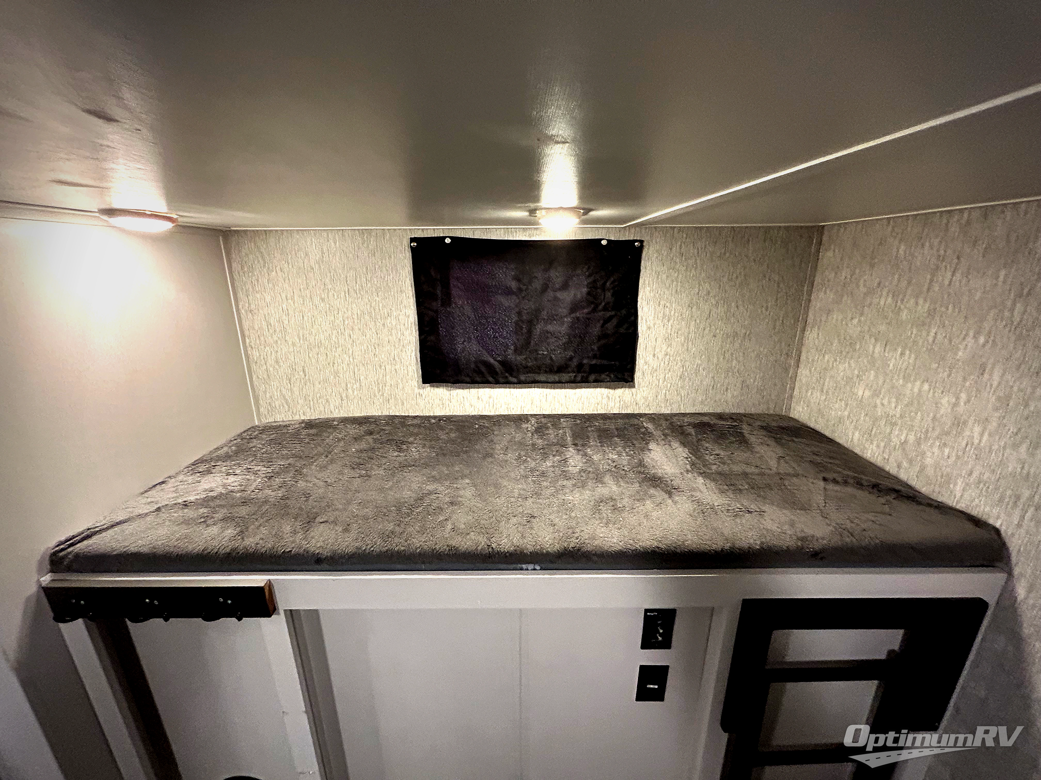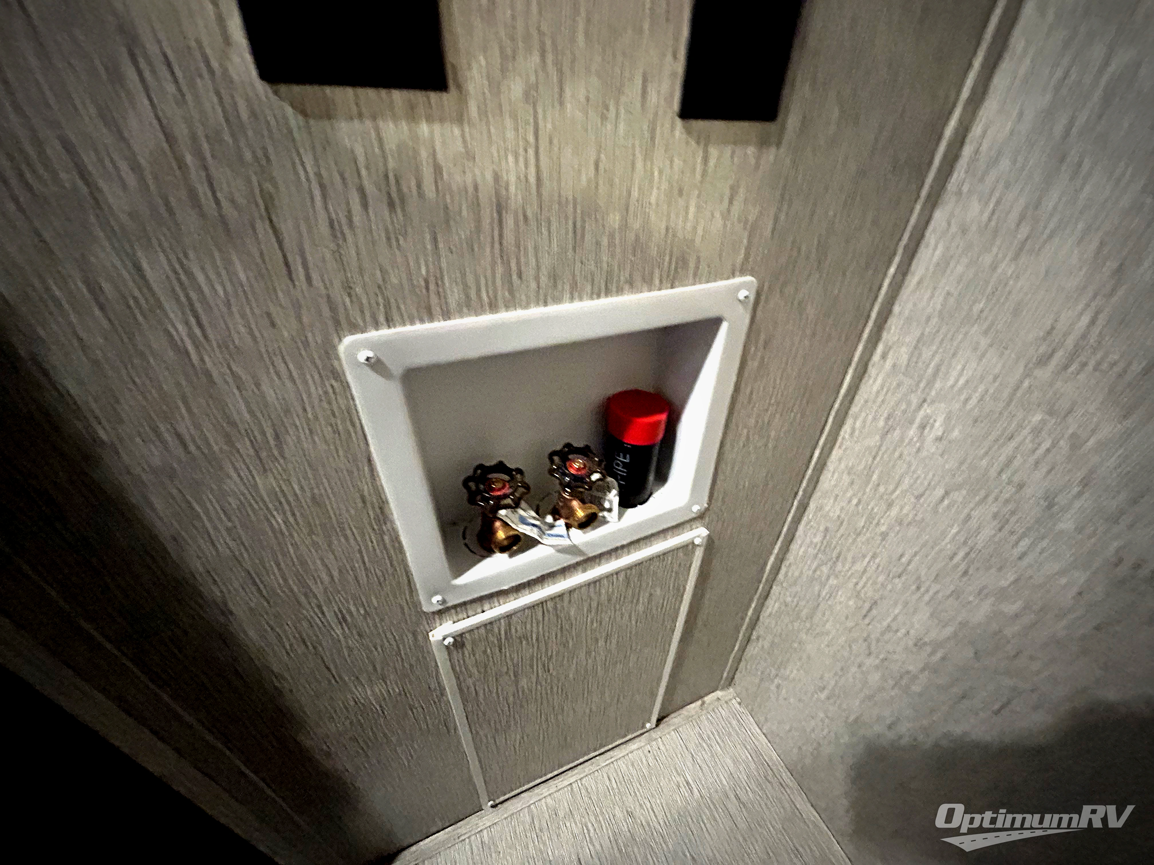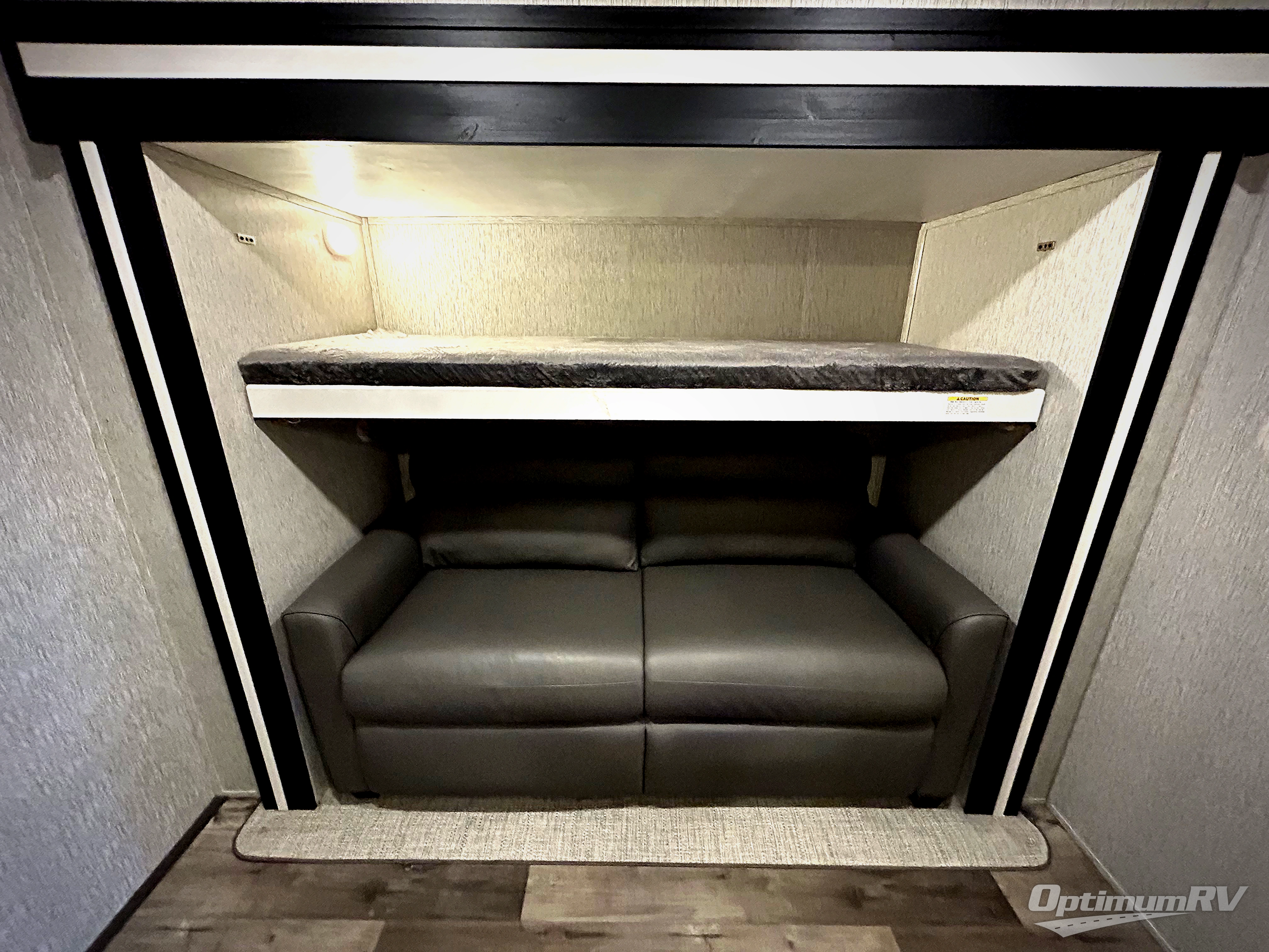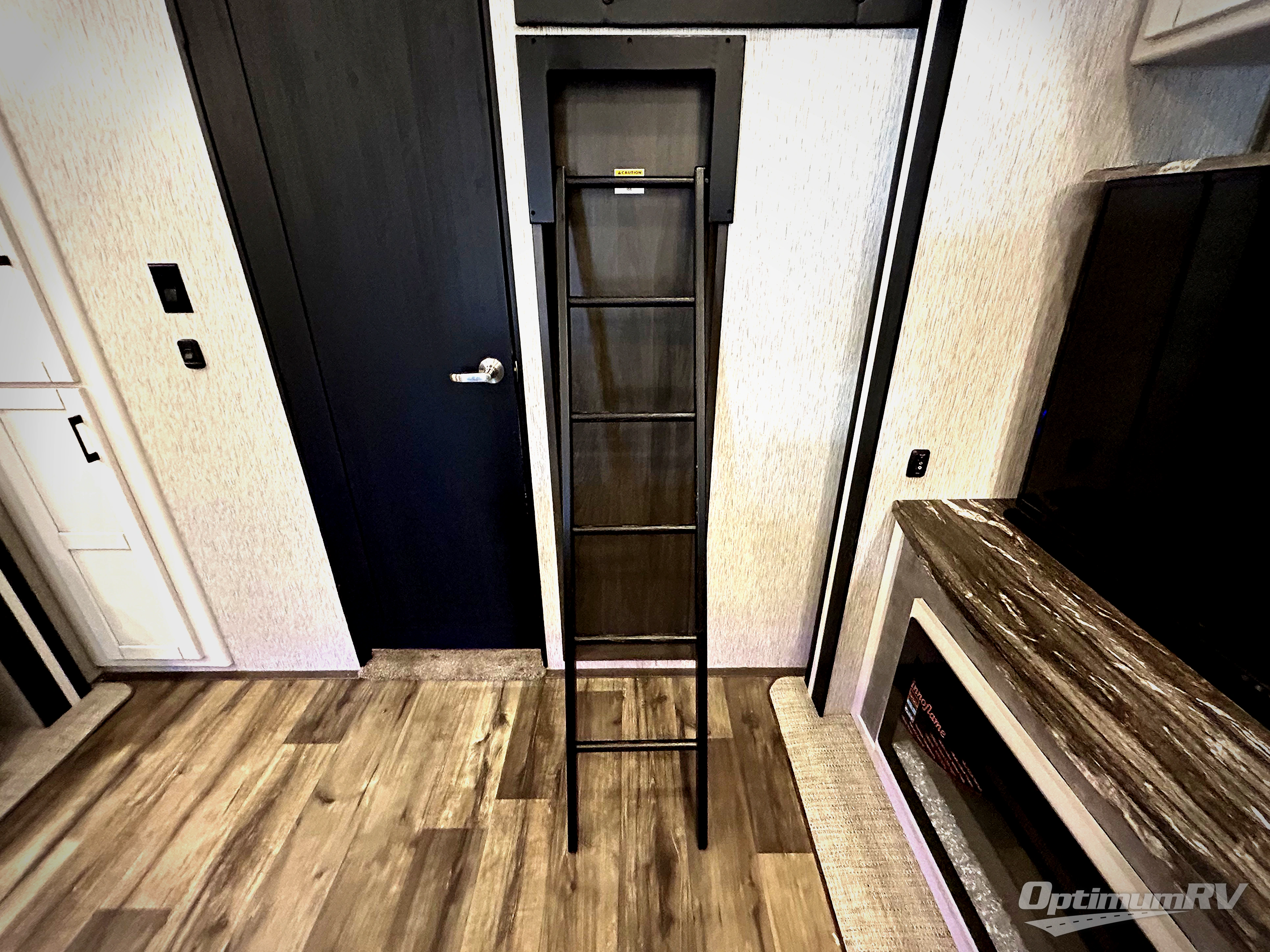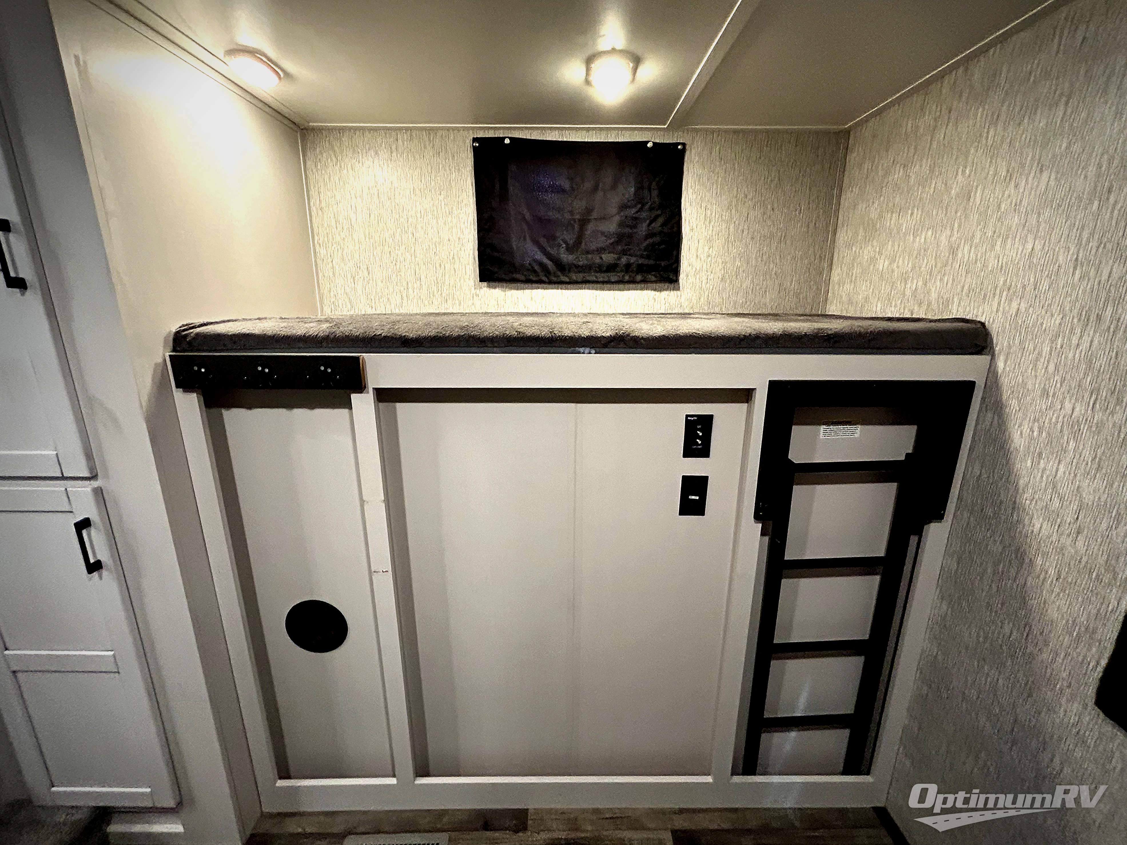 What isn't included in this Hampton? Not much! You will love the rear private bunkhouse with loft area above that includes a ladder to access the area from the main living and kitchen space. The bunkhouse includes two bunk beds, a tri-fold sofa and storage, and the slide out gives the room more floor space, and the windows offer natural lighting and scenic views. The kitchen island allows the cook to prepare and serve meals easily, the hutch offers more storage, and the fireplace is a nice touch. You can dine at the free standing dinette with two chairs and bench seating, or relax on the theater seats. The full bathroom will keep everyone refreshed, and the front private bedroom offers a slide out queen bed, a closet prepped for a washer/dryer option, and lots of storage and windows. And don't forget about the outside kitchen and awning.