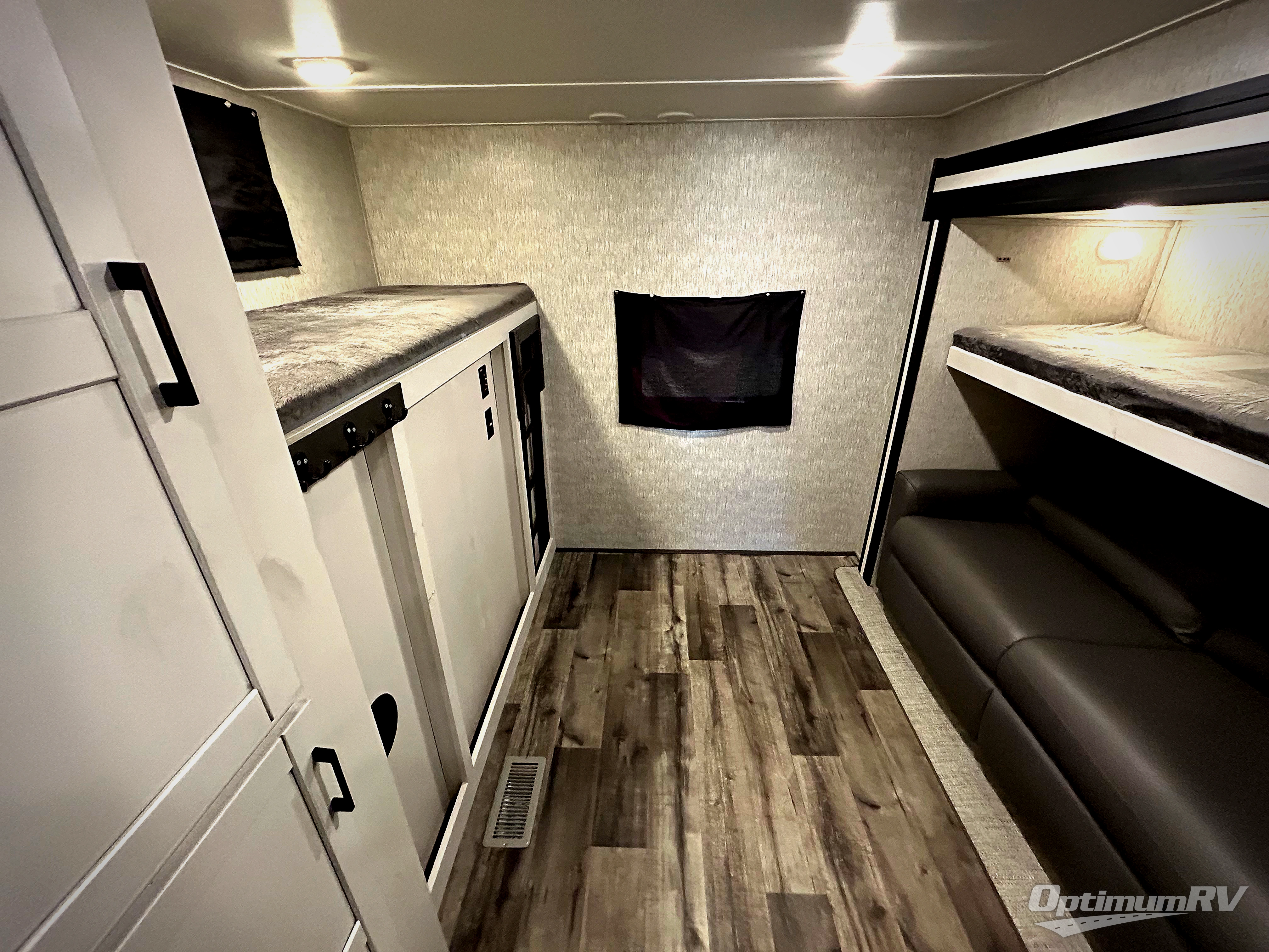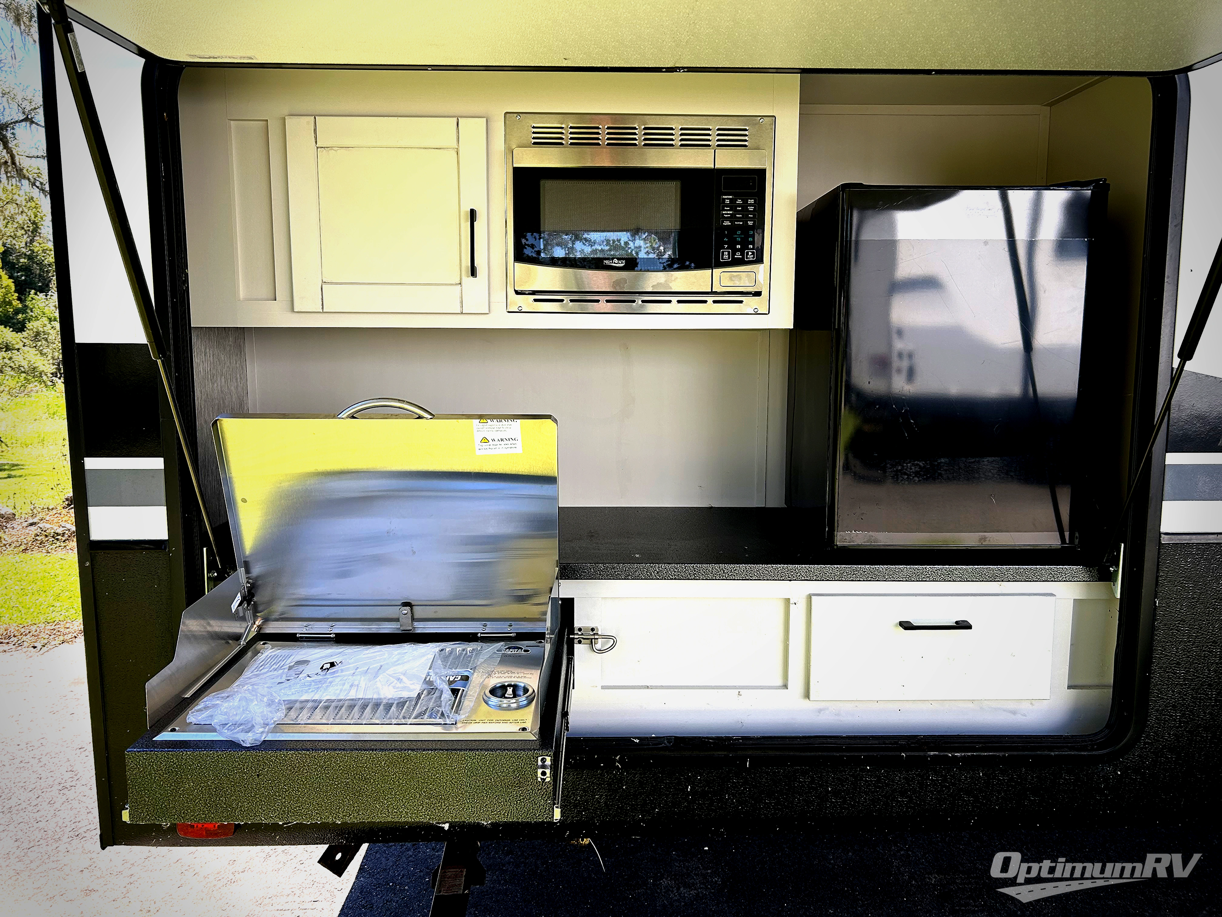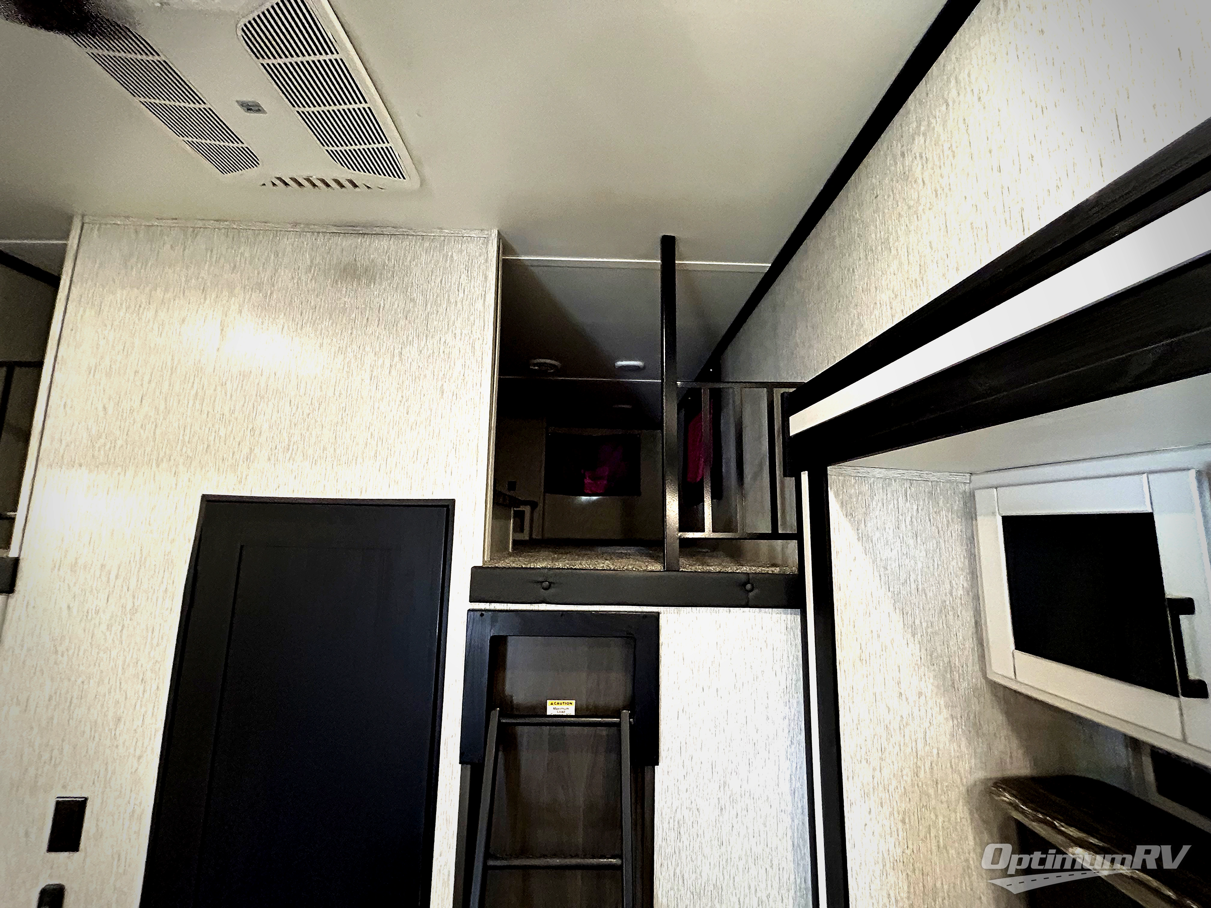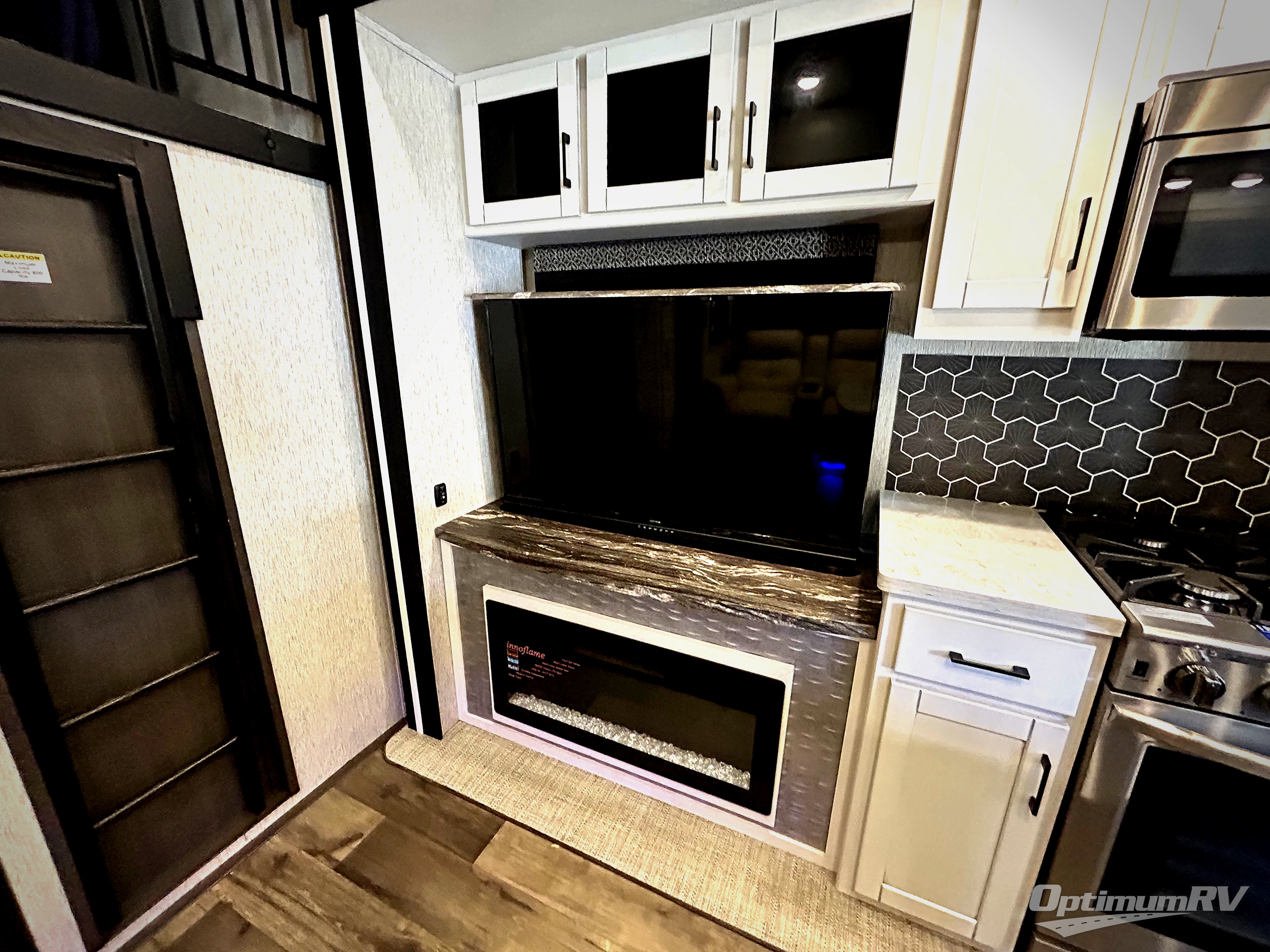 What isn't included in this Hampton? Not much! You will love the rear private bunkhouse with loft area above that includes a ladder to access the area from the main living and kitchen space. The bunkhouse includes two bunk beds, a tri-fold sofa and storage, and the slide out gives the room more floor space, and the windows offer natural lighting and scenic views. The kitchen island allows the cook to prepare and serve meals easily, the hutch offers more storage, and the fireplace is a nice touch. You can dine at the free standing dinette with two chairs and bench seating, or relax on the theater seats. The full bathroom will keep everyone refreshed, and the front private bedroom offers a slide out queen bed, a closet prepped for a washer/dryer option, and lots of storage and windows. And don't forget about the outside kitchen and awning.