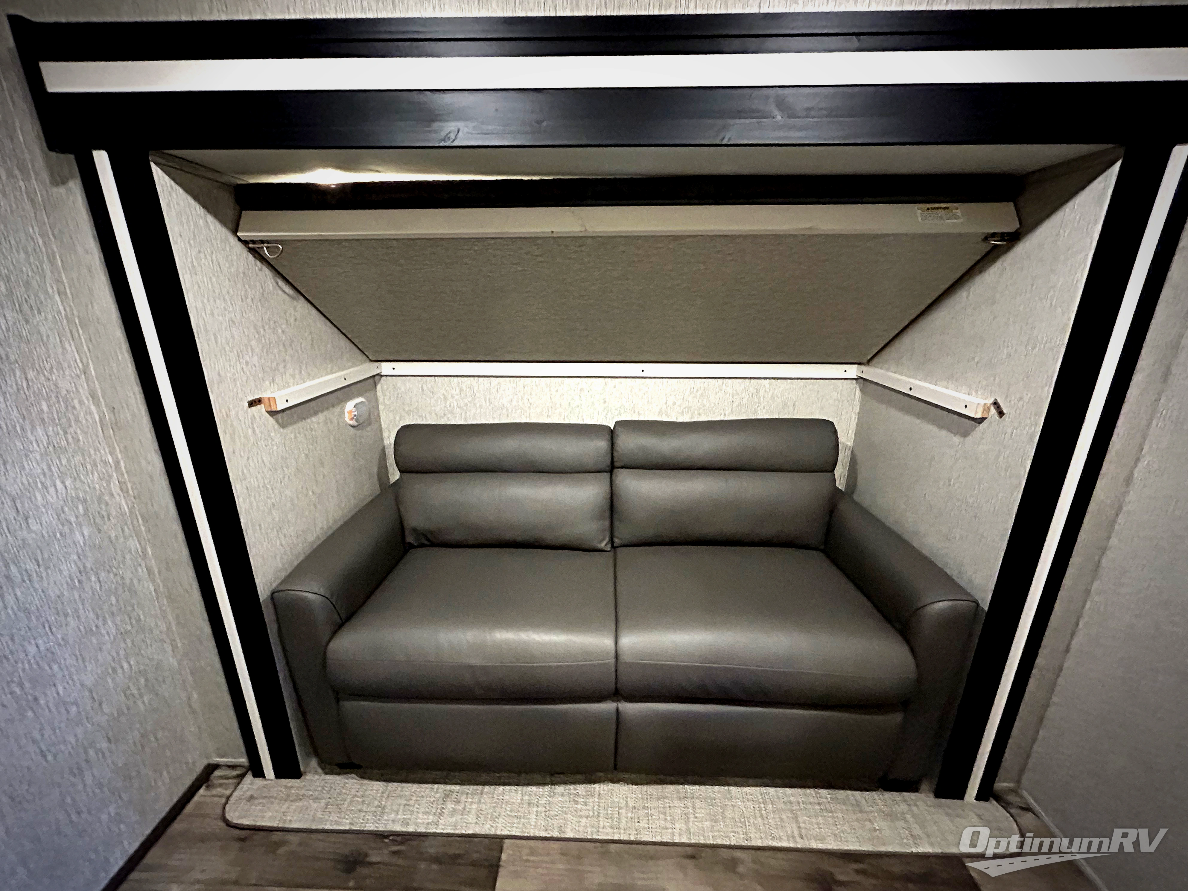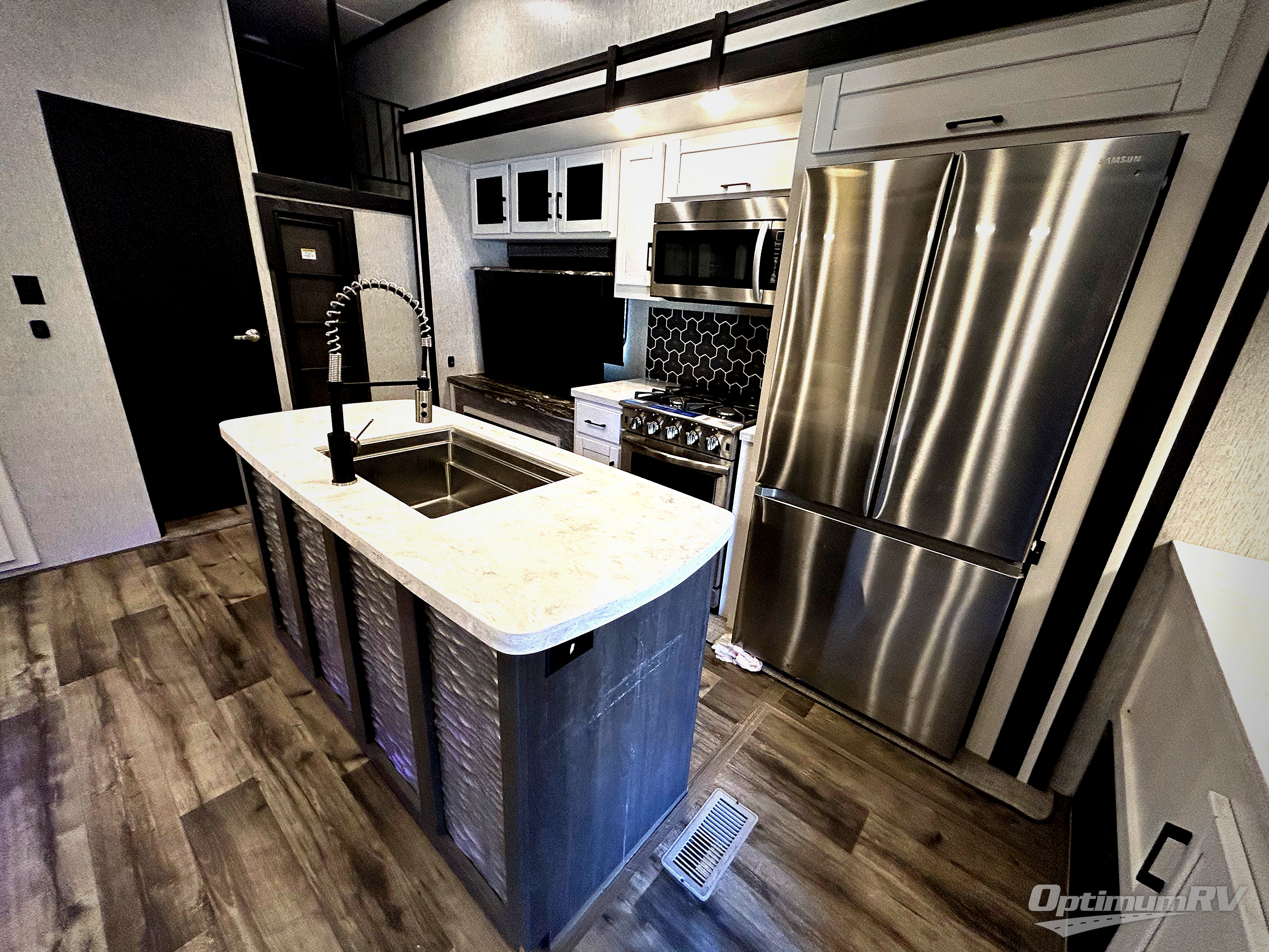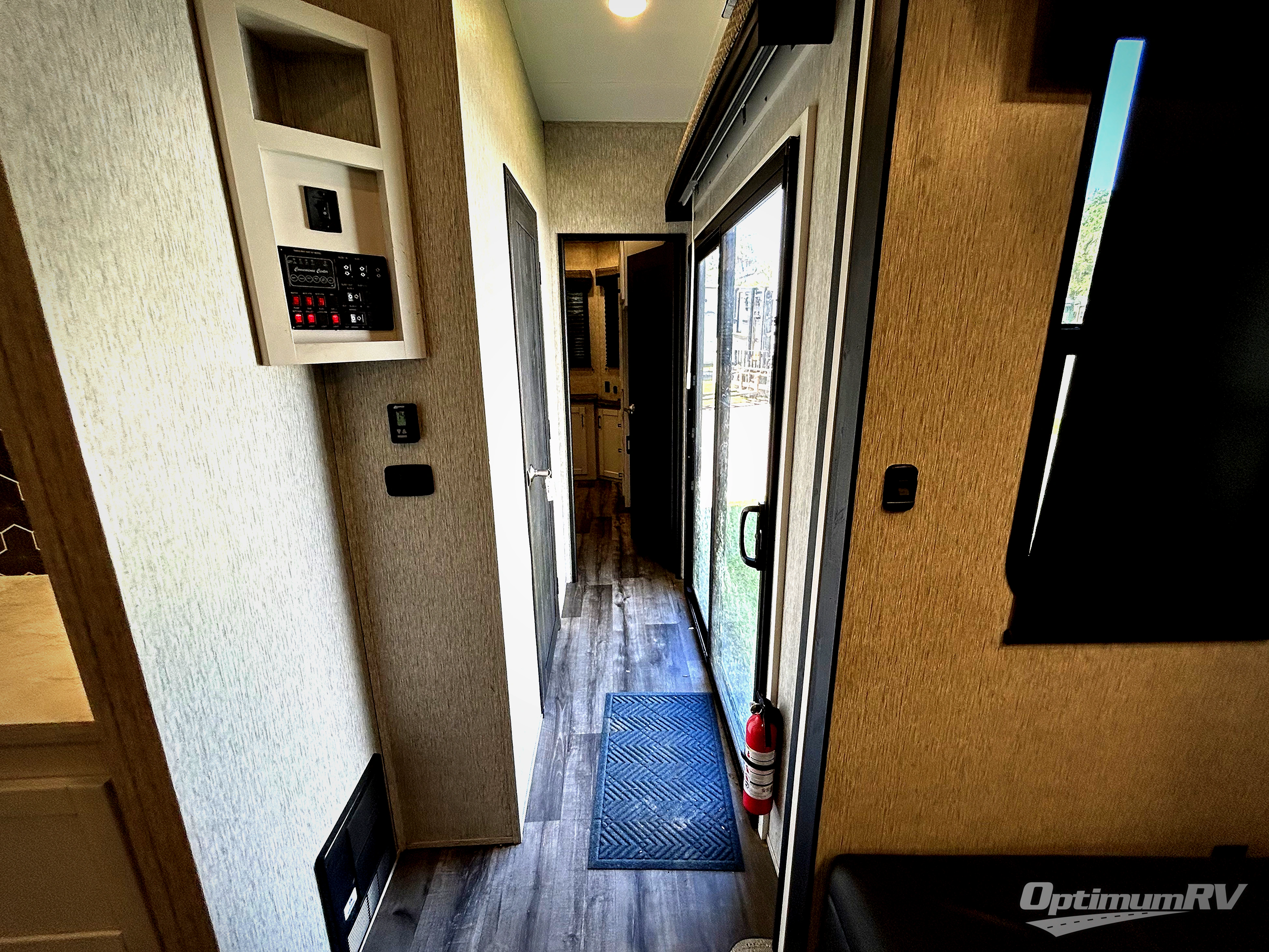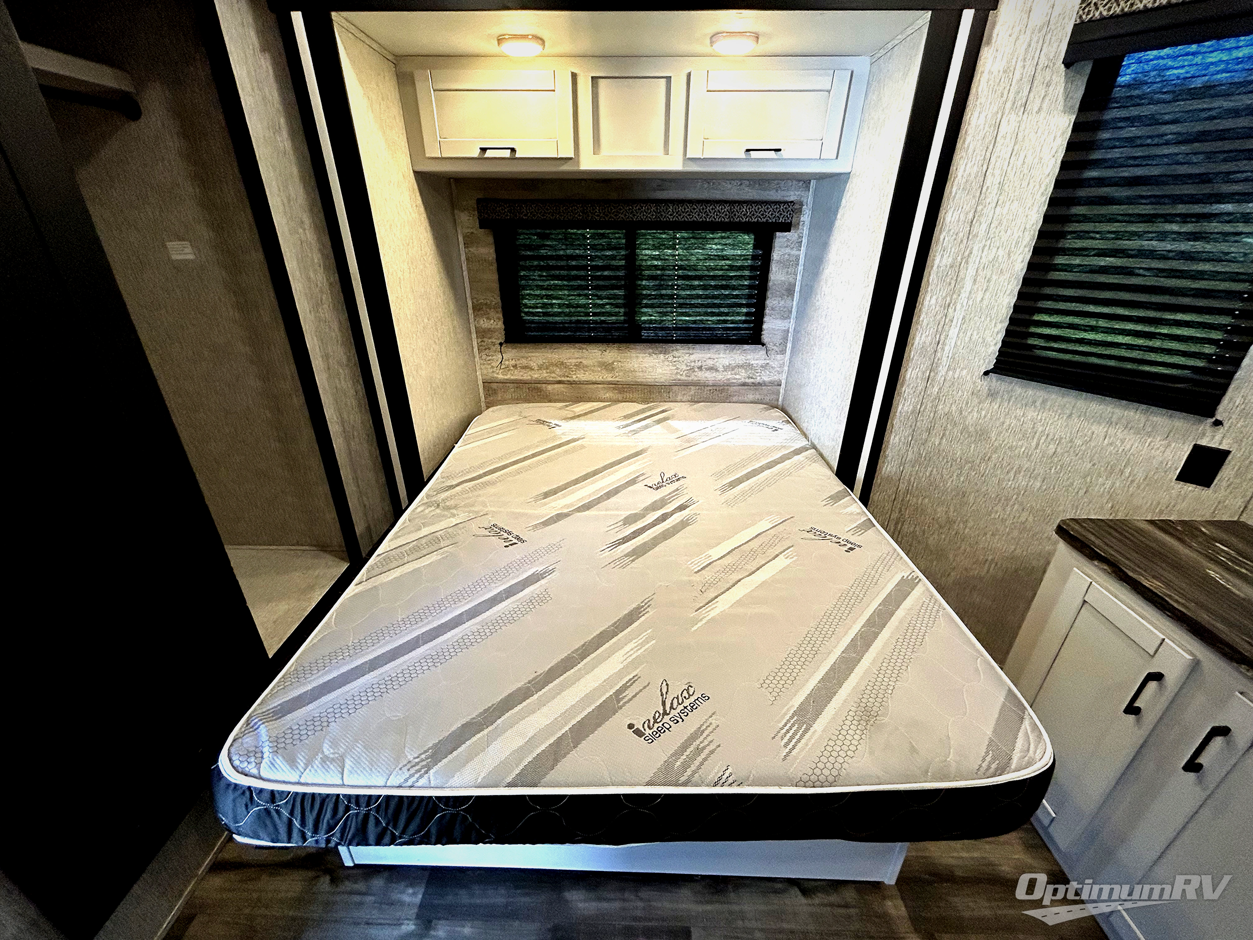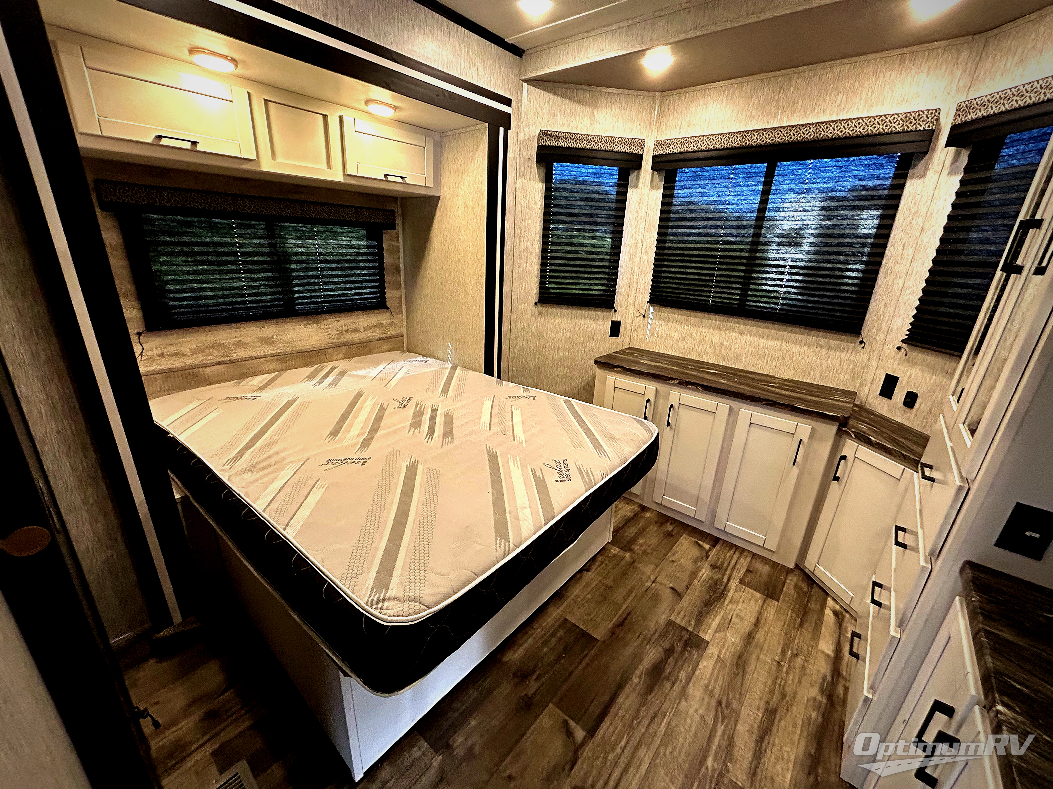 What isn't included in this Hampton? Not much! You will love the rear private bunkhouse with loft area above that includes a ladder to access the area from the main living and kitchen space. The bunkhouse includes two bunk beds, a tri-fold sofa and storage, and the slide out gives the room more floor space, and the windows offer natural lighting and scenic views. The kitchen island allows the cook to prepare and serve meals easily, the hutch offers more storage, and the fireplace is a nice touch. You can dine at the free standing dinette with two chairs and bench seating, or relax on the theater seats. The full bathroom will keep everyone refreshed, and the front private bedroom offers a slide out queen bed, a closet prepped for a washer/dryer option, and lots of storage and windows. And don't forget about the outside kitchen and awning.