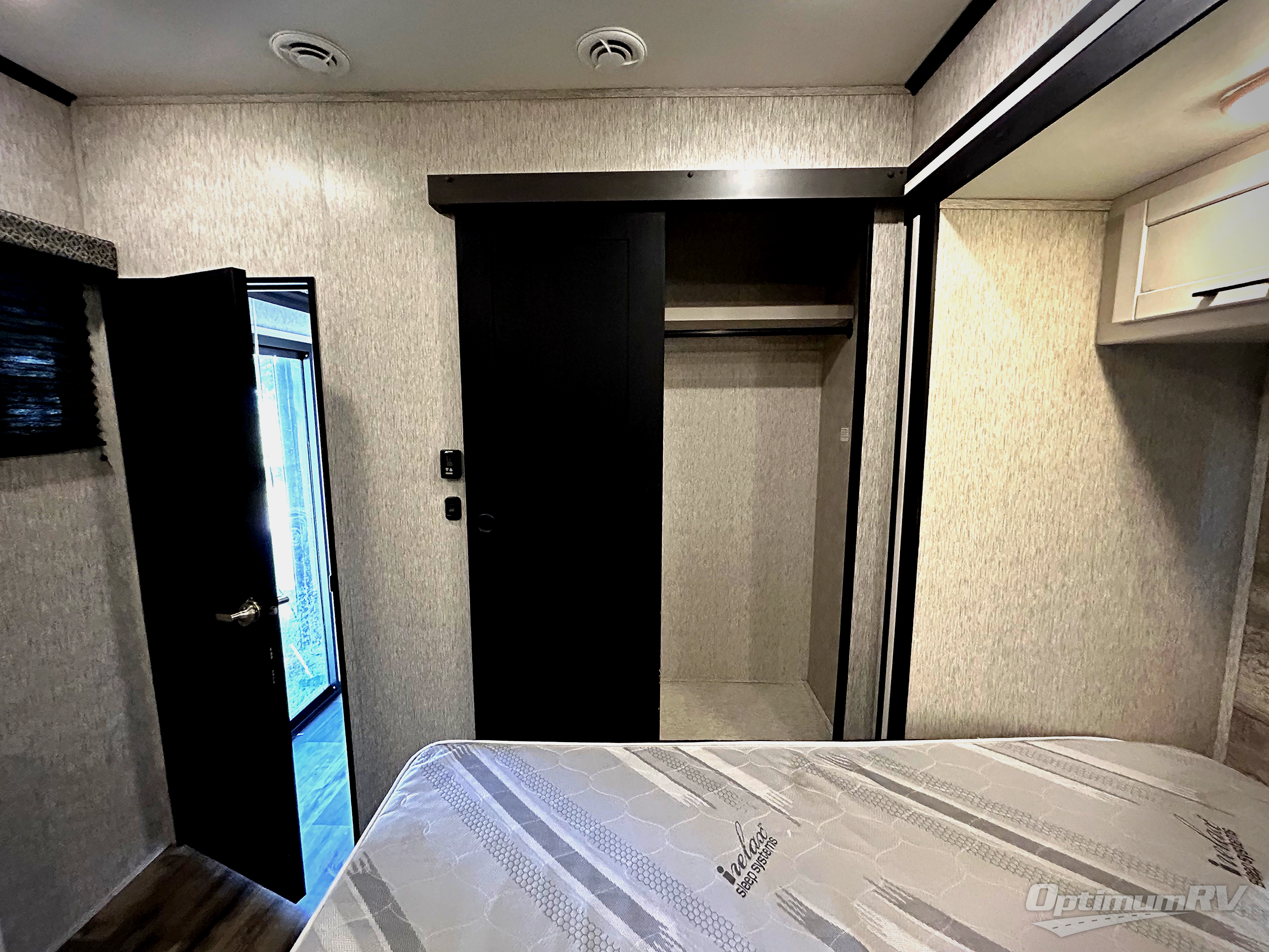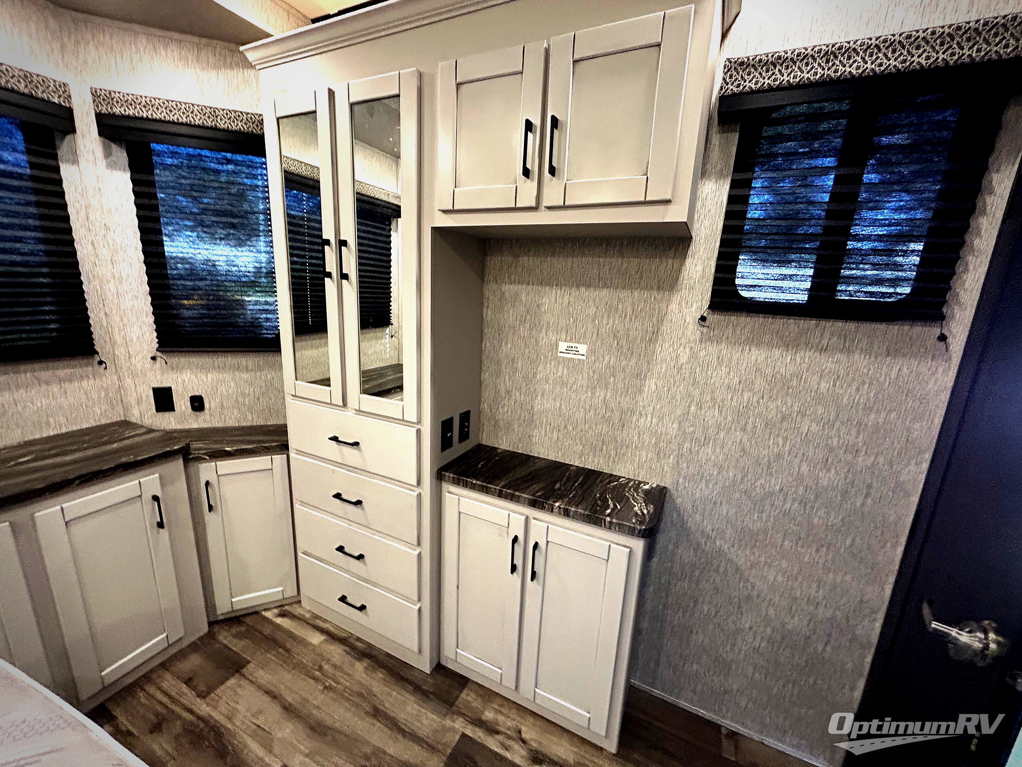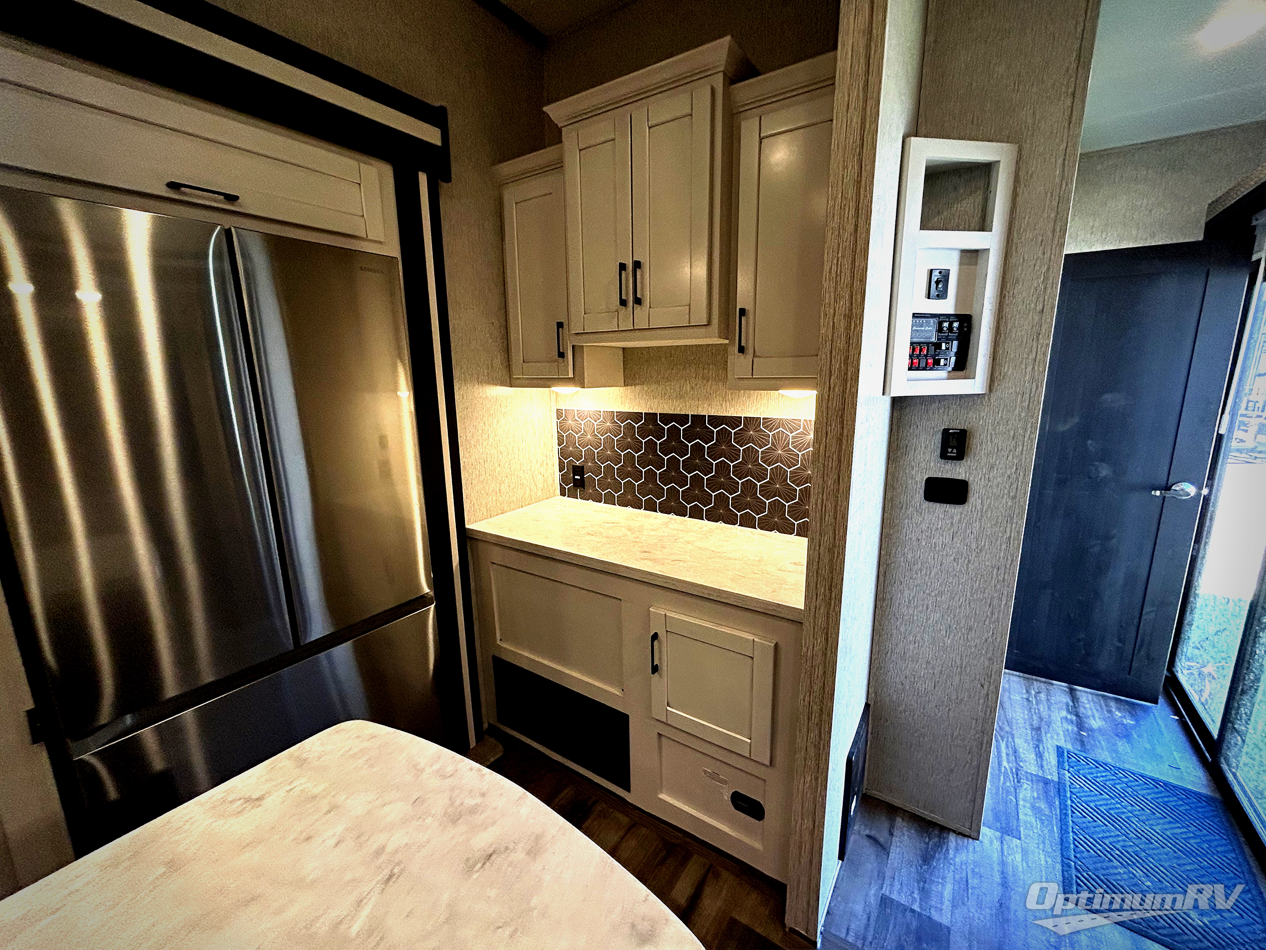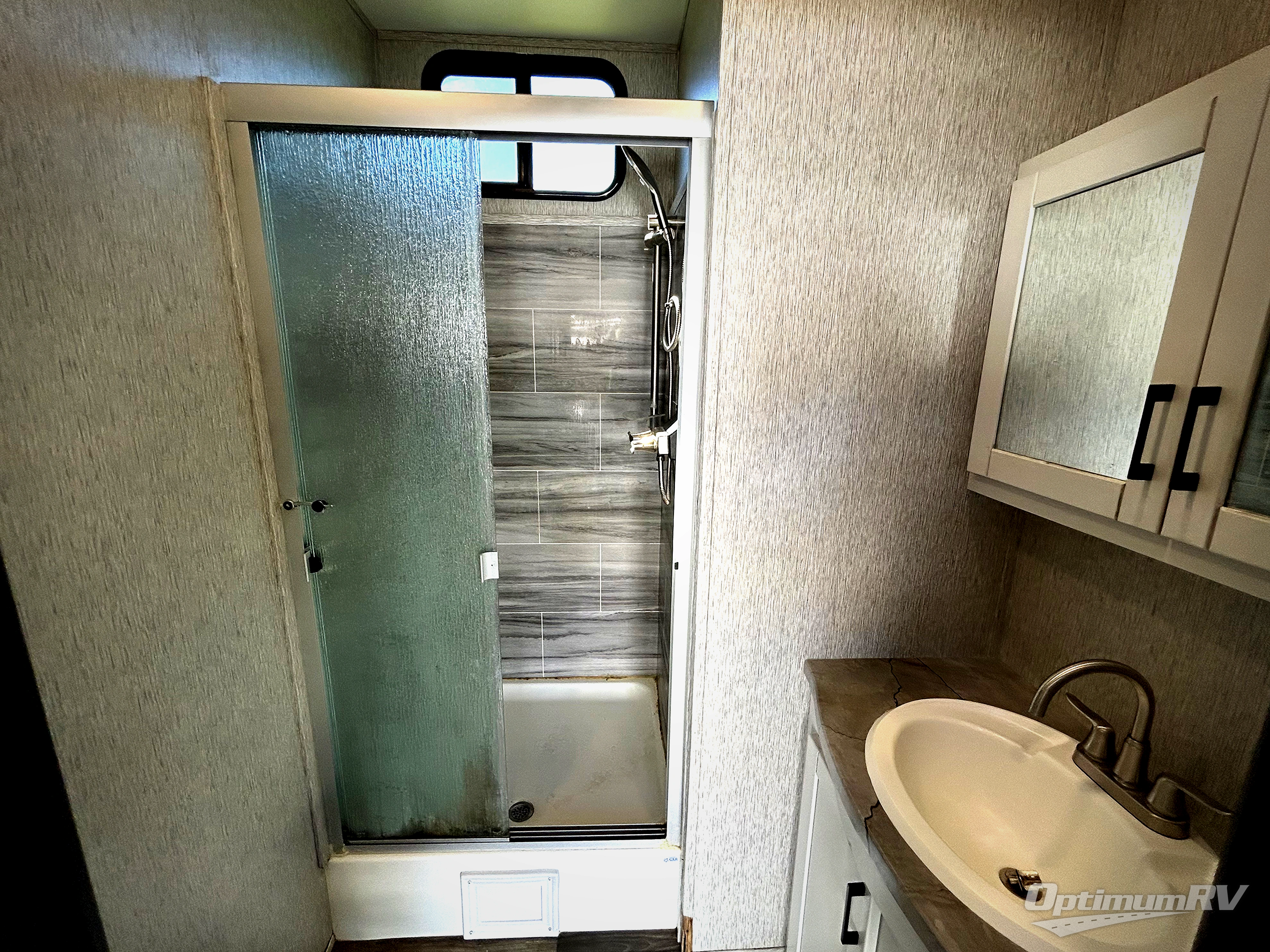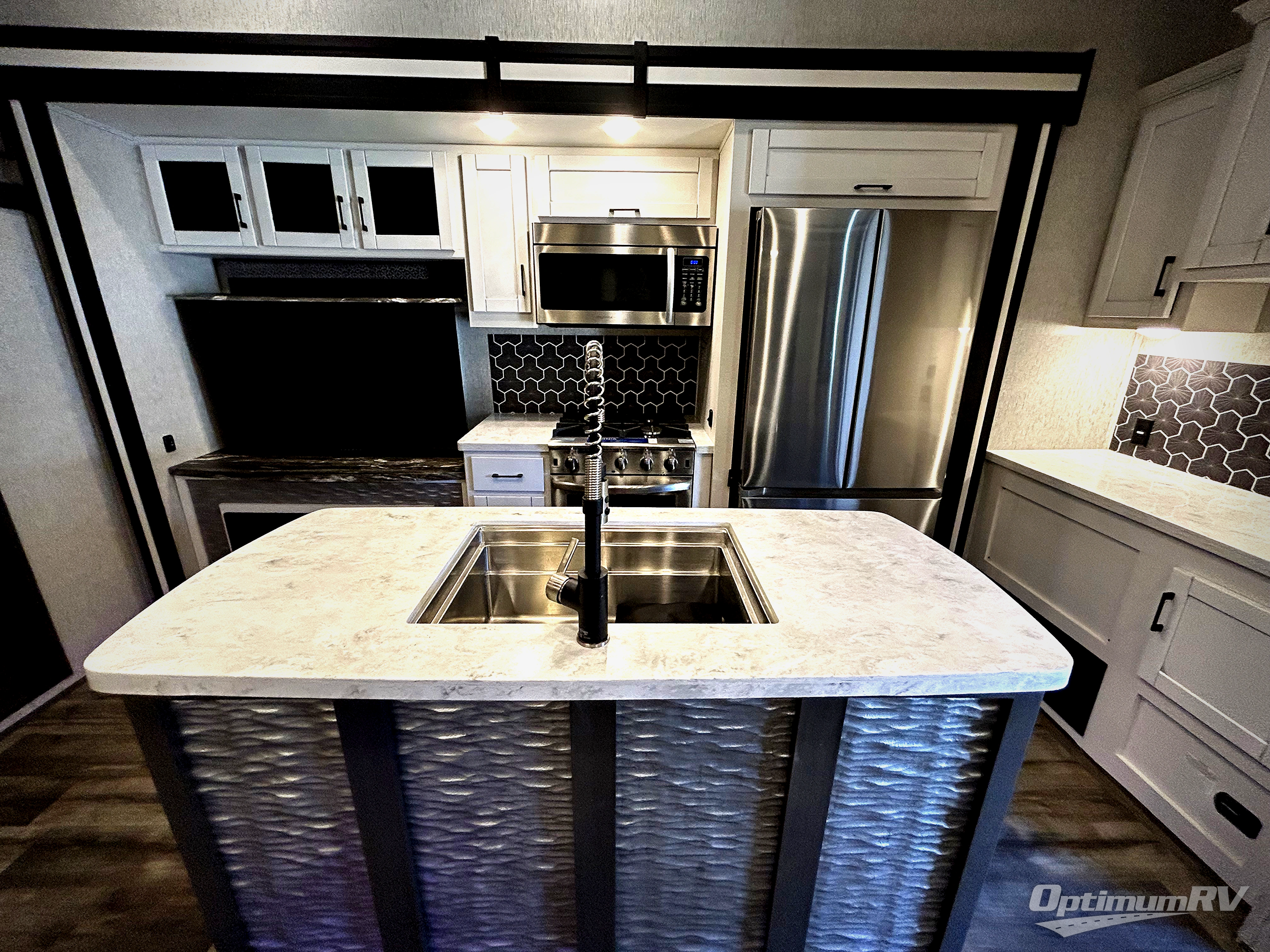 What isn't included in this Hampton? Not much! You will love the rear private bunkhouse with loft area above that includes a ladder to access the area from the main living and kitchen space. The bunkhouse includes two bunk beds, a tri-fold sofa and storage, and the slide out gives the room more floor space, and the windows offer natural lighting and scenic views. The kitchen island allows the cook to prepare and serve meals easily, the hutch offers more storage, and the fireplace is a nice touch. You can dine at the free standing dinette with two chairs and bench seating, or relax on the theater seats. The full bathroom will keep everyone refreshed, and the front private bedroom offers a slide out queen bed, a closet prepped for a washer/dryer option, and lots of storage and windows. And don't forget about the outside kitchen and awning.