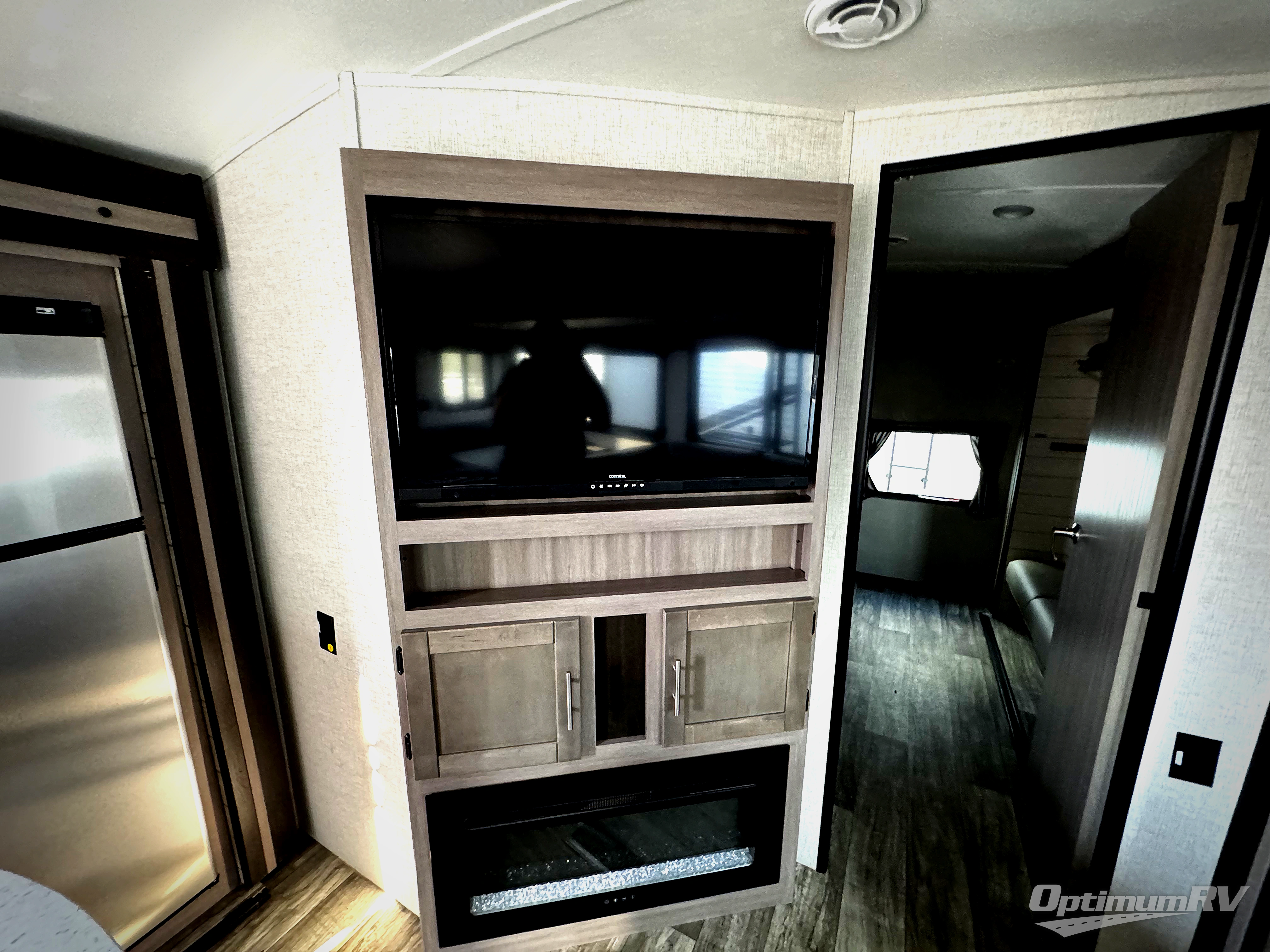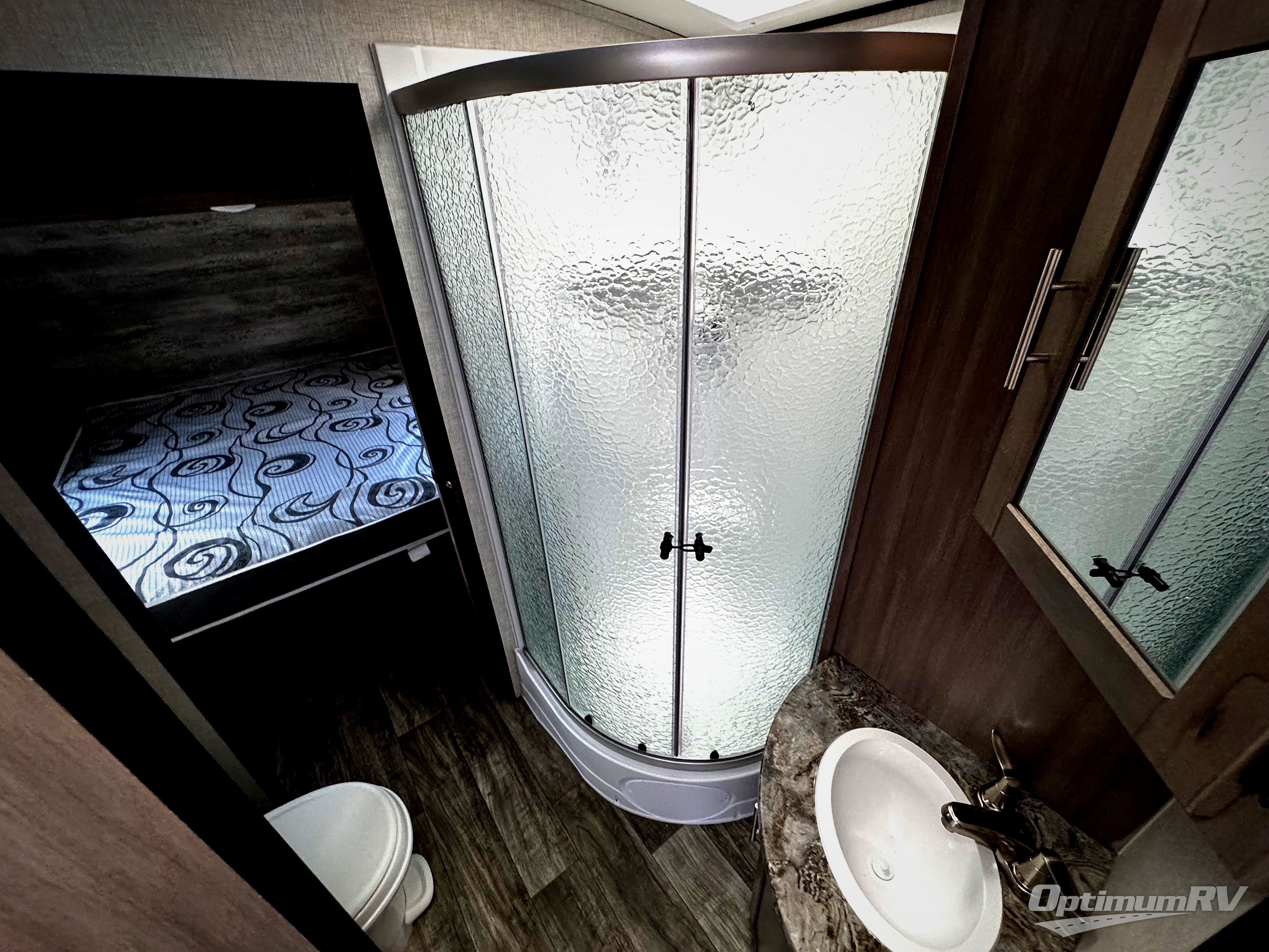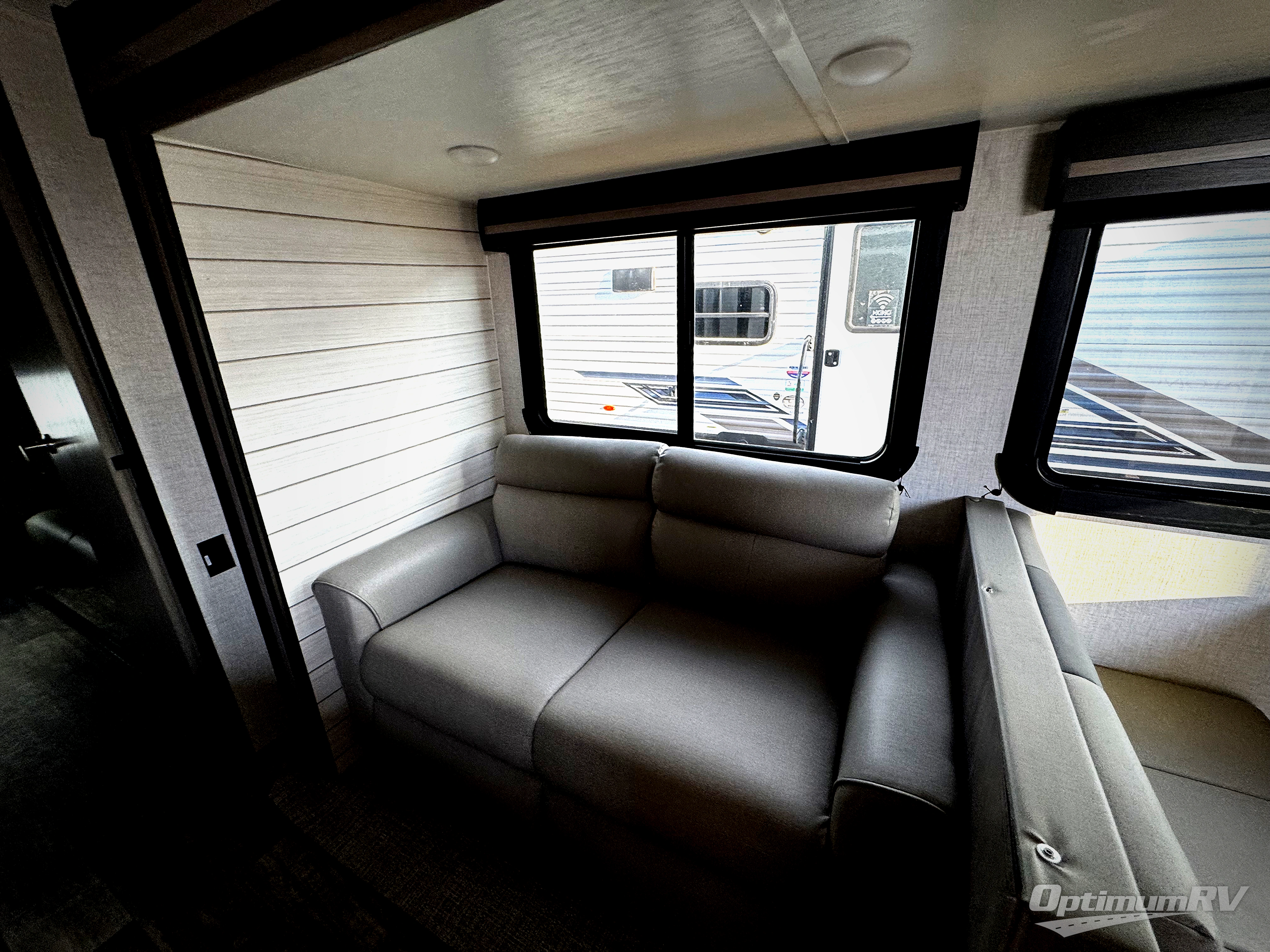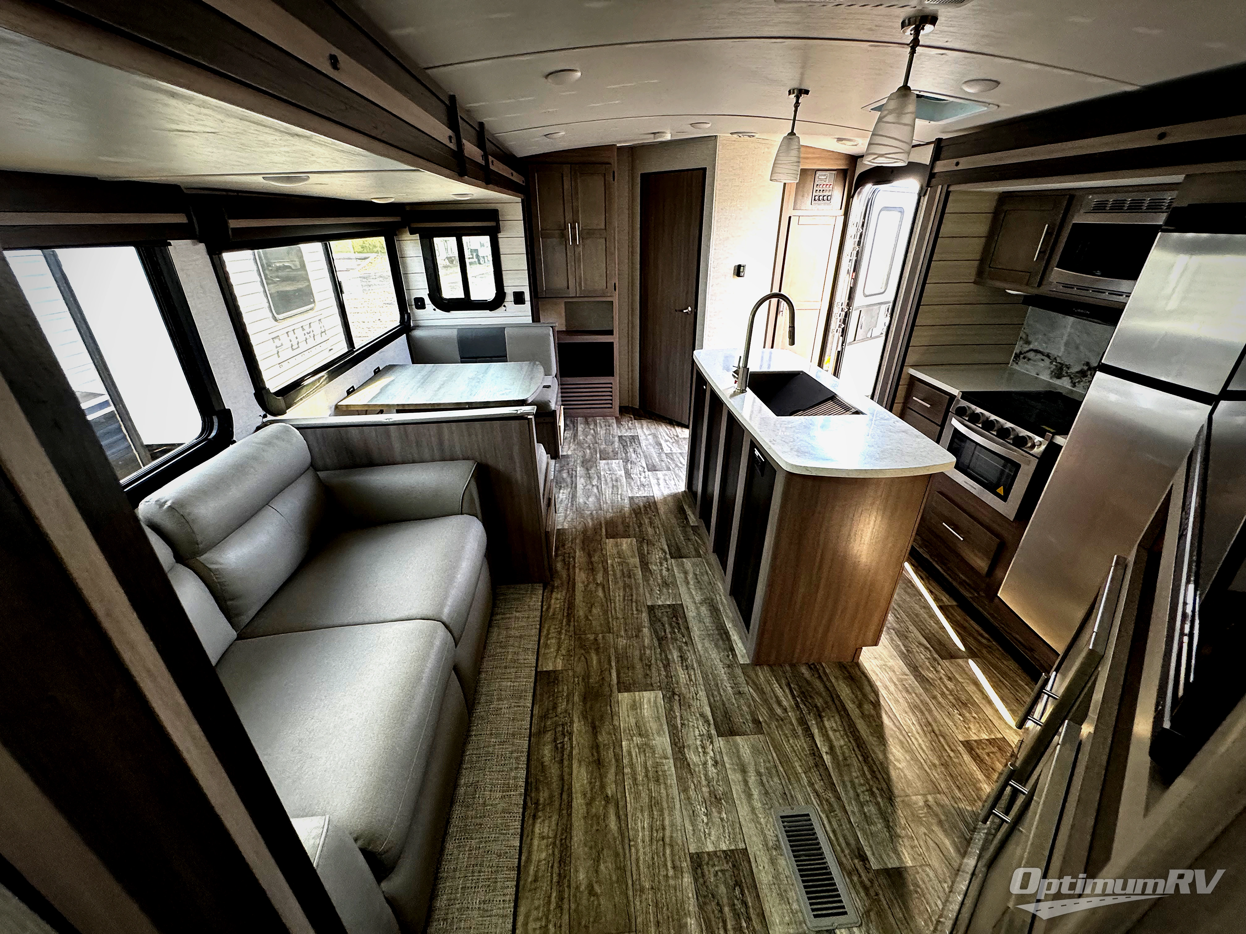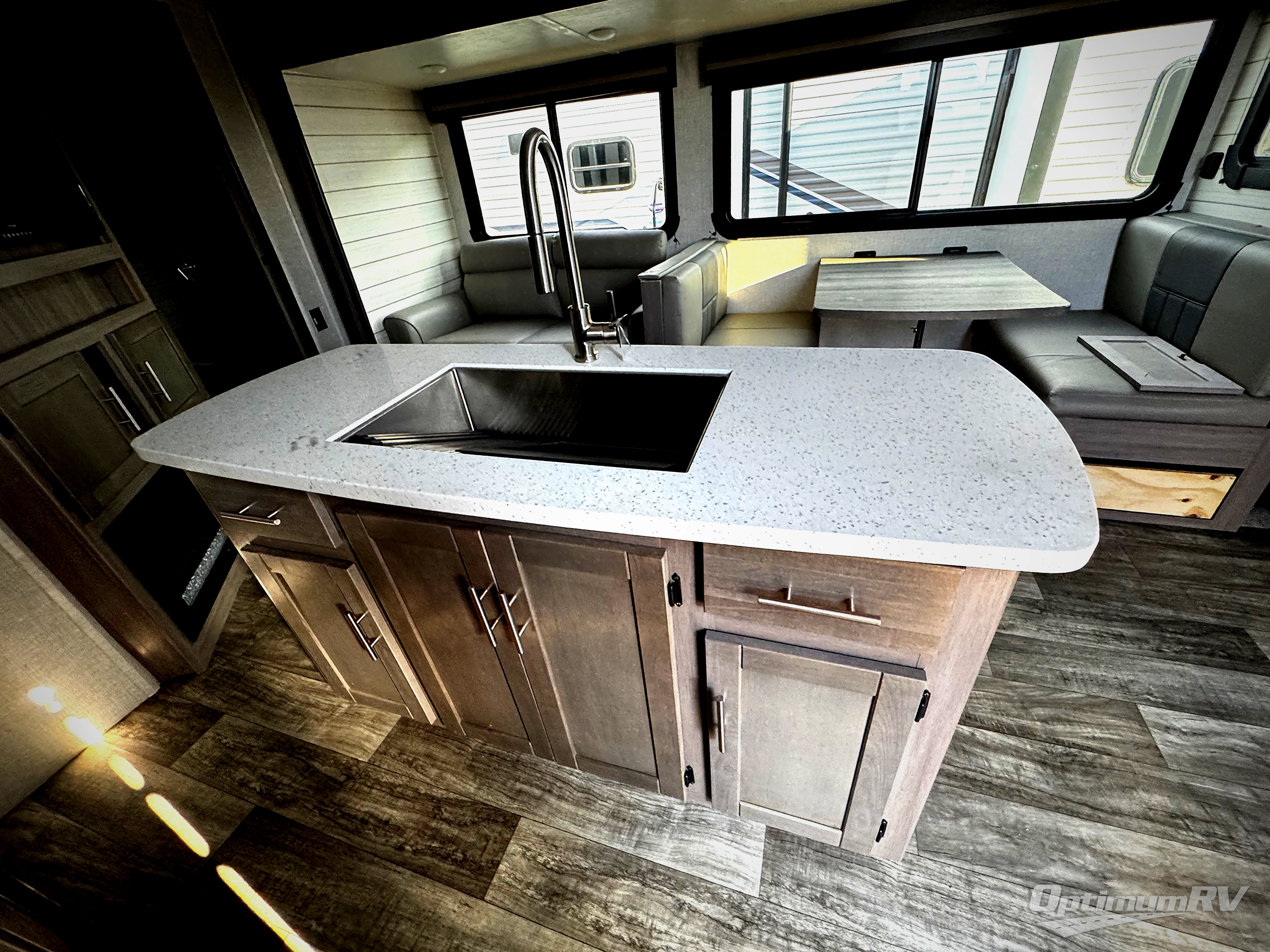 With any Sunset Trail travel trailer by CrossRoads RV, the interior offers a stainless steel farmhouse sink with a cover, solid surface kitchen countertops, and a docking station with 12 Volt, USB Port, and 110 Outlets. Also included is a 13,500 BTU air conditioner plus upgraded insulation with roof and floor reflective foil for added comfort, plus sturdy construction elements like a plywood bed board with strut assist, residential wood window trim, and hardwood cabinet doors. Make your lightweight and comfortable RV decision today!
