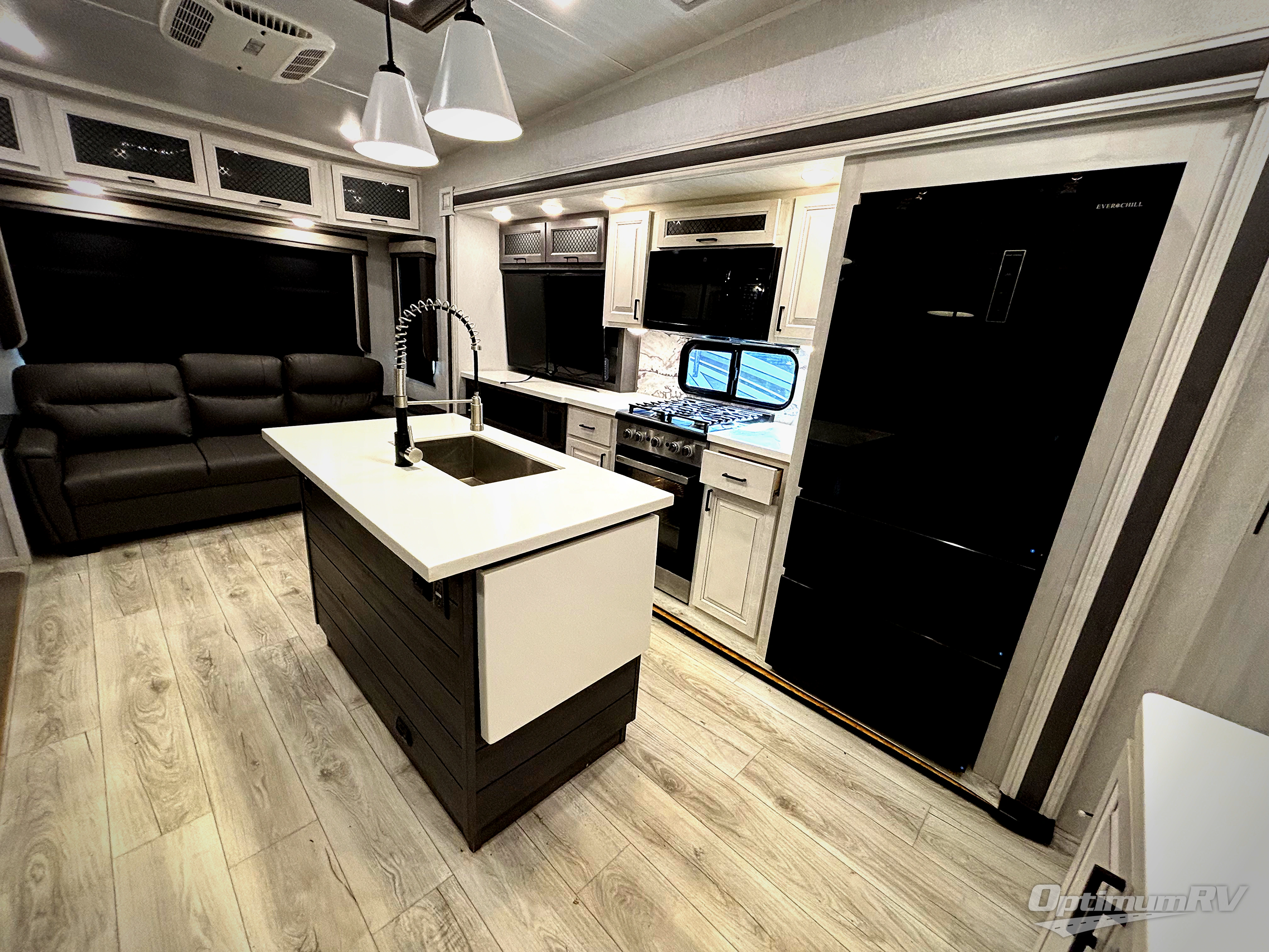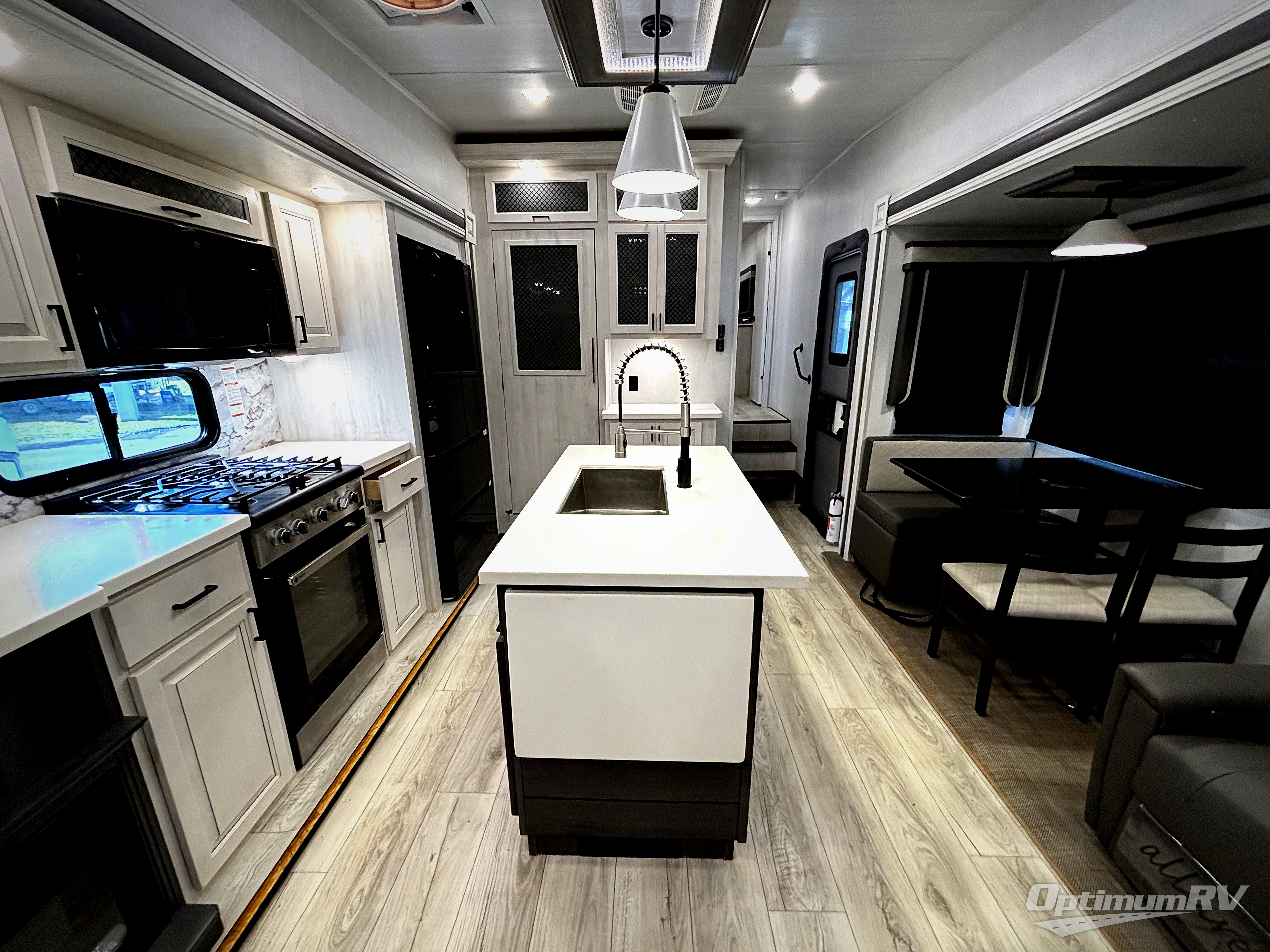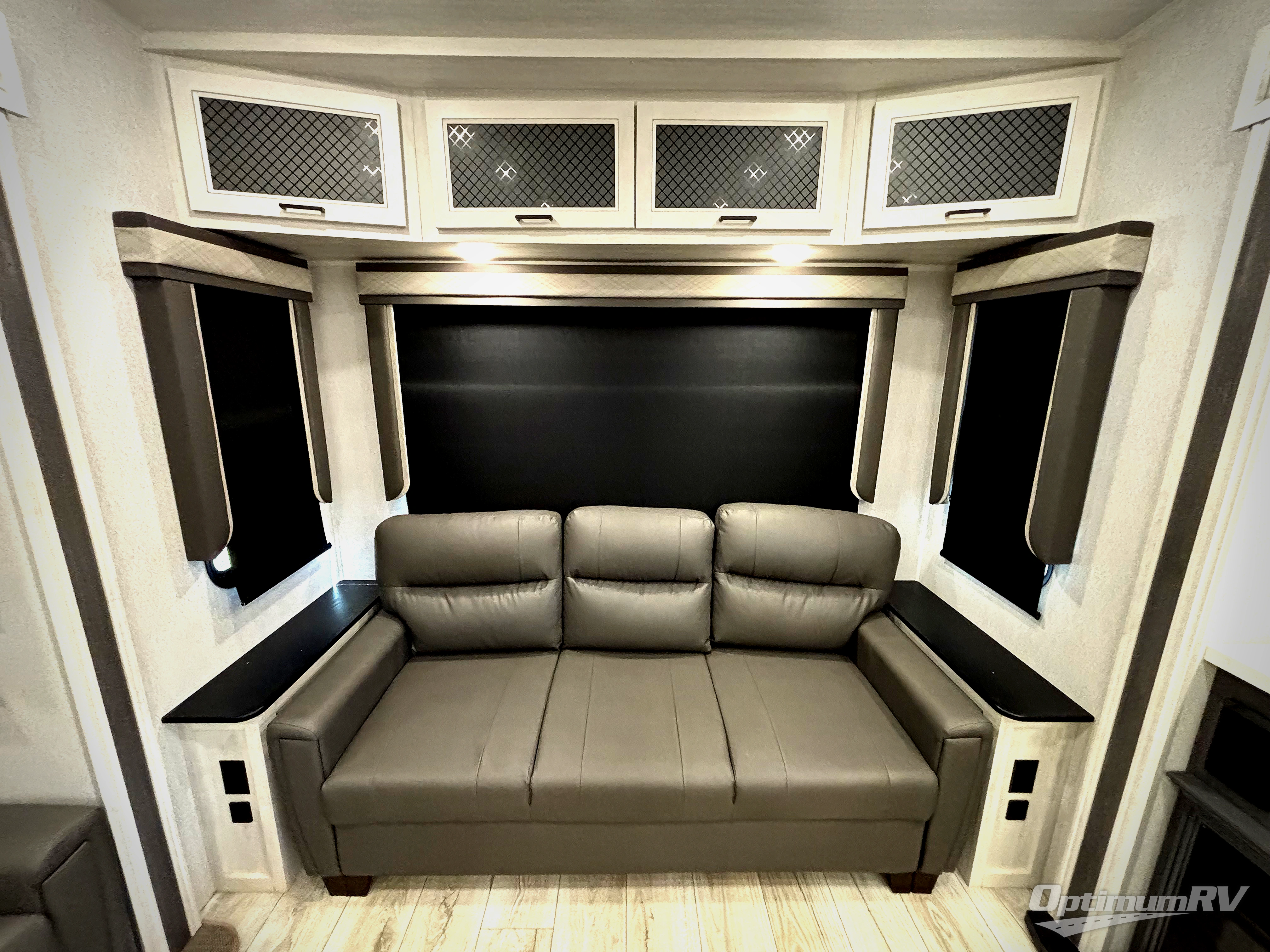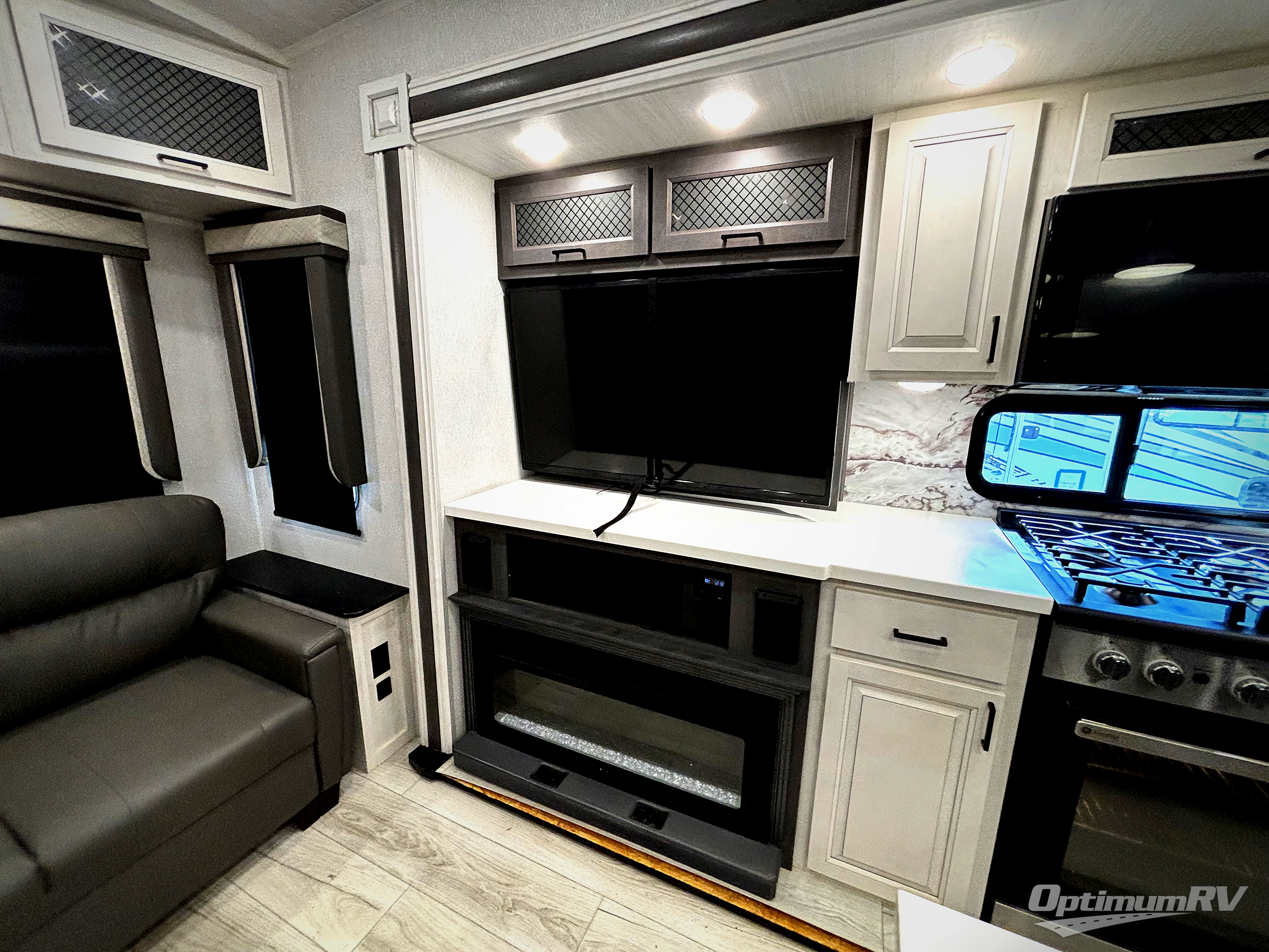 Besides the dimensions and the weights, the only real difference between this Ahara fifth wheel and model 325RL is the bedroom and bathroom configuration. This model offers you a private bedroom that has a king bed slide with drawers under the bed, a dresser across from the bed for adding a TV, a closet specifically created to hold an optional washer/dryer, and a large closet with sliding doors for your clothes. The full bathroom is located right next to the bedroom, but it is separate from the bedroom so that it can offer you a dual-sink vanity which is helpful because it allows two people to wash their face and brush their teeth at the same time. The kitchen is quite amazing with its kitchen island with countertop extensions, pantry and hutch, 16-cubic foot 12V refrigerator, and 24" residential oven. As you sit back on the theater seating or 78" sofa, you'll be kept warm by the 5,100 BTU electric fireplace below the TV.