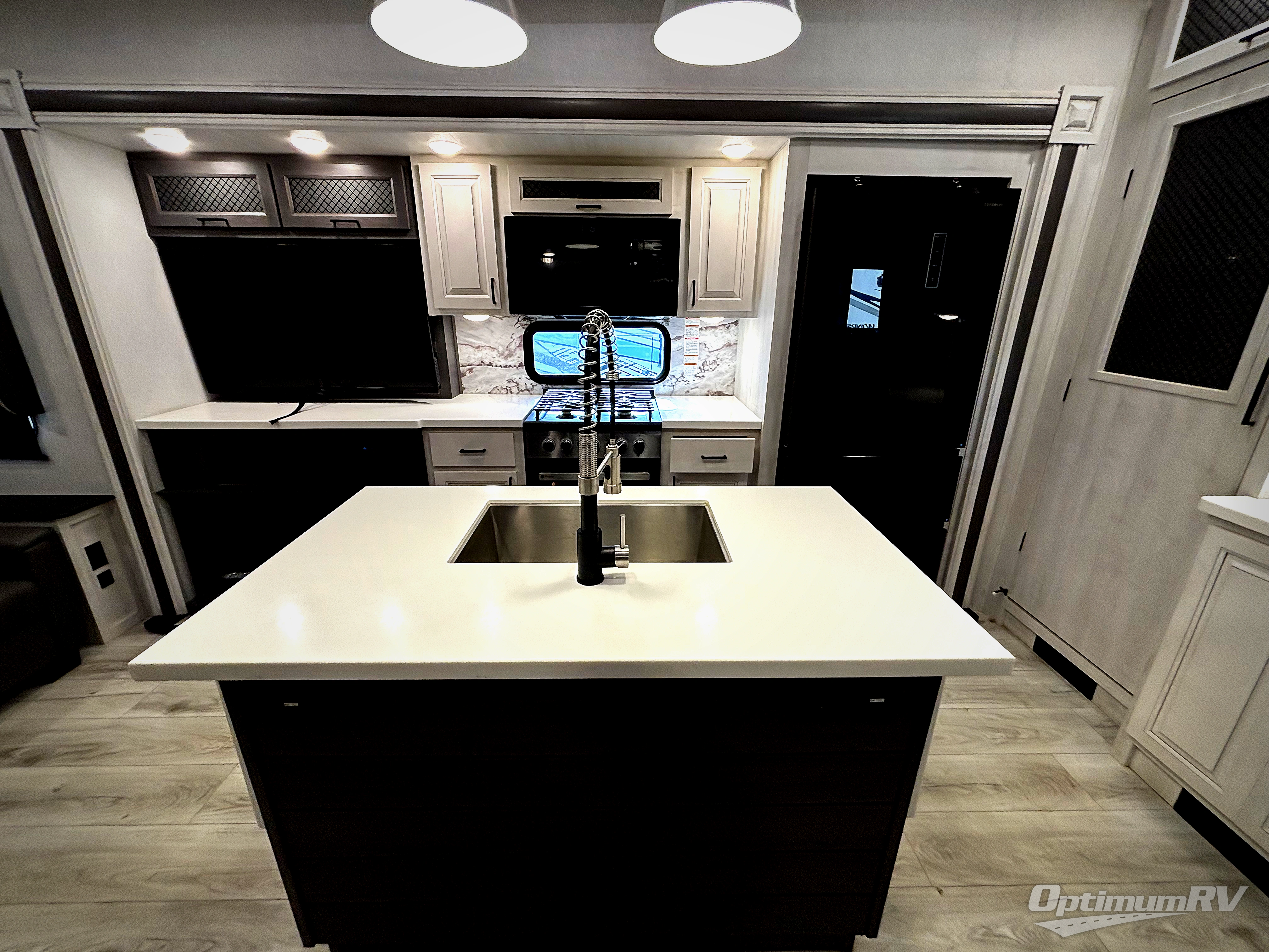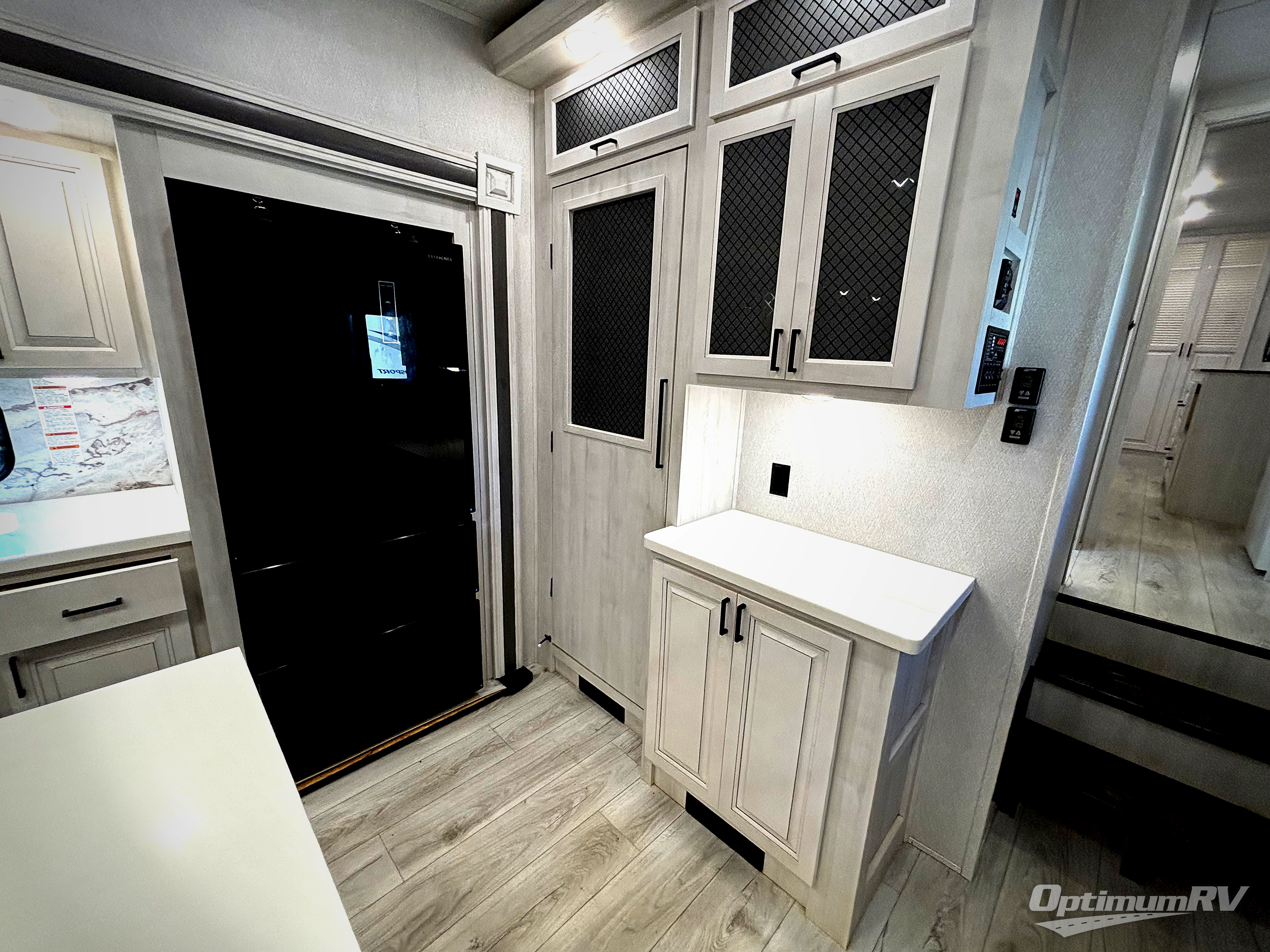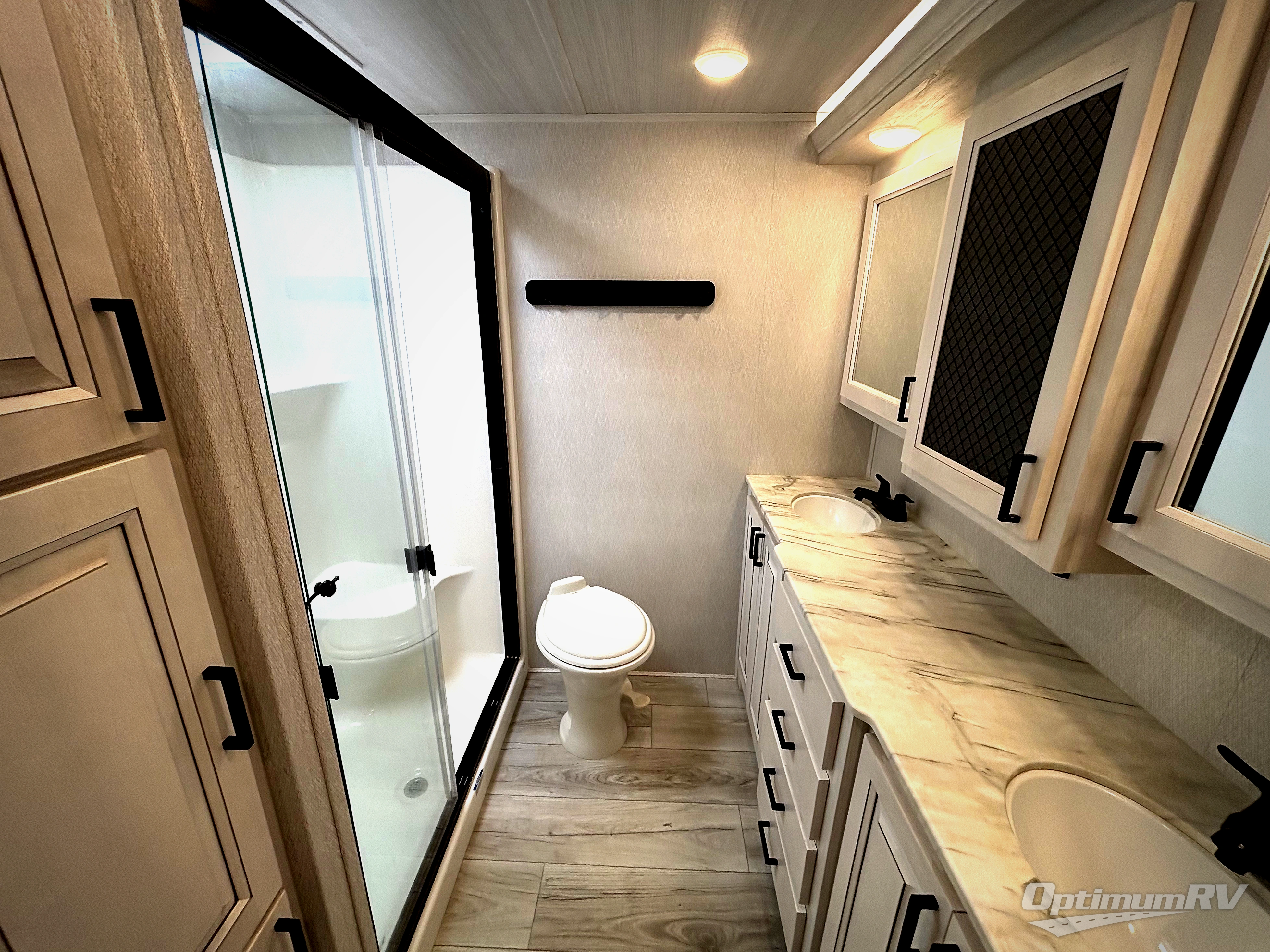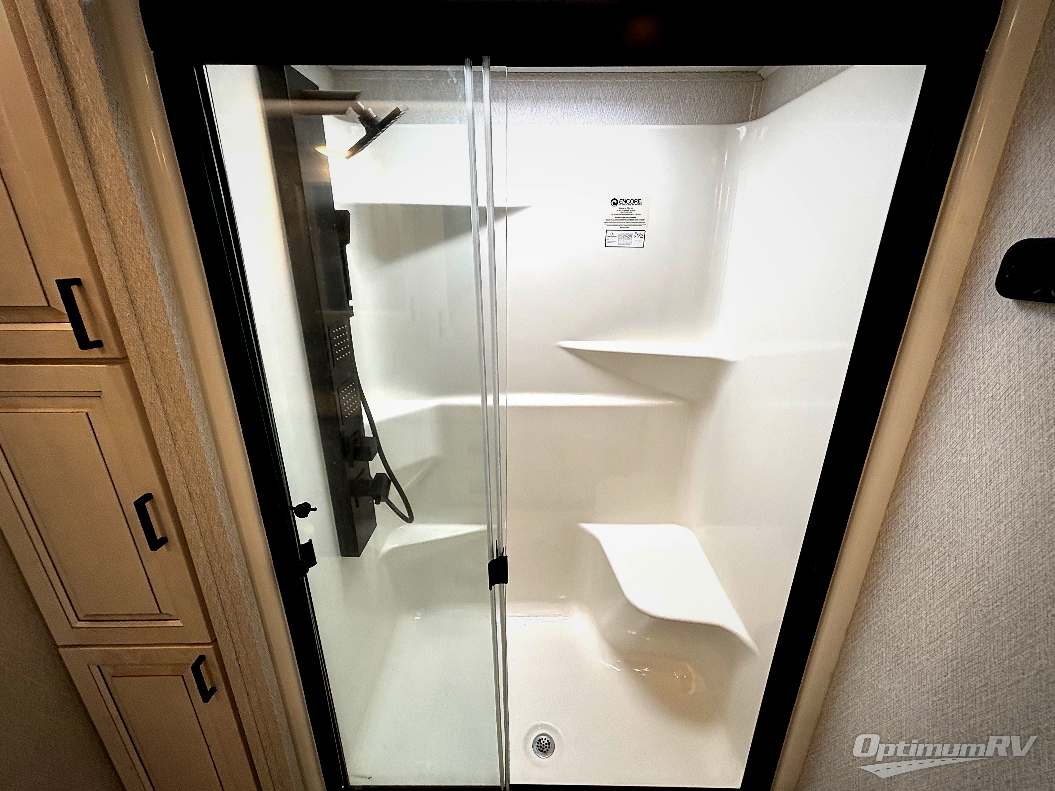Besides the dimensions and the weights, the only real difference between this Ahara fifth wheel and model 325RL is the bedroom and bathroom configuration. This model offers you a private bedroom that has a king bed slide with drawers under the bed, a dresser across from the bed for adding a TV, a closet specifically created to hold an optional washer/dryer, and a large closet with sliding doors for your clothes. The full bathroom is located right next to the bedroom, but it is separate from the bedroom so that it can offer you a dual-sink vanity which is helpful because it allows two people to wash their face and brush their teeth at the same time. The kitchen is quite amazing with its kitchen island with countertop extensions, pantry and hutch, 16-cubic foot 12V refrigerator, and 24" residential oven. As you sit back on the theater seating or 78" sofa, you'll be kept warm by the 5,100 BTU electric fireplace below the TV.