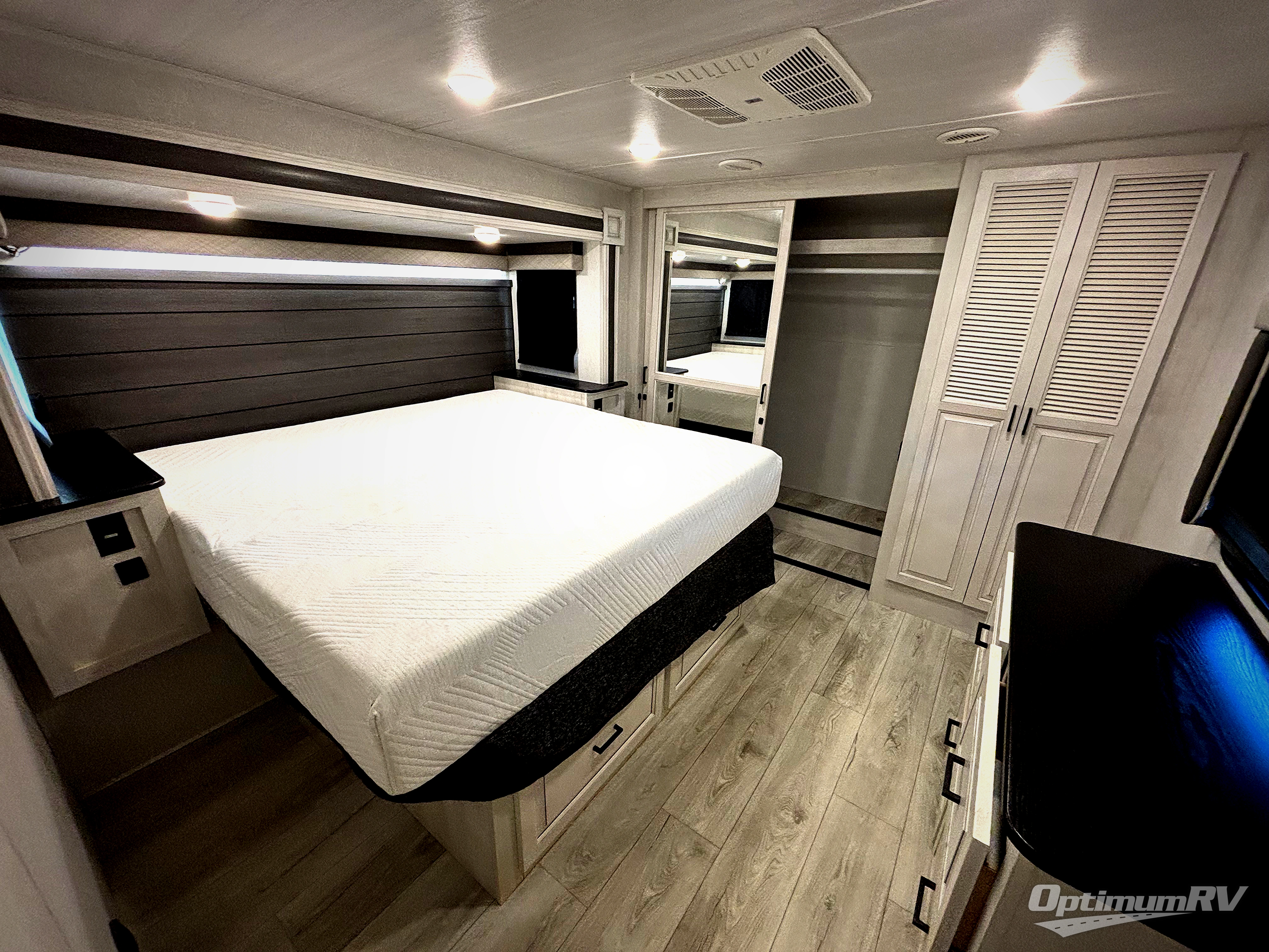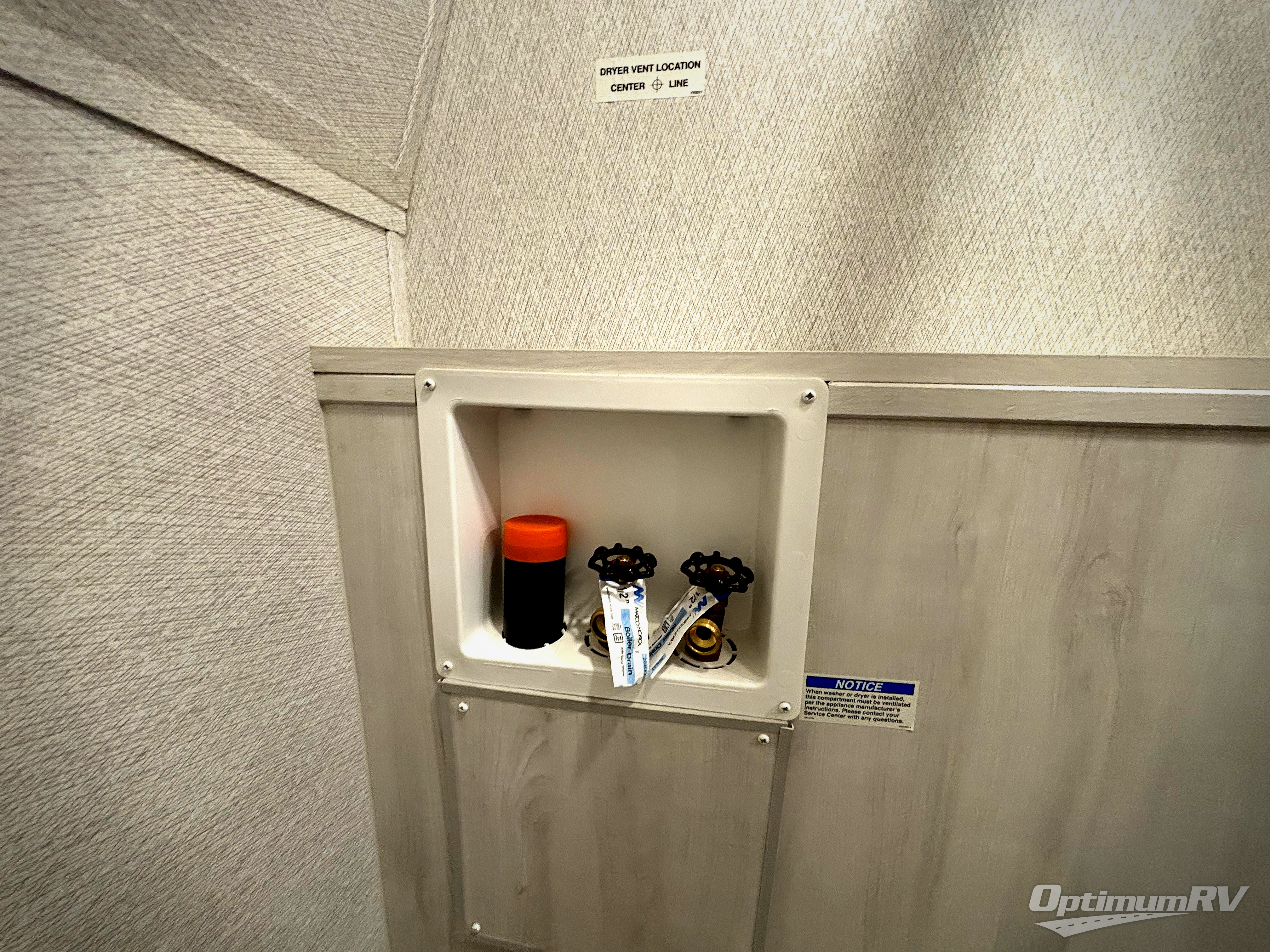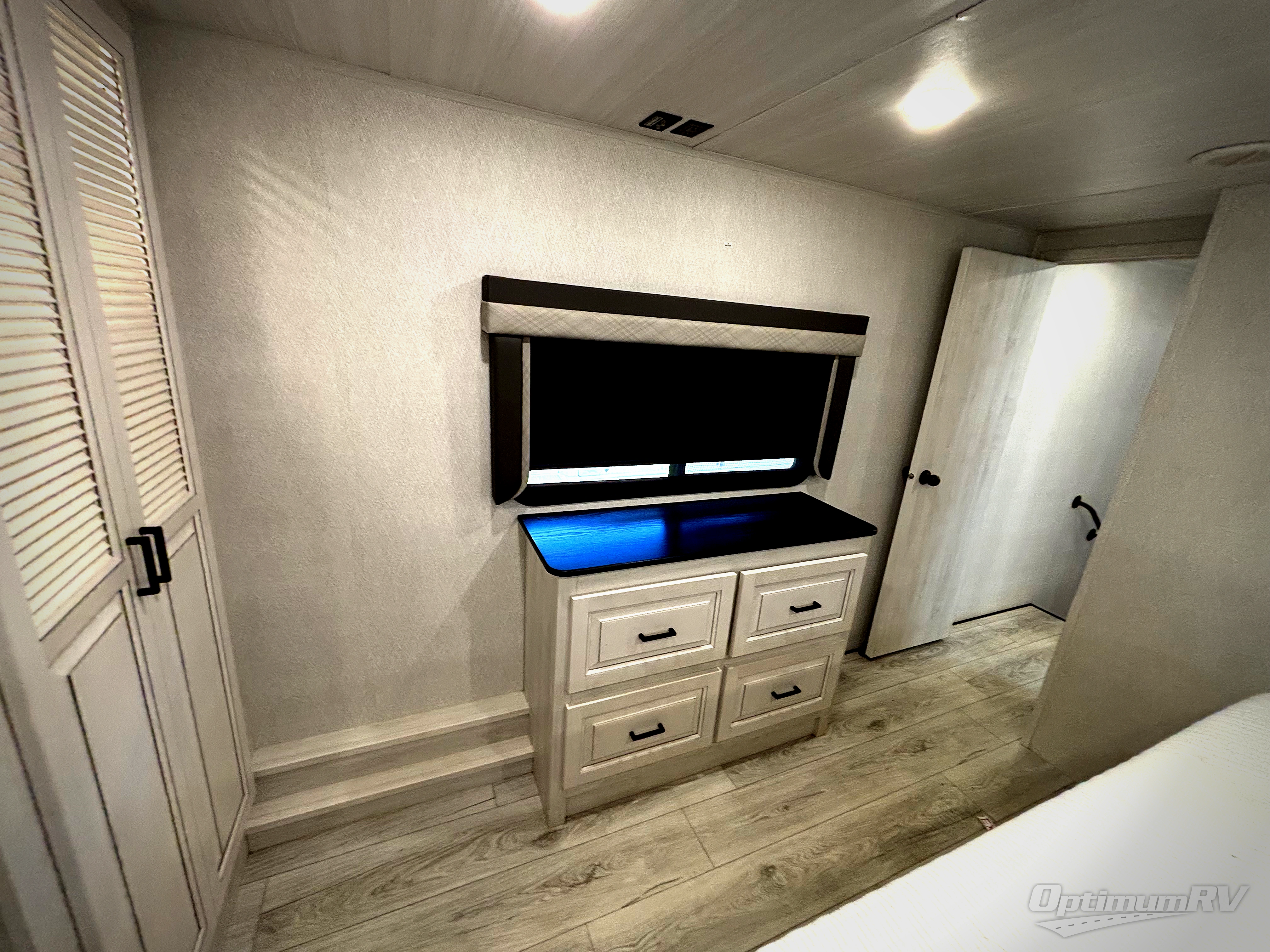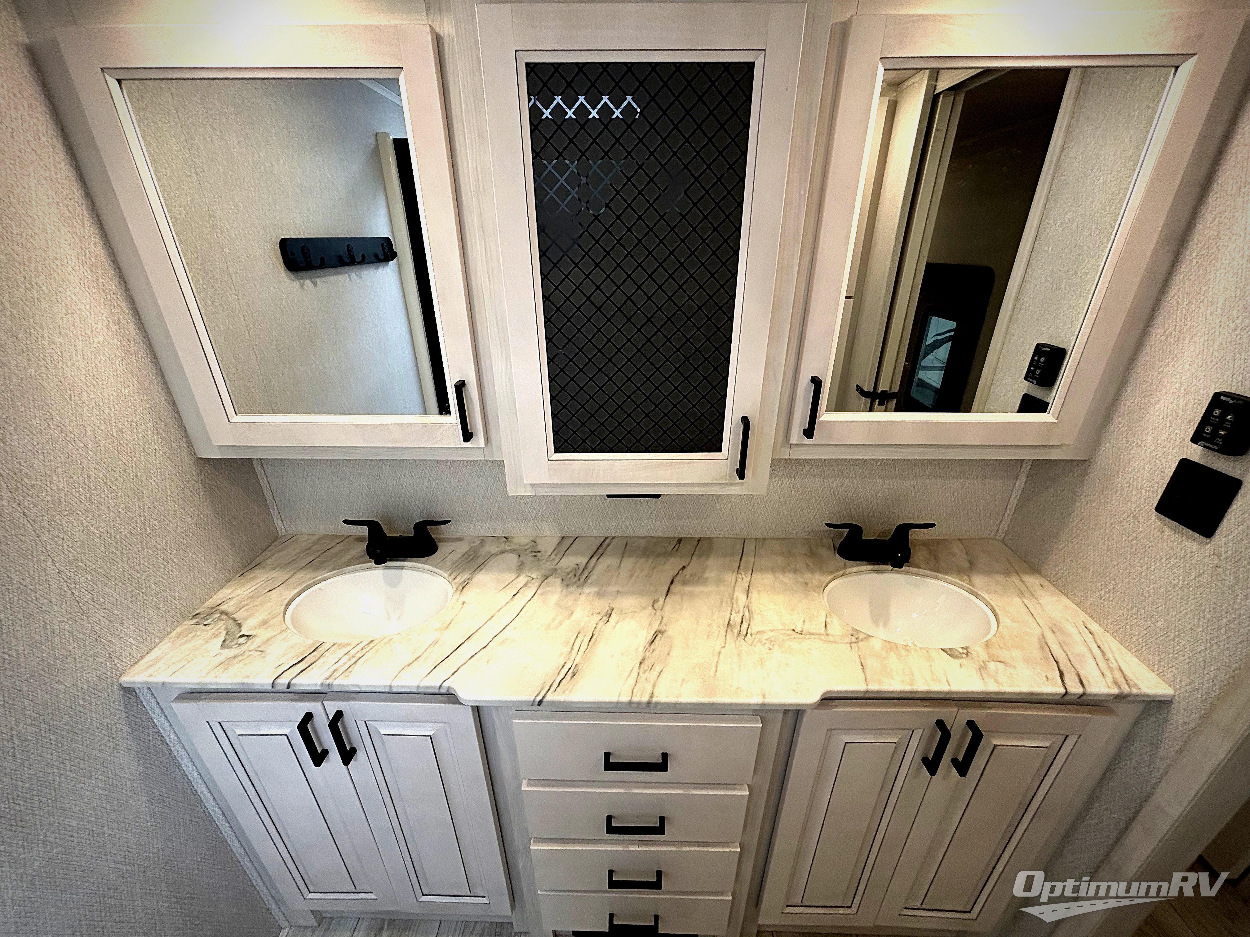 Besides the dimensions and the weights, the only real difference between this Ahara fifth wheel and model 325RL is the bedroom and bathroom configuration. This model offers you a private bedroom that has a king bed slide with drawers under the bed, a dresser across from the bed for adding a TV, a closet specifically created to hold an optional washer/dryer, and a large closet with sliding doors for your clothes. The full bathroom is located right next to the bedroom, but it is separate from the bedroom so that it can offer you a dual-sink vanity which is helpful because it allows two people to wash their face and brush their teeth at the same time. The kitchen is quite amazing with its kitchen island with countertop extensions, pantry and hutch, 16-cubic foot 12V refrigerator, and 24" residential oven. As you sit back on the theater seating or 78" sofa, you'll be kept warm by the 5,100 BTU electric fireplace below the TV.