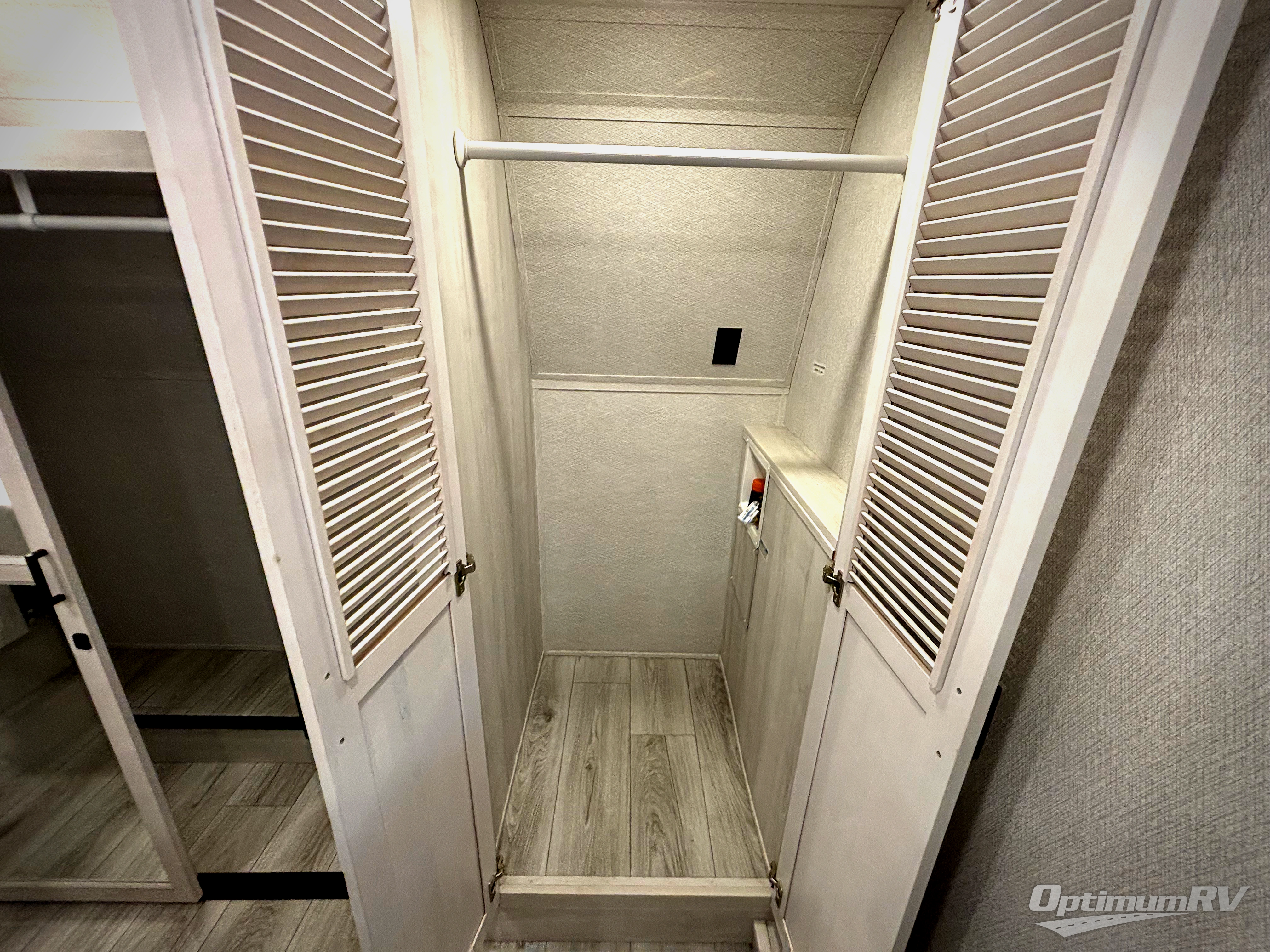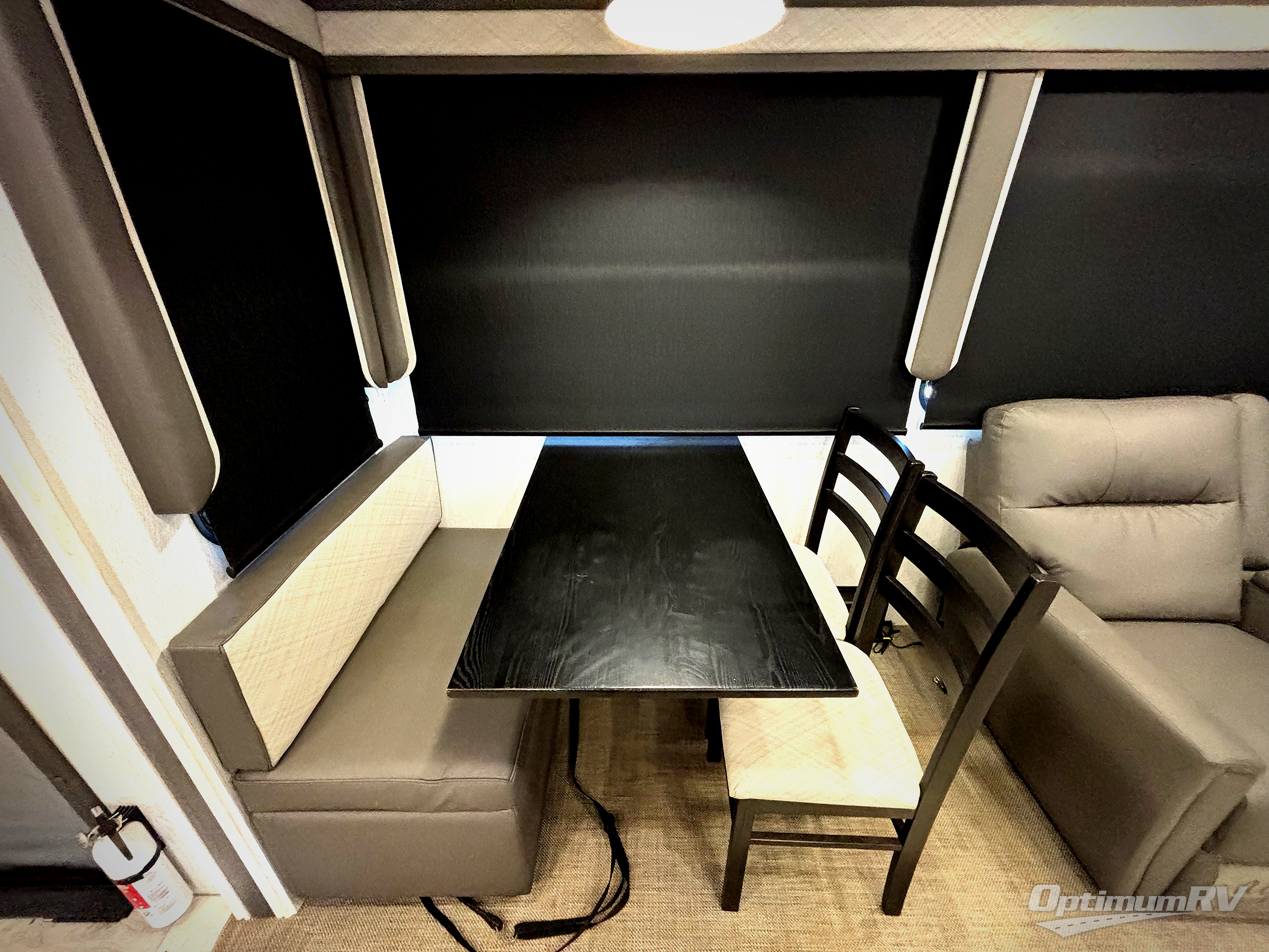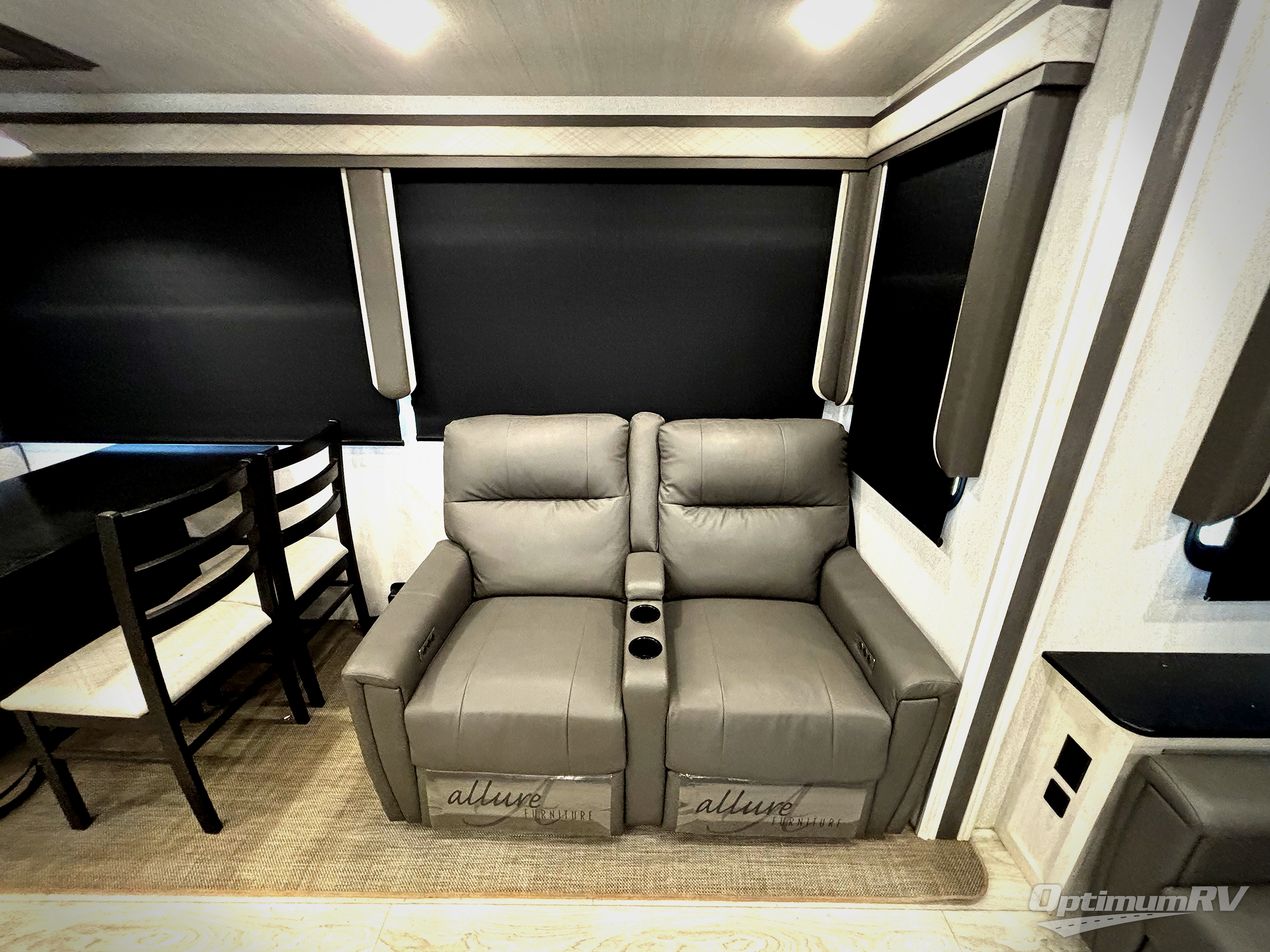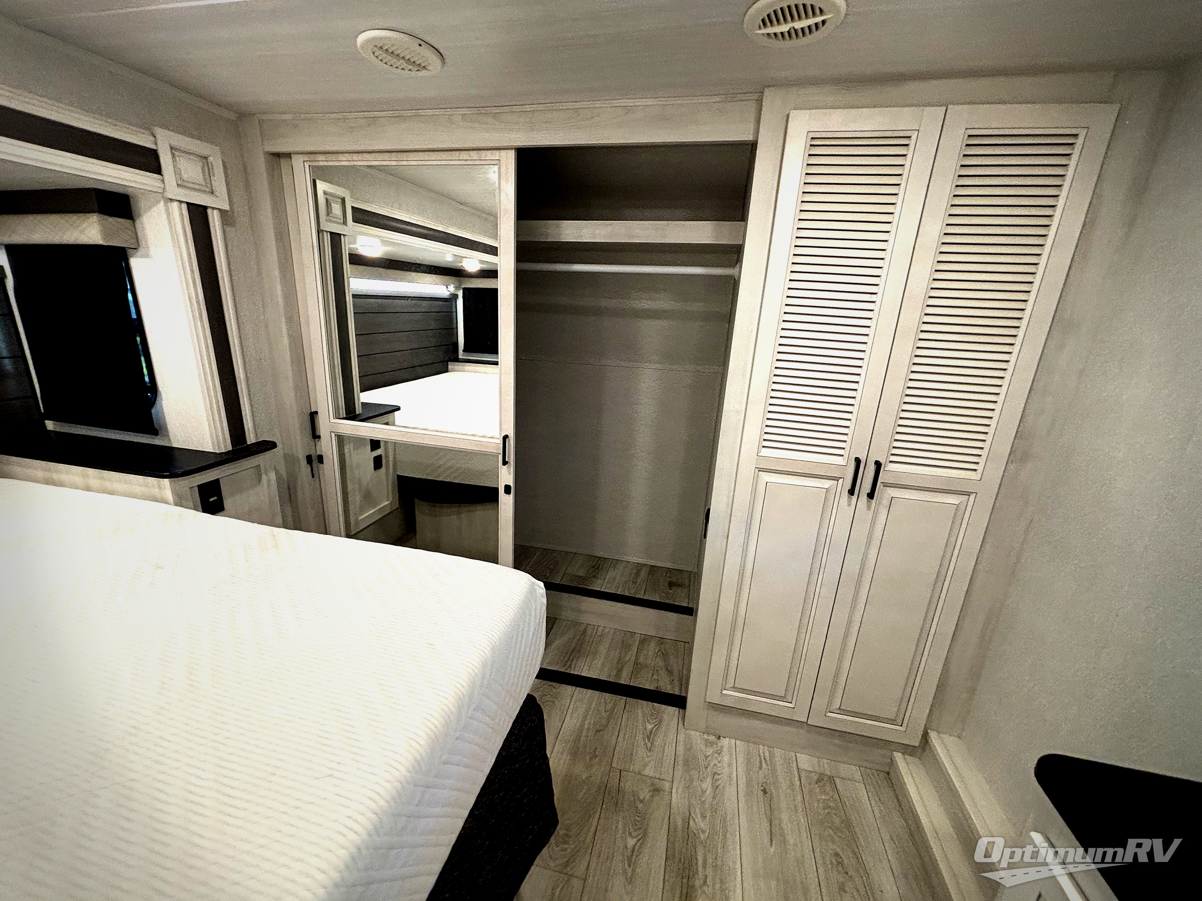 Besides the dimensions and the weights, the only real difference between this Ahara fifth wheel and model 325RL is the bedroom and bathroom configuration. This model offers you a private bedroom that has a king bed slide with drawers under the bed, a dresser across from the bed for adding a TV, a closet specifically created to hold an optional washer/dryer, and a large closet with sliding doors for your clothes. The full bathroom is located right next to the bedroom, but it is separate from the bedroom so that it can offer you a dual-sink vanity which is helpful because it allows two people to wash their face and brush their teeth at the same time. The kitchen is quite amazing with its kitchen island with countertop extensions, pantry and hutch, 16-cubic foot 12V refrigerator, and 24" residential oven. As you sit back on the theater seating or 78" sofa, you'll be kept warm by the 5,100 BTU electric fireplace below the TV.