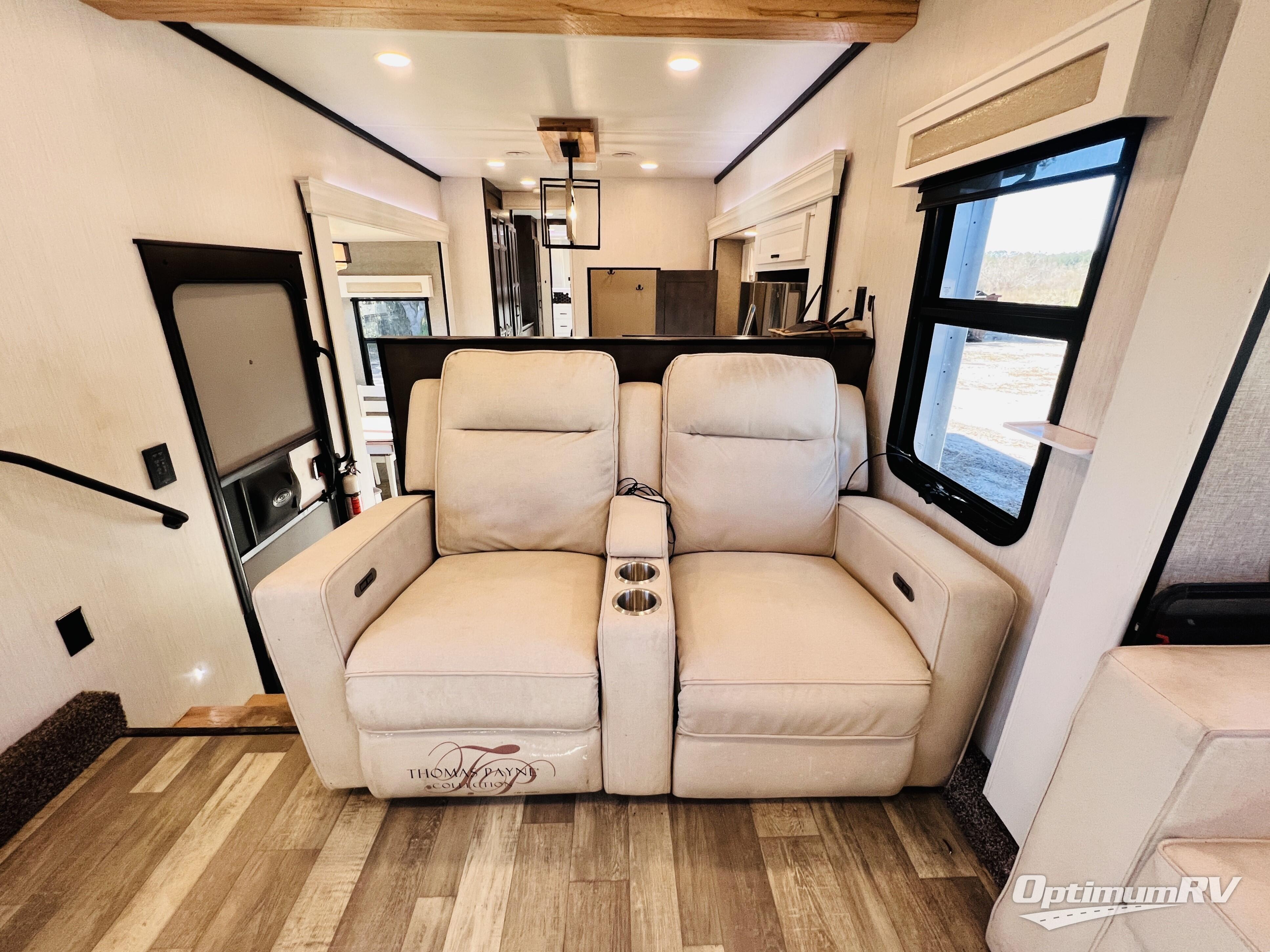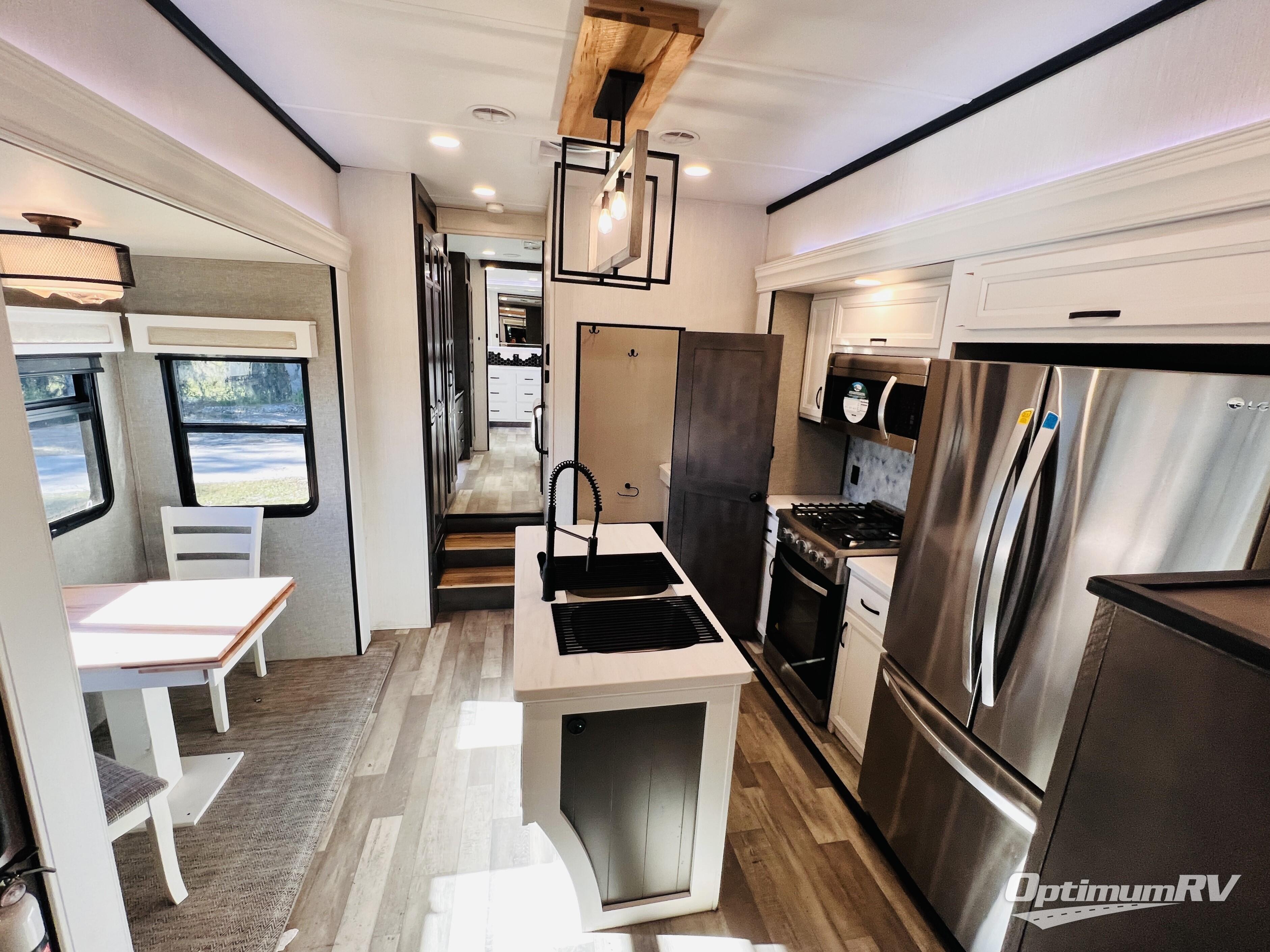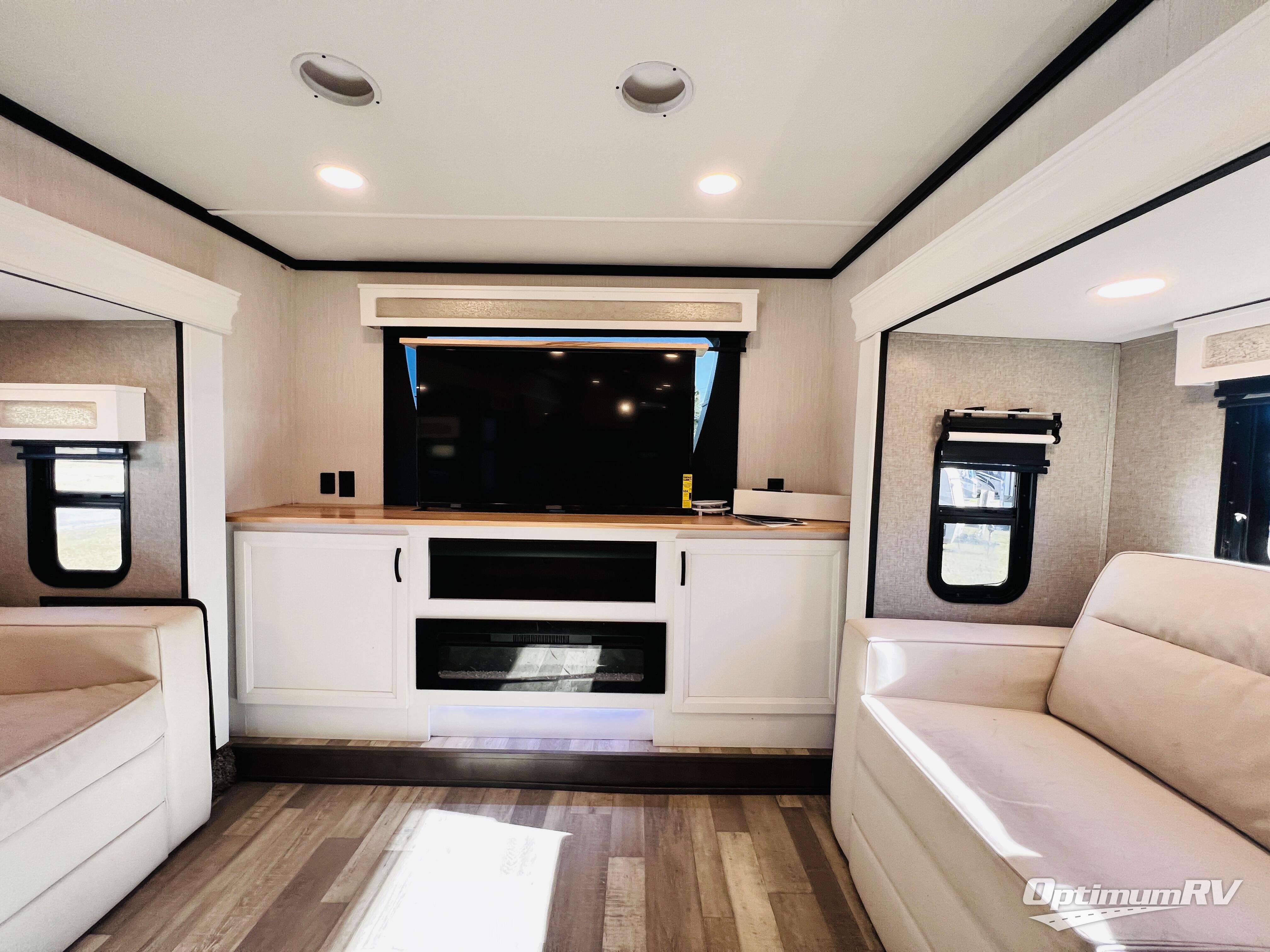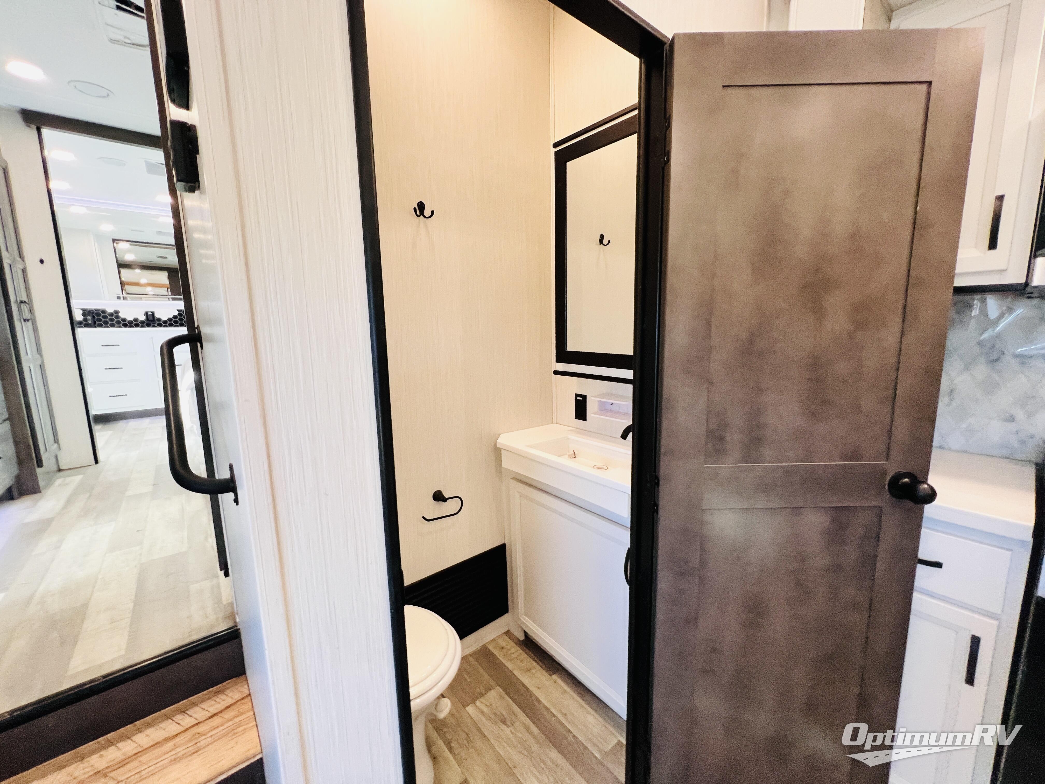 This fifth wheel has everything and then more! The front living area has opposing tri-fold sofas and power theater seating across from the front entertainment center with a fireplace and 50" flat screen TV. The chef can prepare their best meals with the kitchen island with a fold-down breakfast counter, and there is a 20 cu. ft. stainless steel refrigerator for food storage. Enjoy your meals and the extra space provided with the free standing table slide. The master suite has a king bed slide to lay your head at night and access to the full rear bathroom which has a drop-down storage, a shower with a seat, a linen closet, a closet prepped to add an optional washer and dryer, and a dual sink vanity. And the convenient half bath can be traded out for an optional bonus pantry if you don't need the half bath!