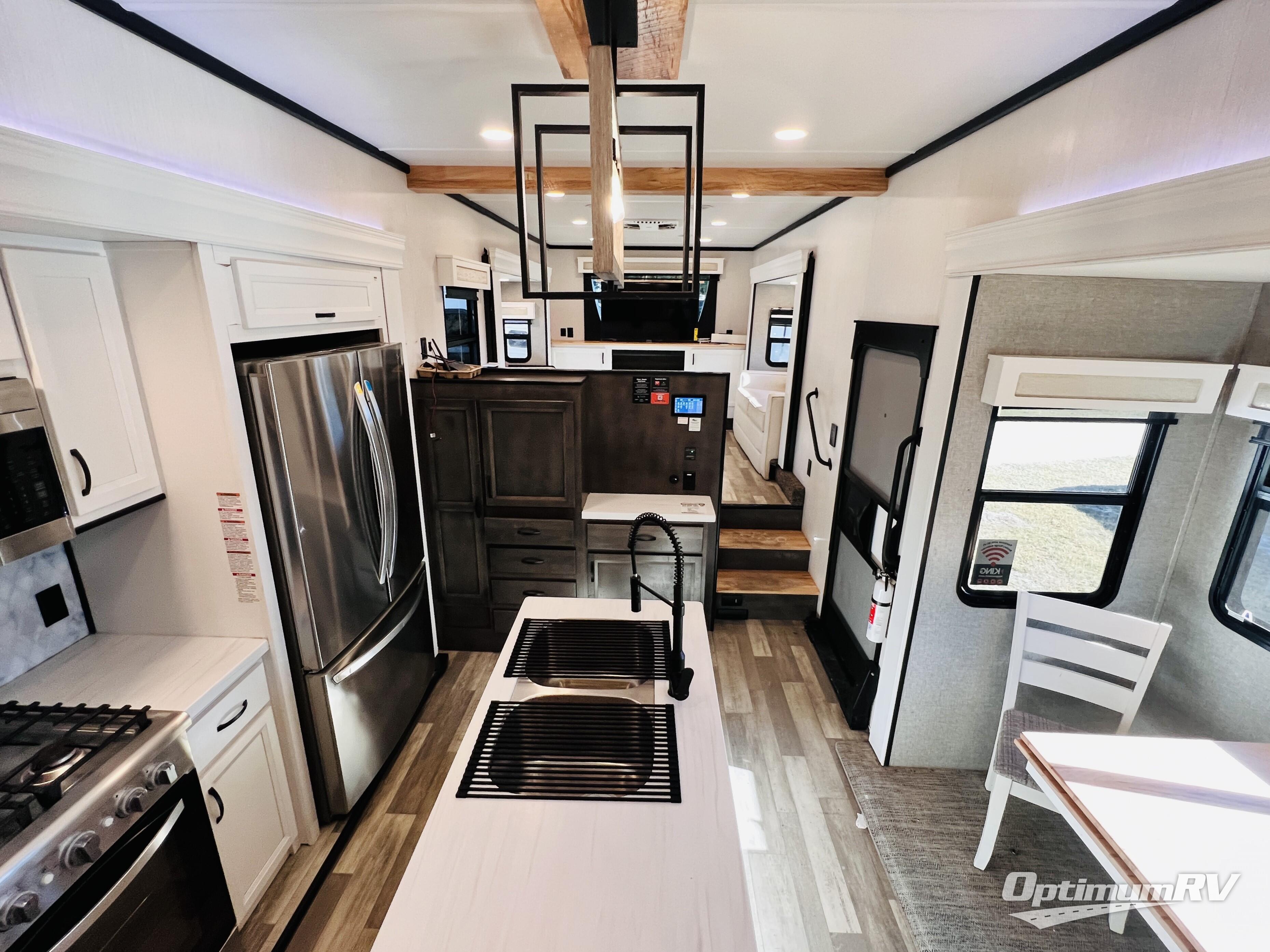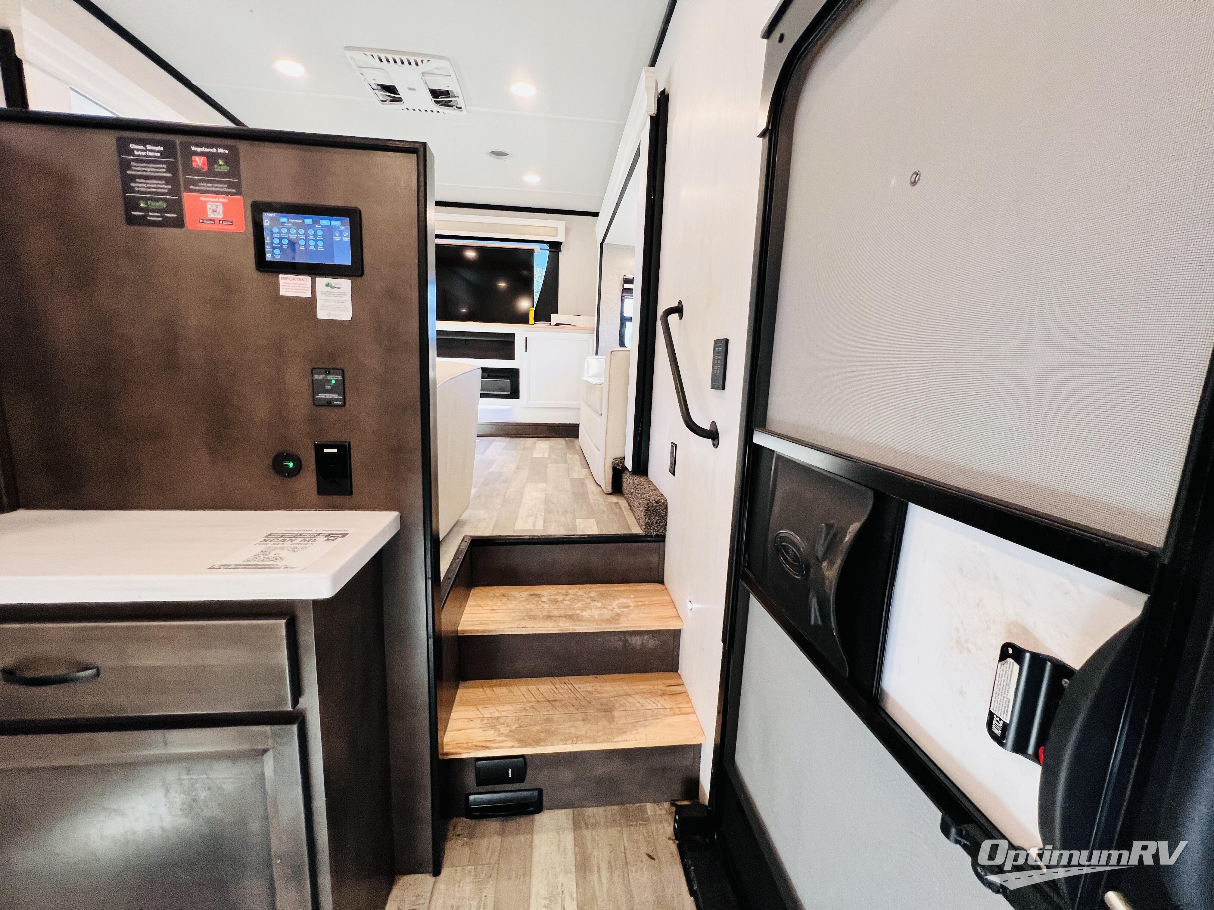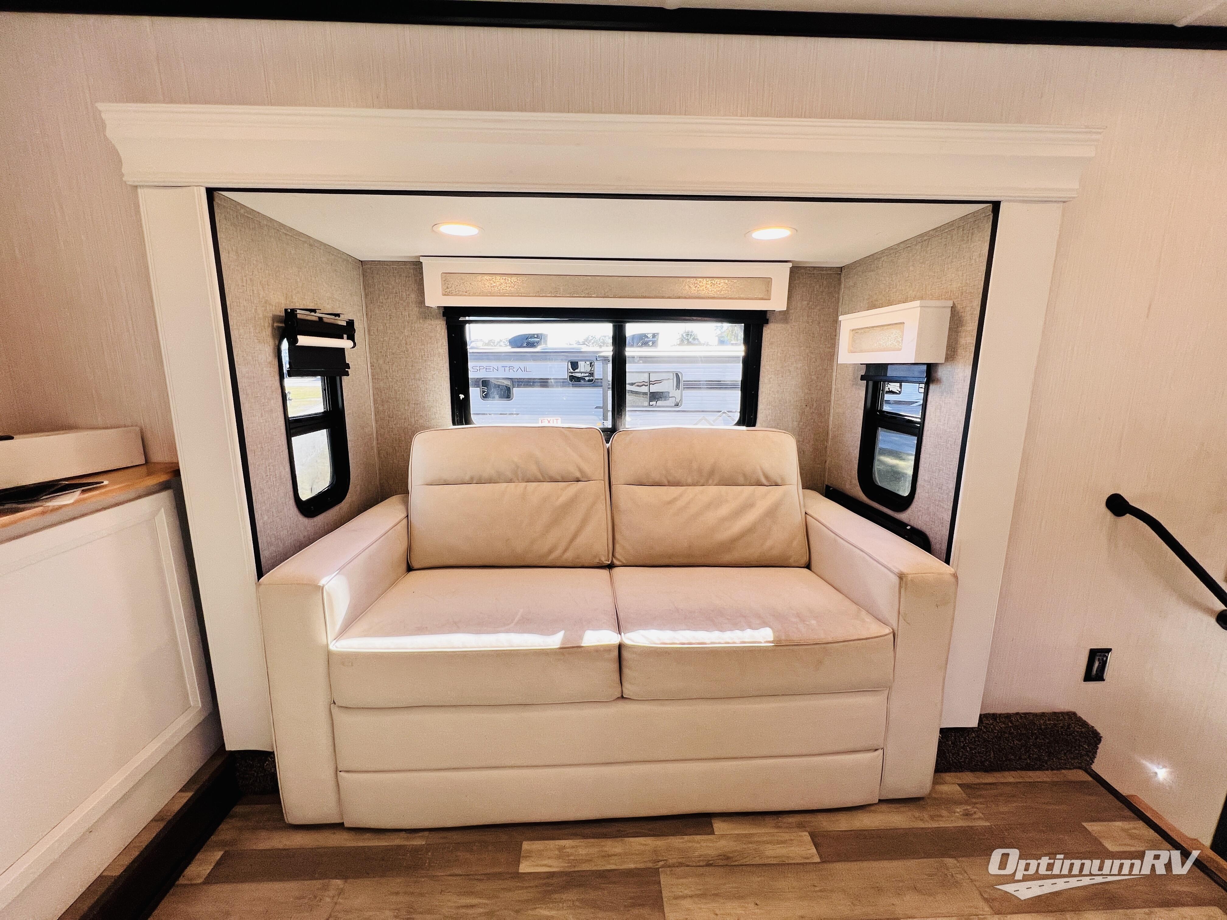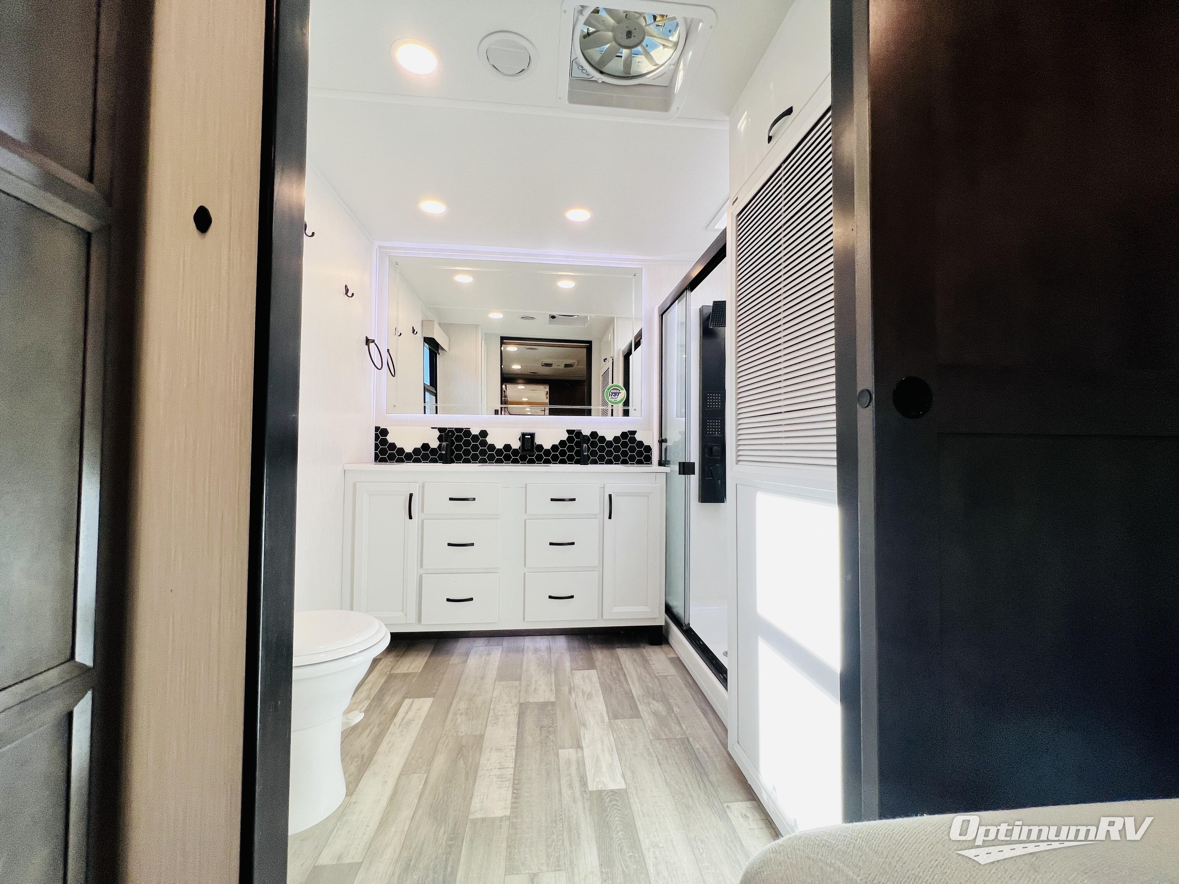 This fifth wheel has everything and then more! The front living area has opposing tri-fold sofas and power theater seating across from the front entertainment center with a fireplace and 50" flat screen TV. The chef can prepare their best meals with the kitchen island with a fold-down breakfast counter, and there is a 20 cu. ft. stainless steel refrigerator for food storage. Enjoy your meals and the extra space provided with the free standing table slide. The master suite has a king bed slide to lay your head at night and access to the full rear bathroom which has a drop-down storage, a shower with a seat, a linen closet, a closet prepped to add an optional washer and dryer, and a dual sink vanity. And the convenient half bath can be traded out for an optional bonus pantry if you don't need the half bath!
