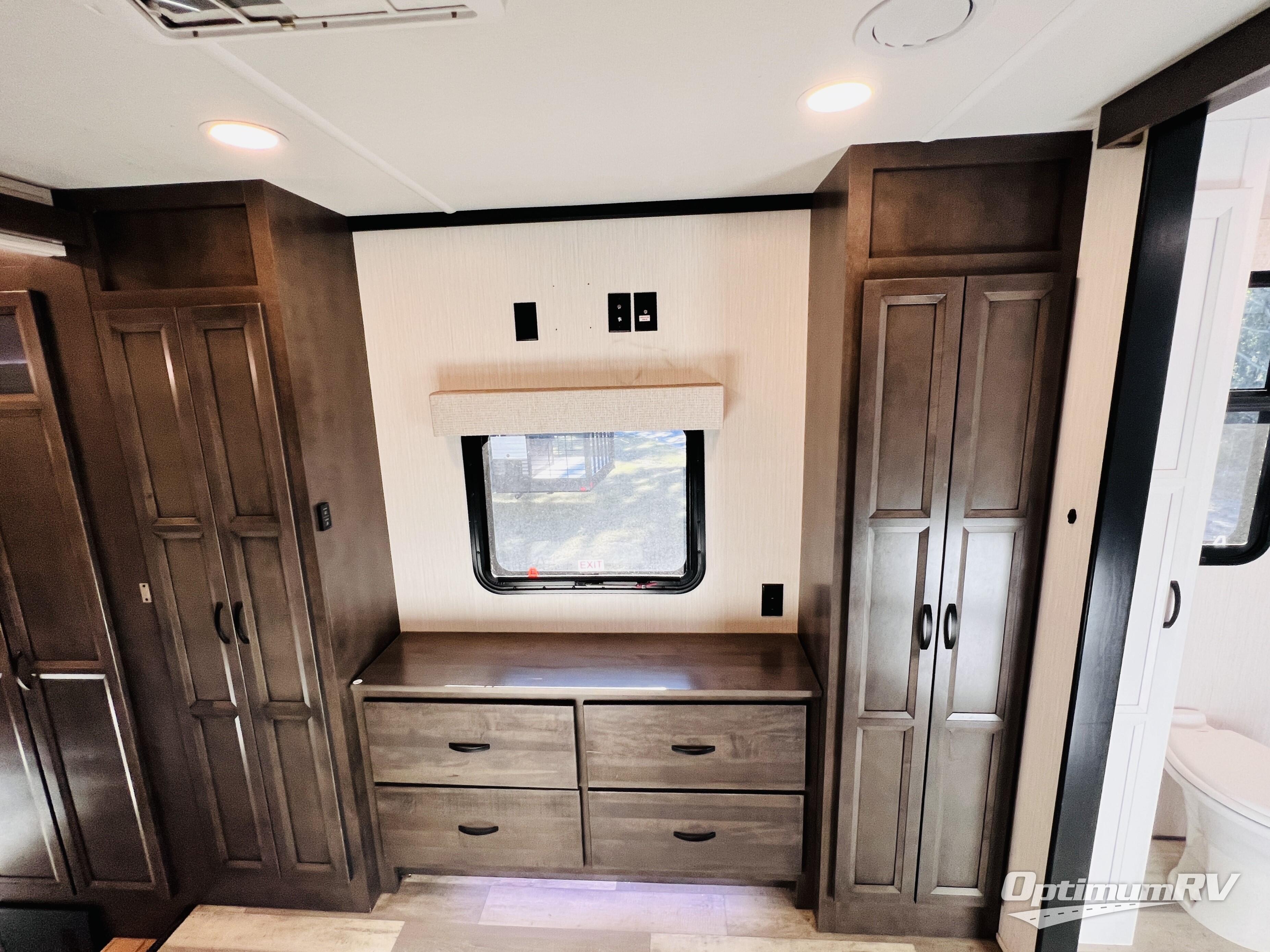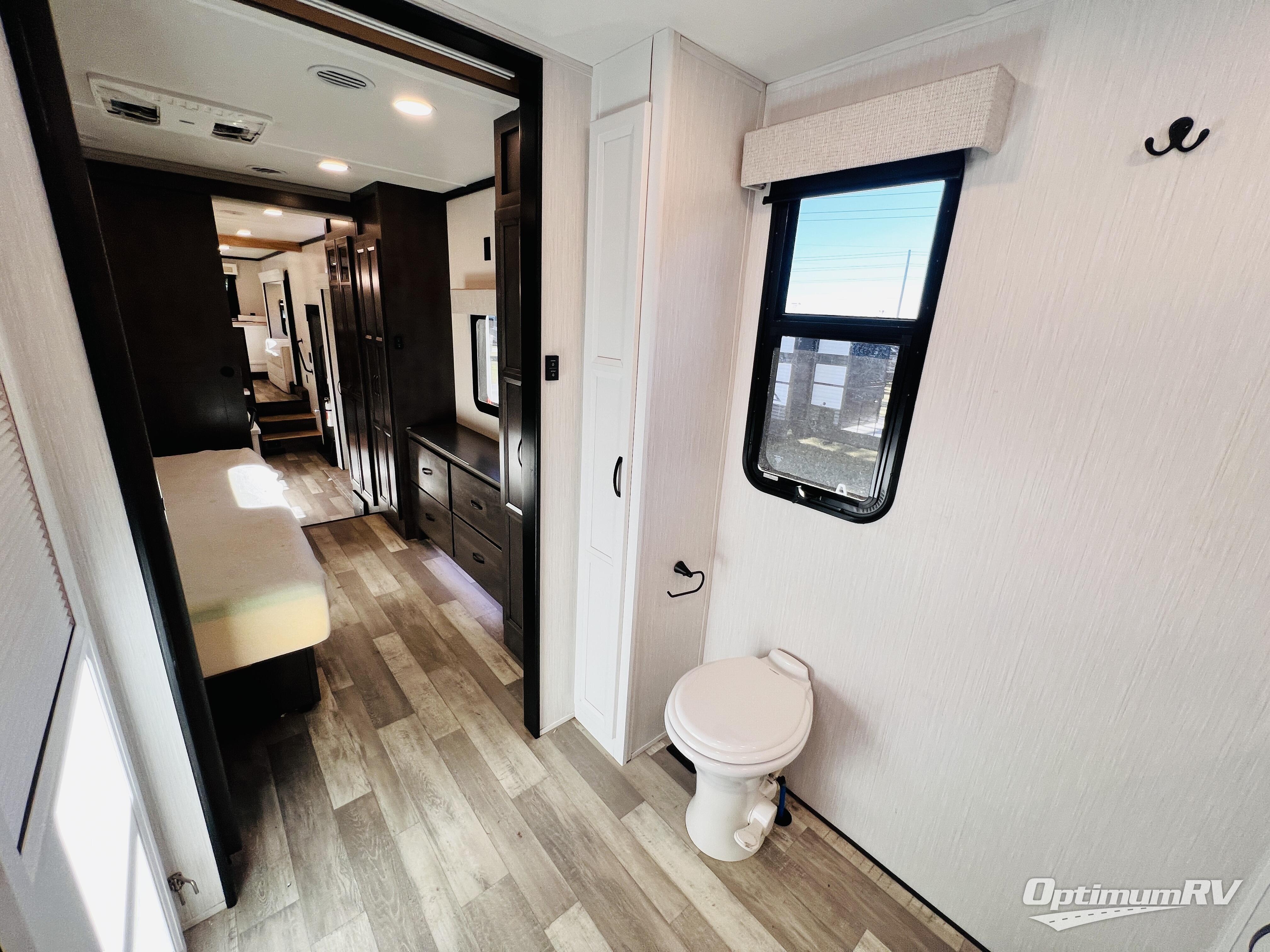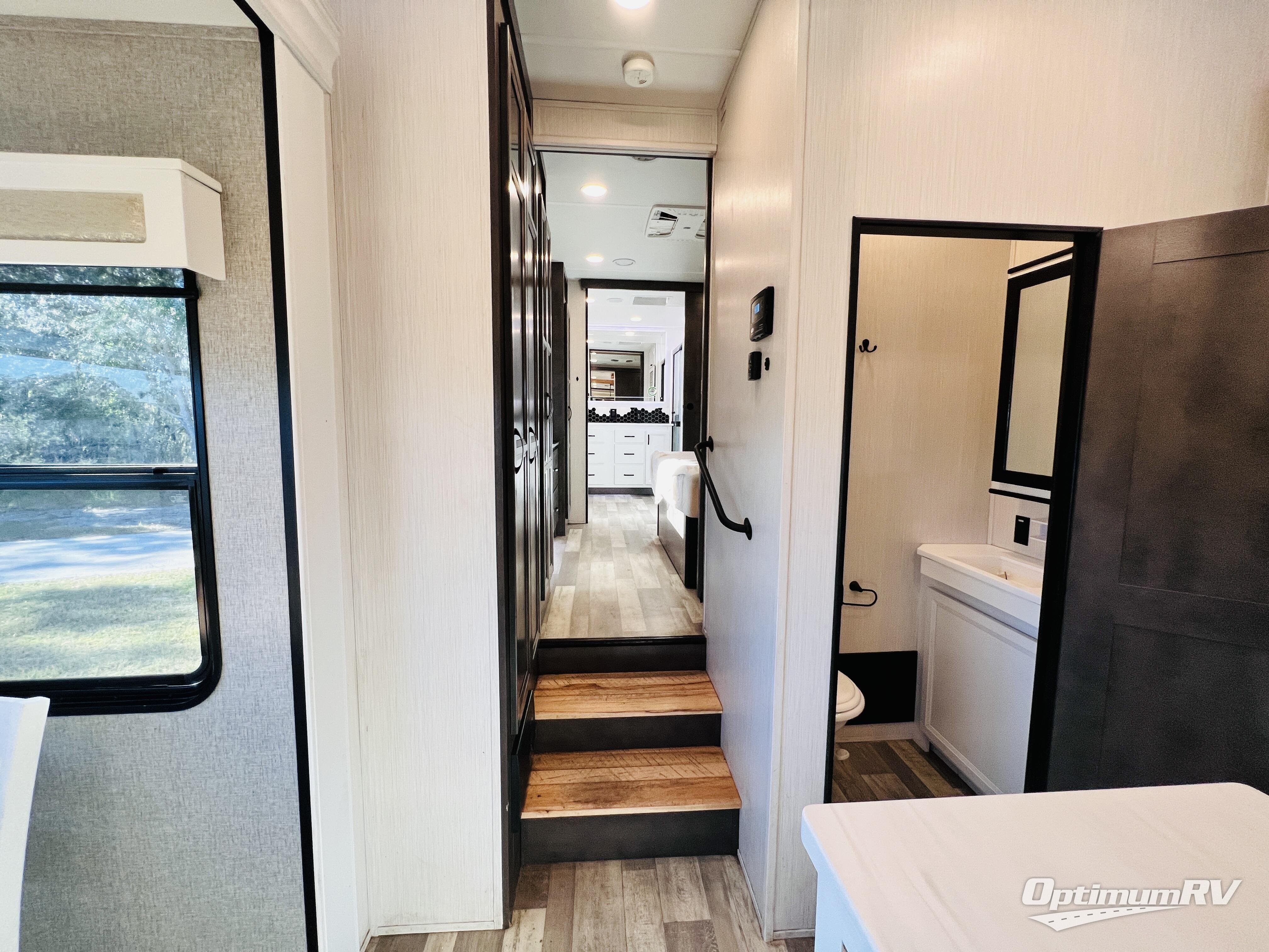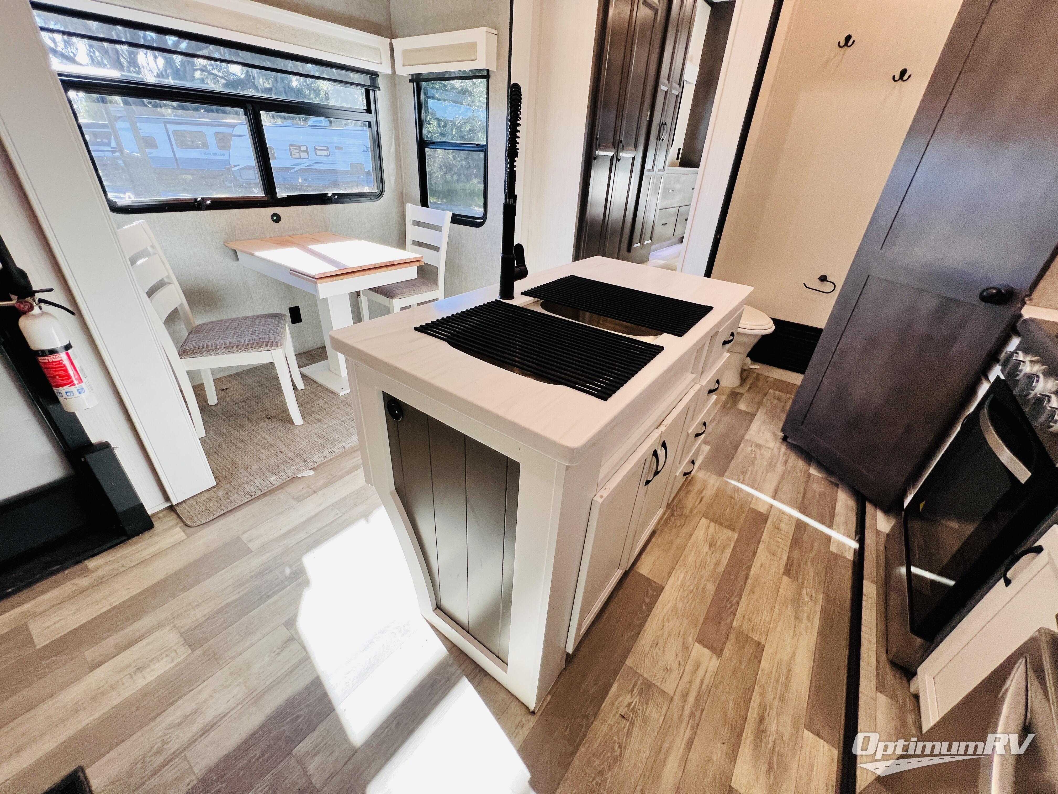 This fifth wheel has everything and then more! The front living area has opposing tri-fold sofas and power theater seating across from the front entertainment center with a fireplace and 50" flat screen TV. The chef can prepare their best meals with the kitchen island with a fold-down breakfast counter, and there is a 20 cu. ft. stainless steel refrigerator for food storage. Enjoy your meals and the extra space provided with the free standing table slide. The master suite has a king bed slide to lay your head at night and access to the full rear bathroom which has a drop-down storage, a shower with a seat, a linen closet, a closet prepped to add an optional washer and dryer, and a dual sink vanity. And the convenient half bath can be traded out for an optional bonus pantry if you don't need the half bath!