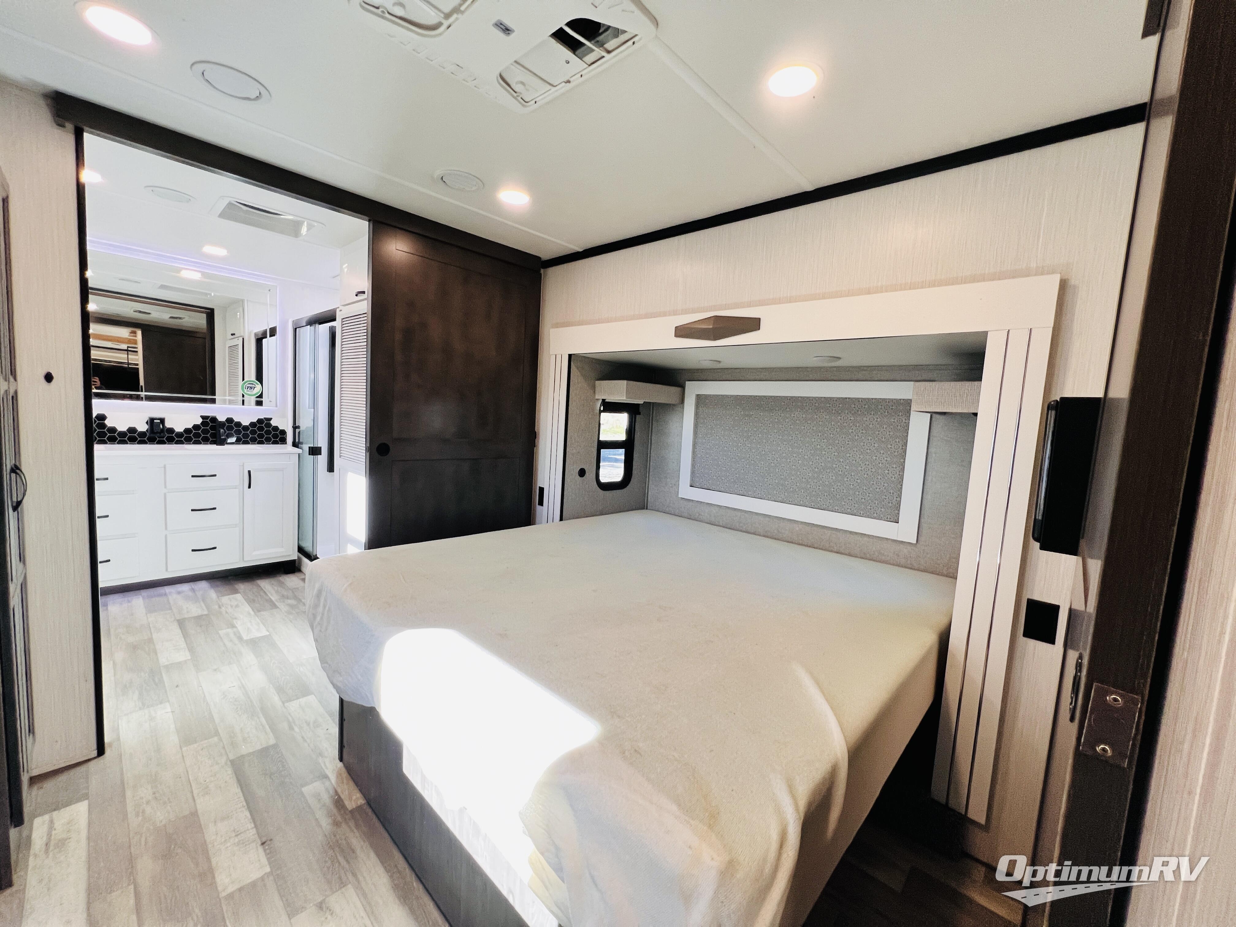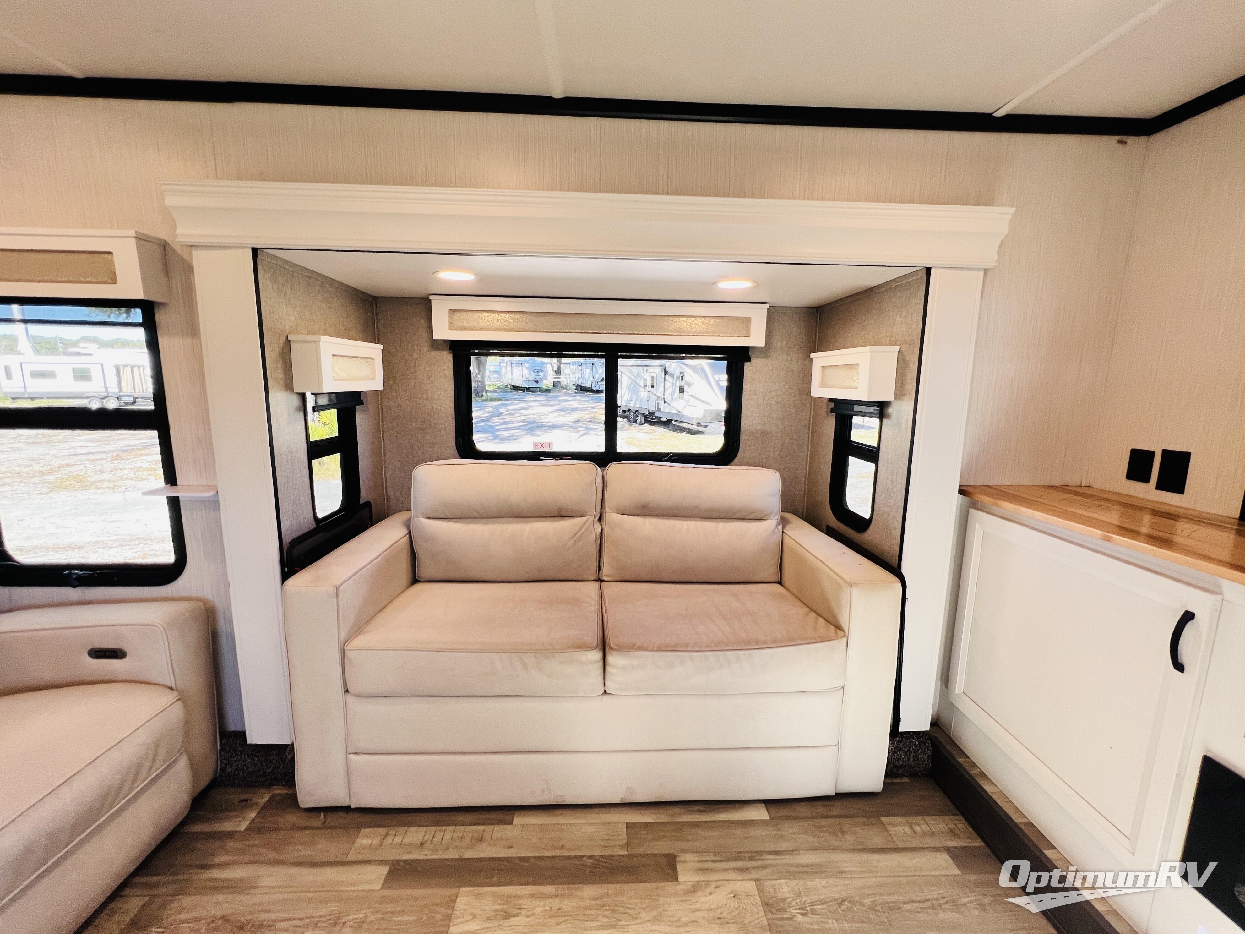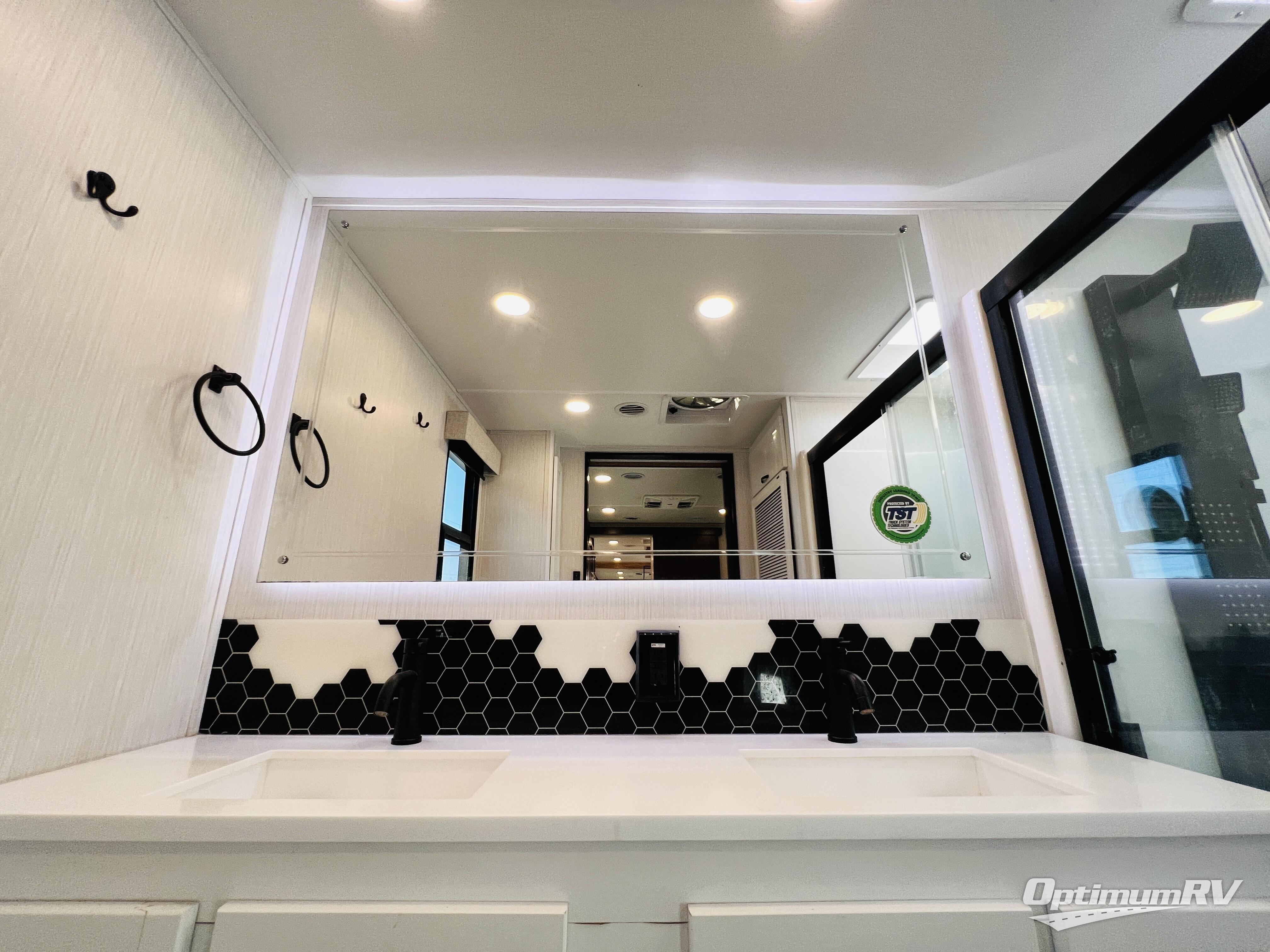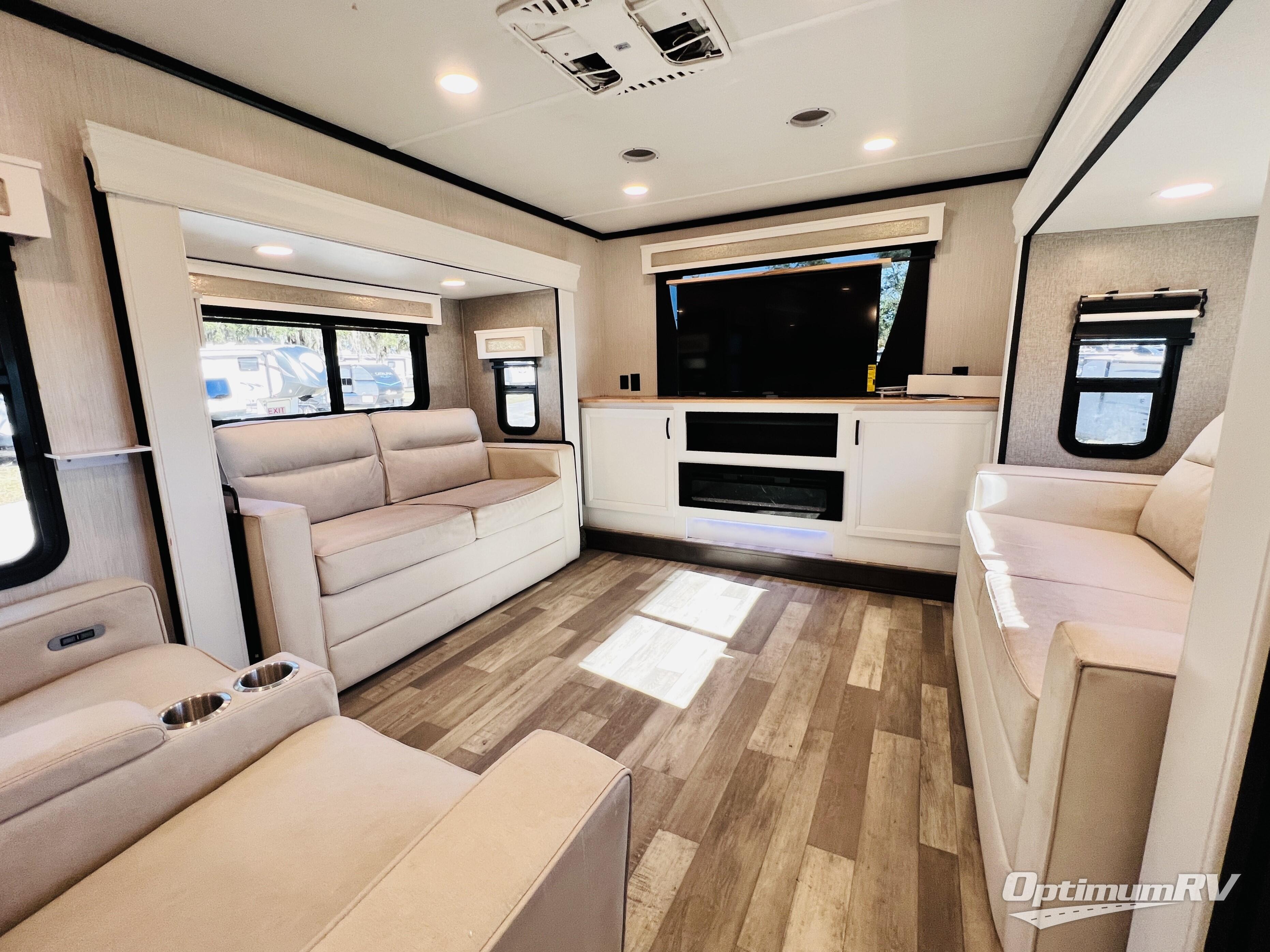 This fifth wheel has everything and then more! The front living area has opposing tri-fold sofas and power theater seating across from the front entertainment center with a fireplace and 50" flat screen TV. The chef can prepare their best meals with the kitchen island with a fold-down breakfast counter, and there is a 20 cu. ft. stainless steel refrigerator for food storage. Enjoy your meals and the extra space provided with the free standing table slide. The master suite has a king bed slide to lay your head at night and access to the full rear bathroom which has a drop-down storage, a shower with a seat, a linen closet, a closet prepped to add an optional washer and dryer, and a dual sink vanity. And the convenient half bath can be traded out for an optional bonus pantry if you don't need the half bath!