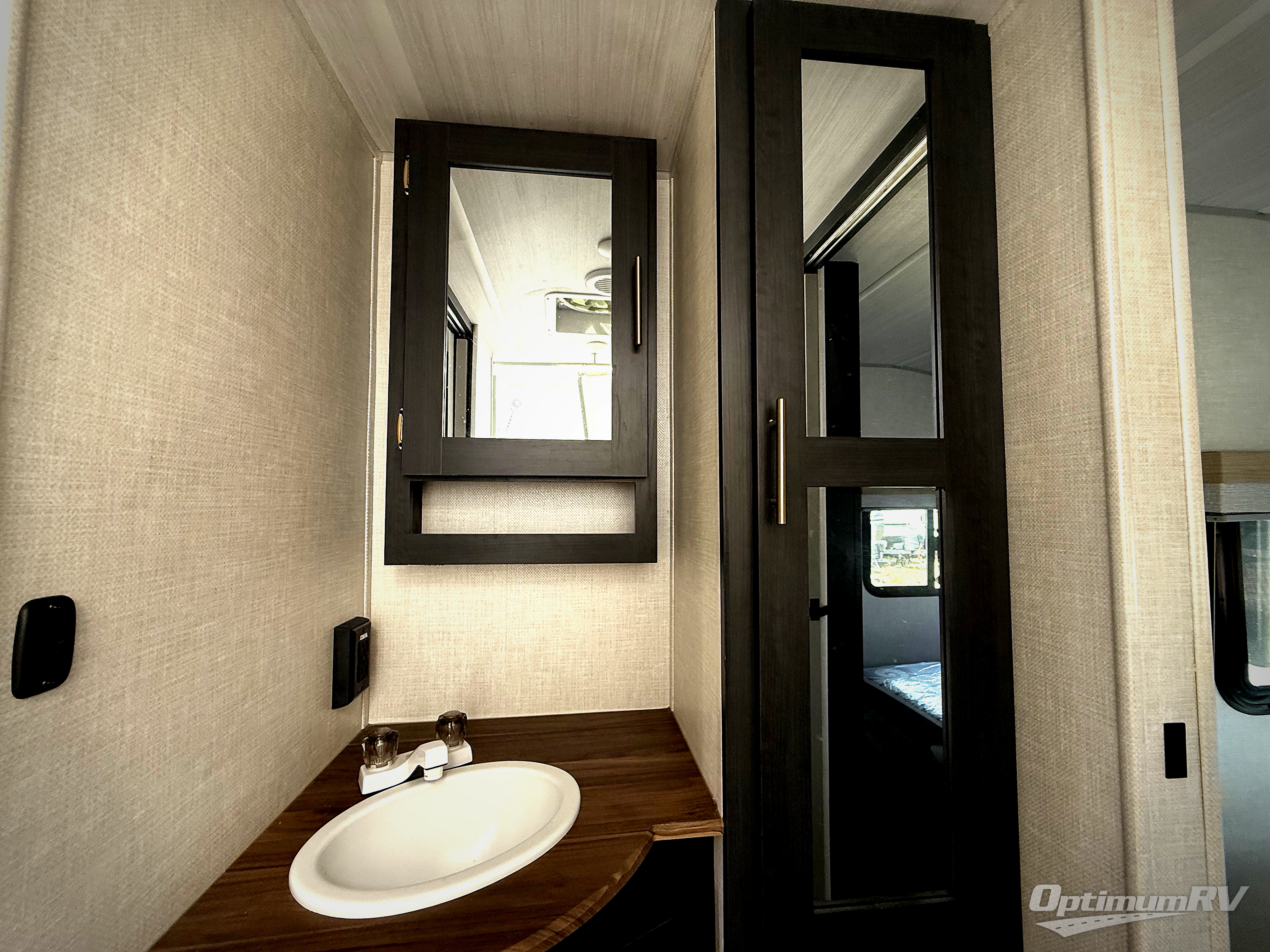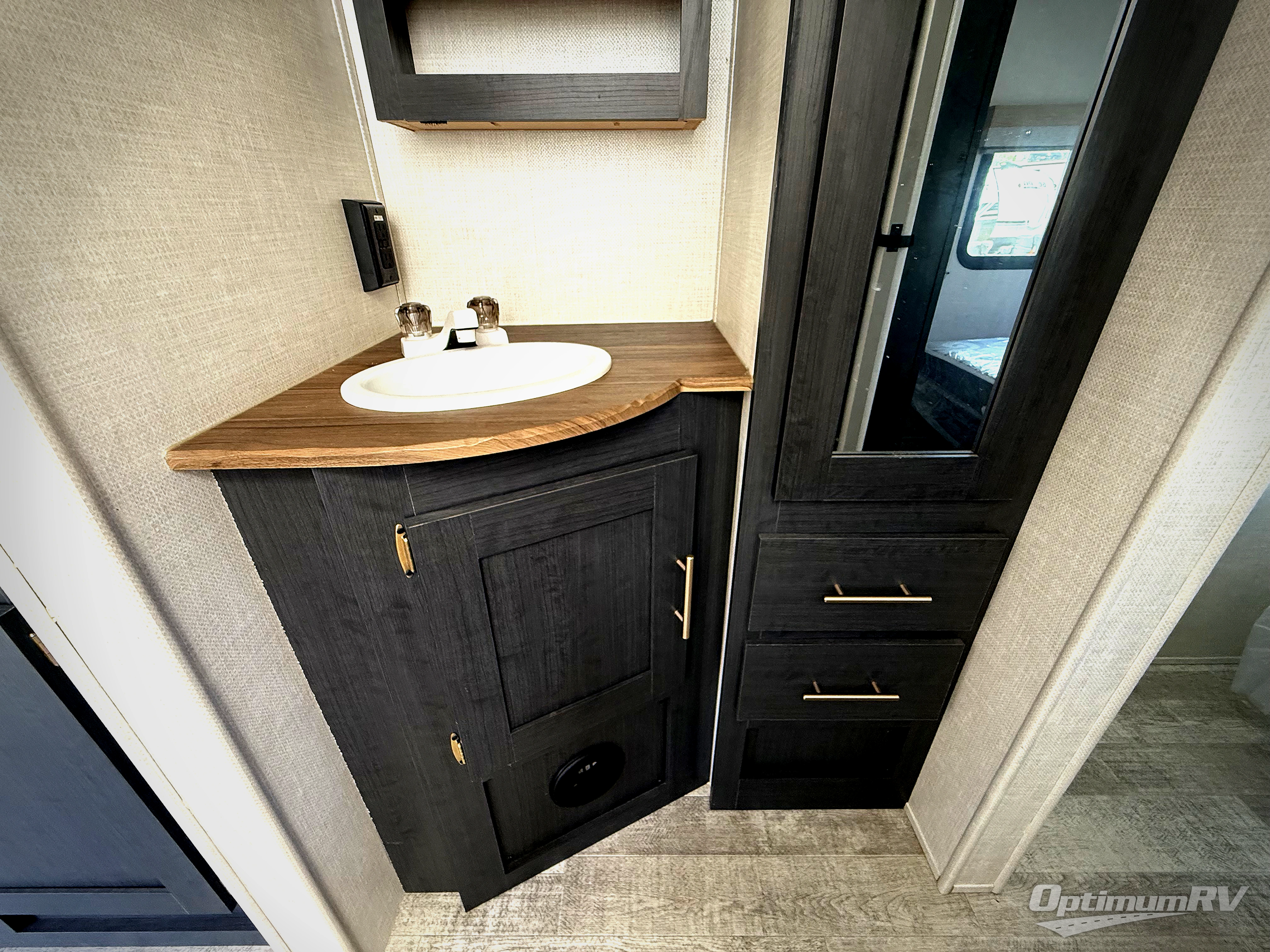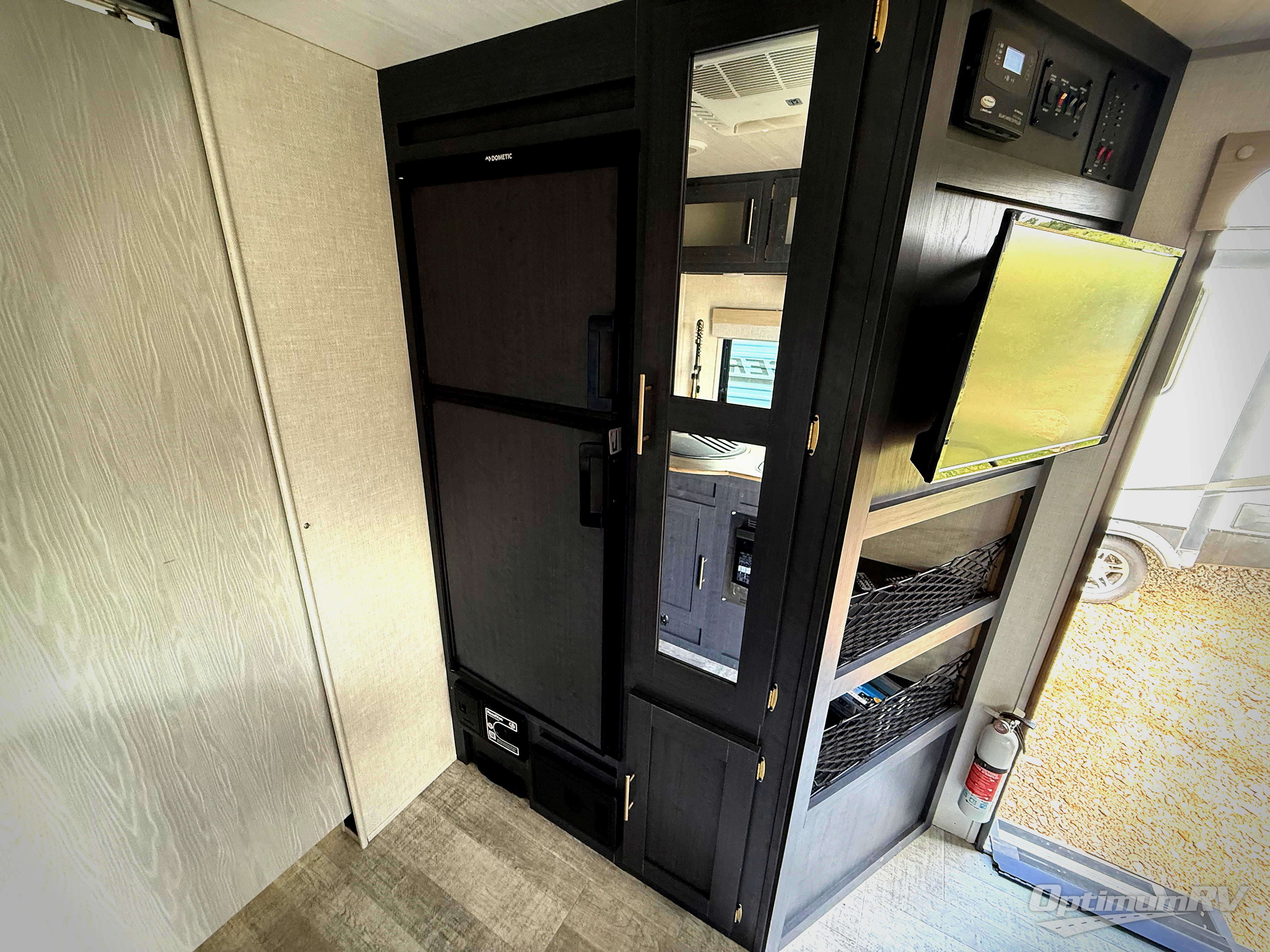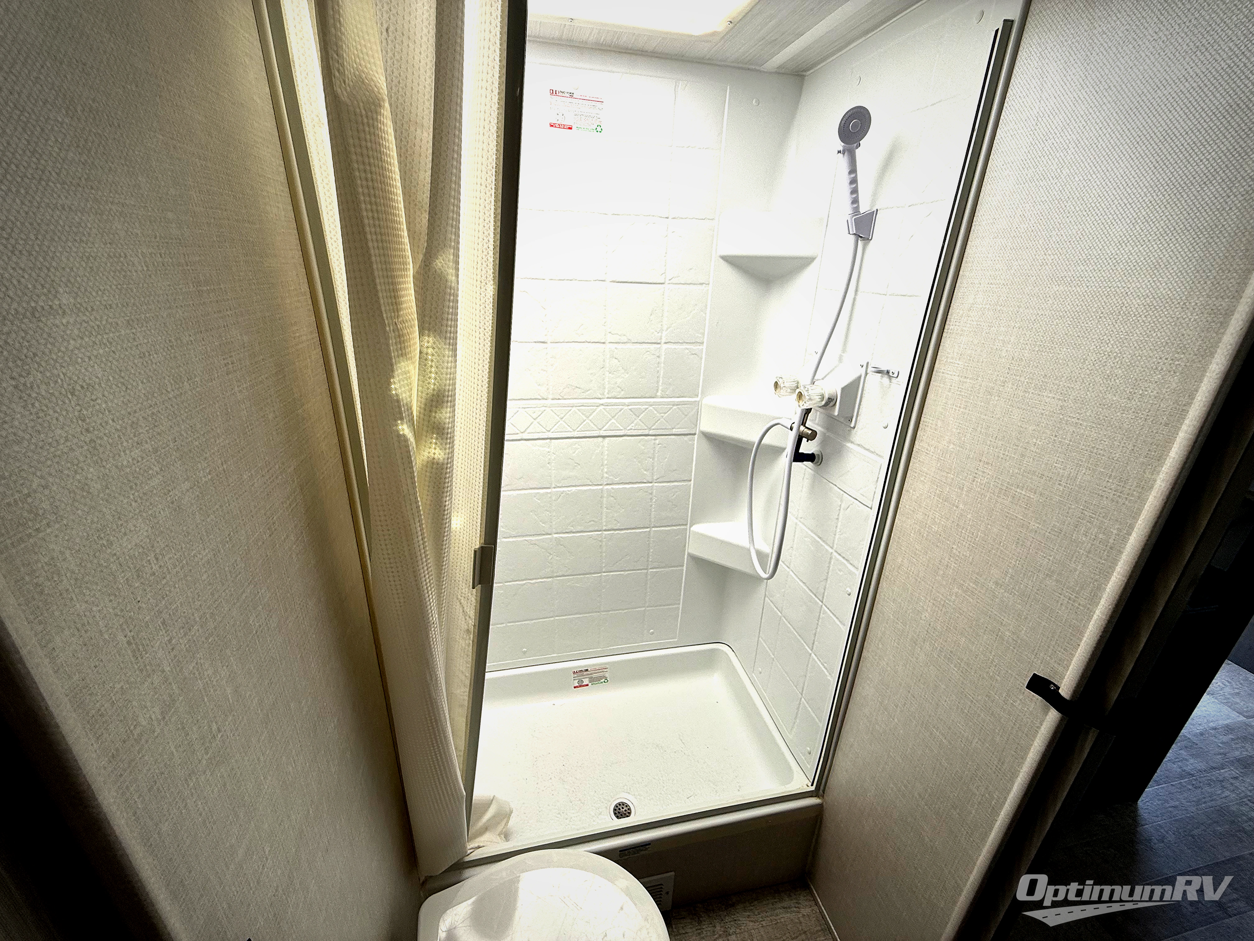 This R-Pod travel trailer has quite a few features that will attract your attention! First of all, there booth dinette in front of the 28" LED TV so that you can view your movies in comfort. The walk-through bath gives you an entrance door on both sides, and it also allows you to directly enter the bathroom from the front bedroom. Underneath the RV queen bed in the bedroom, there is under-bed storage so you can keep some sweaters and boots hidden away without taking up any walking space in the bedroom.