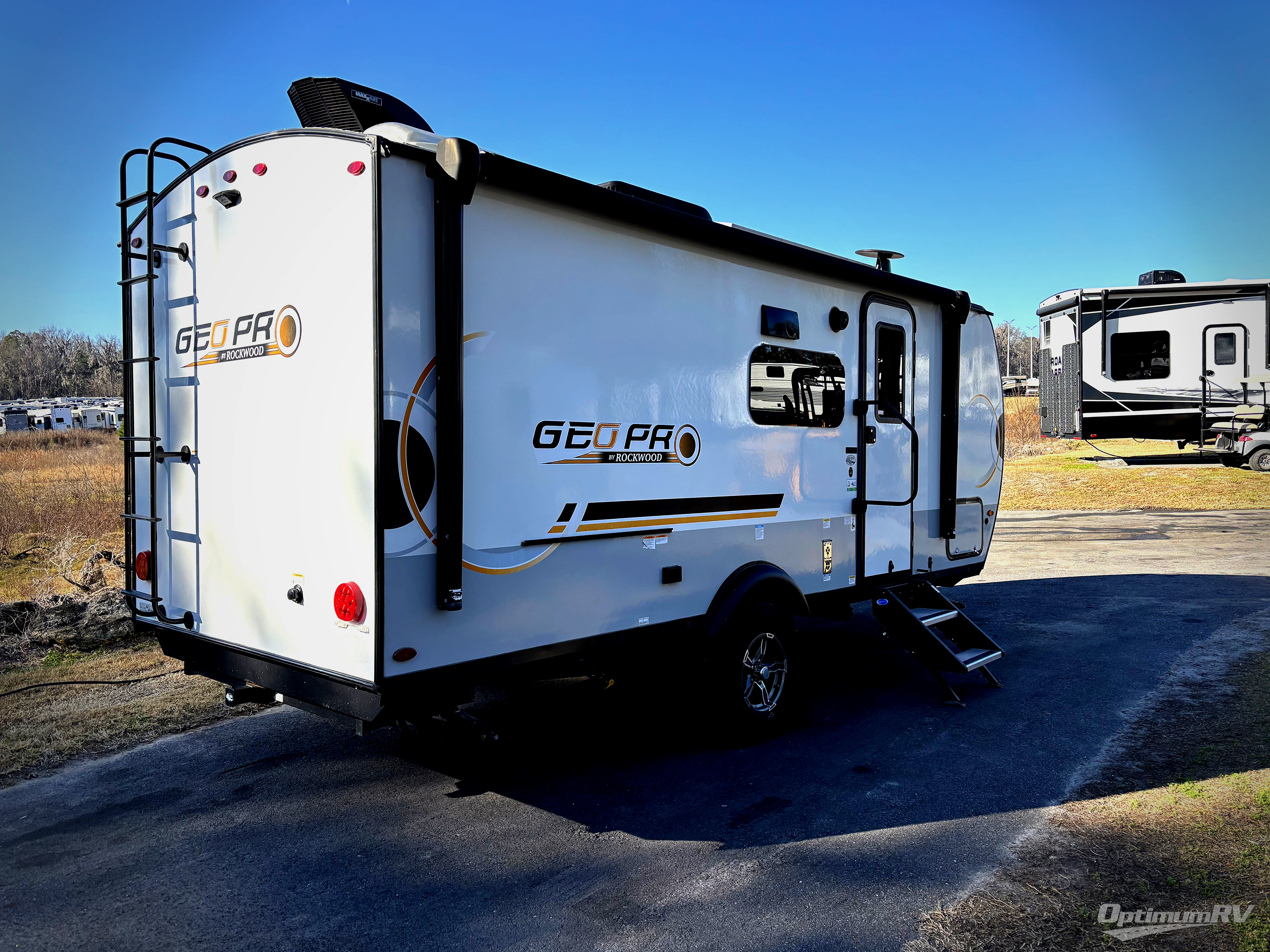 The Rockwood GEO Pro travel trailers and toy hauler by Forest River are ready for all your adventures. The interior and exterior Azdel construction, along with the vacuum laminated roof and walls provide a durable trailer, and the Dexter torsion axles with aluminum wheels make towing easier than ever. There are many convenient amenities, like the 13,500 BTU A/C, the Bluetooth system control panel, and the all-in-one Teton HD TV/WiFi/FM antenna with LTE prep. Each model includes frameless windows, fabric valances and roller shades, and a modern interior that will make you feel right at home. Everything you're looking for in your next RV is in a Rockwood GEO pro by Forest River!