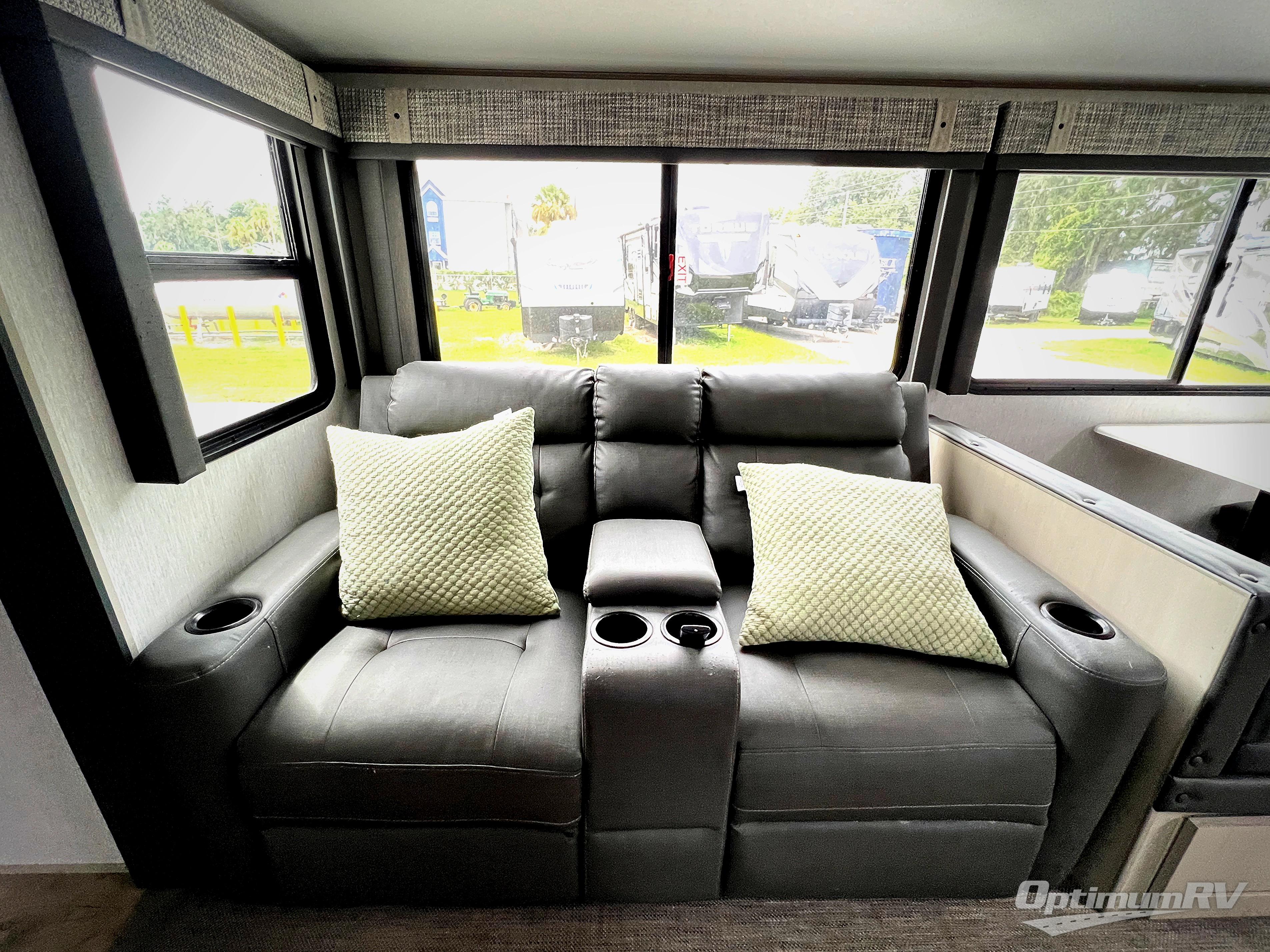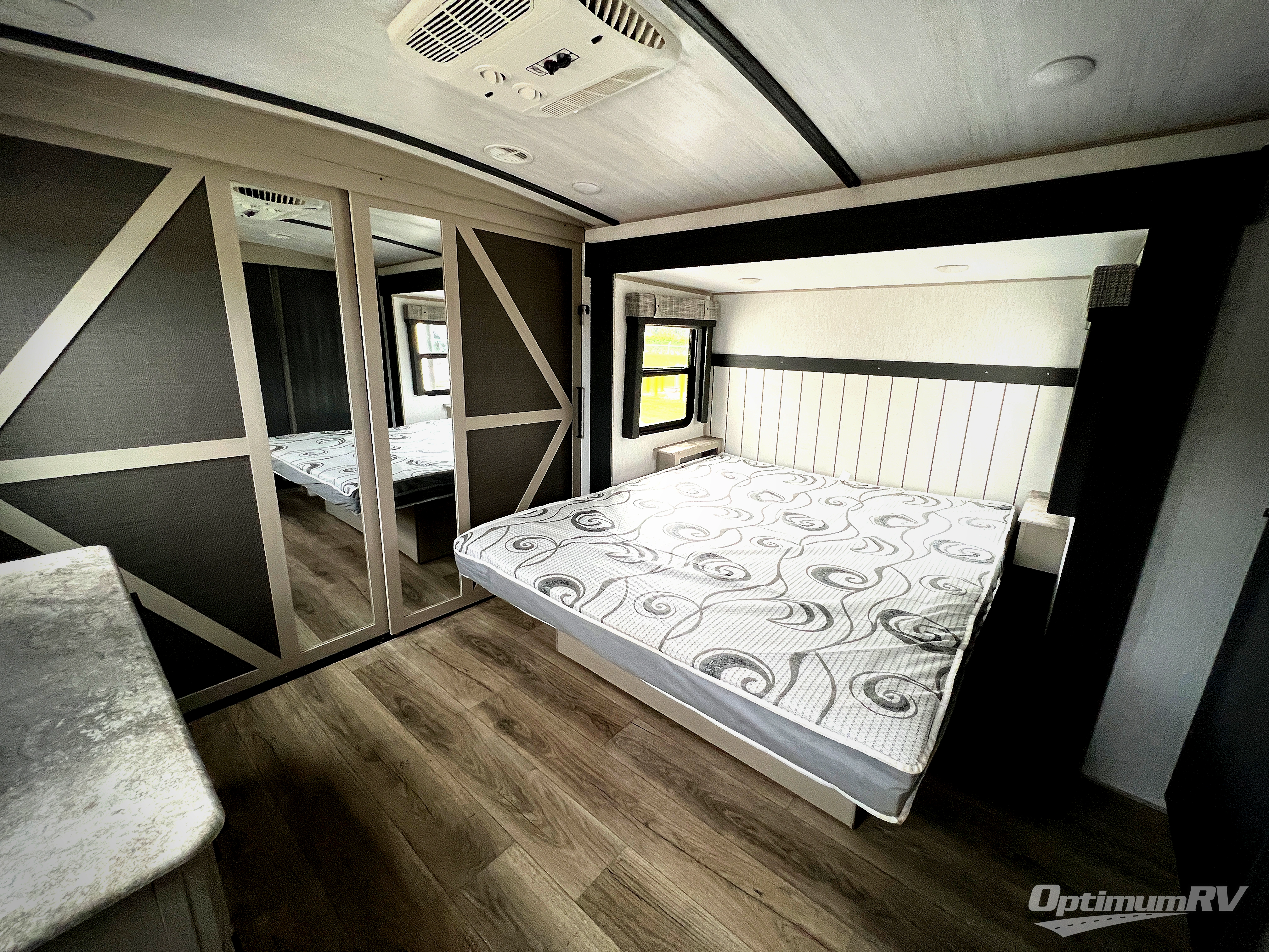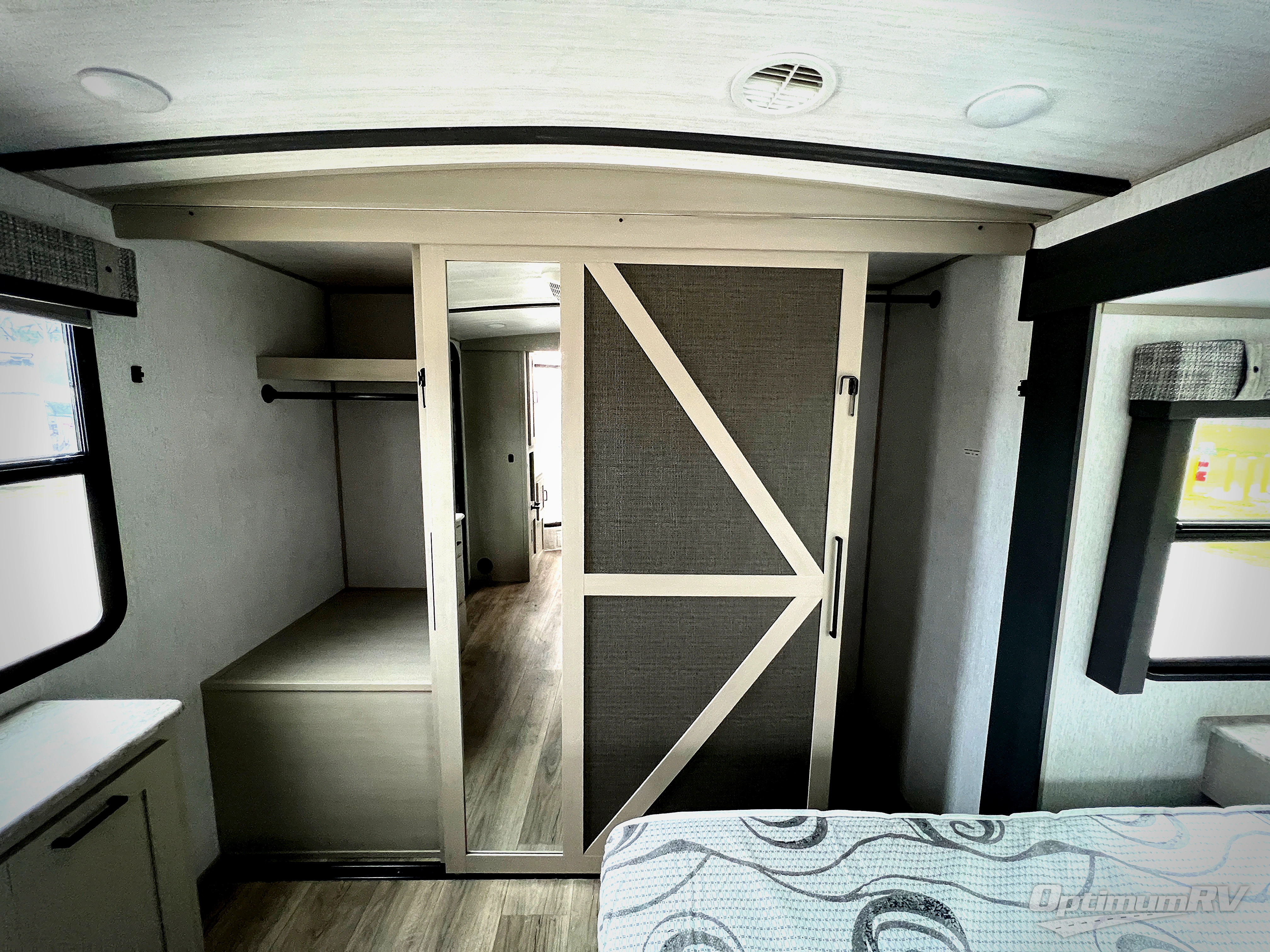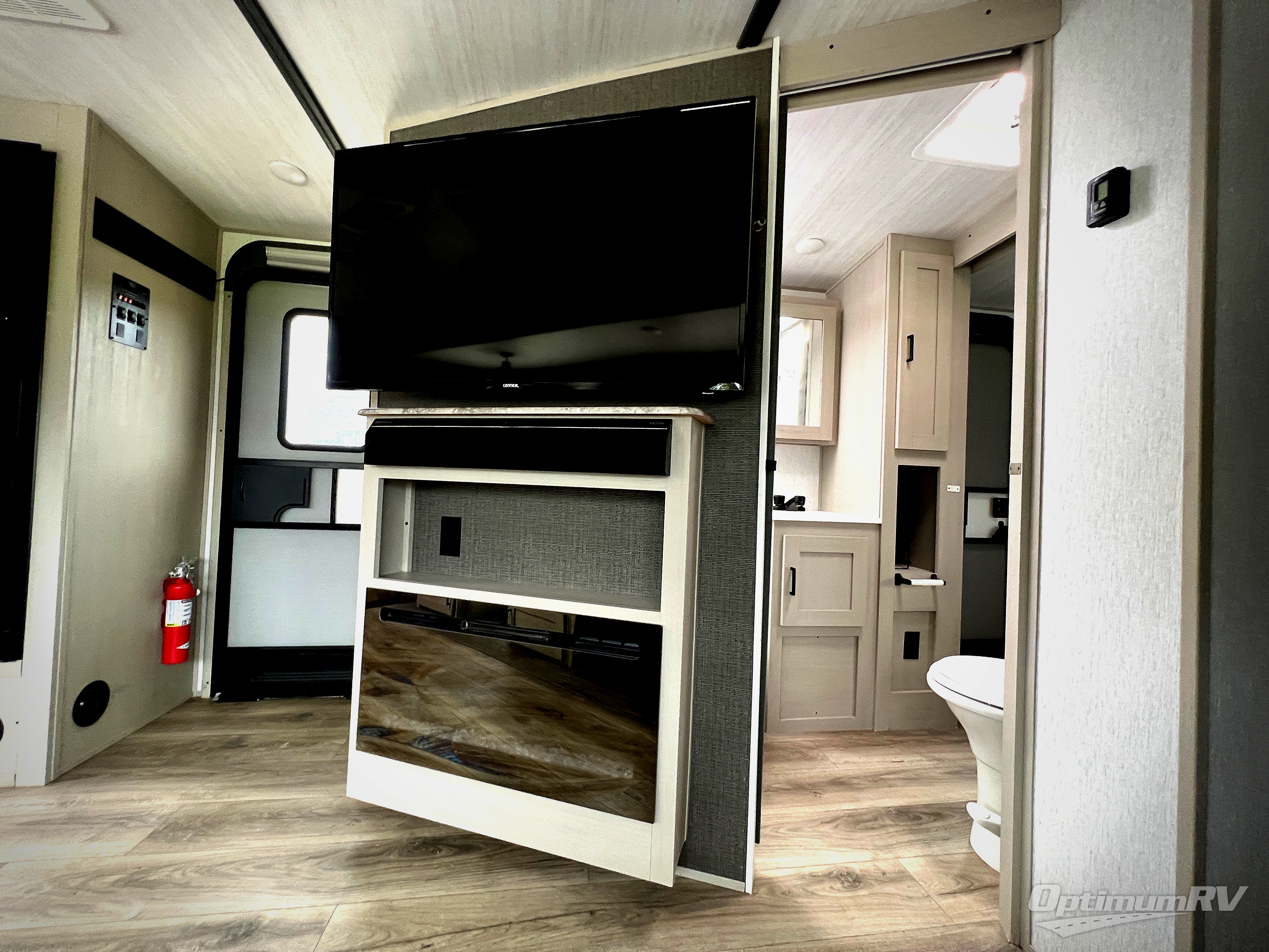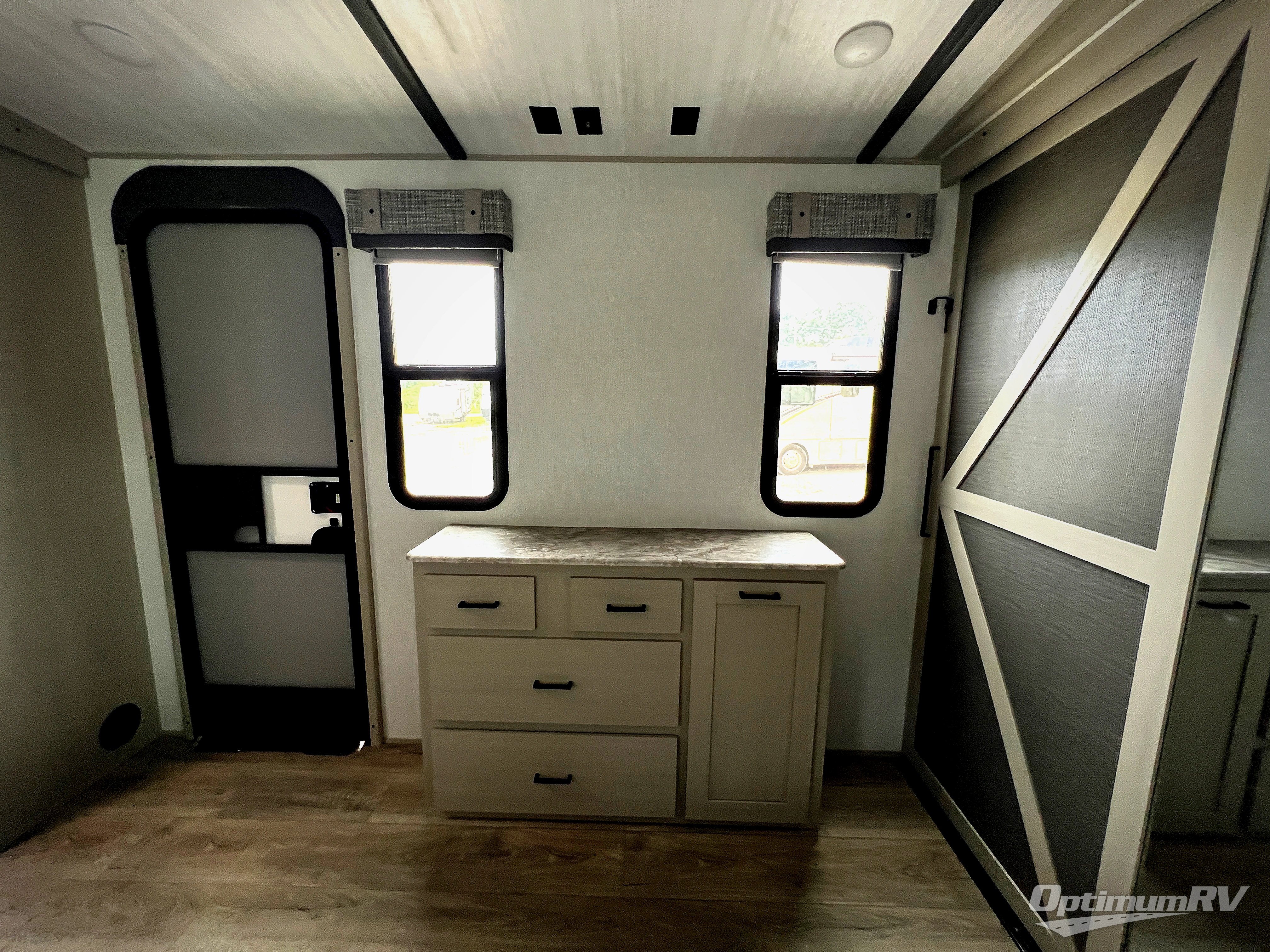 Once you step inside this dual entry travel trailer, you won't want to camp any other way! The rear private bedroom will have you feeling right at home with the custom king bed across from a dresser with a TV hookup, a large bedroom wardrobe, and there is even a closet that is prepped for you to add the optional washer and dryer. The dual entry bath makes it easy for everyone to access and it has a radius shower with a skylight above for added natural lighting as you get ready each morning. Both the theater seating and the booth dinette have a panoramic window for you to look out at your beautiful scenery. The chef of the group will love cooking in the front kitchen with all of the extra countertop space, as well as outdoors with the outside kitchen/bar!