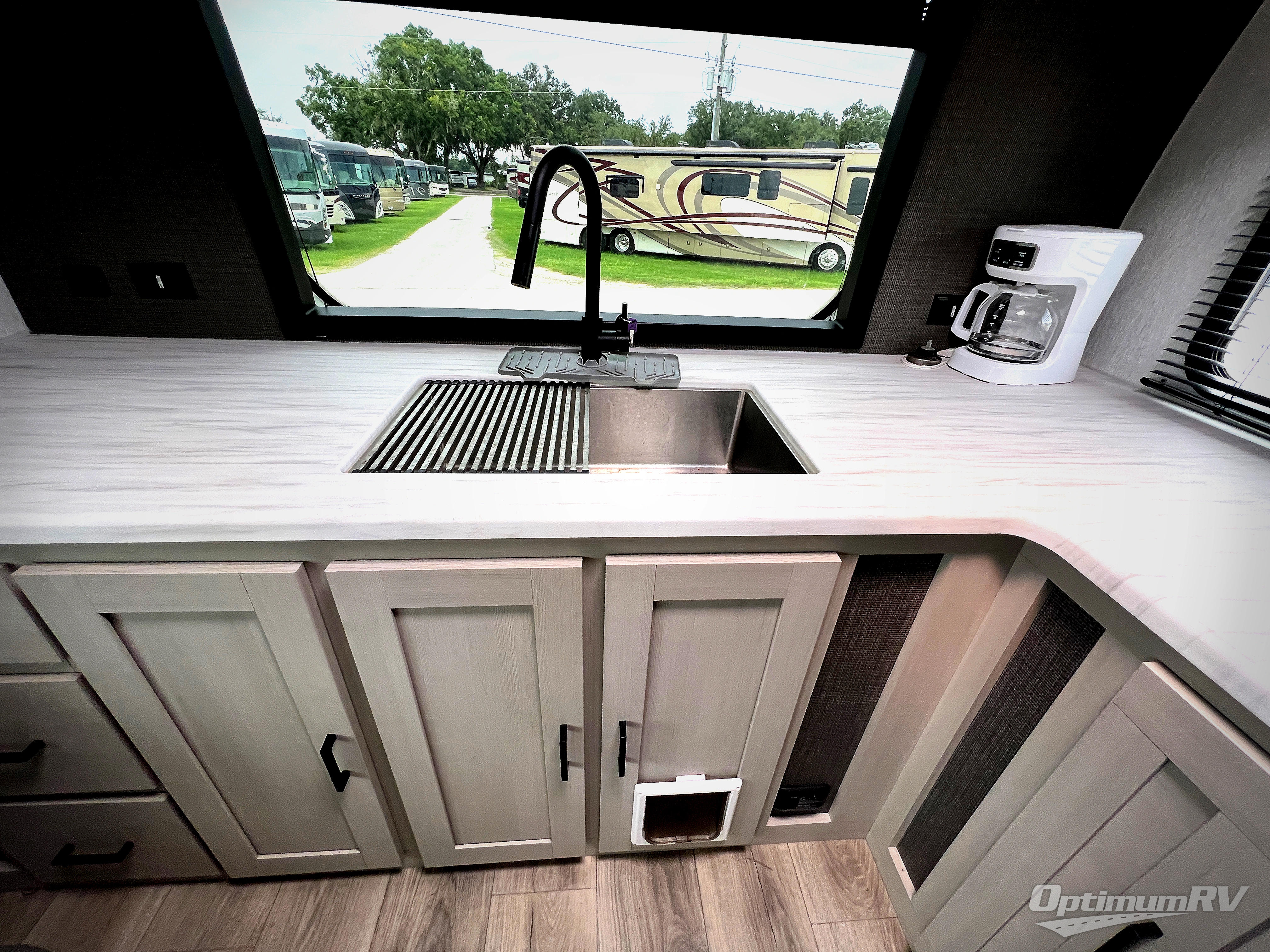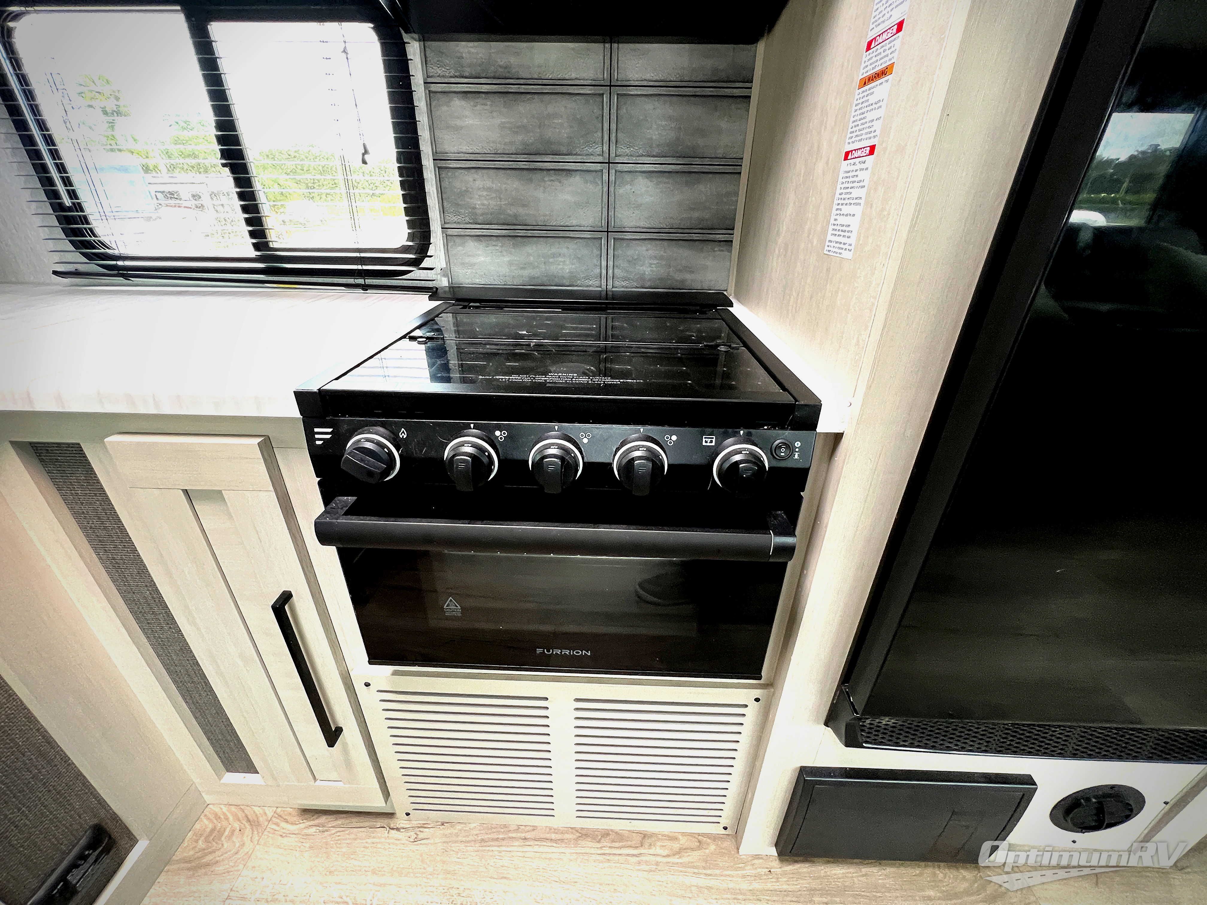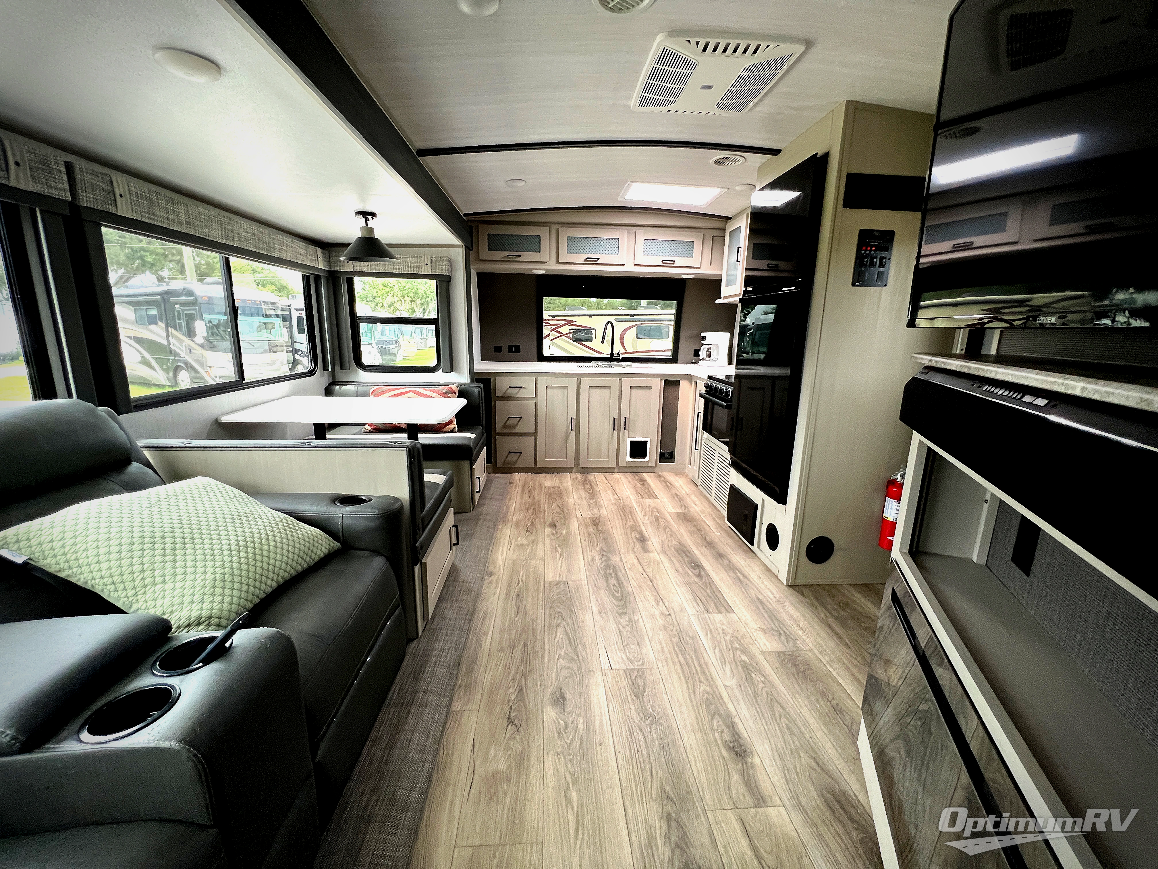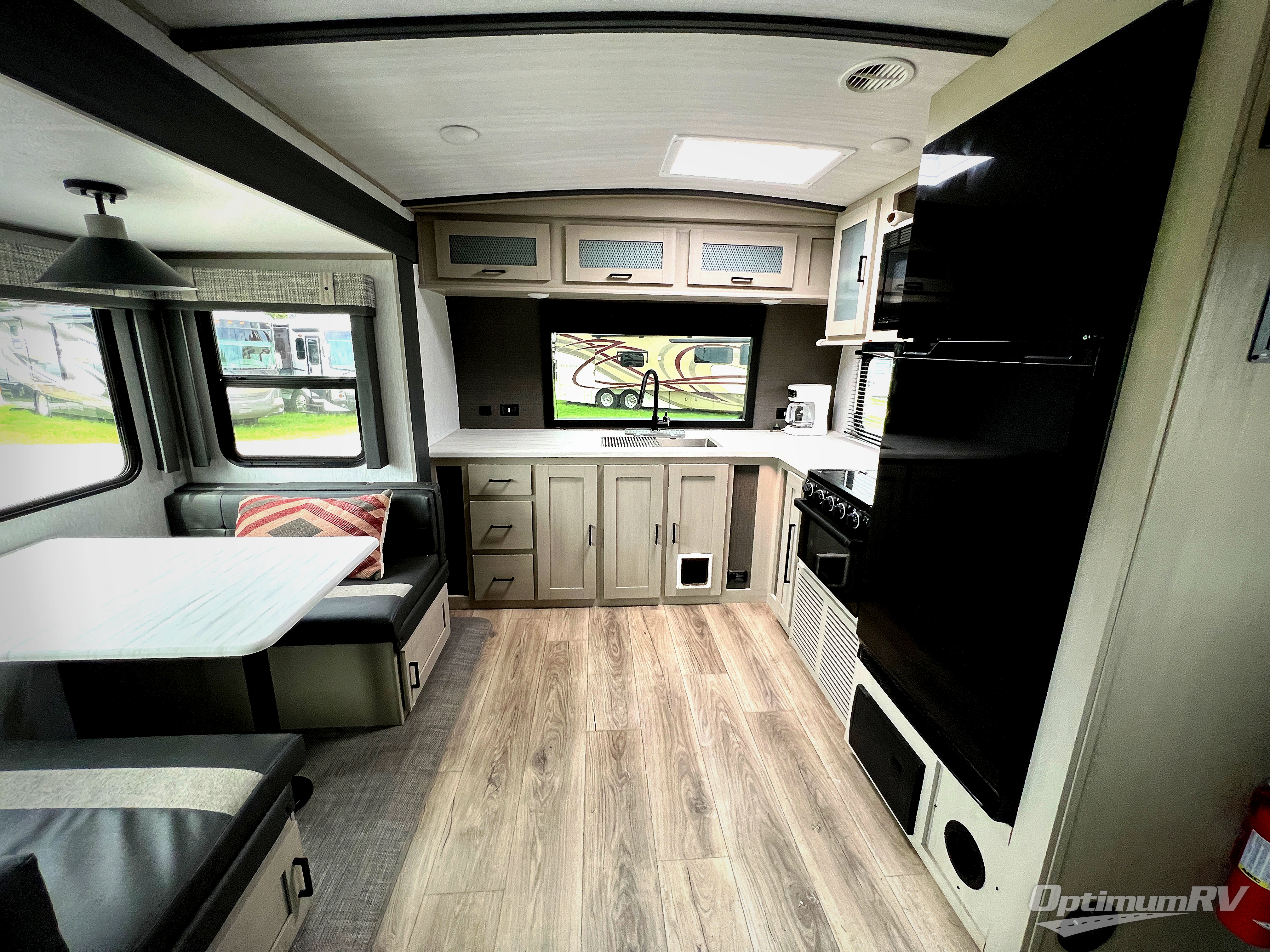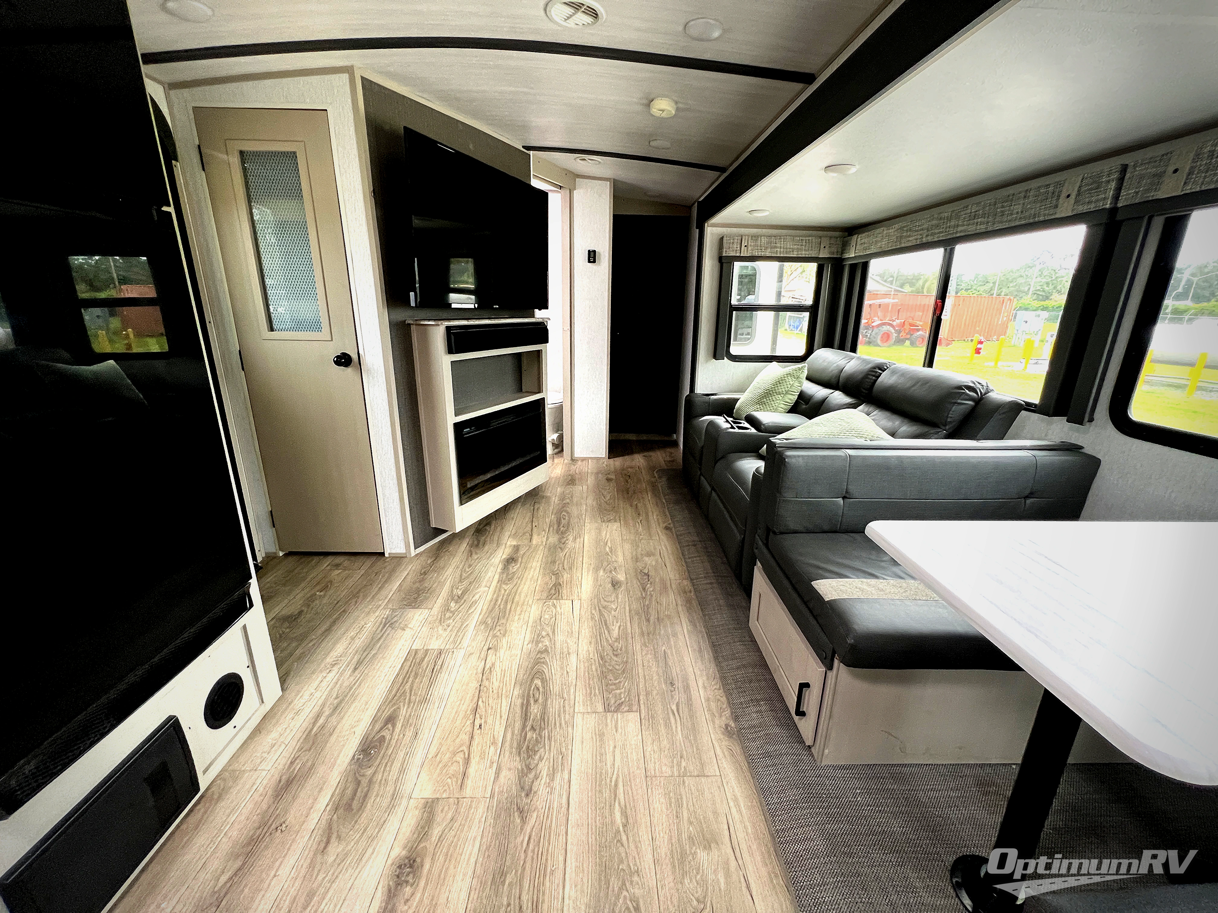 Once you step inside this dual entry travel trailer, you won't want to camp any other way! The rear private bedroom will have you feeling right at home with the custom king bed across from a dresser with a TV hookup, a large bedroom wardrobe, and there is even a closet that is prepped for you to add the optional washer and dryer. The dual entry bath makes it easy for everyone to access and it has a radius shower with a skylight above for added natural lighting as you get ready each morning. Both the theater seating and the booth dinette have a panoramic window for you to look out at your beautiful scenery. The chef of the group will love cooking in the front kitchen with all of the extra countertop space, as well as outdoors with the outside kitchen/bar!