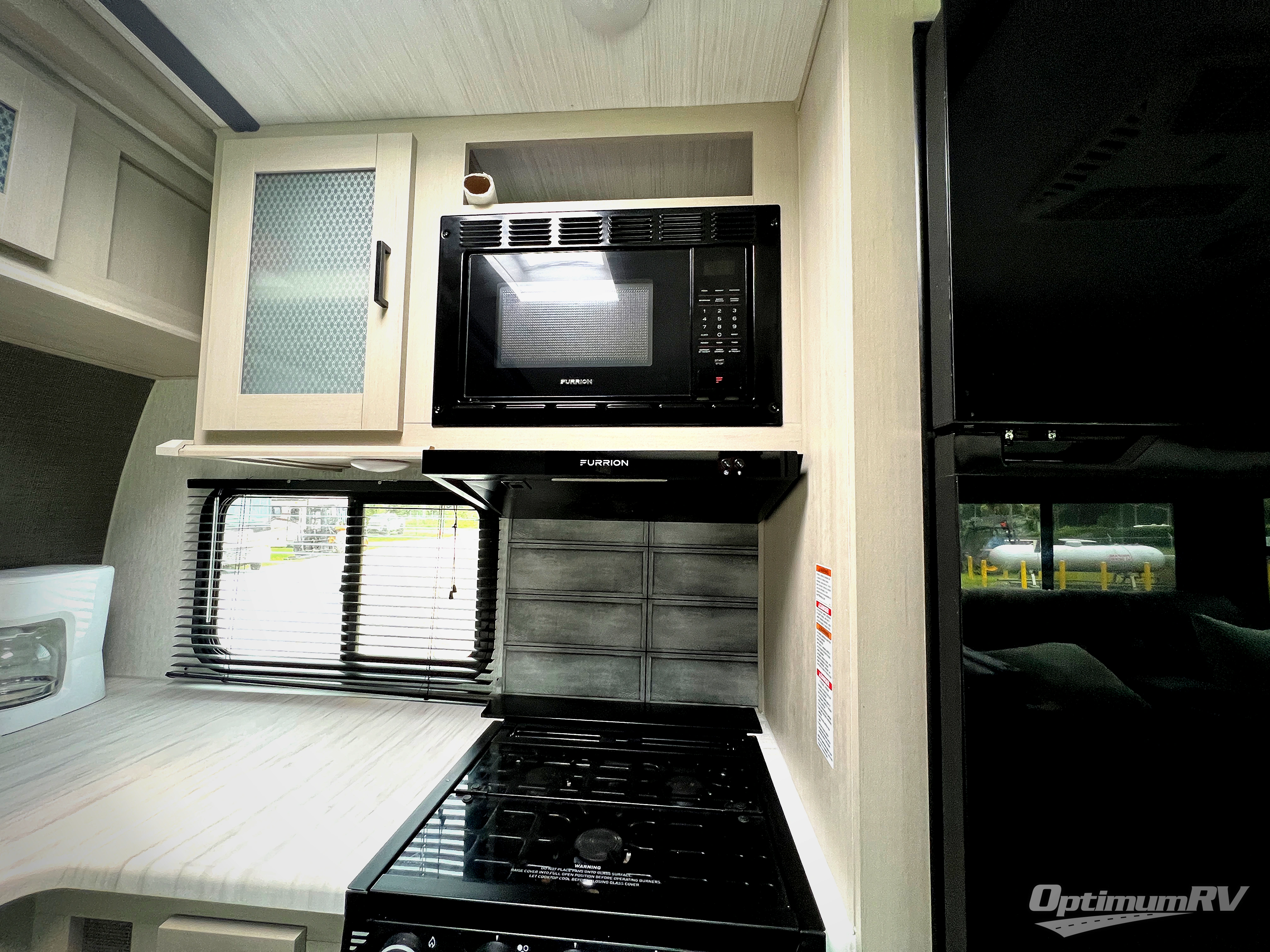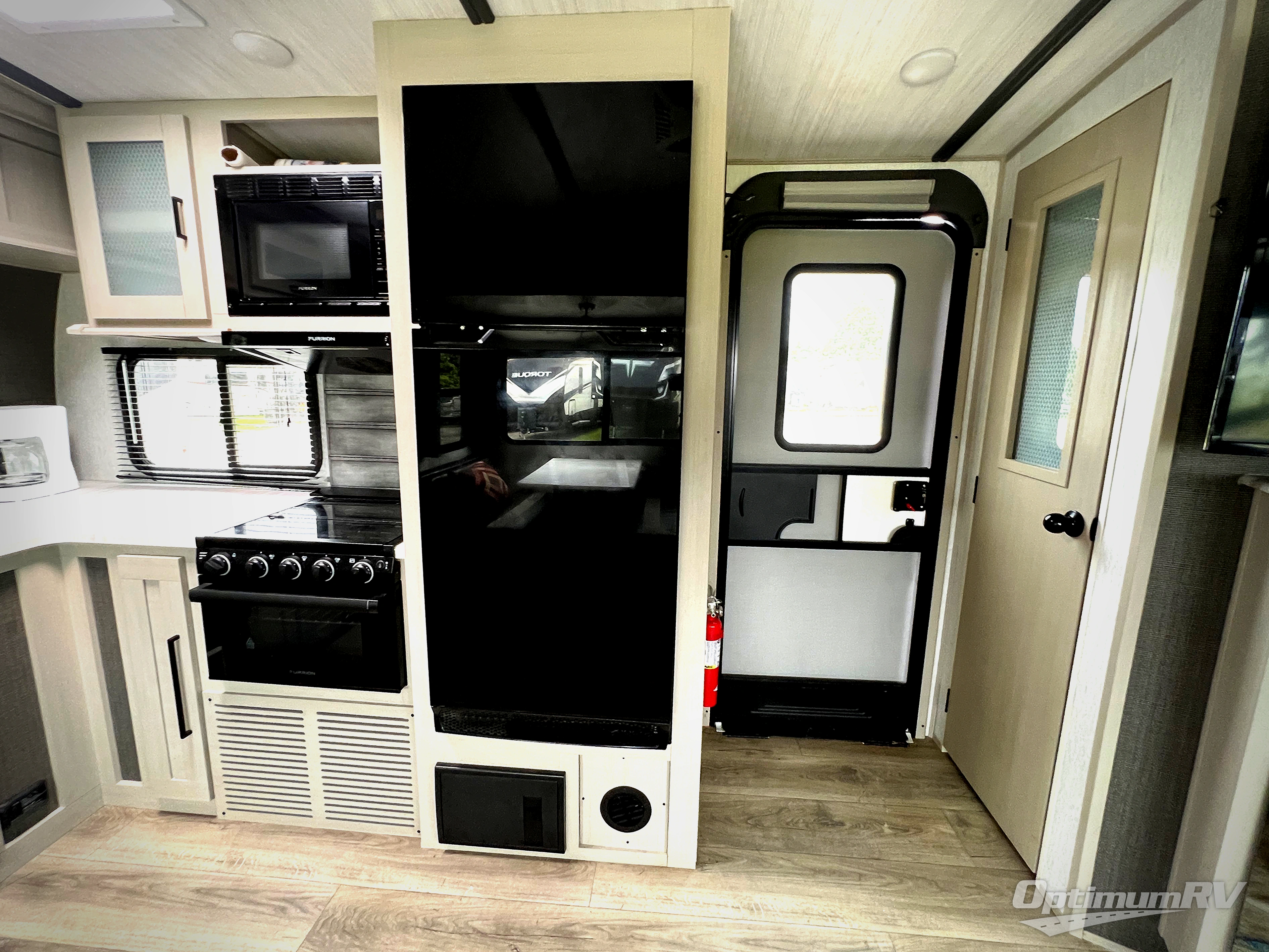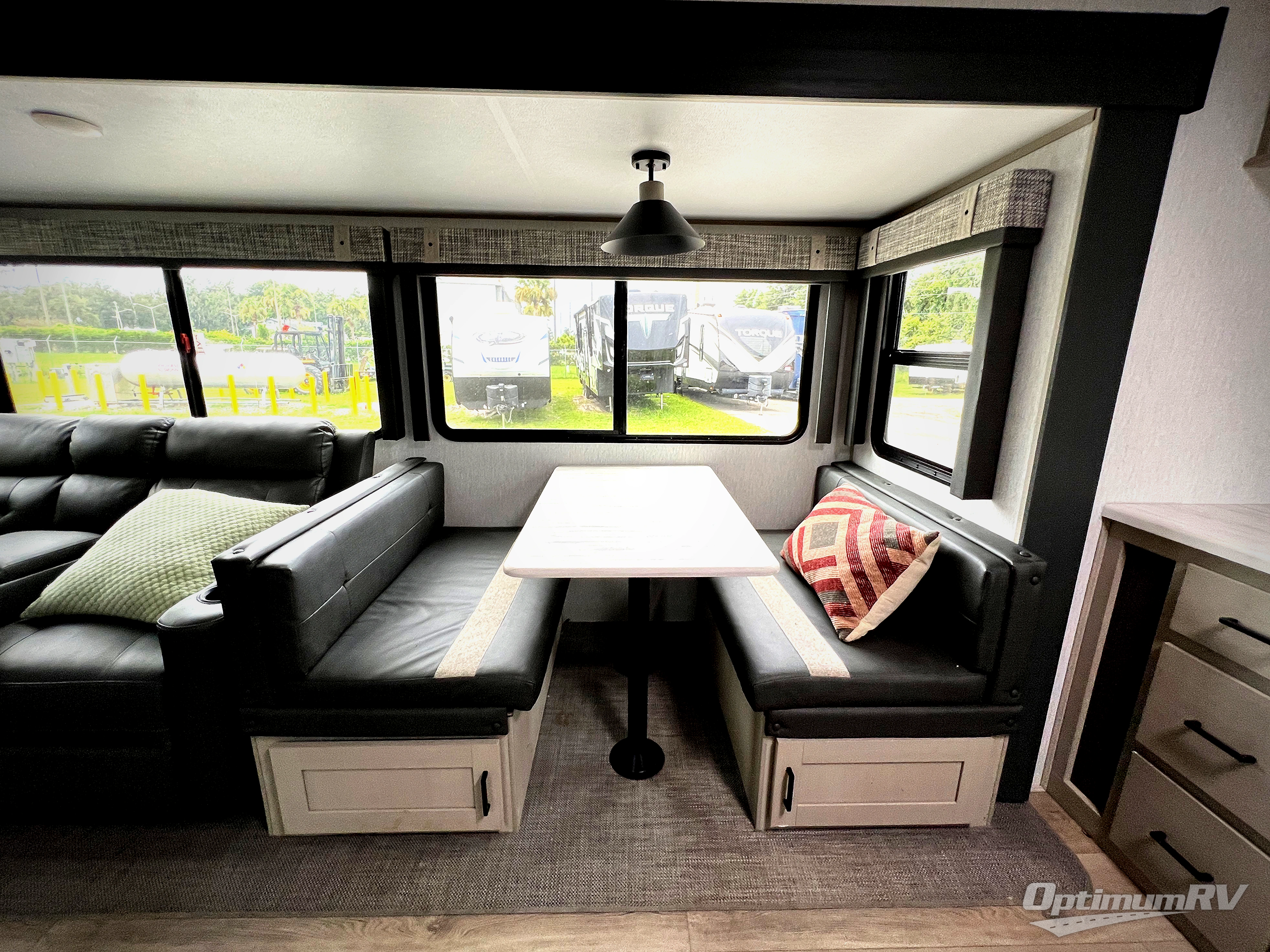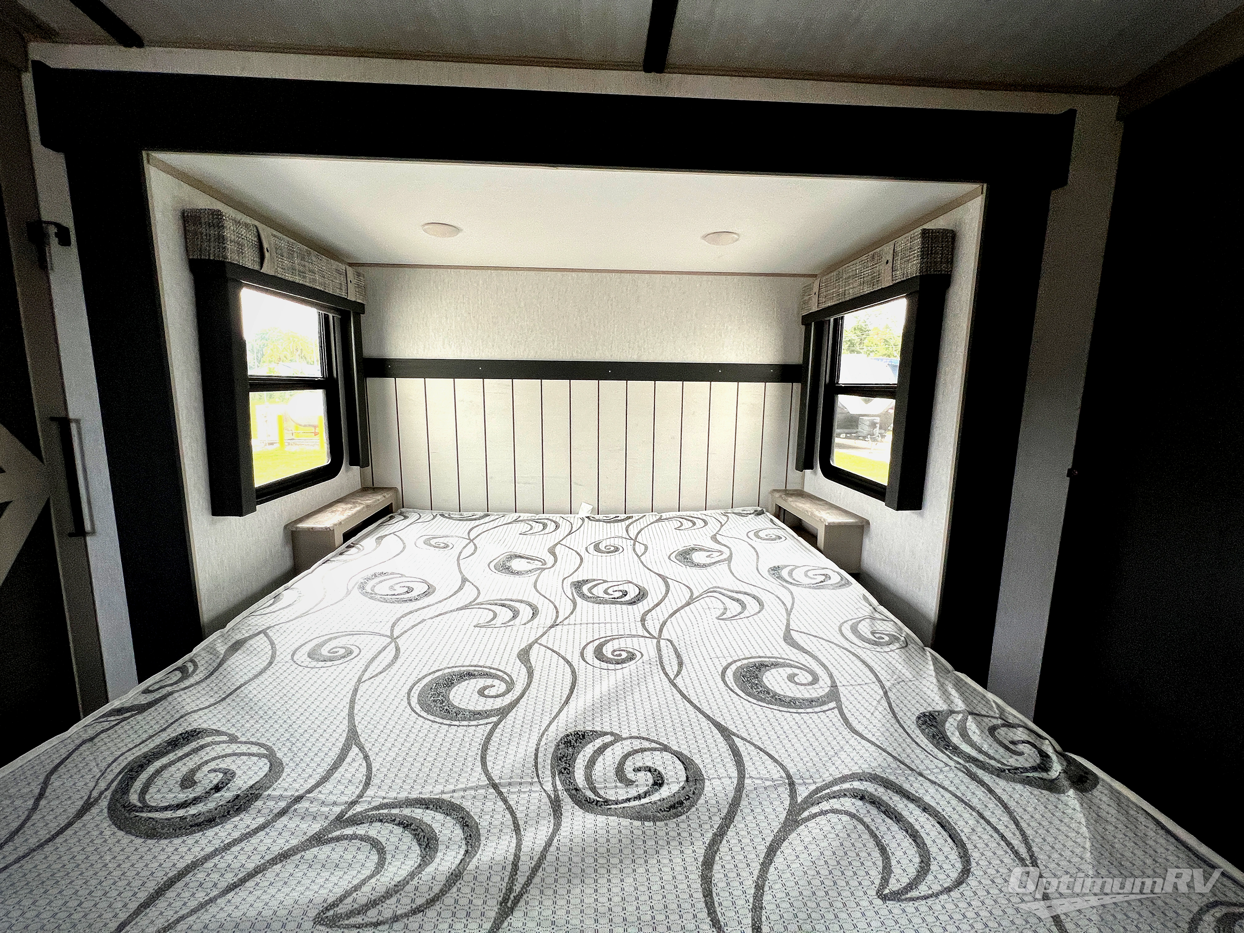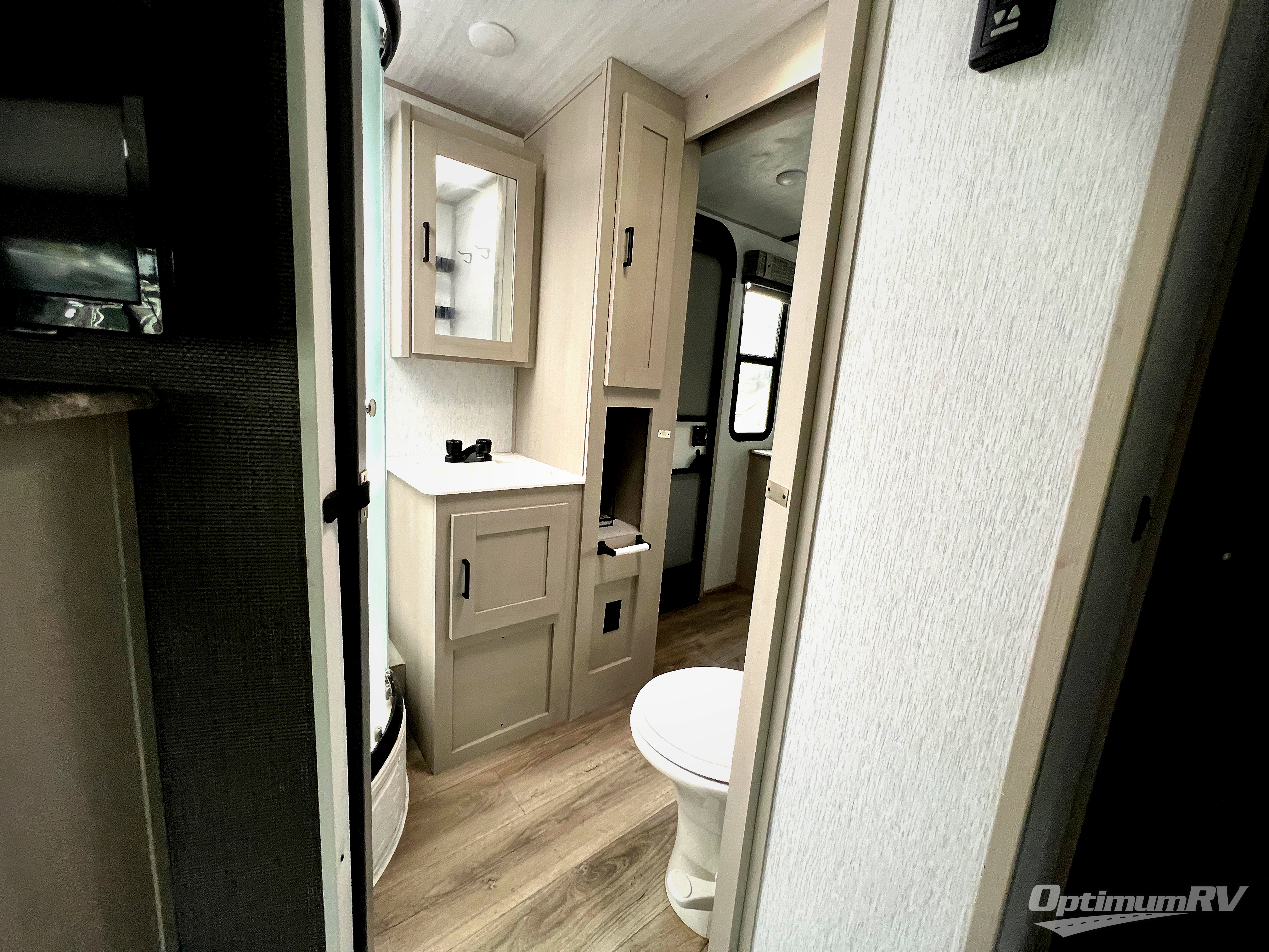 Once you step inside this dual entry travel trailer, you won't want to camp any other way! The rear private bedroom will have you feeling right at home with the custom king bed across from a dresser with a TV hookup, a large bedroom wardrobe, and there is even a closet that is prepped for you to add the optional washer and dryer. The dual entry bath makes it easy for everyone to access and it has a radius shower with a skylight above for added natural lighting as you get ready each morning. Both the theater seating and the booth dinette have a panoramic window for you to look out at your beautiful scenery. The chef of the group will love cooking in the front kitchen with all of the extra countertop space, as well as outdoors with the outside kitchen/bar!