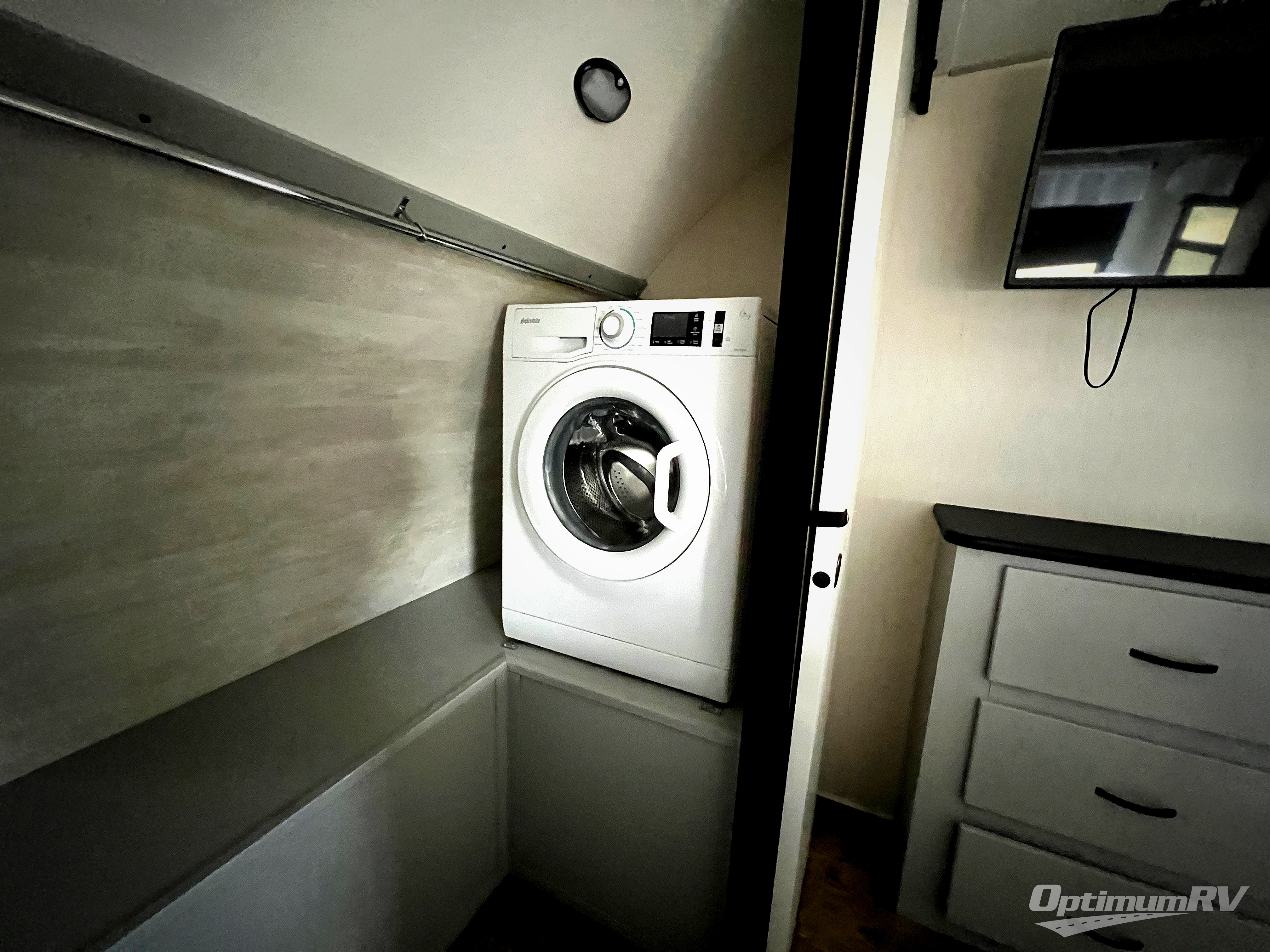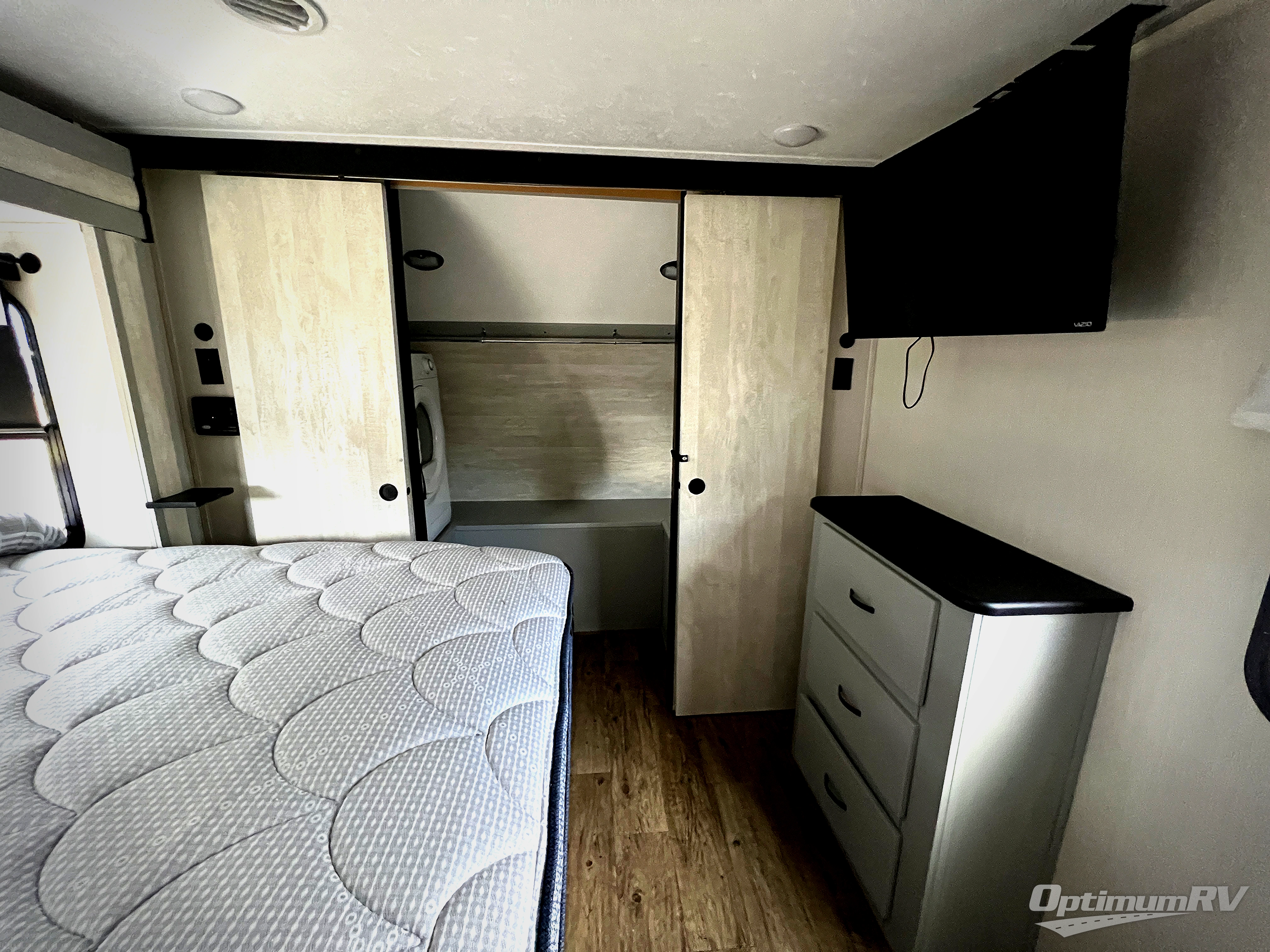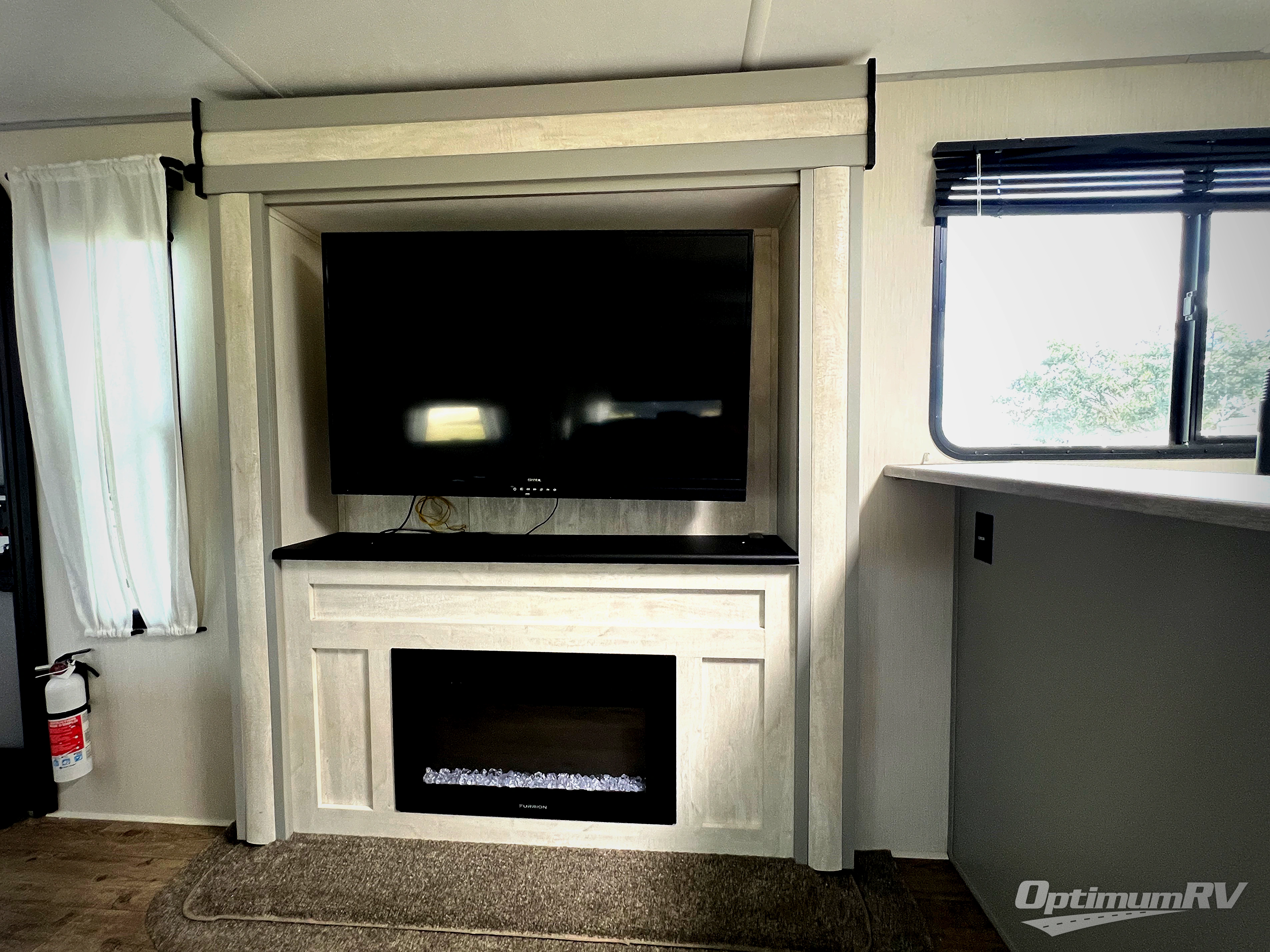 There is no going back to your tent-camping days after touring this travel trailer. The rear kitchen is any chef's dream with its walk-in pantry, residential refrigerator, plus a bar with stools where the kids can enjoy coloring. You will find comfortable seating space on the dual chairs and tri-fold sofa, and the fireplace and 50" TV with storage will feel just like home. The full bath will allow everyone space to clean up each day, and the front private bedroom will be your own oasis away from it all. Here, you will enjoy a slide out queen bed, a dresser where you can add a TV if you choose, plus a front walk-in closet so you can bring along all your favorite outfits!