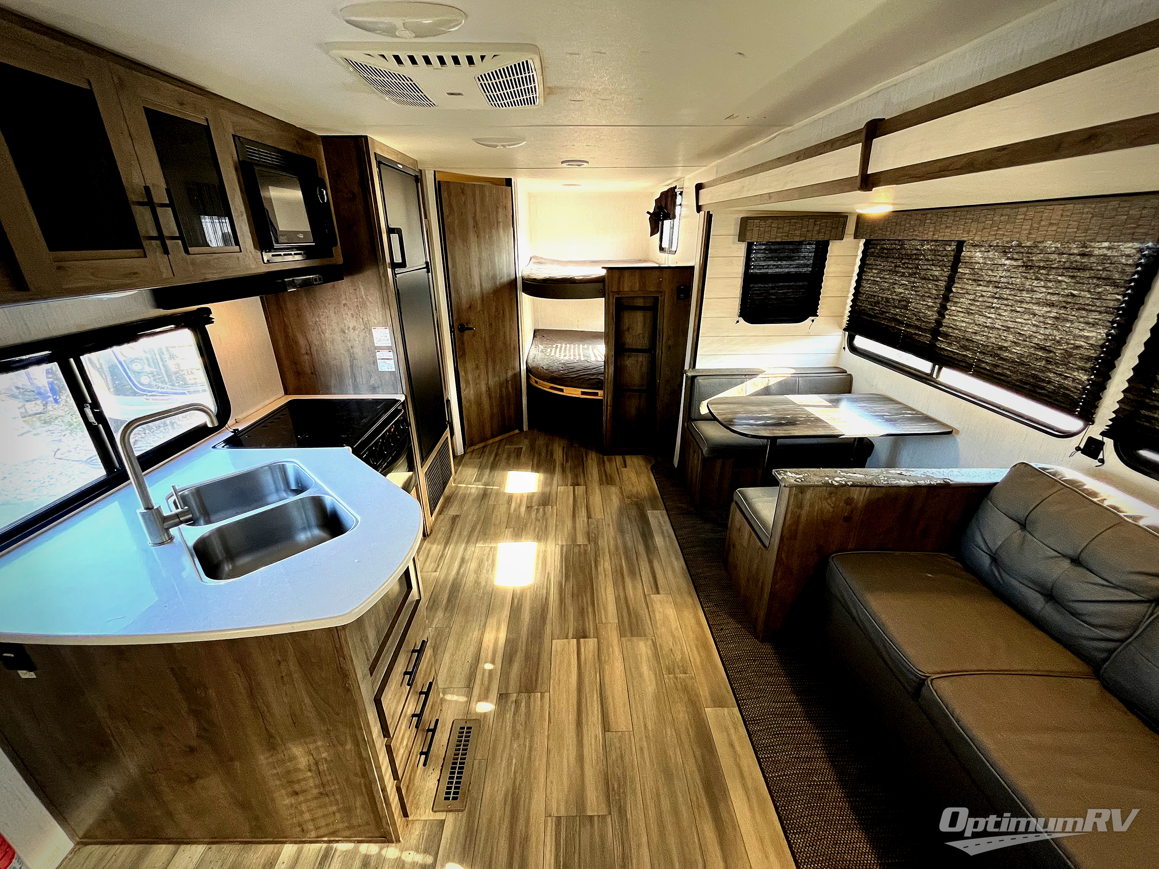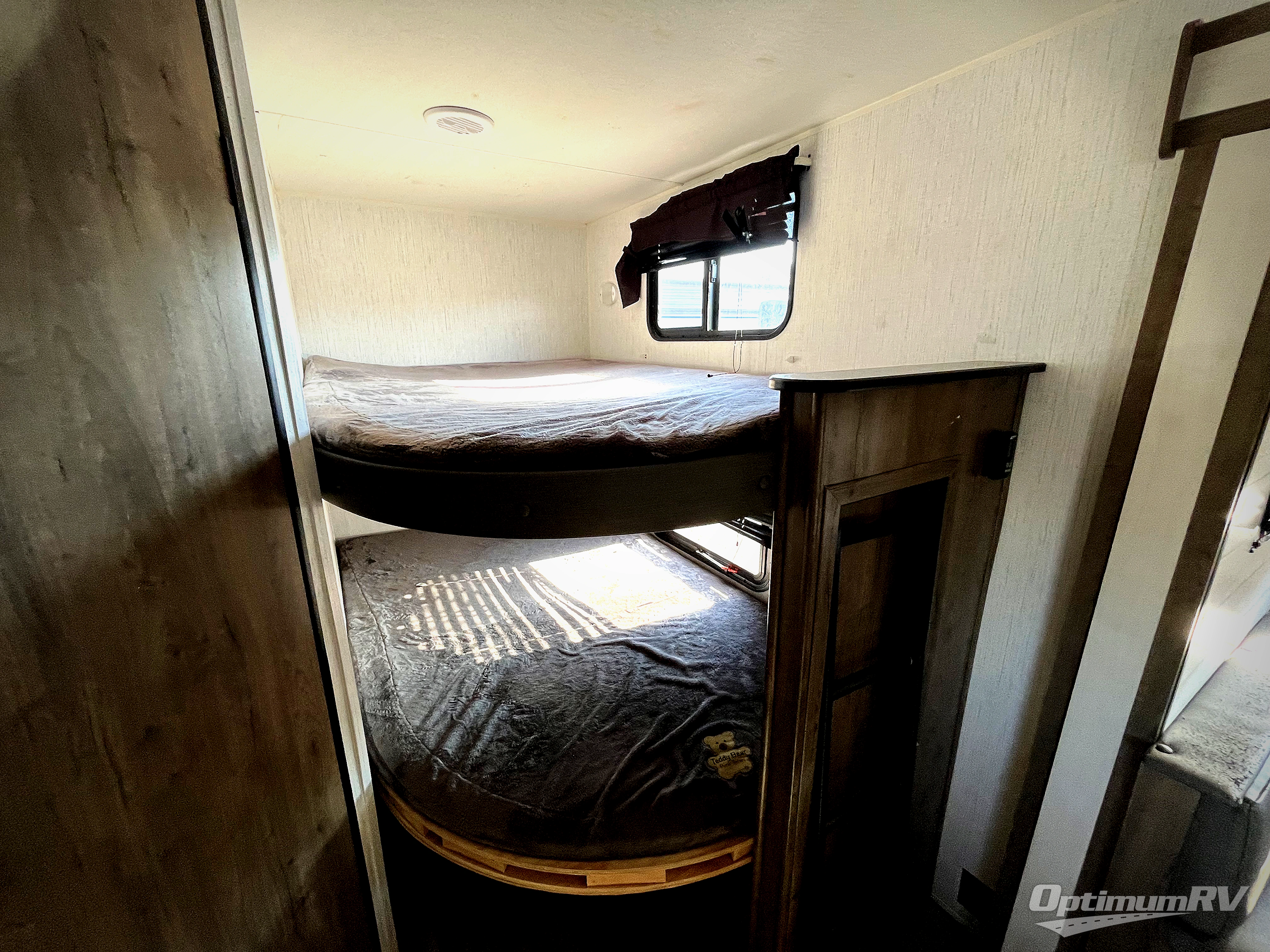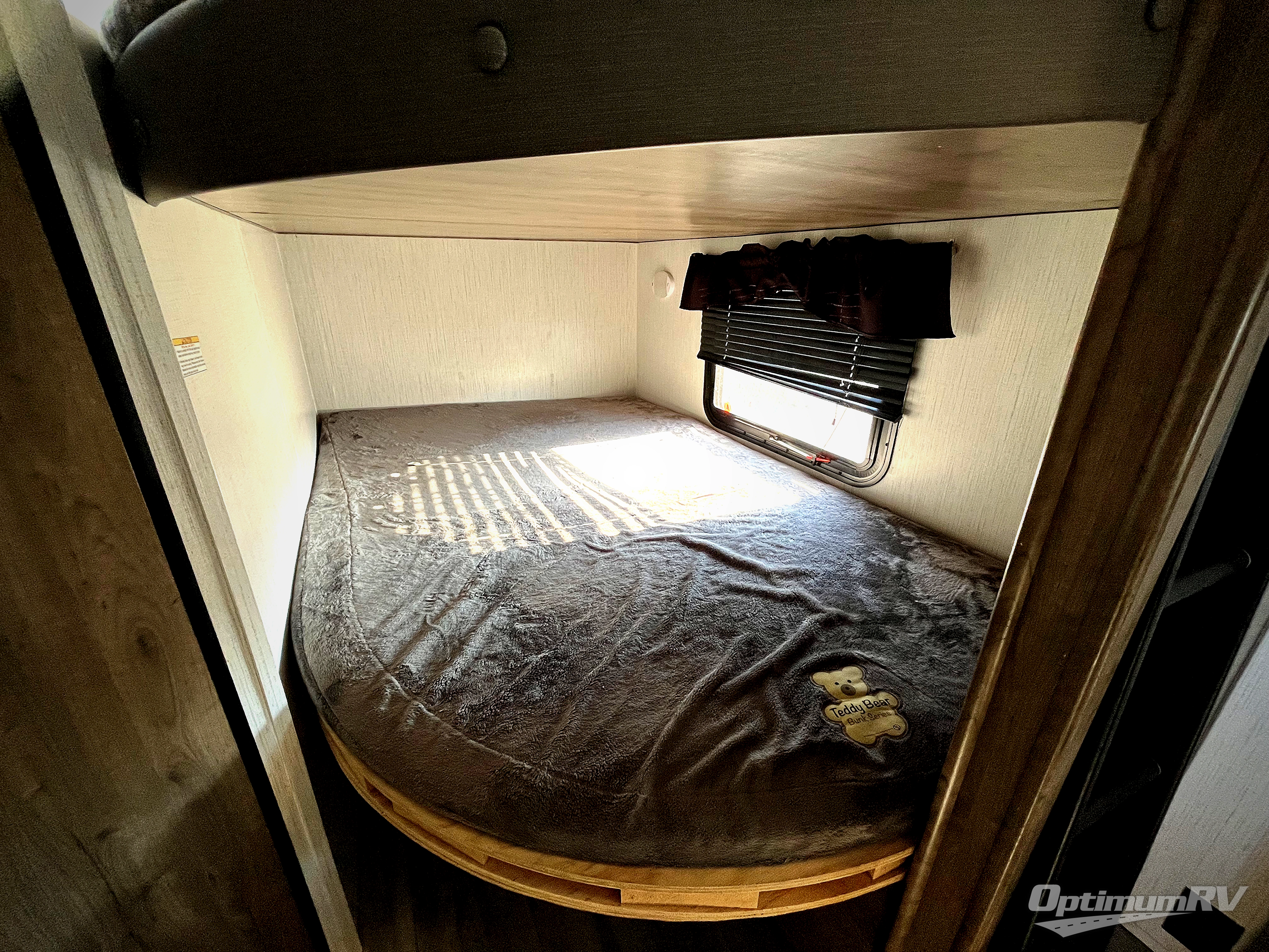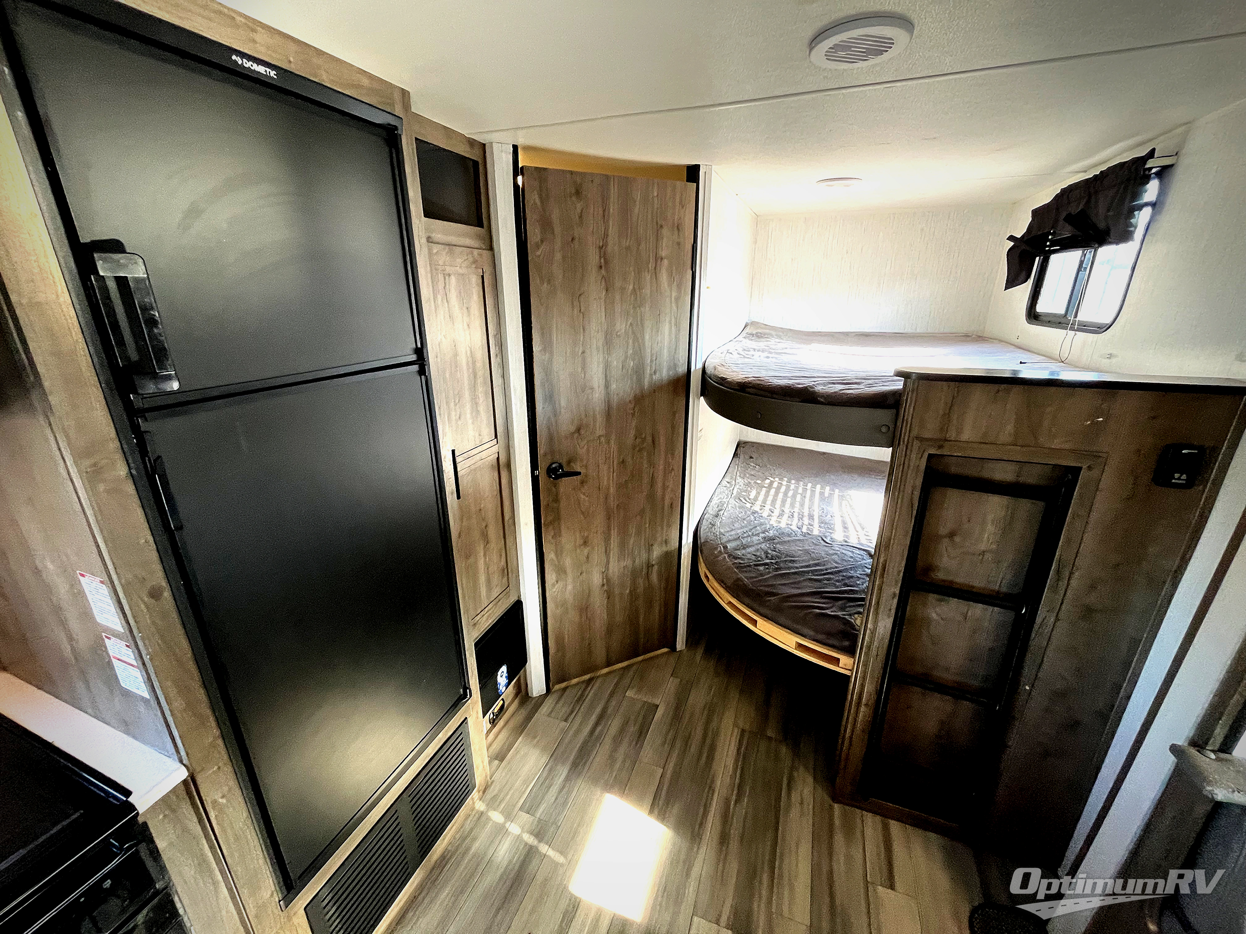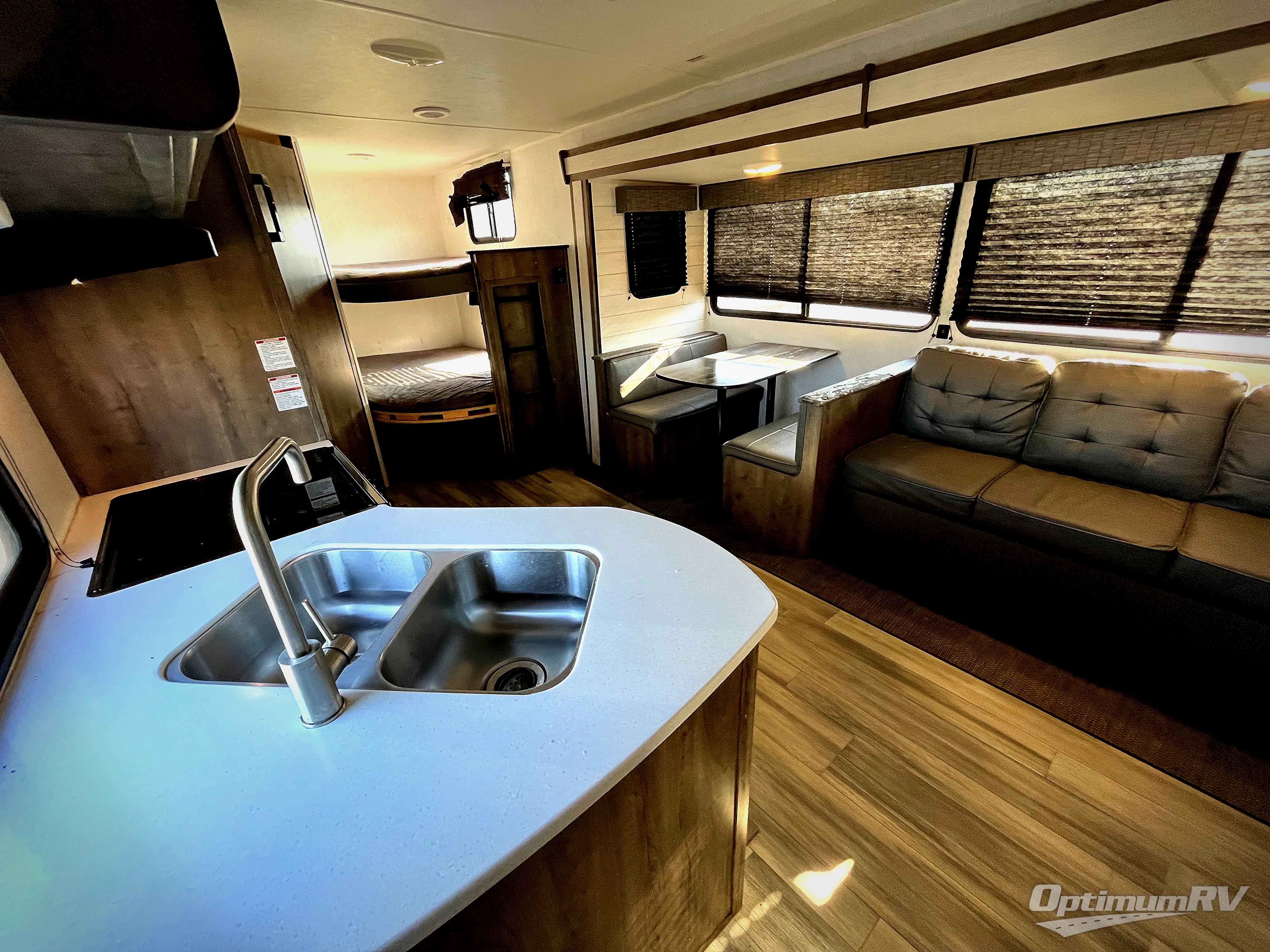 The kids are ready, are you? They are excited about hanging out on the double-size bunks with a ladder after hiking and exploring around the campgrounds. A feature you are sure to like is the exterior entry door into the full bathroom which allows you to easily access the bathroom from outside when relaxing under the power awning. The main living and kitchen area offers a slide out which includes a booth dinette and sofa and provides more floor space in this area and the kitchen. The cook will have full amenities including a three-burner cooktop and microwave oven, plus an 8 cu. ft. double door refrigerator. And when you need privacy, open up the sliding door into the front bedroom and take a nap on the queen bed.