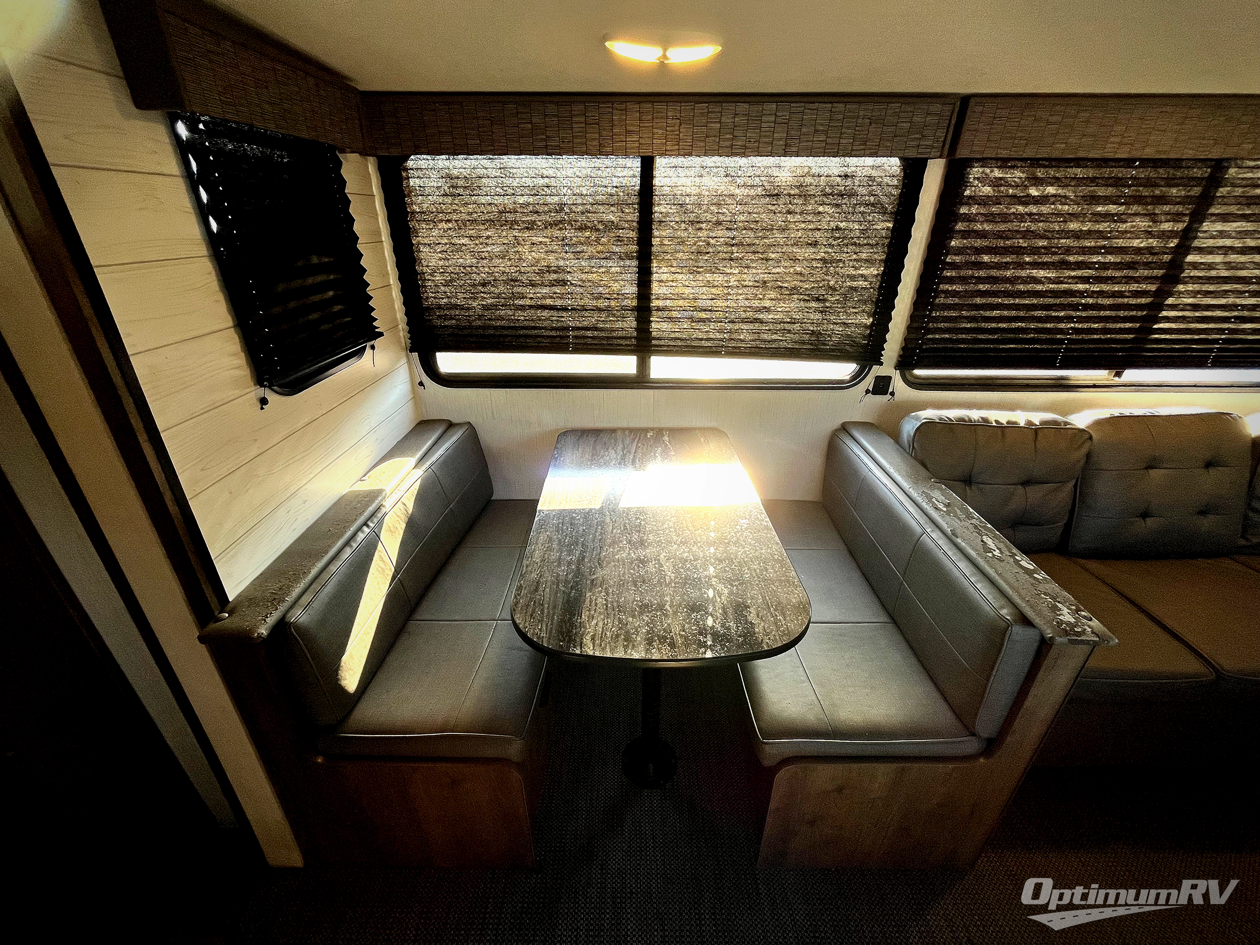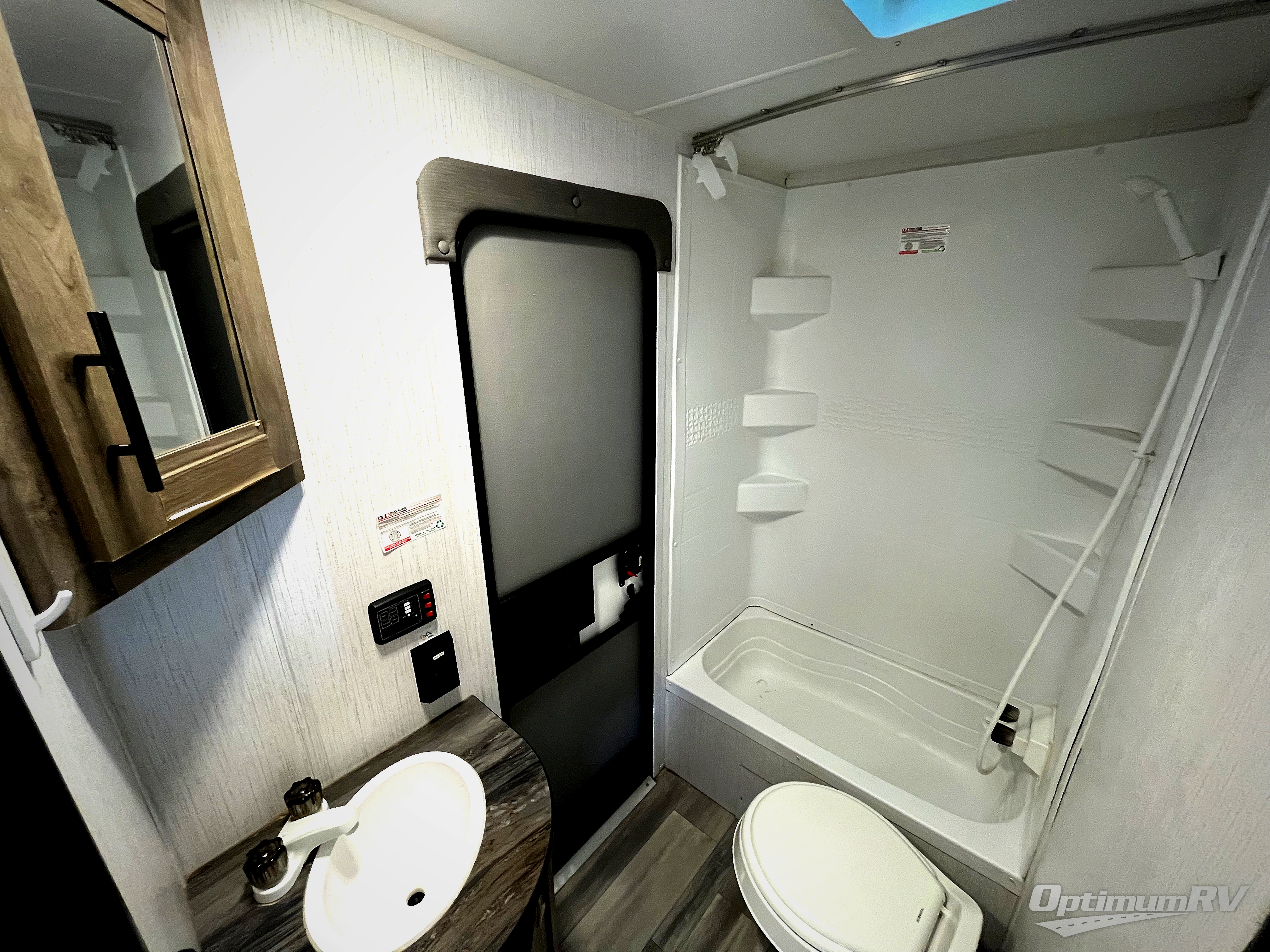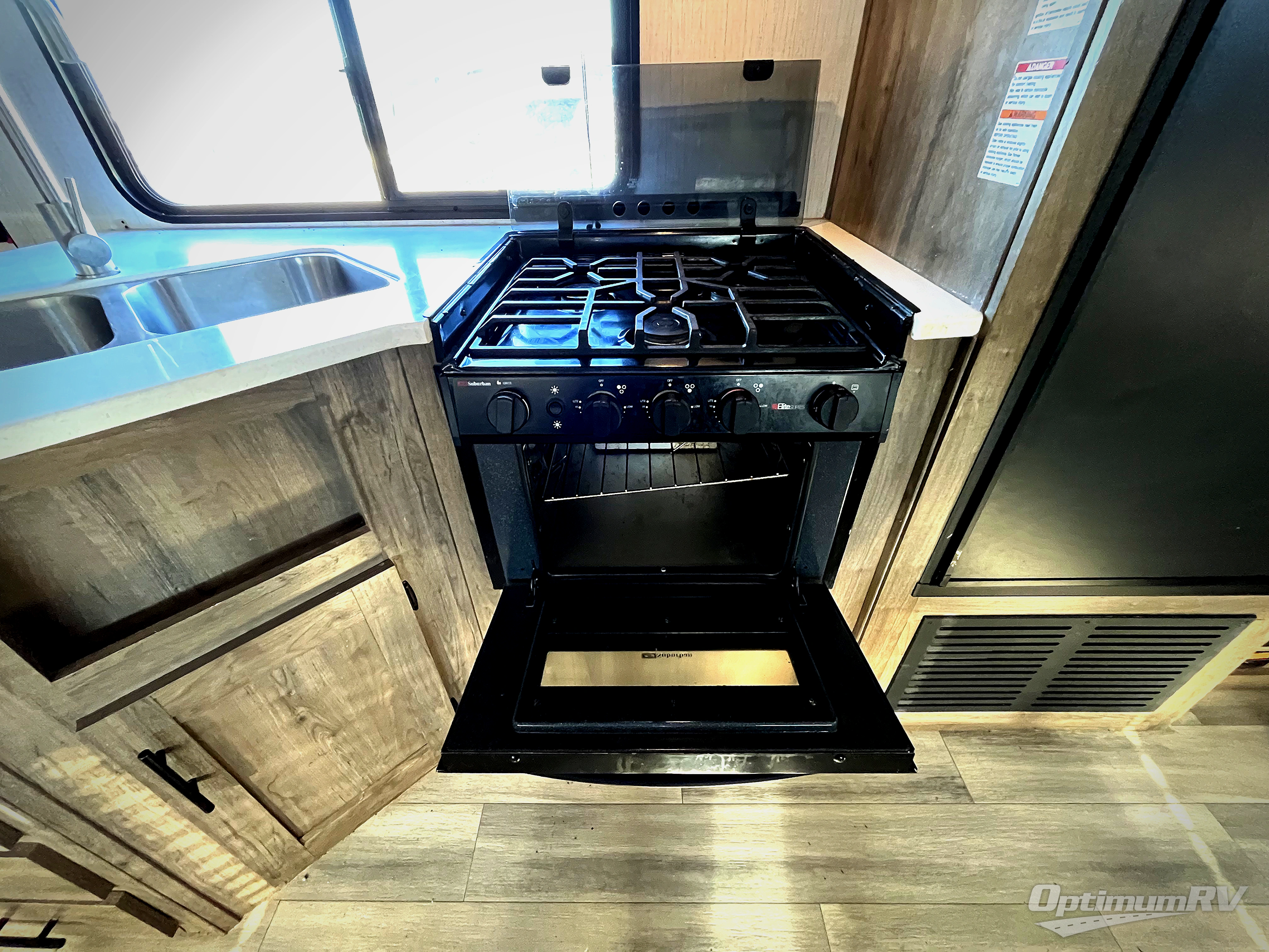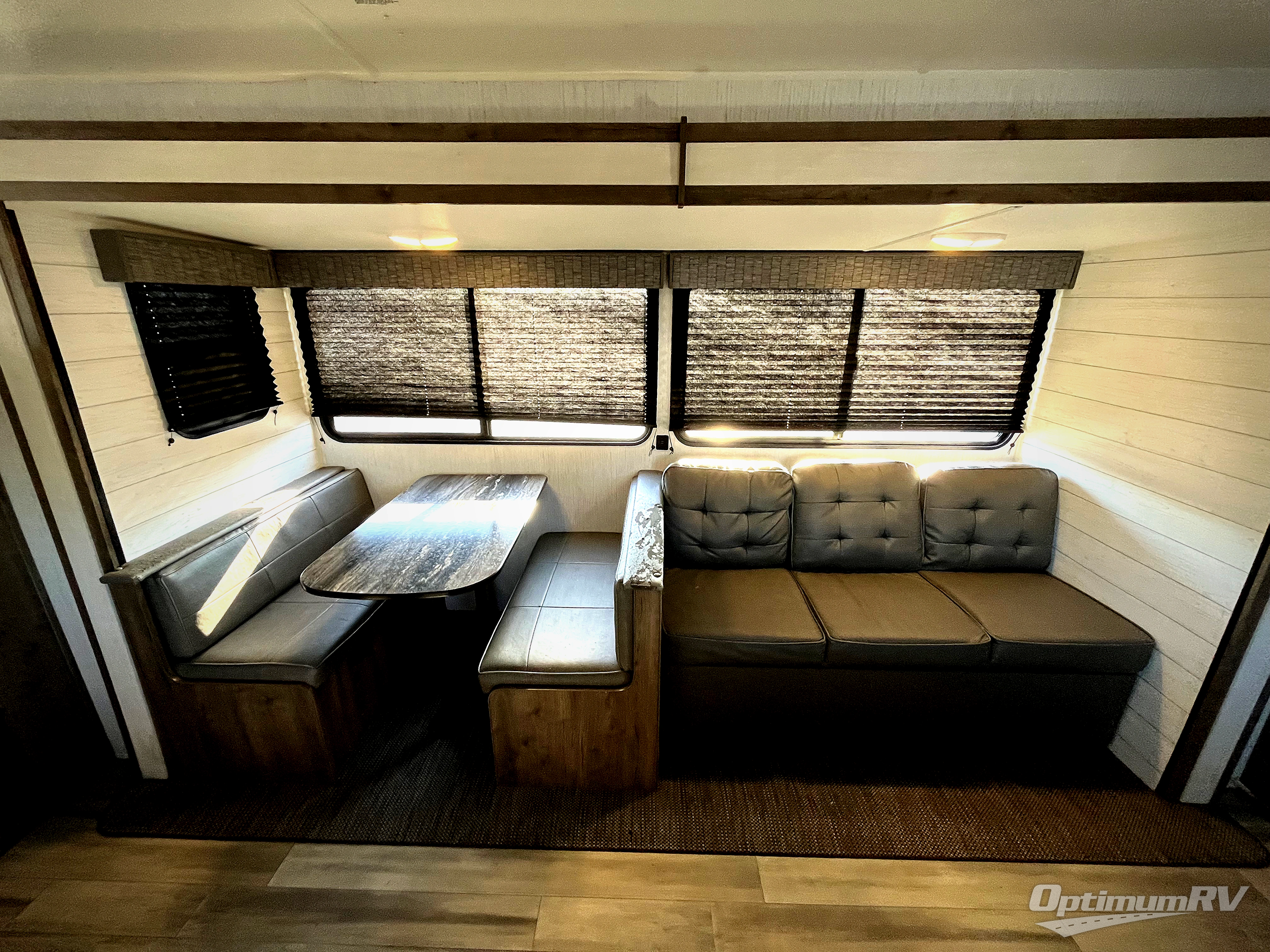 The kids are ready, are you? They are excited about hanging out on the double-size bunks with a ladder after hiking and exploring around the campgrounds. A feature you are sure to like is the exterior entry door into the full bathroom which allows you to easily access the bathroom from outside when relaxing under the power awning. The main living and kitchen area offers a slide out which includes a booth dinette and sofa and provides more floor space in this area and the kitchen. The cook will have full amenities including a three-burner cooktop and microwave oven, plus an 8 cu. ft. double door refrigerator. And when you need privacy, open up the sliding door into the front bedroom and take a nap on the queen bed.