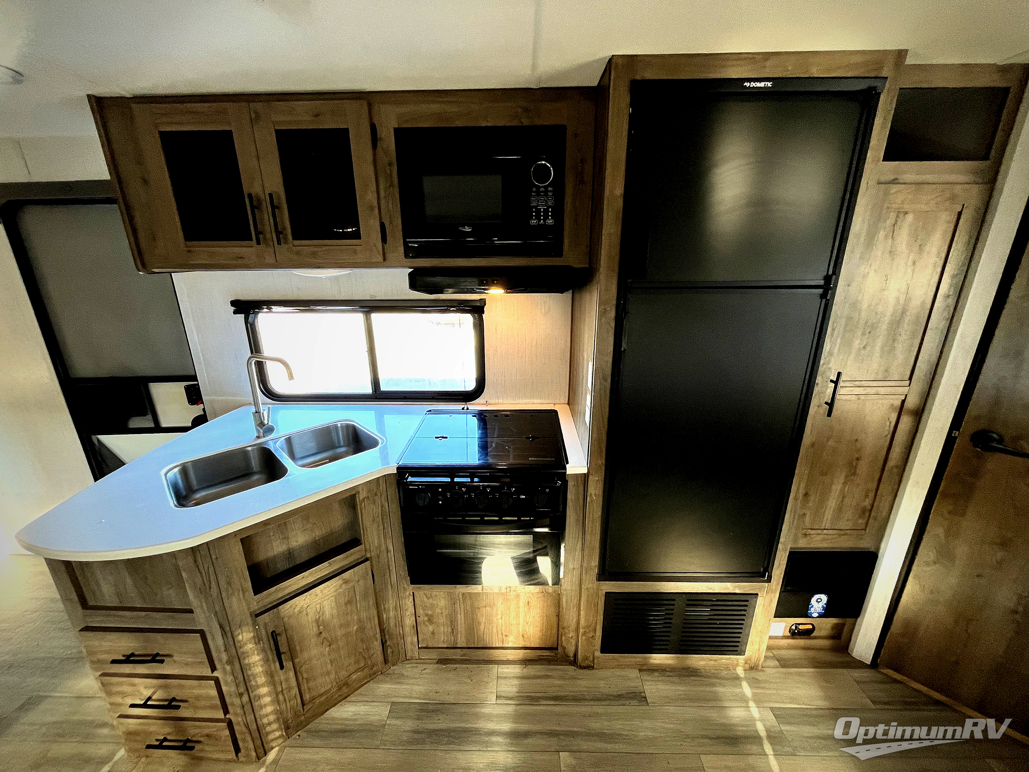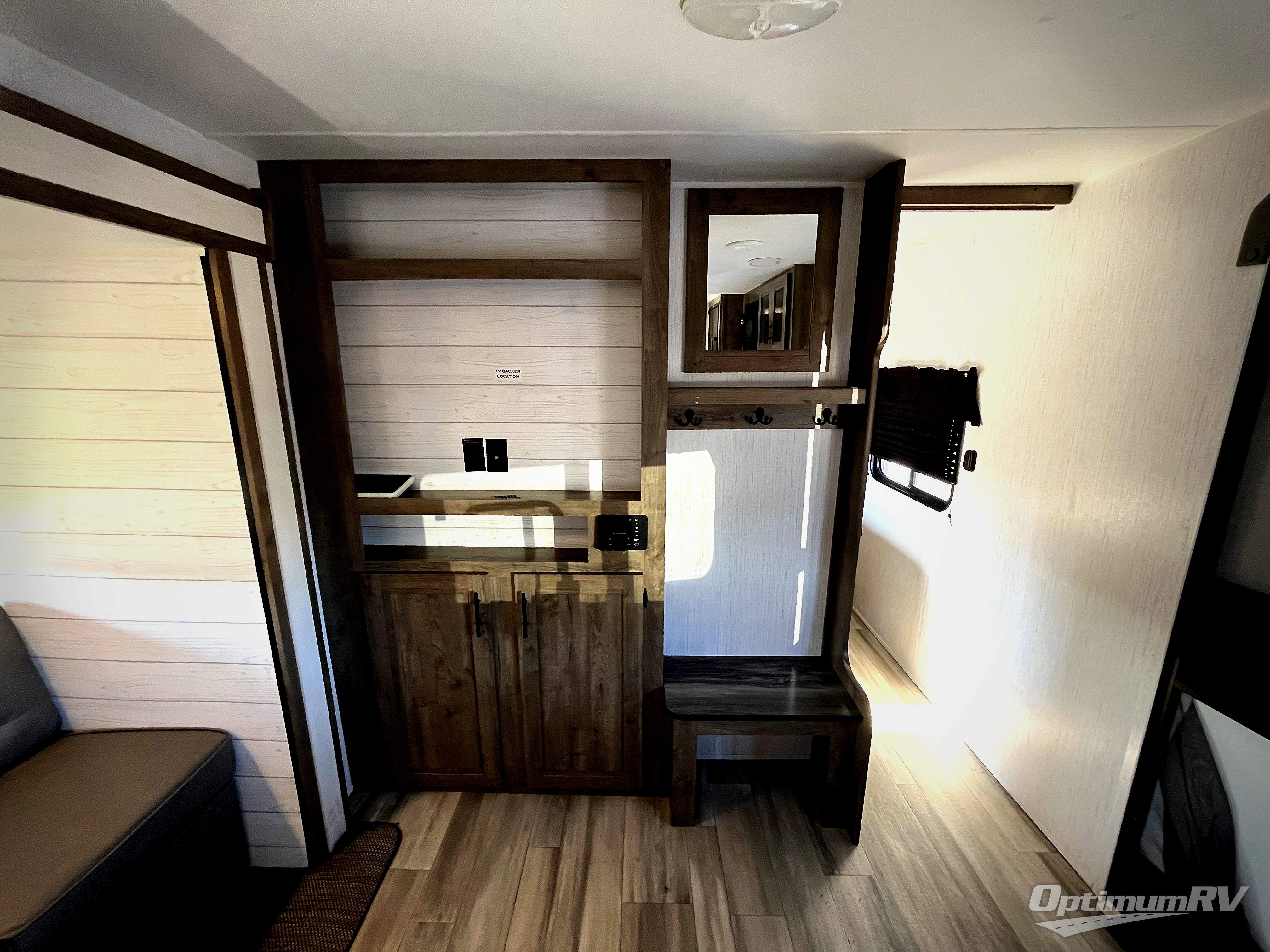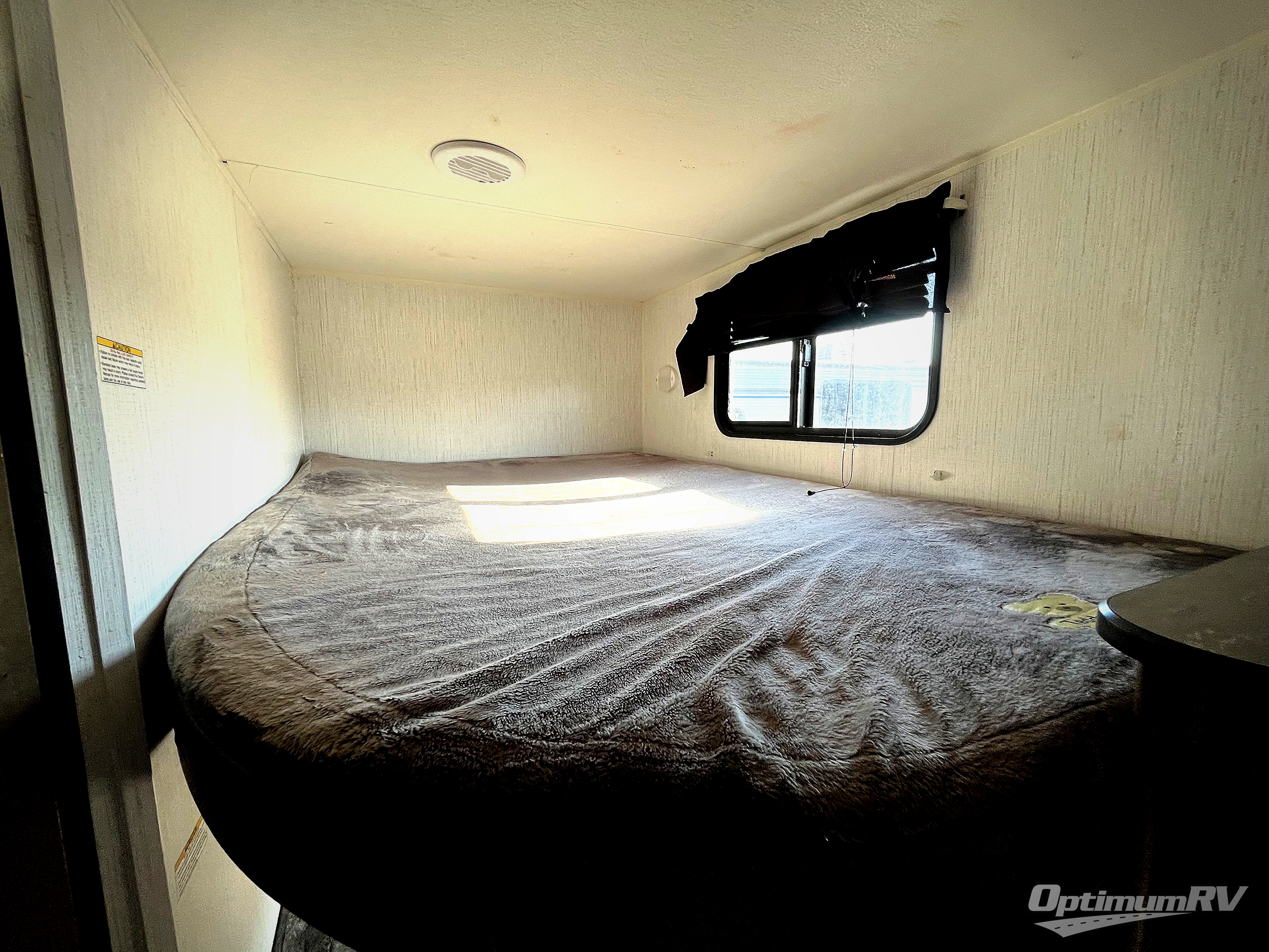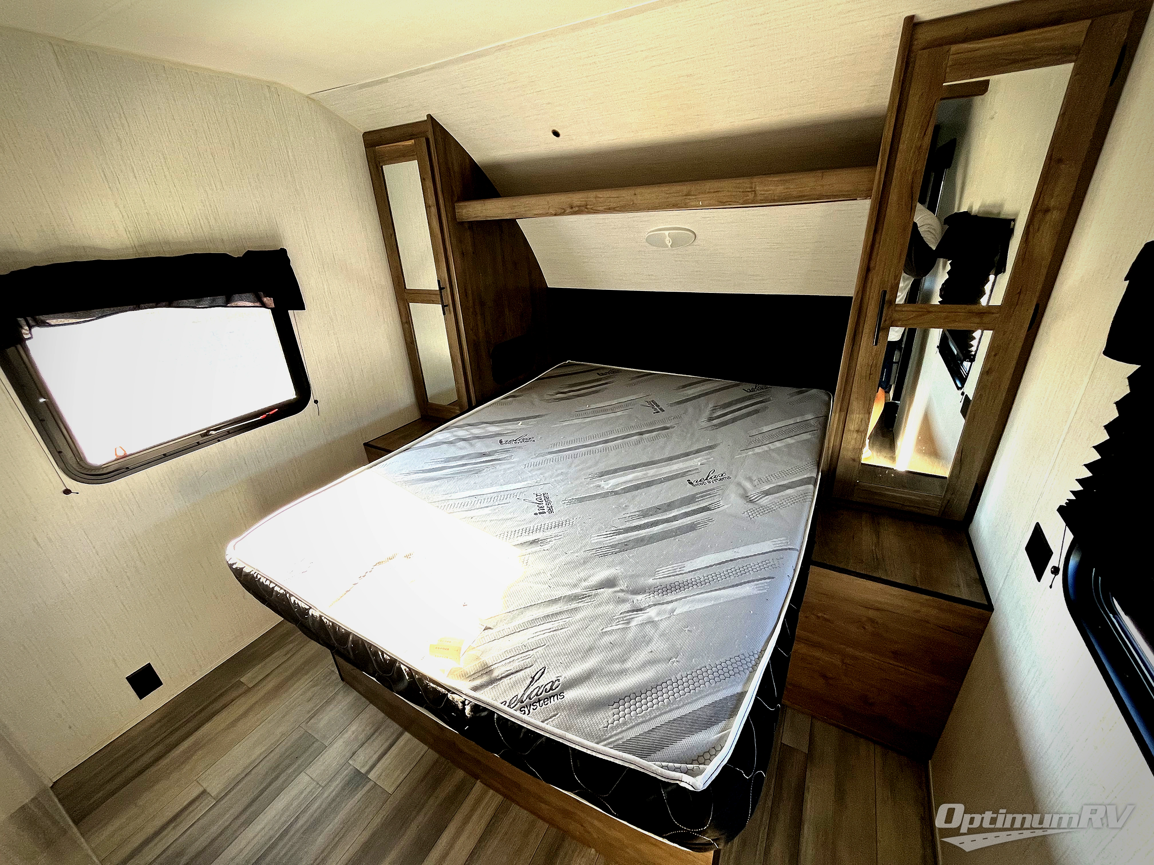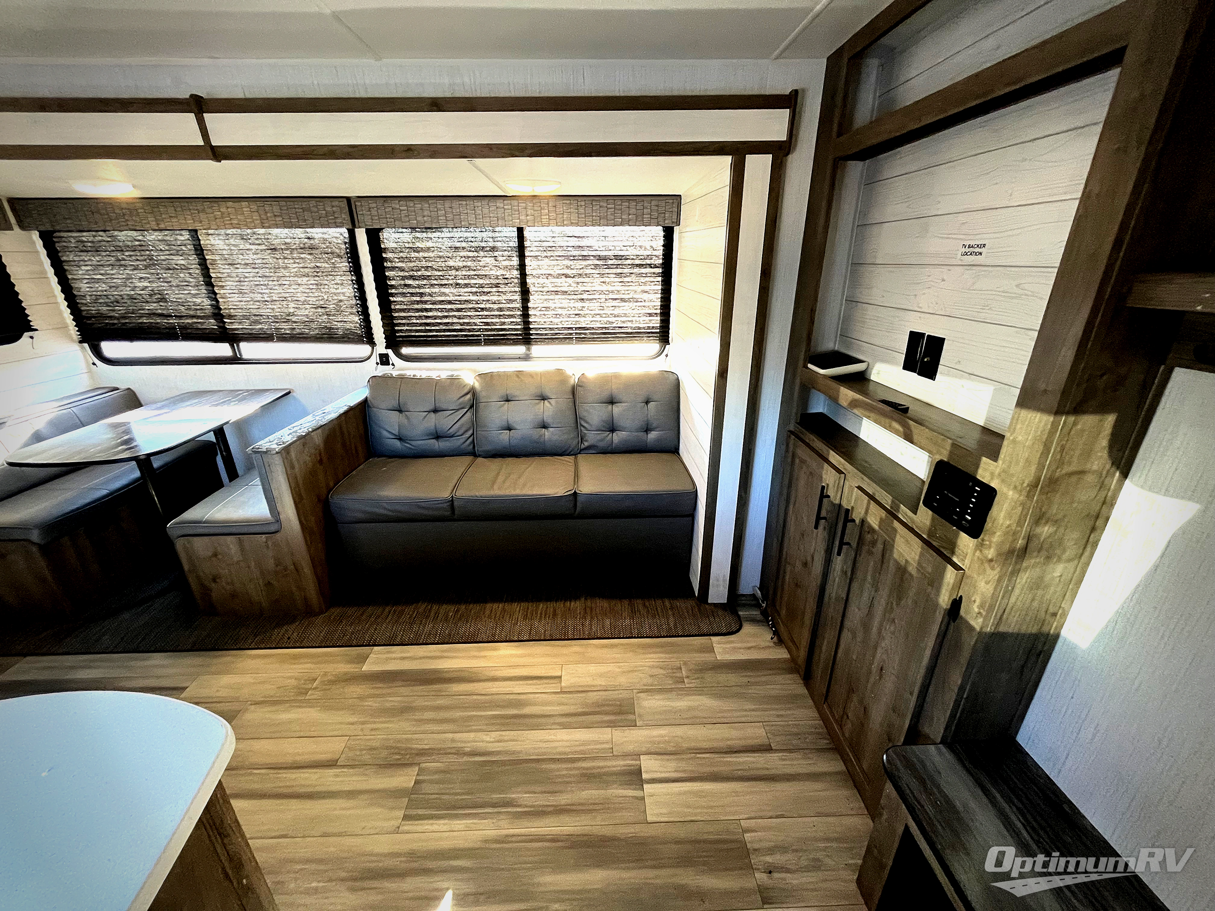 The kids are ready, are you? They are excited about hanging out on the double-size bunks with a ladder after hiking and exploring around the campgrounds. A feature you are sure to like is the exterior entry door into the full bathroom which allows you to easily access the bathroom from outside when relaxing under the power awning. The main living and kitchen area offers a slide out which includes a booth dinette and sofa and provides more floor space in this area and the kitchen. The cook will have full amenities including a three-burner cooktop and microwave oven, plus an 8 cu. ft. double door refrigerator. And when you need privacy, open up the sliding door into the front bedroom and take a nap on the queen bed.