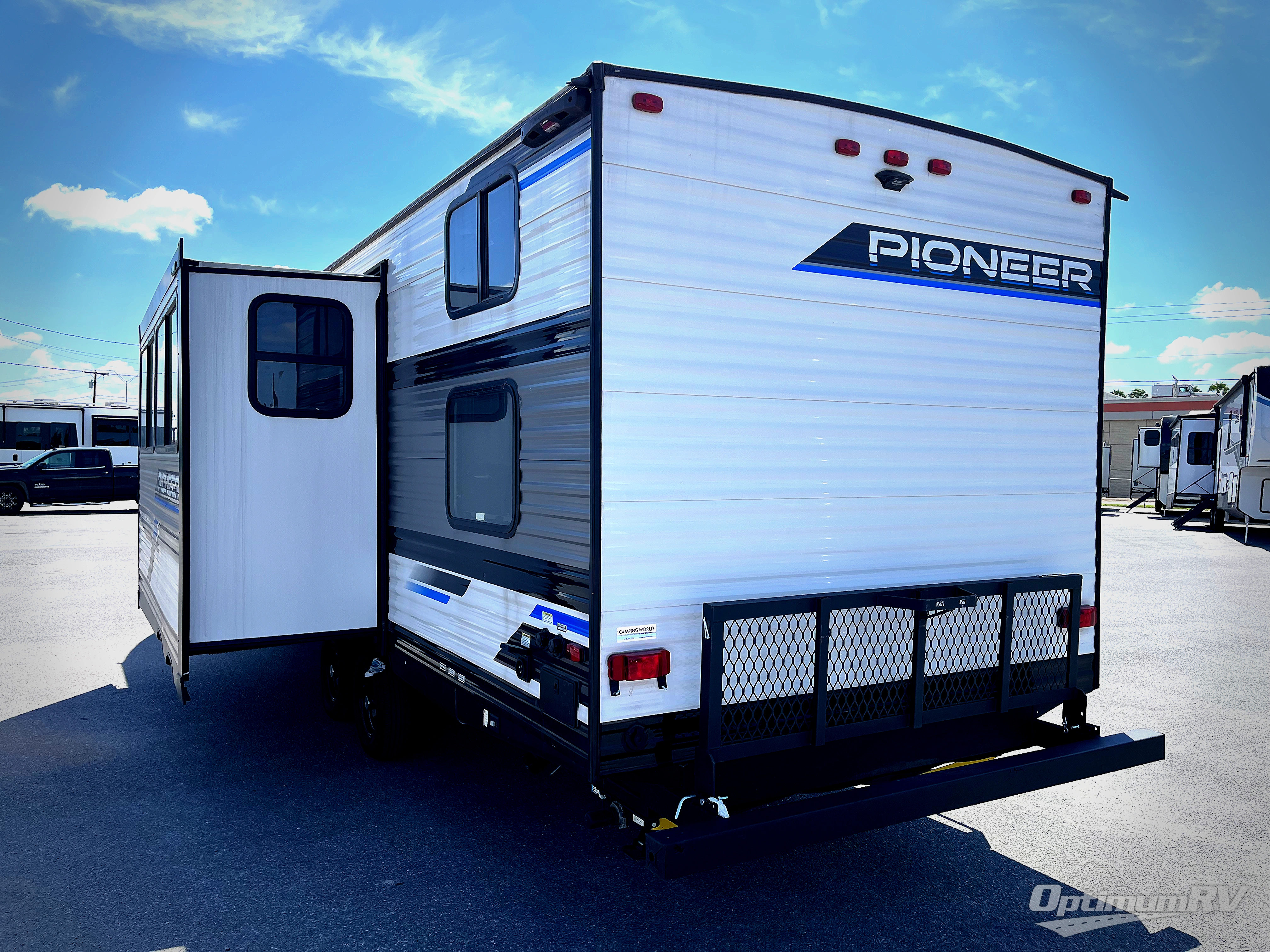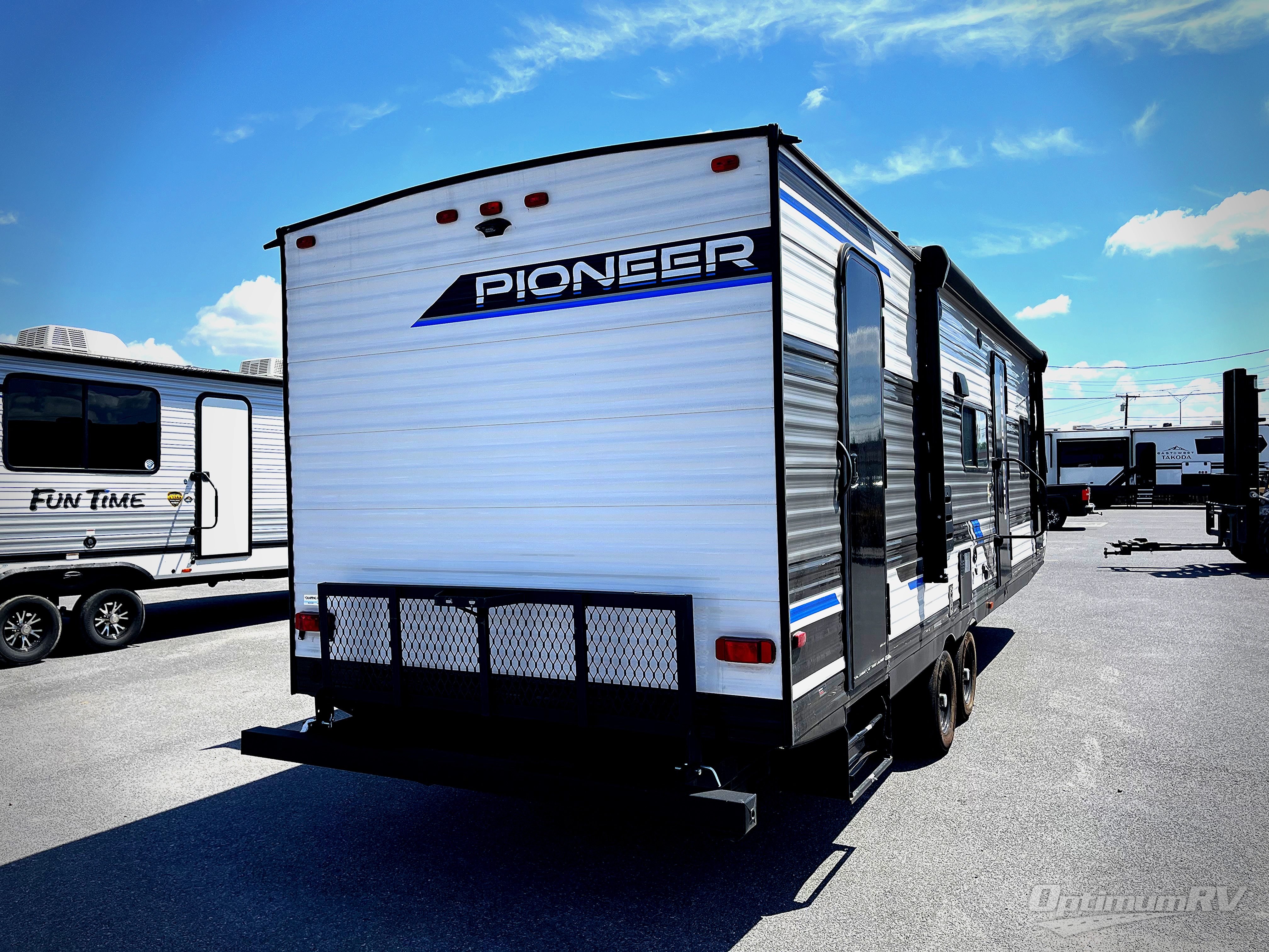 With any Pioneer dual axle travel trailer or toy hauler by Heartland, there is a hybrid aluminum front profile with aerodynamic radius front cage structure for better wind and water deflection, adding strength and reducing tongue weight. The Pioneer Power Pack provides power stabilizer jacks, a power tongue jack and a power awning, plus the EZ Camp package gives you a black tank flush, an outside shower with hot and cold water, LP quick connect, an outside TV hookup and a flip-down secure step with an XL handle. The interior offers solid surface countertops and a large stainless steel sink with high rise faucet in the kitchen, full linoleum on the main floor and no carpet in slide outs, cable TV hookup with RG6 coax cabling, and crossflow windows allowing the fresh air to circulate through the extra large windows. Make your selection today!