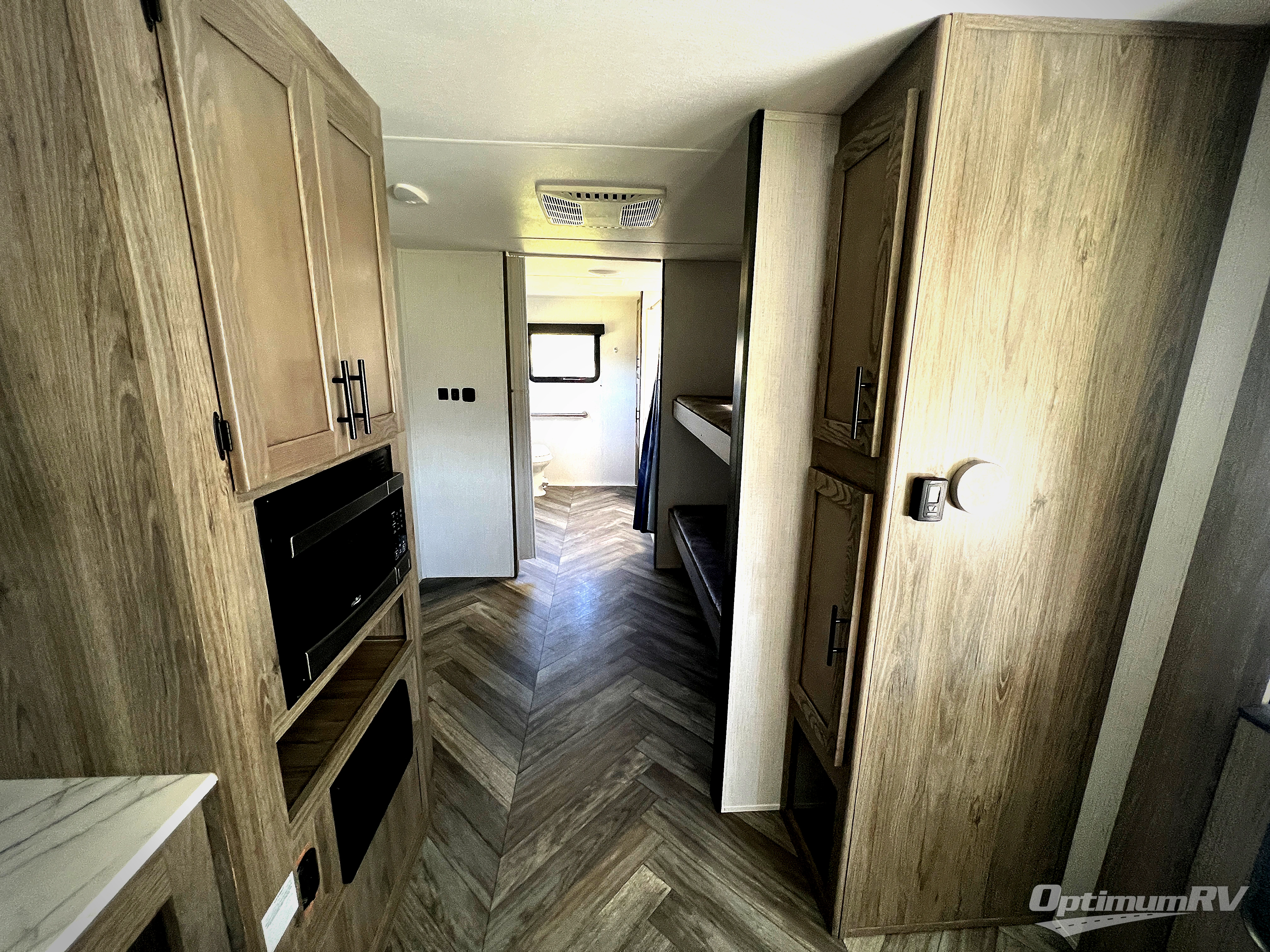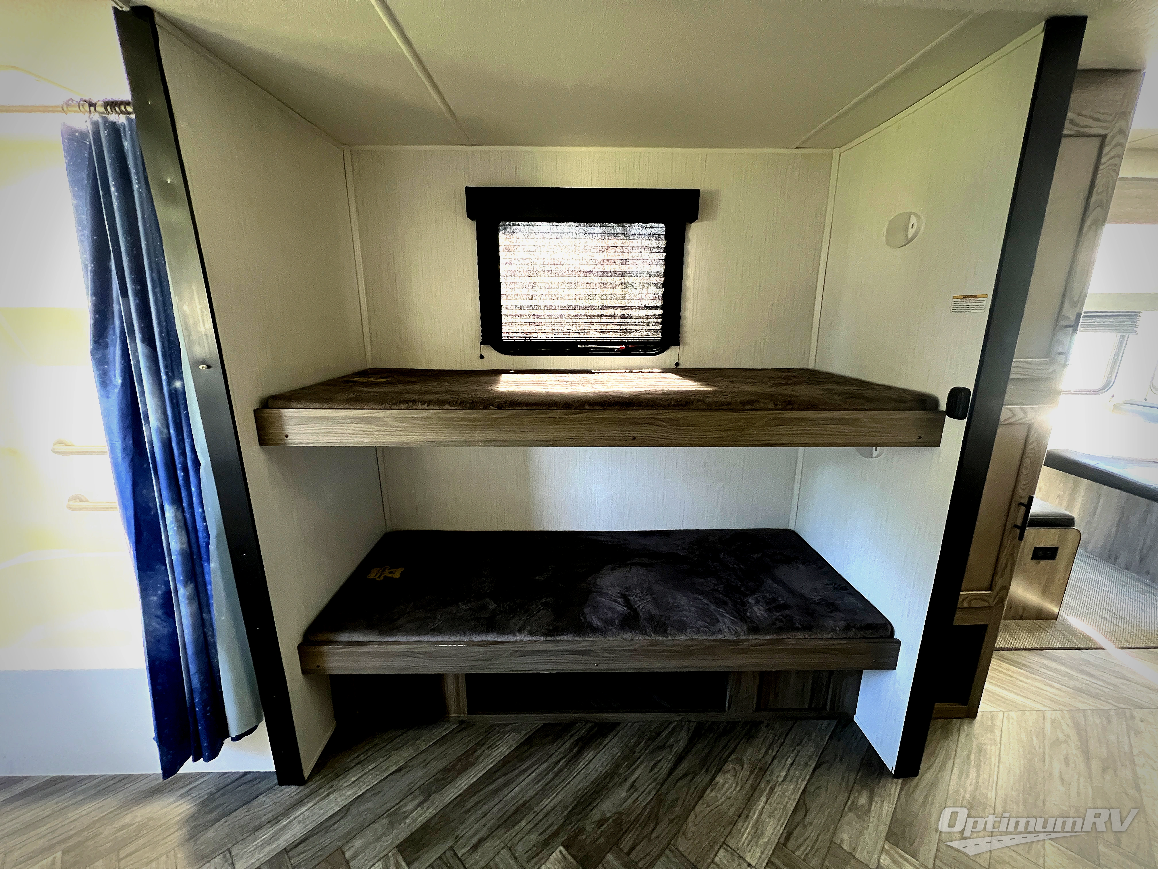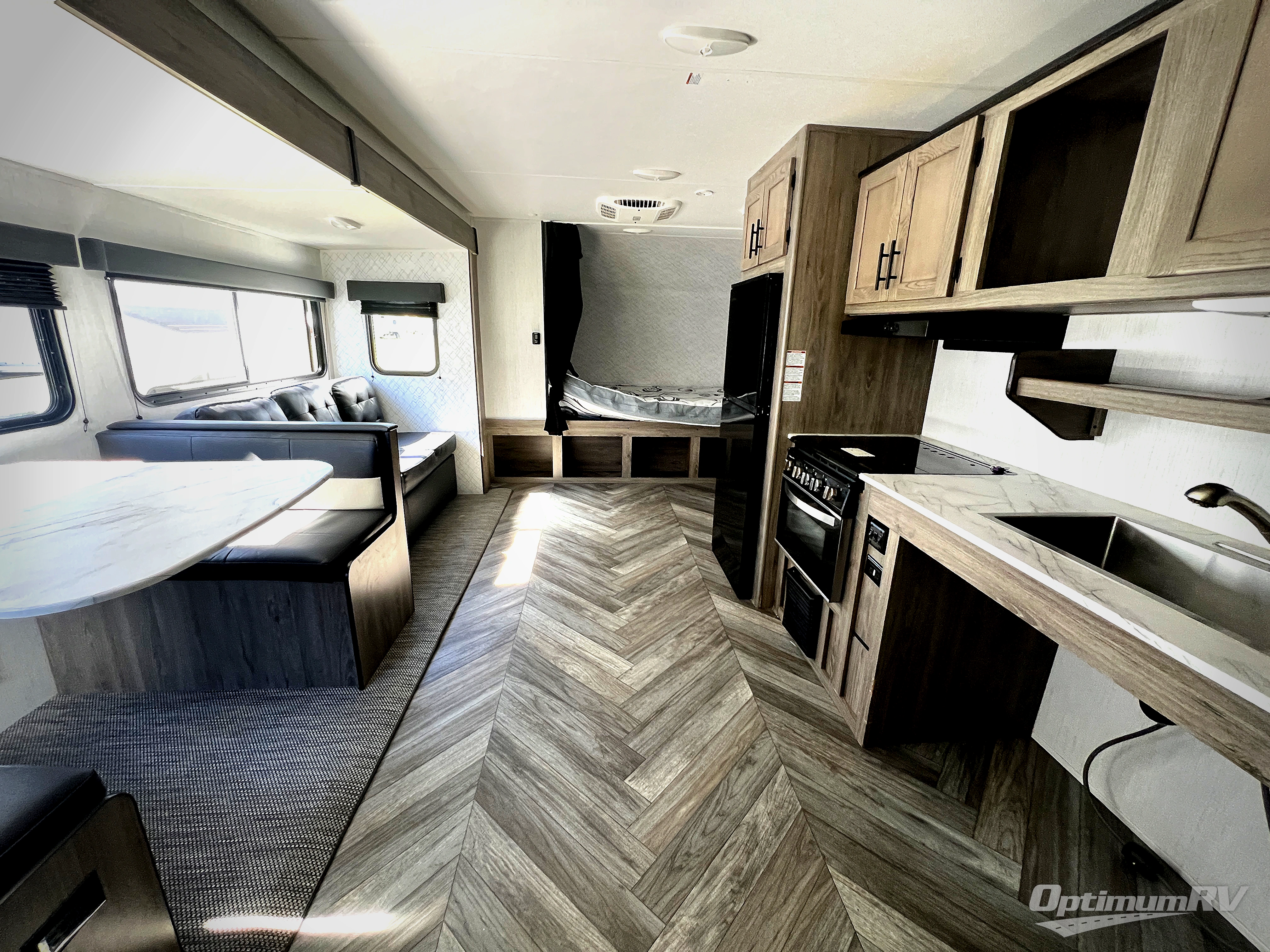 Dual entry and a spacious rear bath makes vacationing fun! The kiddos can sleep on the set of twin bunk beds and you can choose the queen bed up front, plus the sofa and dinette slide also provides sleeping space when converted. The chef can whip up their best meals using the three burner cooktop and everyone can enjoy dining together at the booth dinette where you can later enjoy a game of cards. If you're not big into card games, relax on the sofa while you enjoy a cold drink stored in the 10 cu. ft. stainless steel refrigerator. Freshen up each day in the spacious rear bathroom with ABS tub/shower surround and a skylight above it!