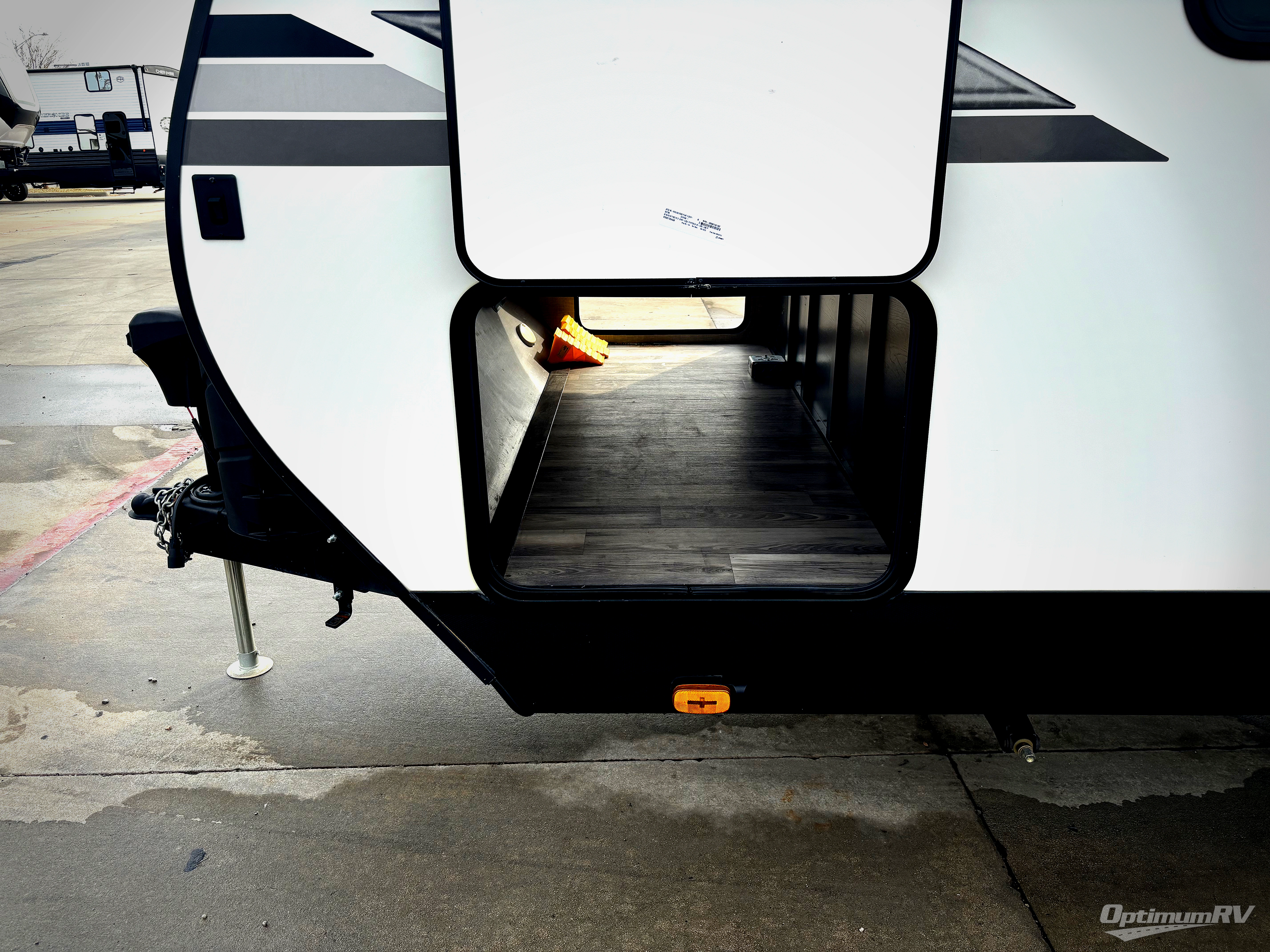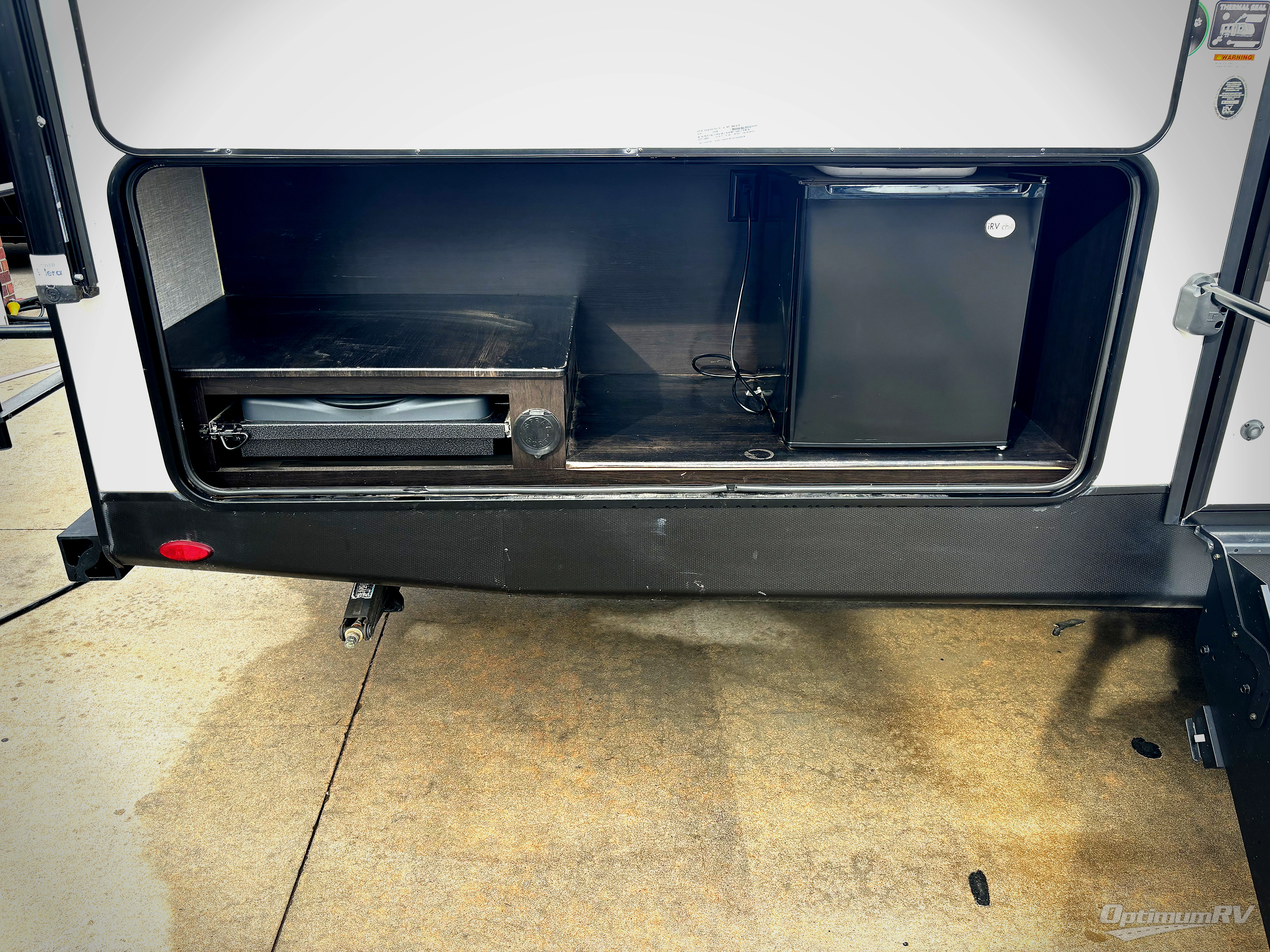 The whole gang can camp together in this travel trailer! Everyone will have a comfortable place to sleep between the rear corner set of double over double bunk beds, the queen bed inside the front private bedroom, and even the U-shaped dinette once converted. Inside the bedroom there is underbed drawers, wardrobes on either side of the bed, and a laundry chute for your dirty clothes to stay out of the way. Behind the entertainment center there is a closet for your storage needs and the kitchen pantry is big enough to store everyone's favorite snacks. The chef will enjoy cooking with the three burner cooktop and 17" oven inside but enjoy cooking at the outside kitchen even more!