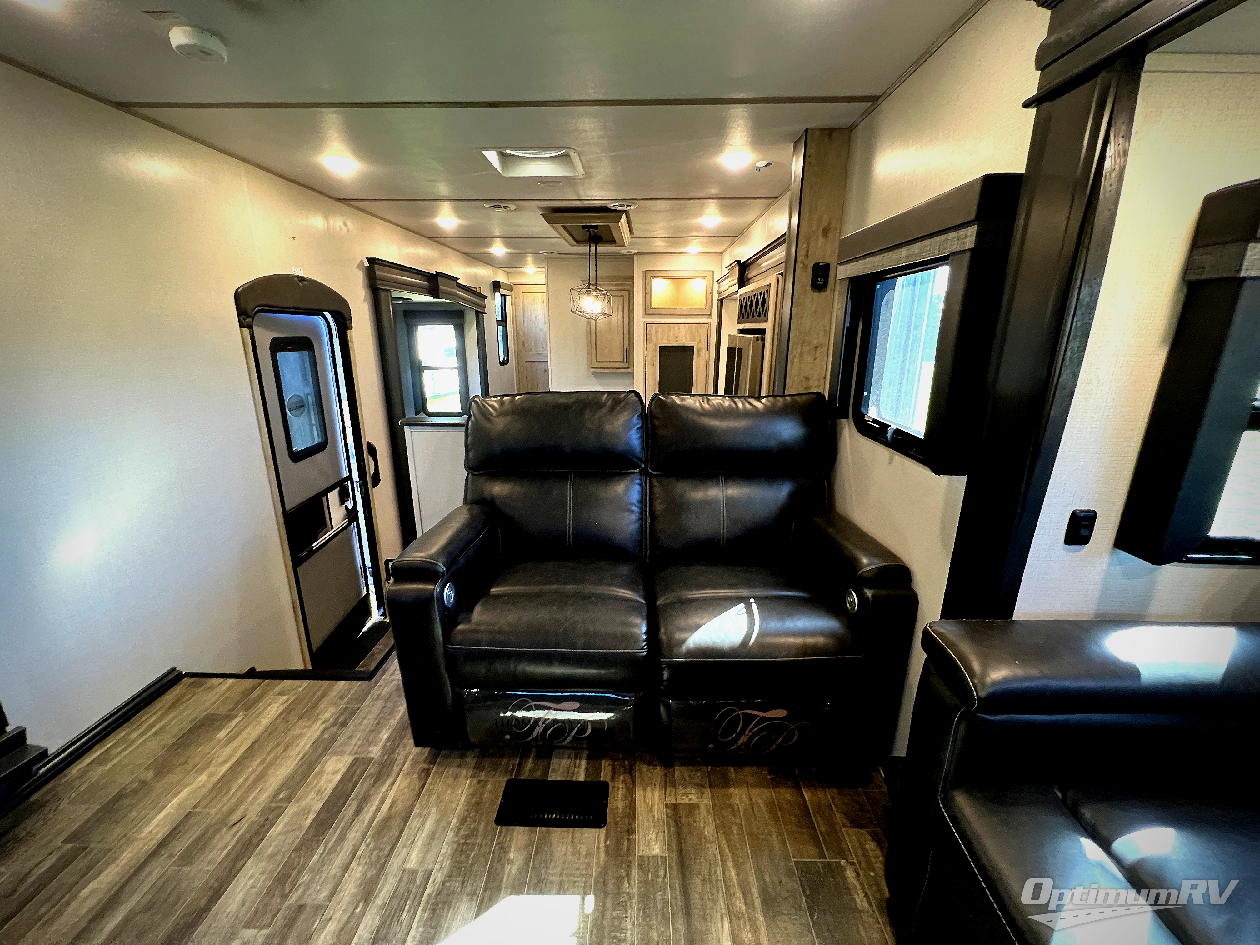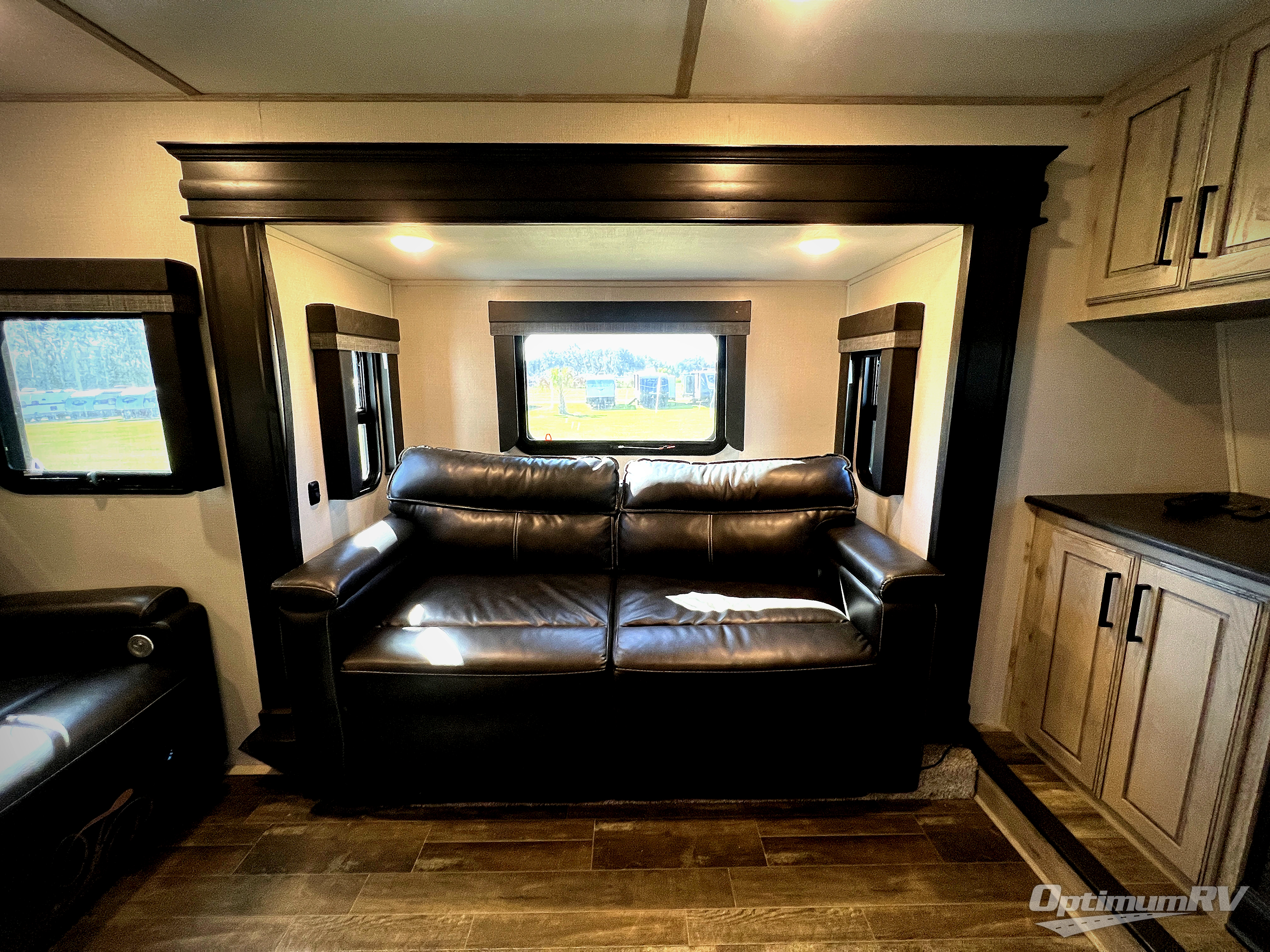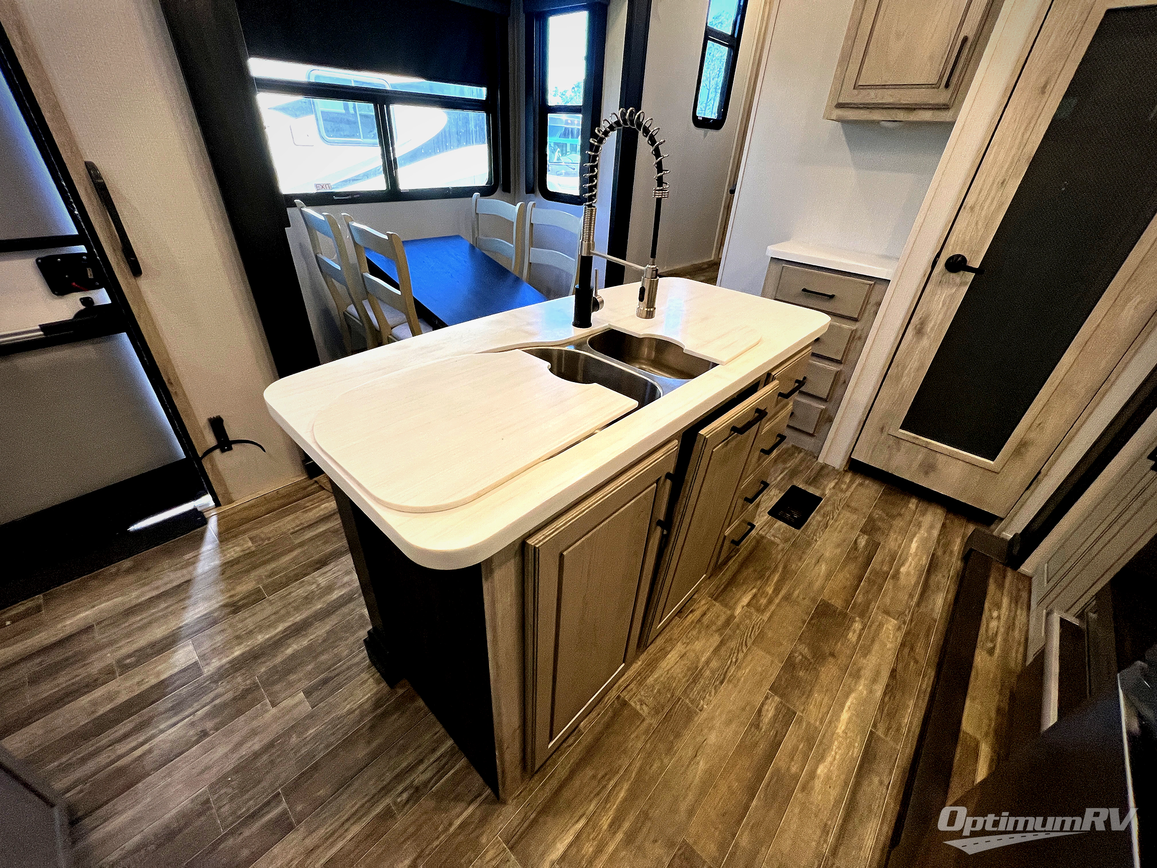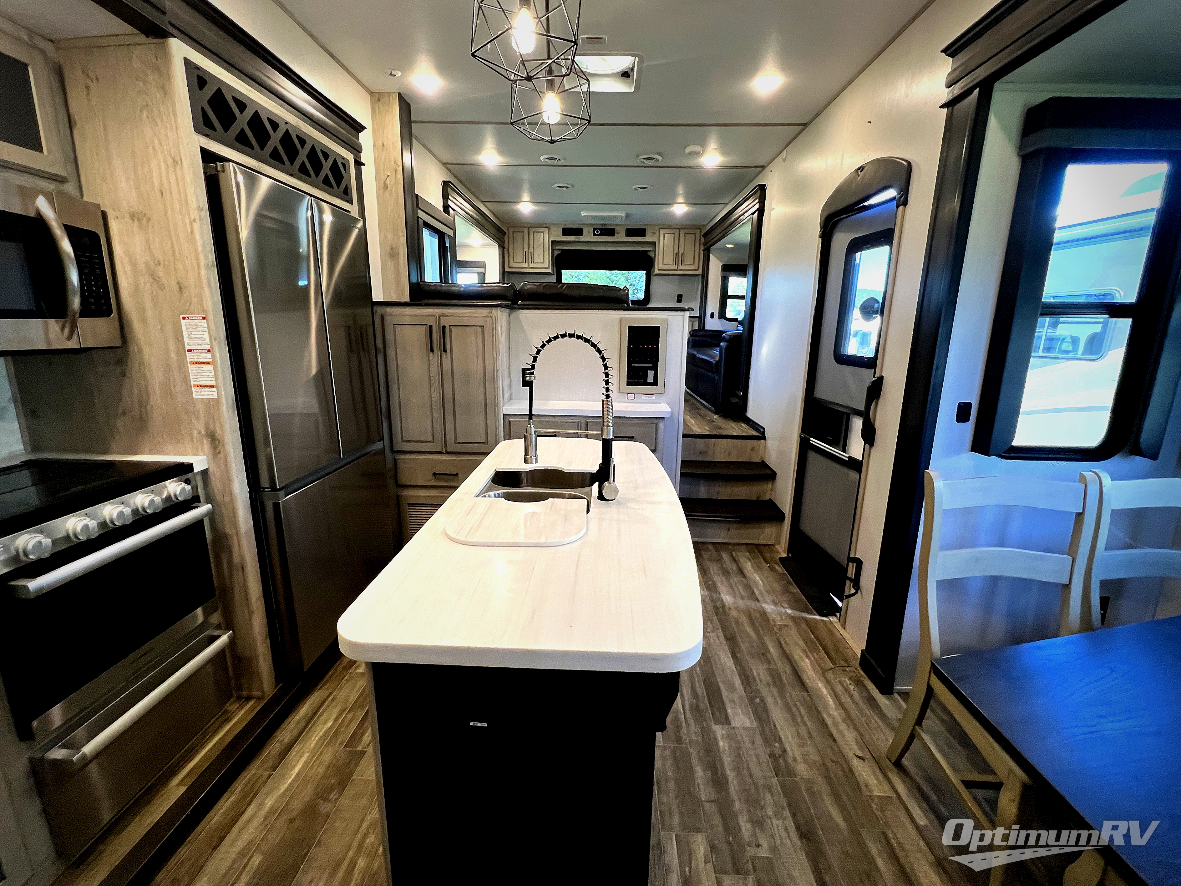 Enjoy traveling with your family and friends in this fifth wheel featuring FIVE slides providing space for everyone! The front living area offers two of those slides each with a tri-fold sleeper sofa for family or overnight guests. A full wall entertainment area and fireplace, plus a theater seat sets this space up as a great gathering place for all to enjoy. Step down to the spacious double slide kitchen and dining area with free standing dinette, a kitchen island, and coffee station, plus 18 cu. ft. refrigerator and range slide with residential microwave overhead. You can easily prepare and enjoy meals while you travel just like at home. At the rear of this amazing coach, you will find a private bed/bath suite featuring a large shower, a king bed slide with storage beneath for extra blankets, plus a wardrobe with bench/workstation and separate space that has been prepped for an optional stackable washer and dryer to provide even more at-home conveniences.