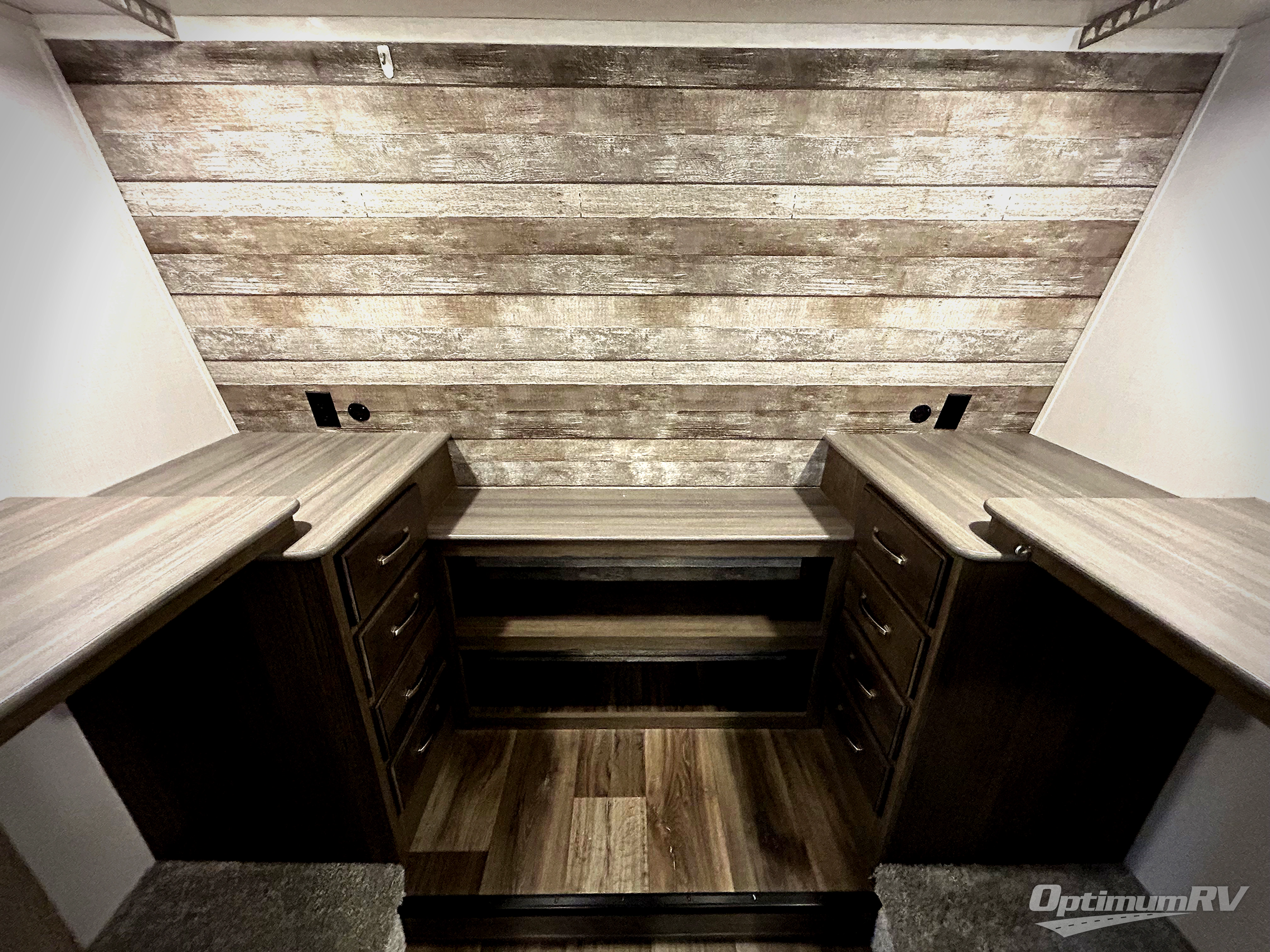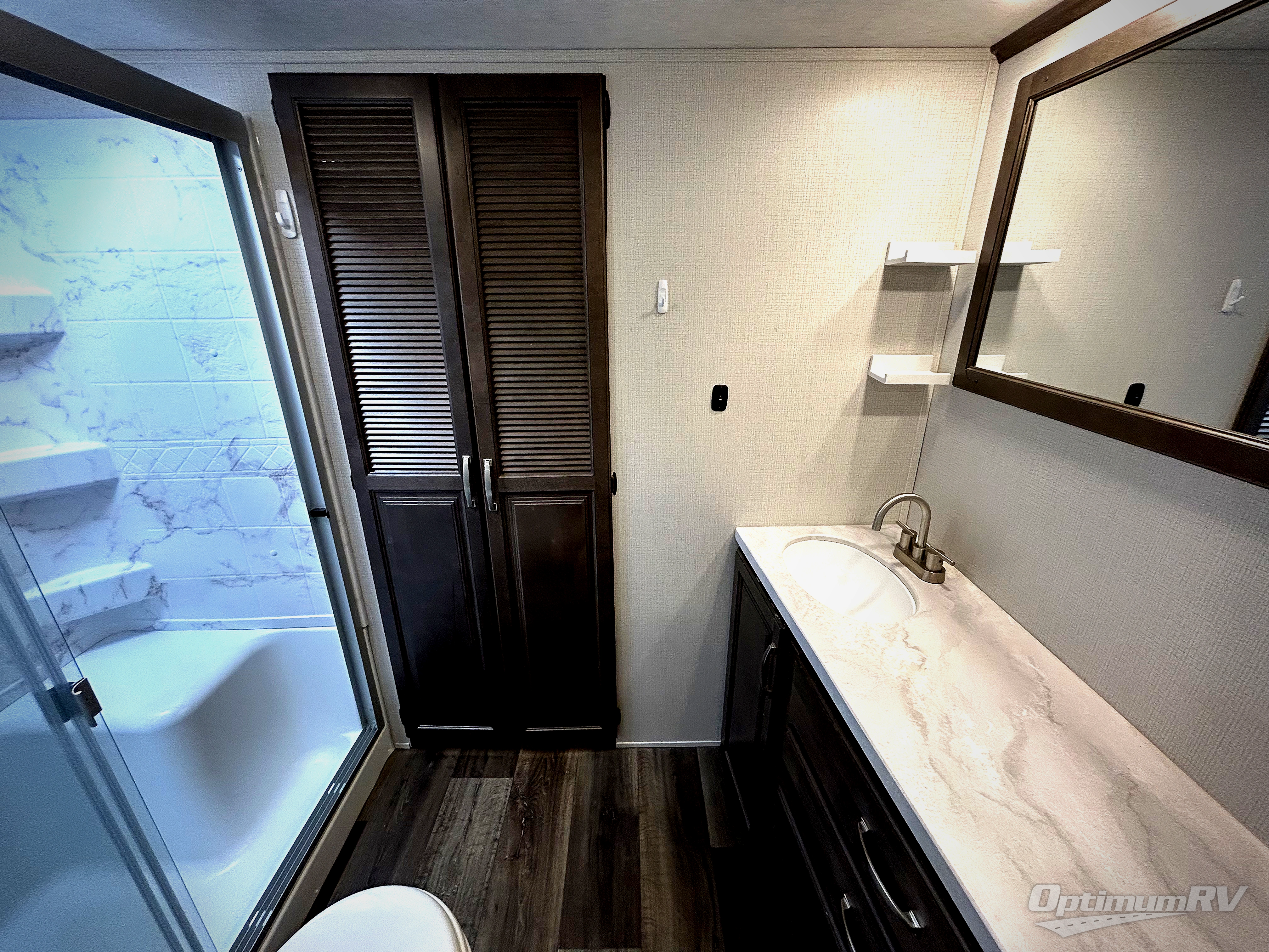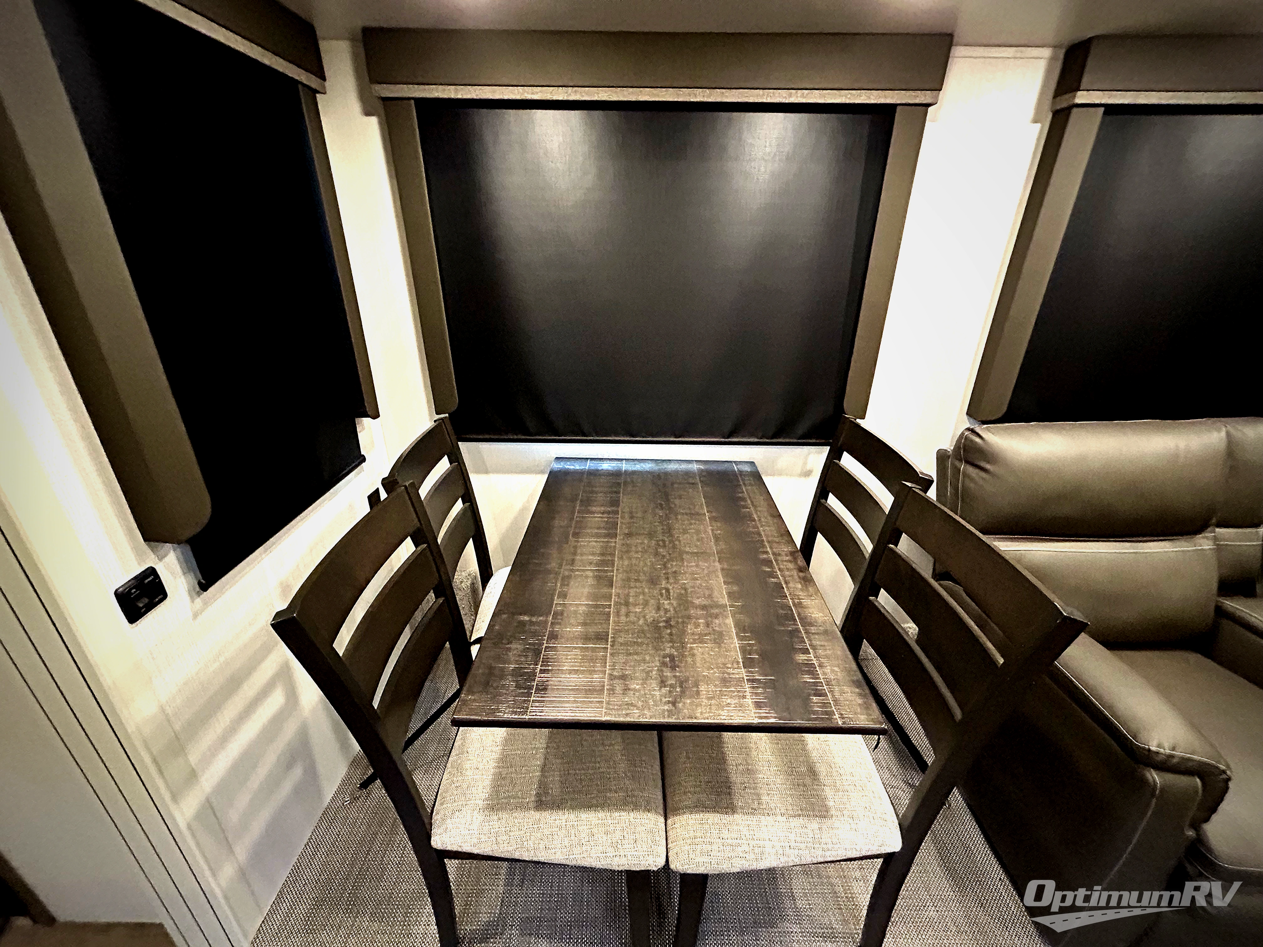 You will be so excited to take this Cougar fifth wheel out for the first time! Because of its secluded and fully stocked master suite at the front, this unit is perfect for a couple who wants to see the country or visit family. The master bathroom has a wonderful walk-in closet that has shoe storage and preparations for a washer/dryer. There is also under-bed storage in the bedroom portion, and the King bed slide gives you a little more space to get to the dresser and linen closet. The half bathroom is located out in the main living area so that your friends will have a place to go when they visit. Opposing slides keep this living area open for lounging comfortably on the tri-fold sleeper sofa and theater seating, and you can get everyone together for a board game at the booth dinette.