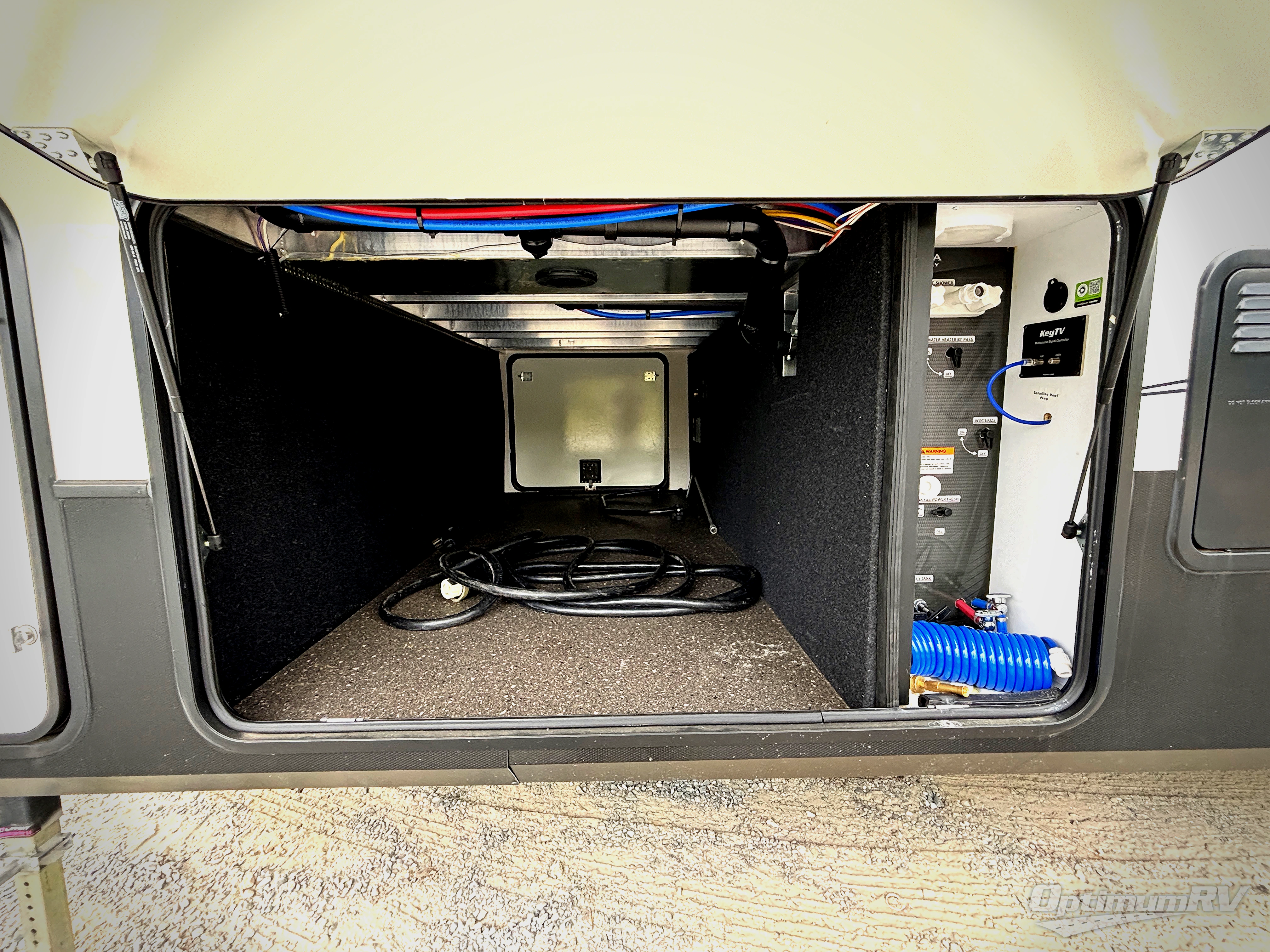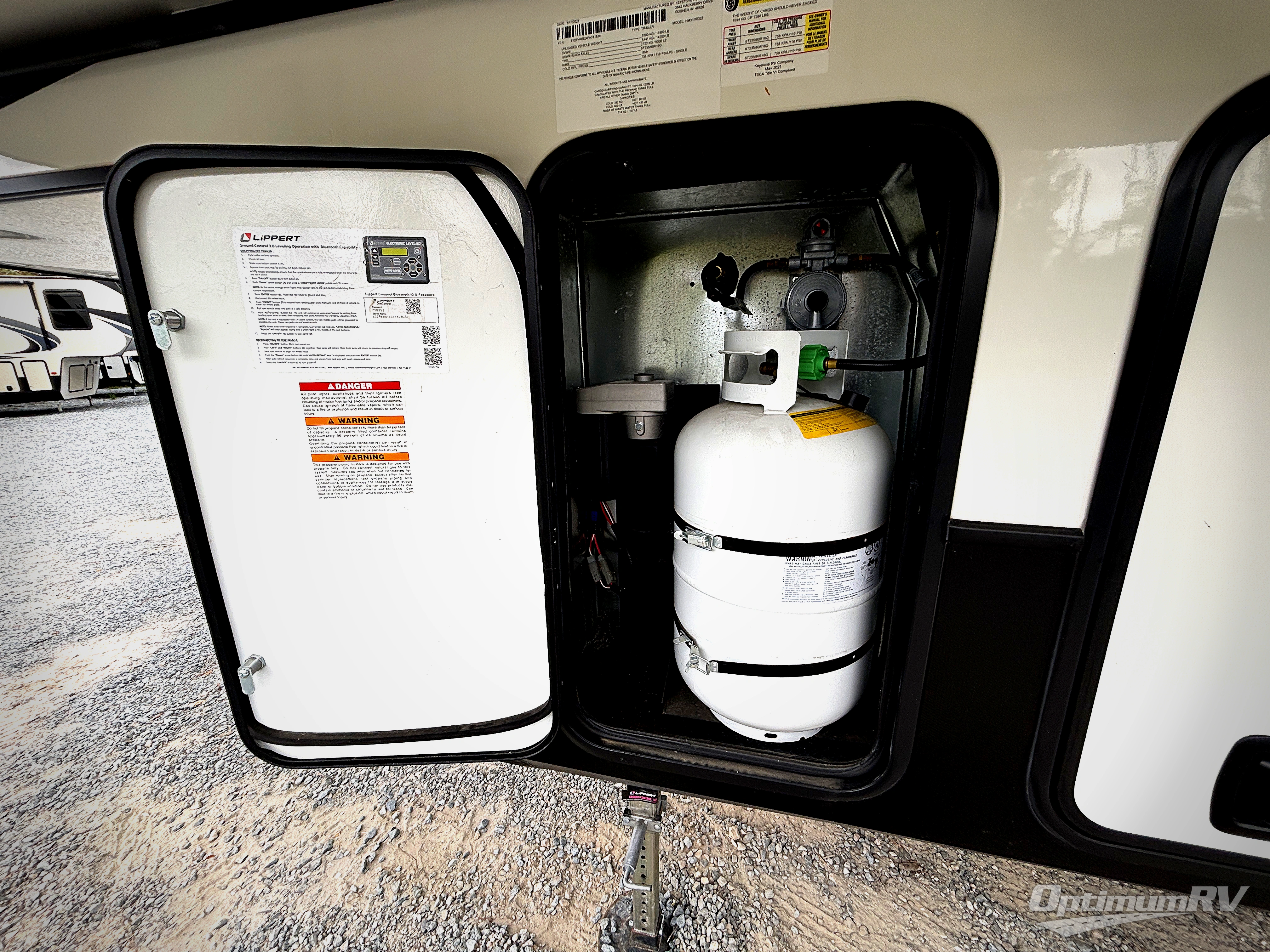 This couples coach will have you excited about traveling to all of your favorite places, and new locations too! The triple slide unit features an open concept living/dining area with dual opposing slides at the very back featuring a hide-a-bed sofa along the curbside, and an eating space opposite with a booth dinette or choose the optional free-standing table and chairs. Power theater seats will be a comfortable place to kick back for a movie, and you will love the all-new entertainment center design featuring a fireplace, Smart TV, and back-lit overhead cabinets. In the evening, head up to your private retreat with a spacious bath including dual entry doors from the hall at the top of the stairs or from within the private bedroom. Get cleaned up in the large radius shower with seat and snuggle up in a king bed slide. The bedroom slide also features a large wardrobe that has been prepped for a washer/dryer if you choose to add the convenience. You will find plenty more storage spaces for your clothing and belongings in the two dressers or dual wardrobes along the full front wall. Another bonus with this unit is the outdoor kitchen which gives you a choice to cook inside or out!