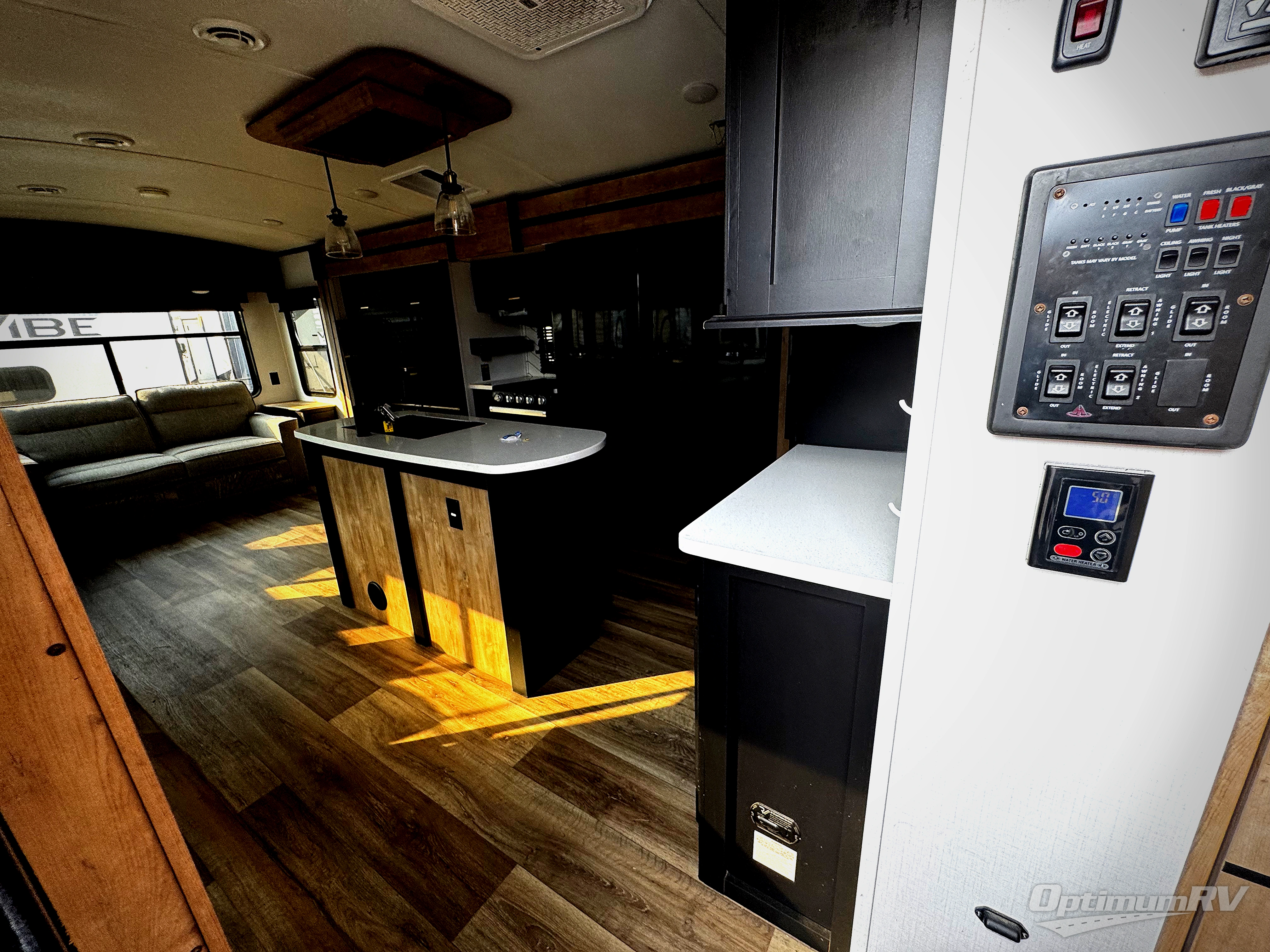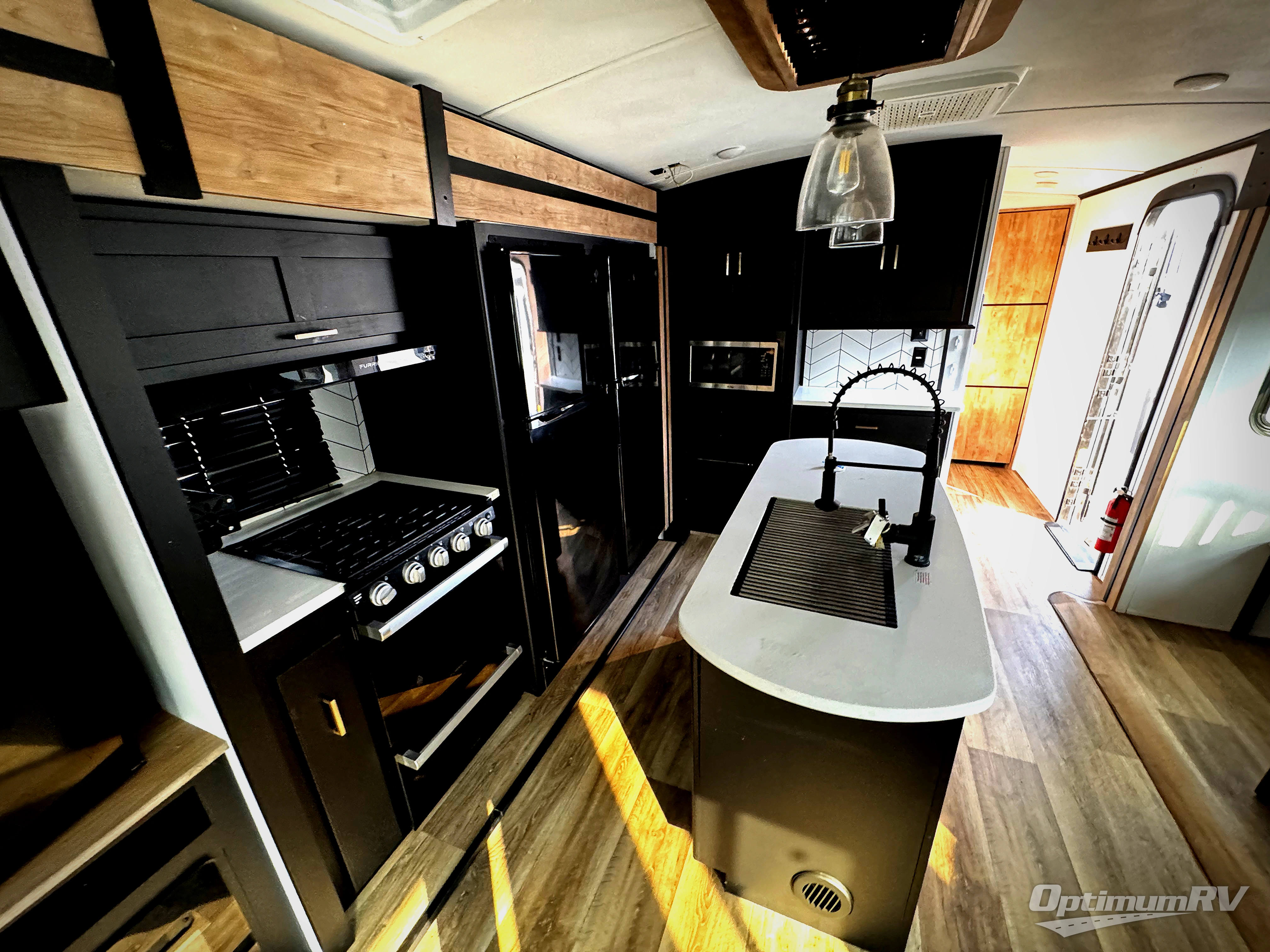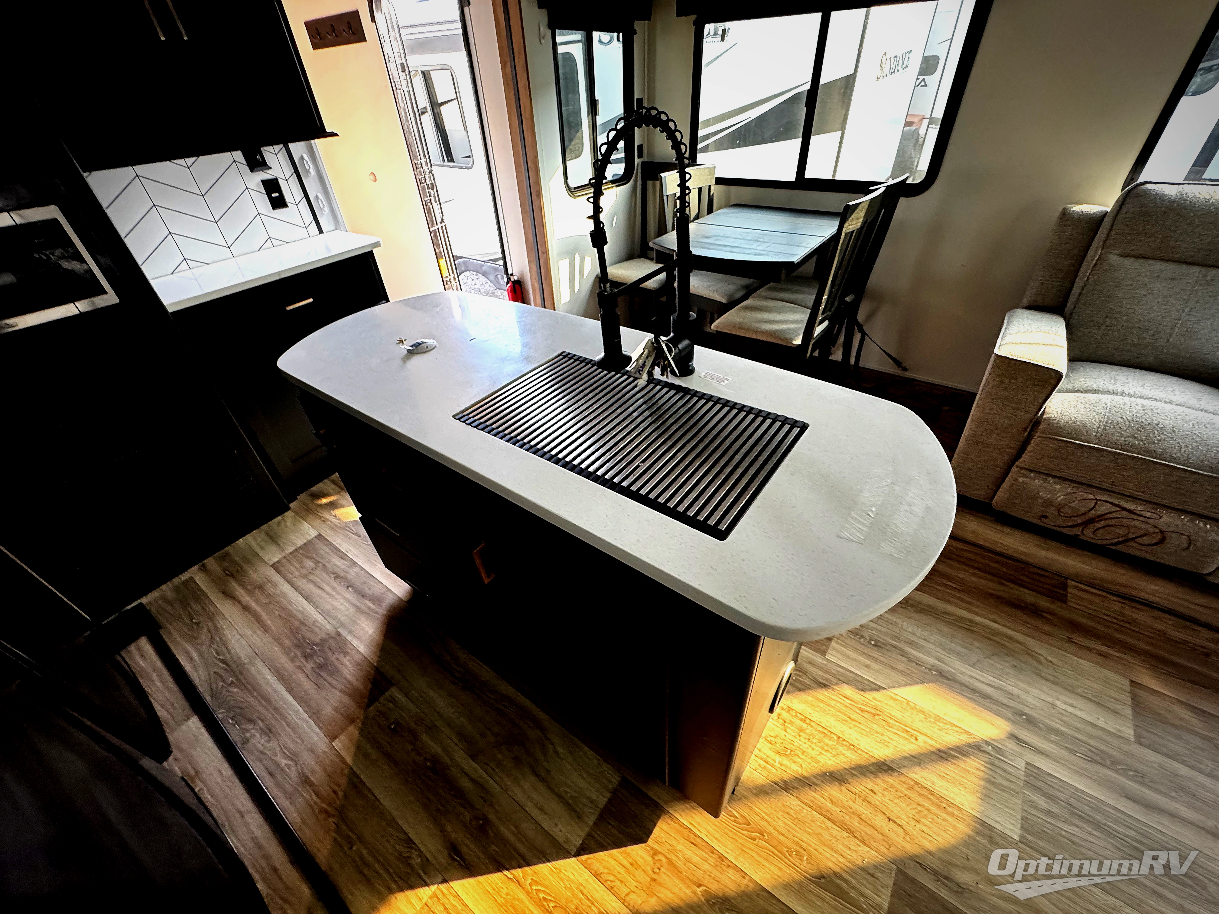 Whether you camp for inside comforts or outside adventures, this trailer will provide the comfort once you step inside. The rear living area has a sofa sleeper for guests, three slides throughout for maximum floor space, and two 10 cu. ft. refrigerators or choose the 8 cu. ft. option, so you can stock up on food, drinks and such for the longer stays. The kitchen island offers a skylight for natural lighting, and full amenities including extra counter space for serving meals. There is a 50" HDTV and fireplace to enjoy, theater seats, and a booth dinette or choose a table and chairs option in its place. The full bathroom allows entrance through the hallway or the front bedroom, and the bedroom offers a king bed, front wardrobe, a washer/dryer prepped space, and more storage.