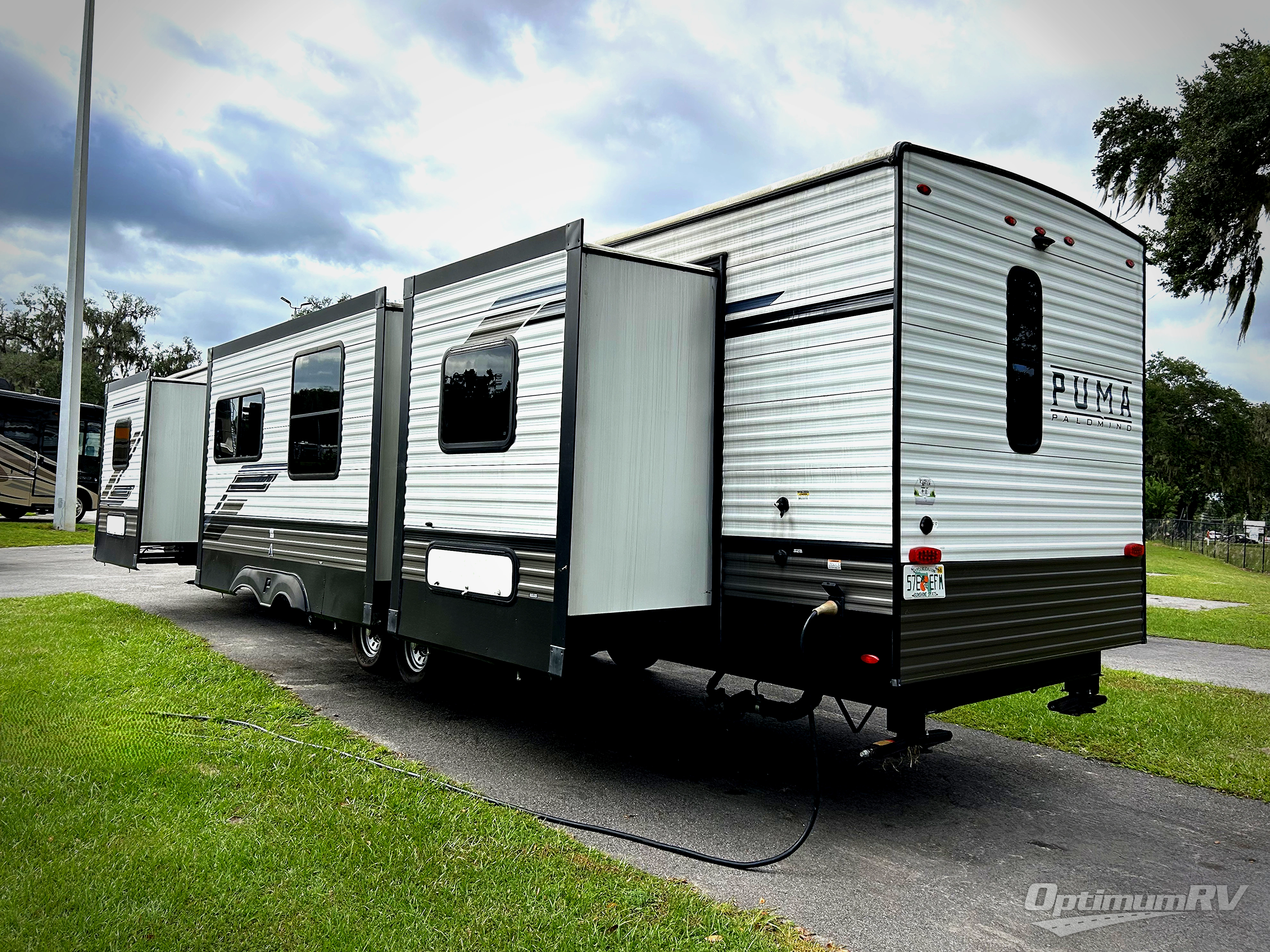 Get out of town and start enjoying the beautiful weather and scenery where you have chosen to place this Puma Destination. This spacious trailer has three slide outs for lots of interior floor space, plus two entries for convenience. The front bedroom offers a king bed slide, two closets, and a dresser. The rear bedroom suite includes a full bathroom and a queen bed slide, a vanity and a wardrobe. In between you can relax in the combined living and kitchen area on the sofa or booth dinette while visiting with the cook with full amenities.