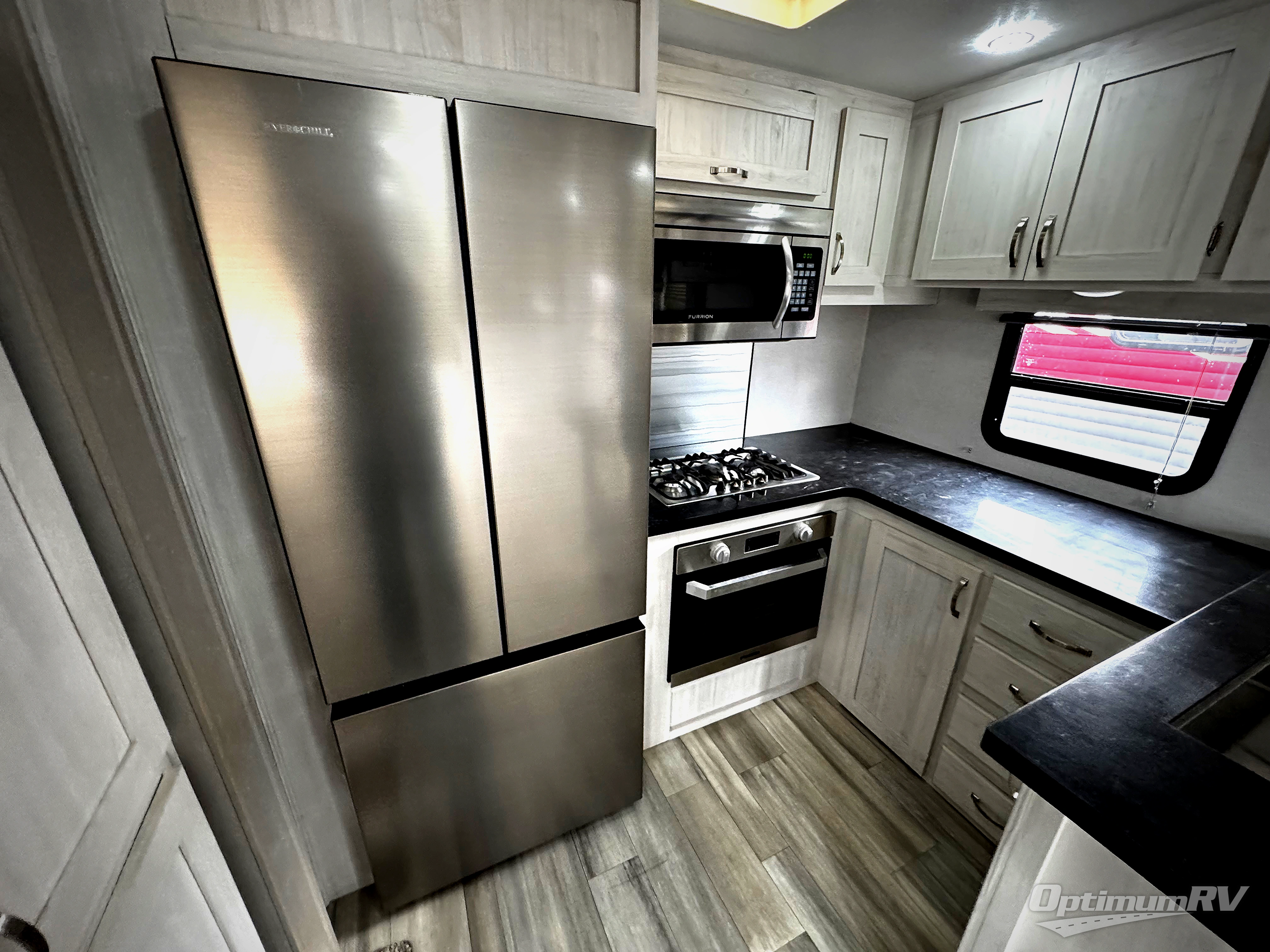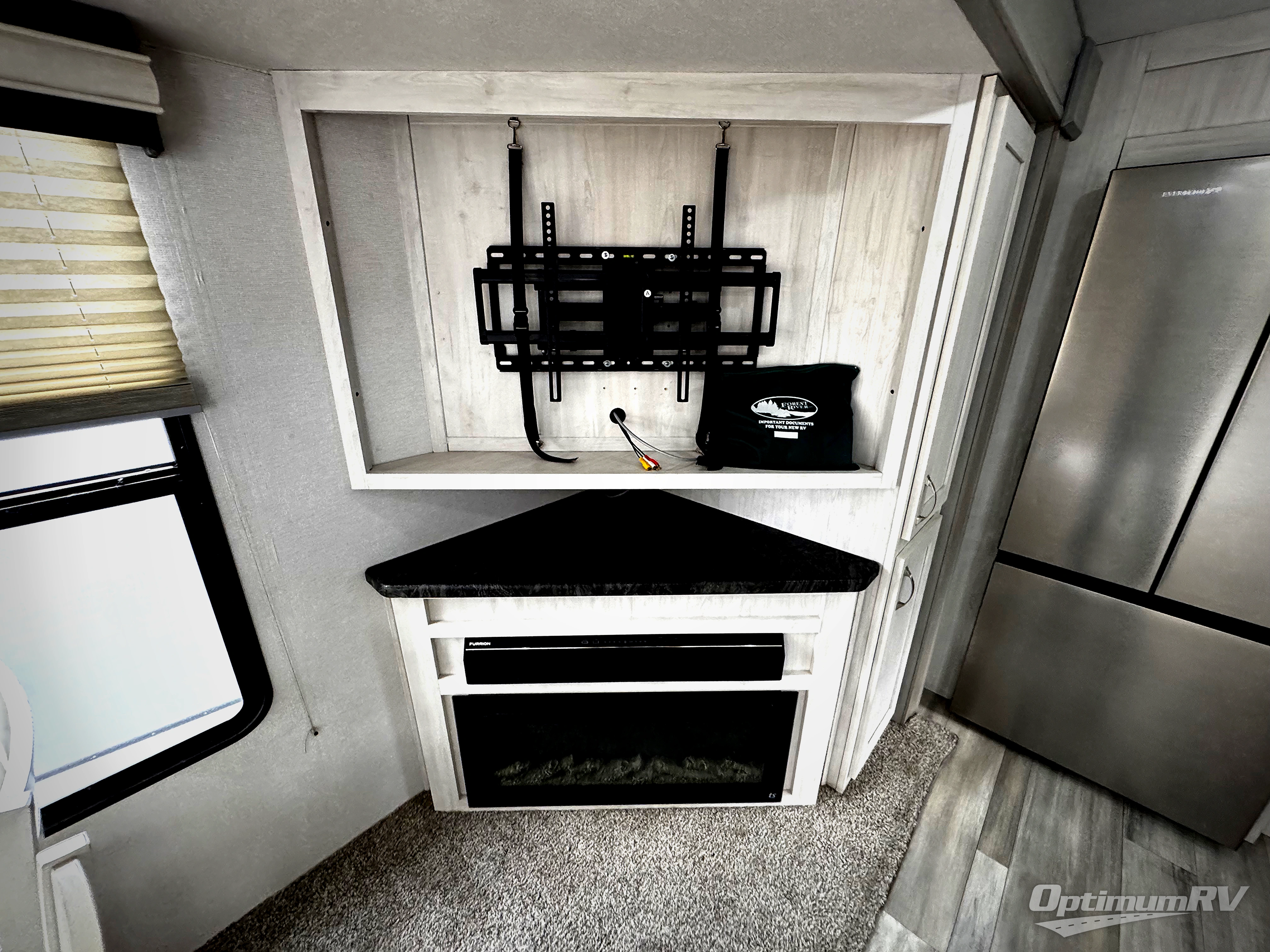 You will be ultra impressed by this LaCrosse travel trailer! First, the interior is made to feel just like your own home with its theater seating, hide-a-bed sofa, free-standing table with chairs, and entertainment center with 50" LED TV and fireplace. Second, you'll find even more residential comfort in the rear kitchen that has a Furrion residential cooktop, a 30" microwave oven, and a 10.7-cubic foot refrigerator. And lastly, the walk-through bathroom has two doors on either side with one of those doors leading directly into the front private bedroom, so you know you'll enjoy great comfort in this space each night. There is also a bedroom bench at the front of this trailer which gives you an enjoyable place to relax as you take in the views from the front windshield.