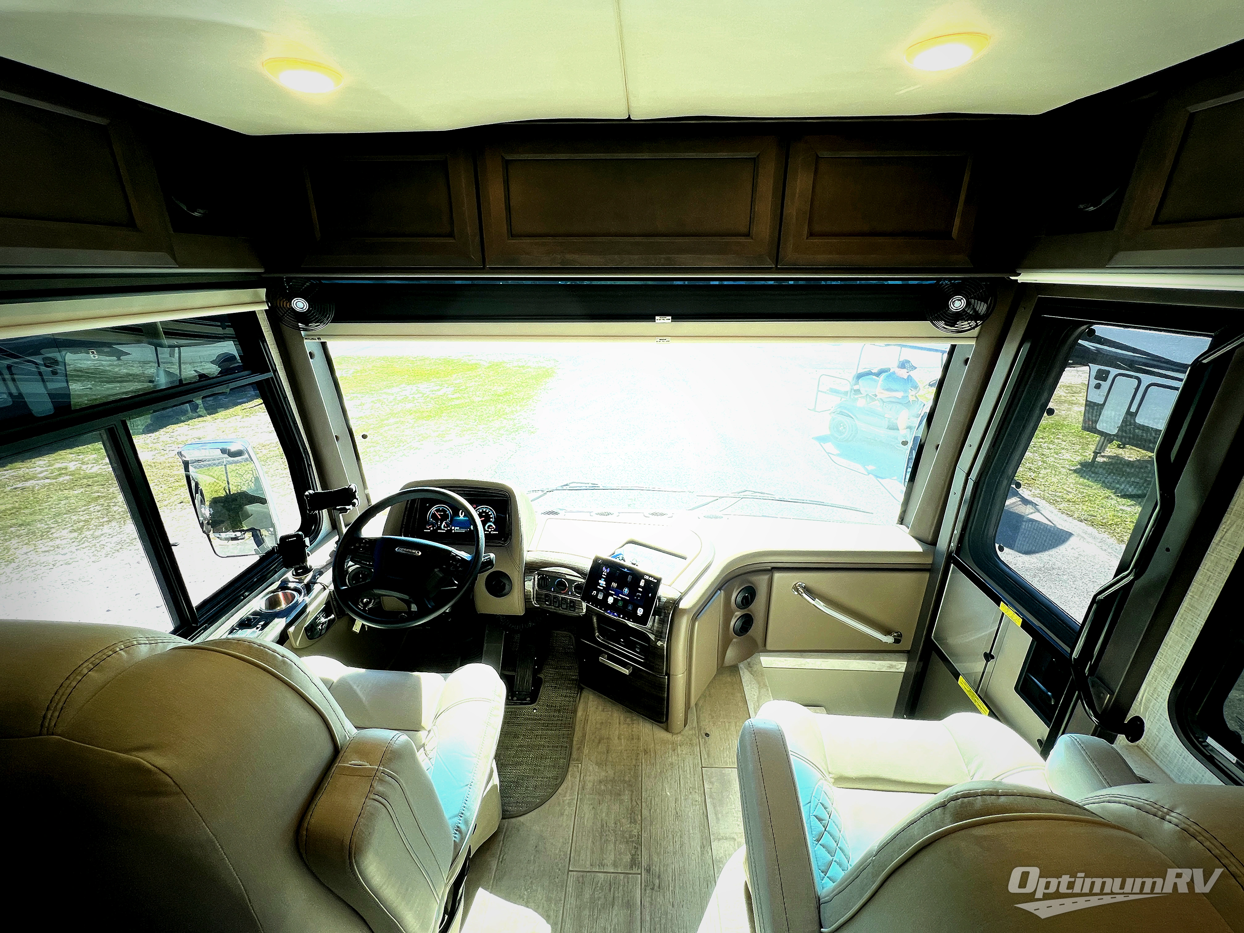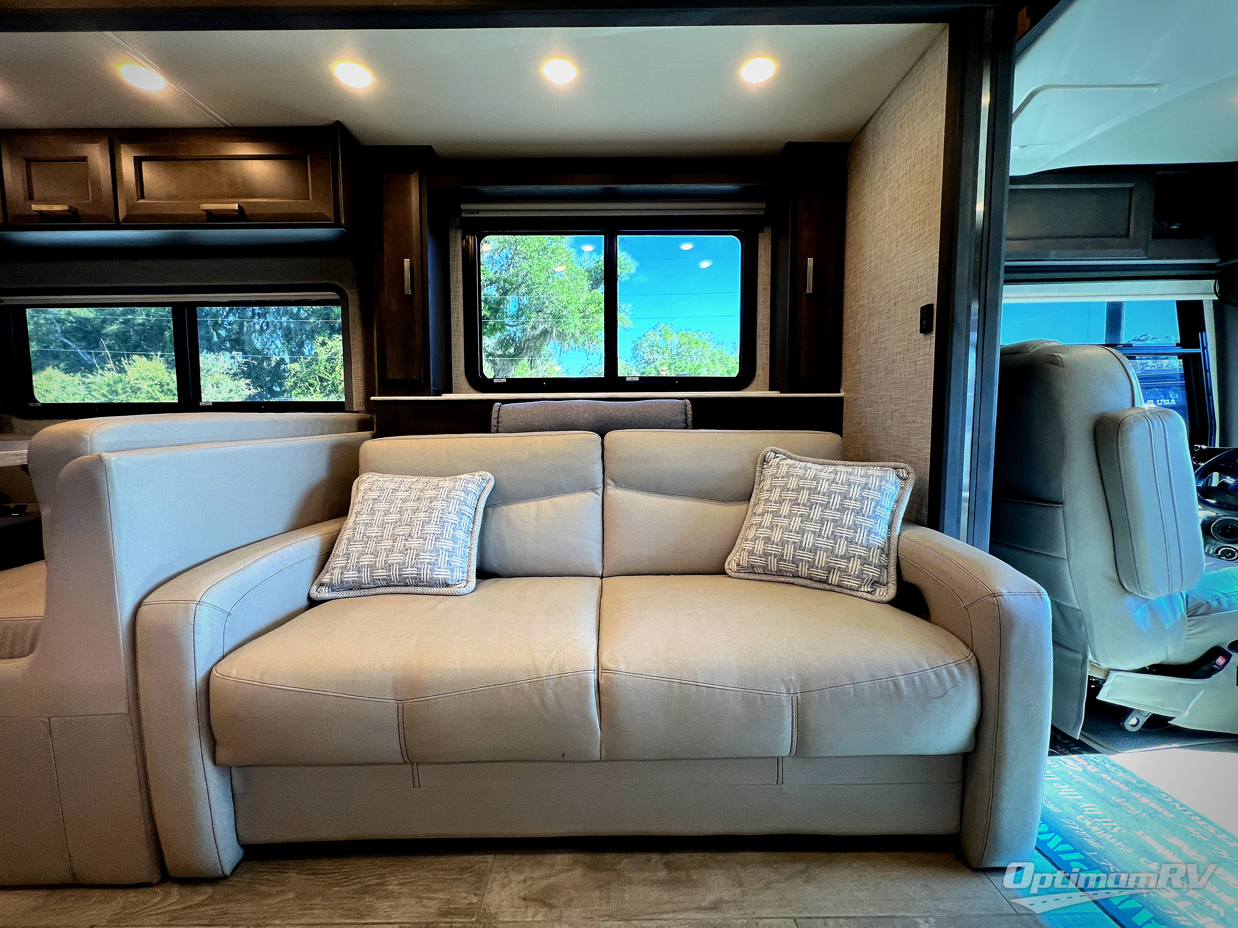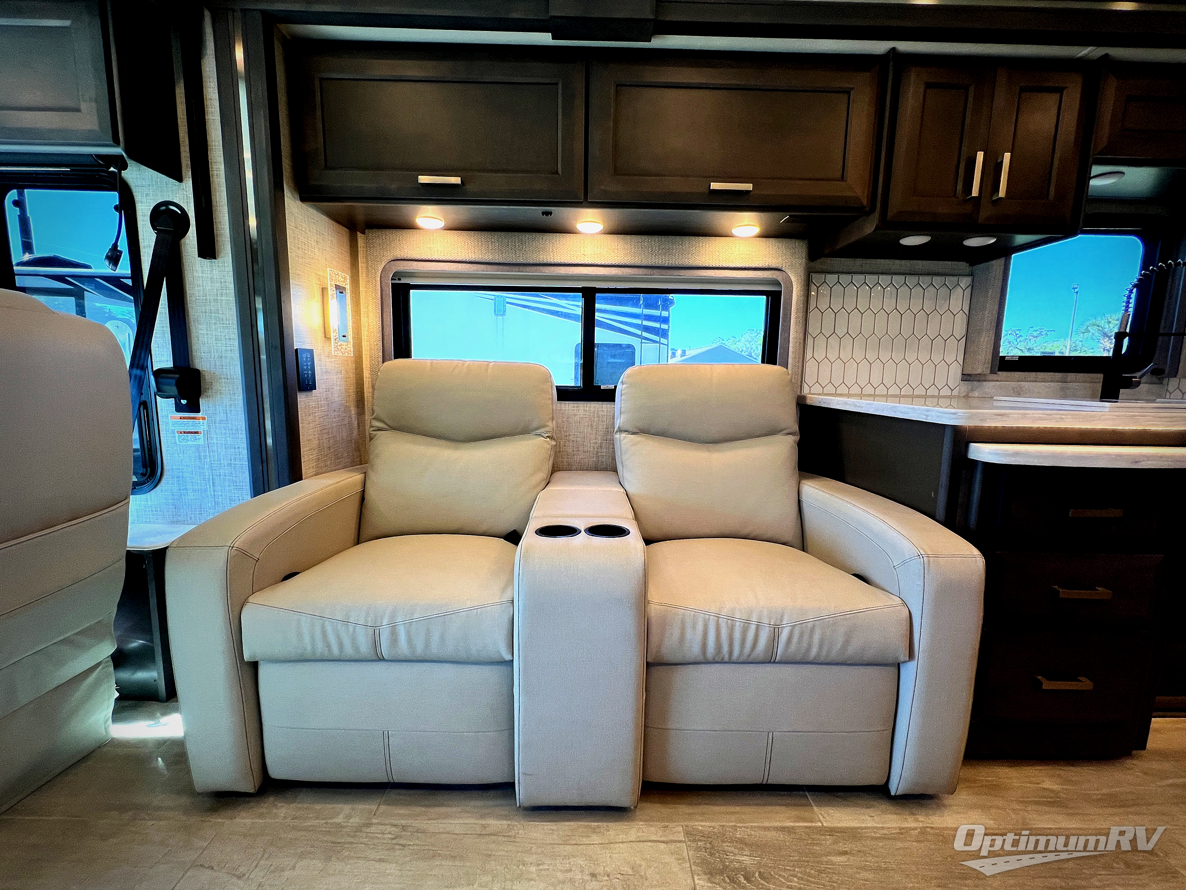 With any Aria Class A diesel motorhome by Thor Motor Coach, experience RV living with all the luxurious amenities you are accustom to, command the roadways with improved handling from the l-beam front axle with a 55-degree wheel cut, and enjoy a smooth ride thanks to the Air-Ride suspension and Sachs shock absorbers. The driver will also appreciate the 10.1" touchscreen dash radio with Bluetooth, navigation, and Sirius/XM prep when navigating the roads, and the comfort of the leatherette reclining/swivel adjustable captain's chairs. The bathroom provides an oversized full height shower with a glass door and a designer backsplash, while the kitchen provides solid surface countertops and a dinette. You'll also enjoy designer tile backsplash, a large double bowl stainless steel sink with a single handle faucet, a pull-down sprayer, plus full kitchen amenities. More standout features include the Studio Collection cabinetry with rake style doors and matte finish, living room pin-up lights, and polished porcelain tile flooring, plus much much more depending on the Aria you take on the road!