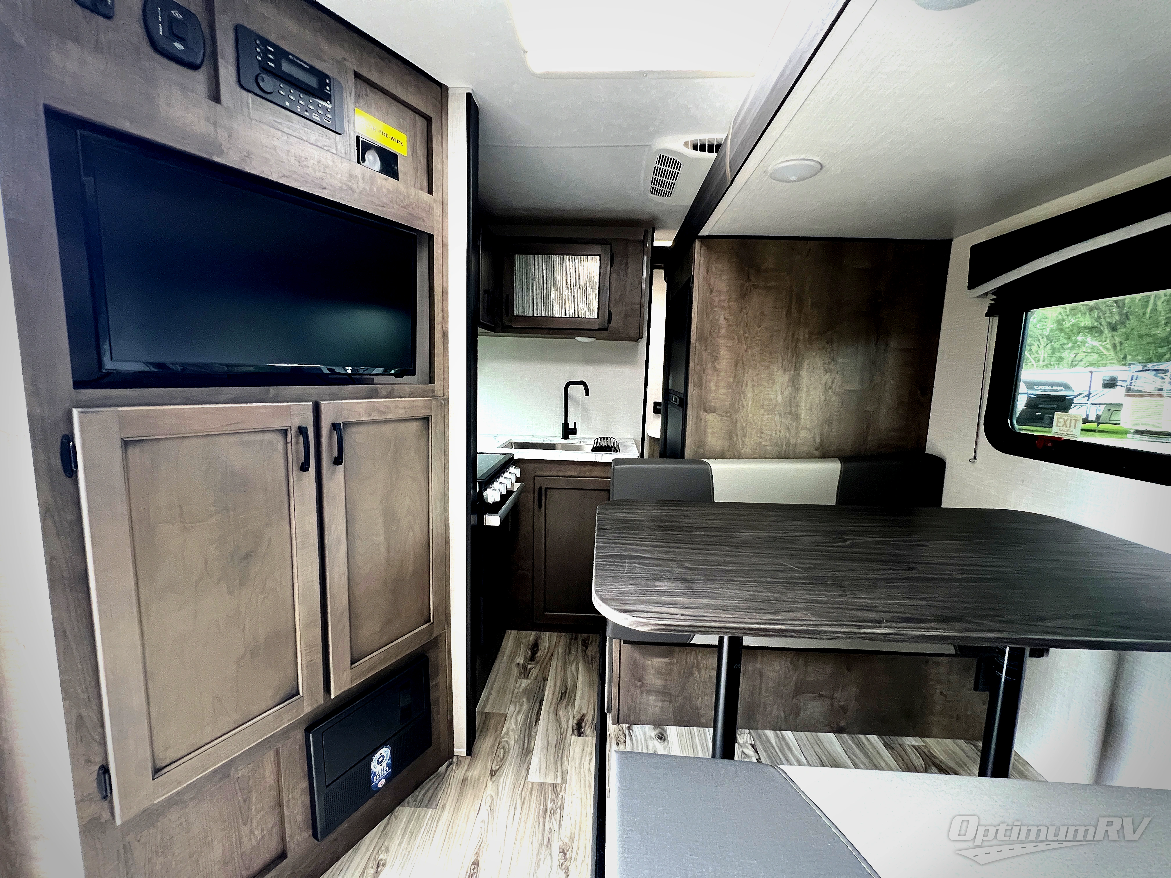 You will enjoy relaxing outside and inside with a 17' power awning that provides an outdoor living area protected from the elements, just add your camping chairs that are stowed away in the rear pass-through storage with motion-activated light, and the interior provides a 64" jiffy sofa up front and a booth dinette. Both of these furnishings offer sleeping space for family and friends when you are ready to call it a night. The L-shaped counter in the kitchen area provides a large sink and a three-burner range, and the 8 cu. ft. refrigerator is within the slide out. Easily access the walk-through bath from this area as well as the rear private bedroom which offers an RV queen bed, dual wardrobes, windows and StorMore bedside nightstands with a 110V outlet and USB charging.