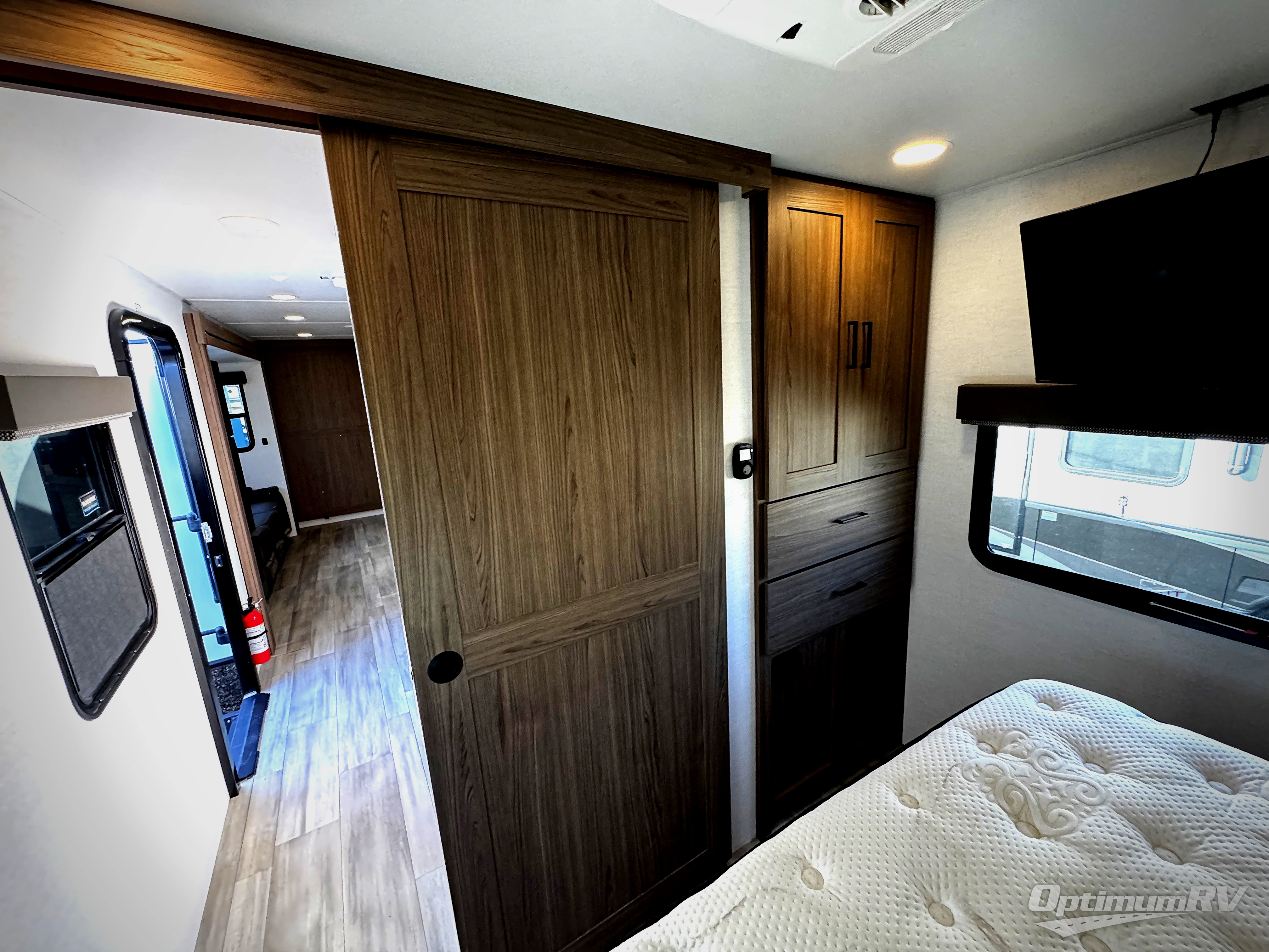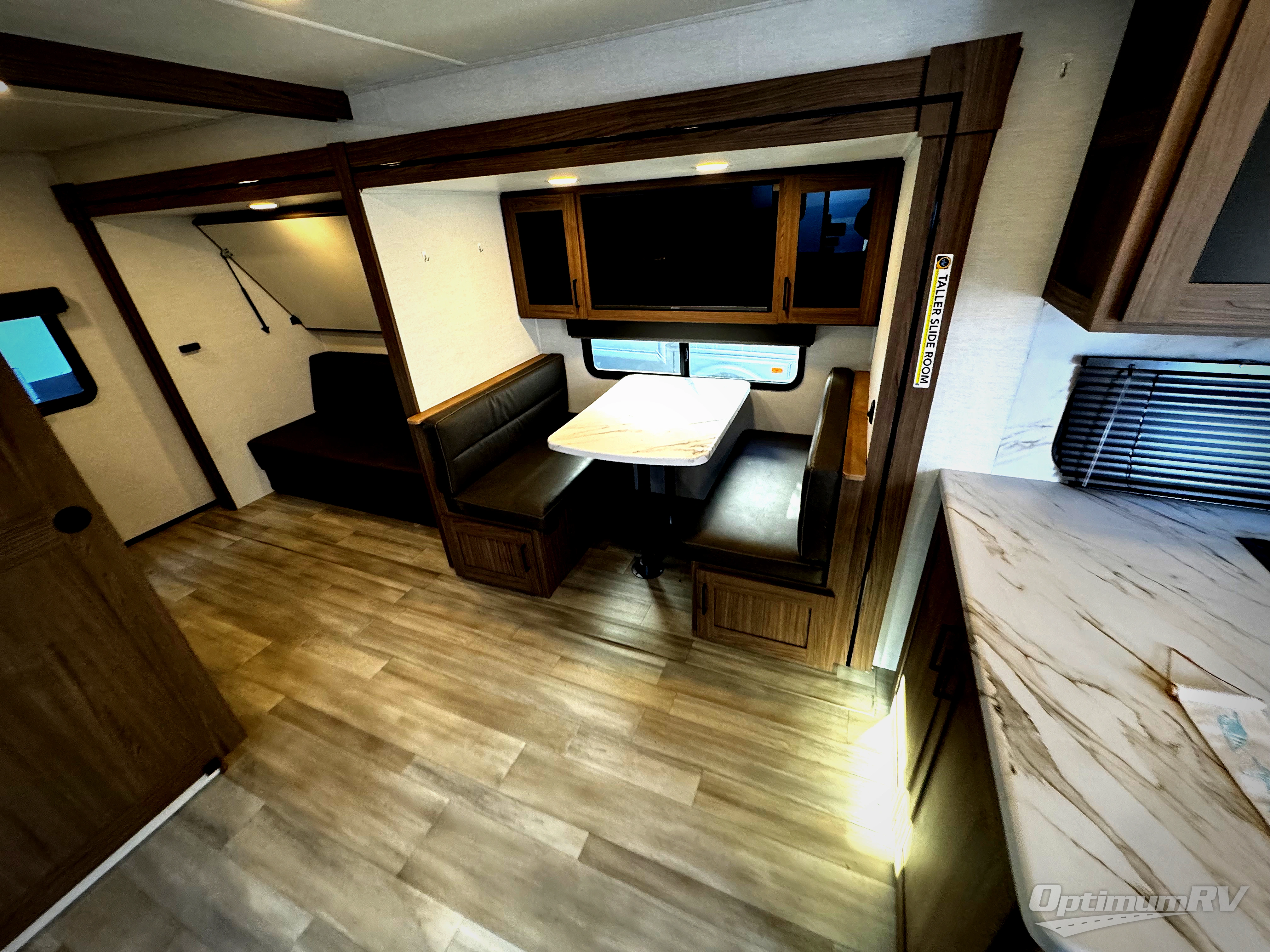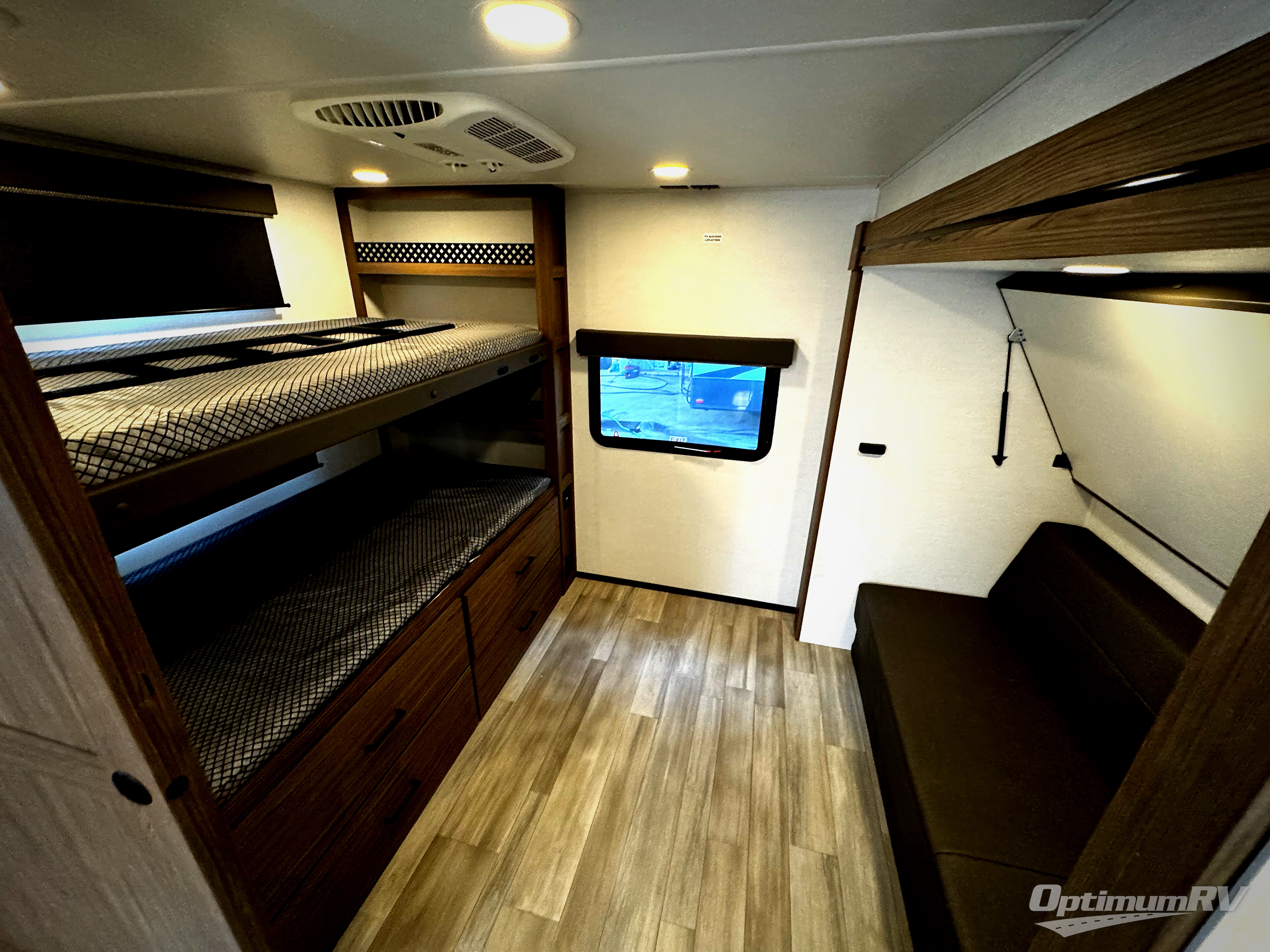 Enjoy glamping in this spacious travel trailer for eight! Your guests or the kids will love the rear bunkhouse with 40" x 72" bunk beds across from a third bunk with a cube sofa below, and the slide out will make this space more open. The slide out also includes the booth dinette in the main living area, which is across from the sofa slide out. The chef will love cooking in this Delta kitchen with generous counter space, a 10 cu. ft. 12V refrigerator, plus pull-out pantry trays for dry goods and snacks. The full bath with a 30" x 36" shower and a soft close porcelain foot flush toilet will allow you to fresh up each day without having to use the camp's facilities. And don't overlook the front private bedroom with a queen bed, wardrobe nightstands, a third wardrobe plus overhead storage; now nothing has to get left behind!