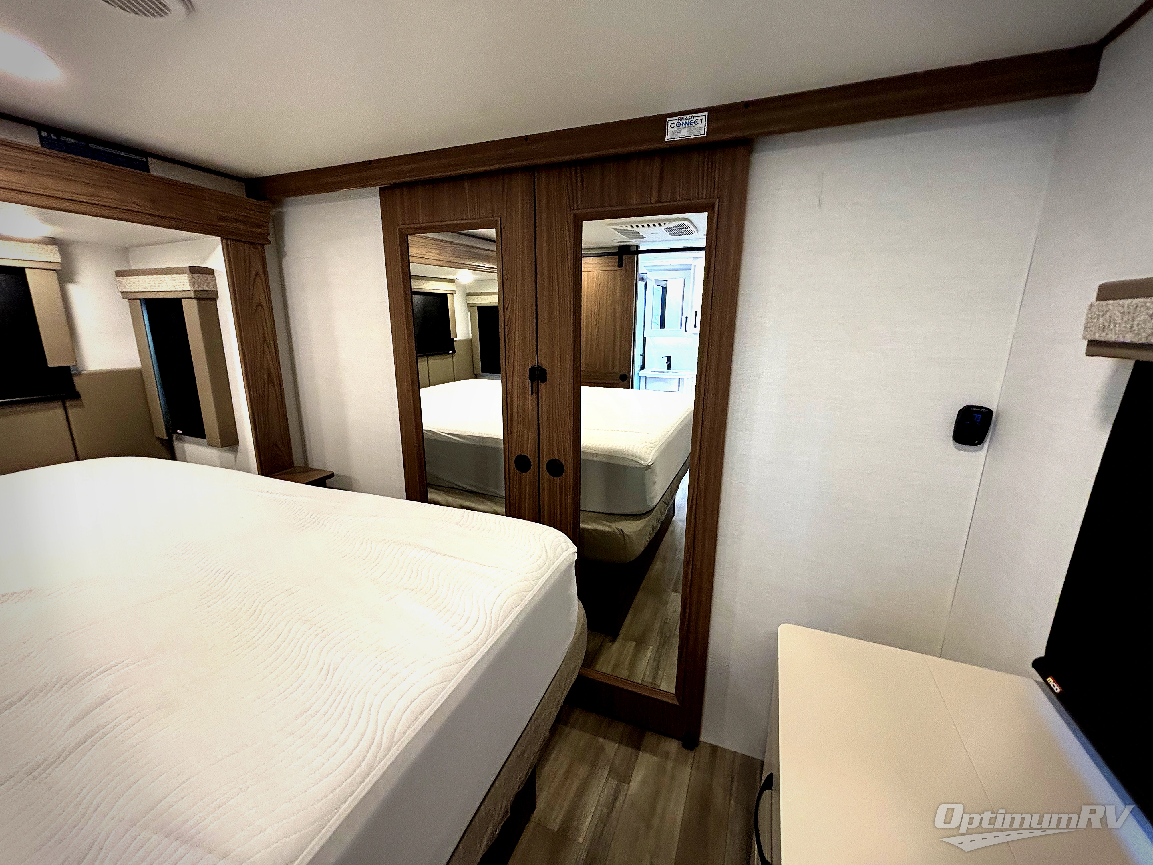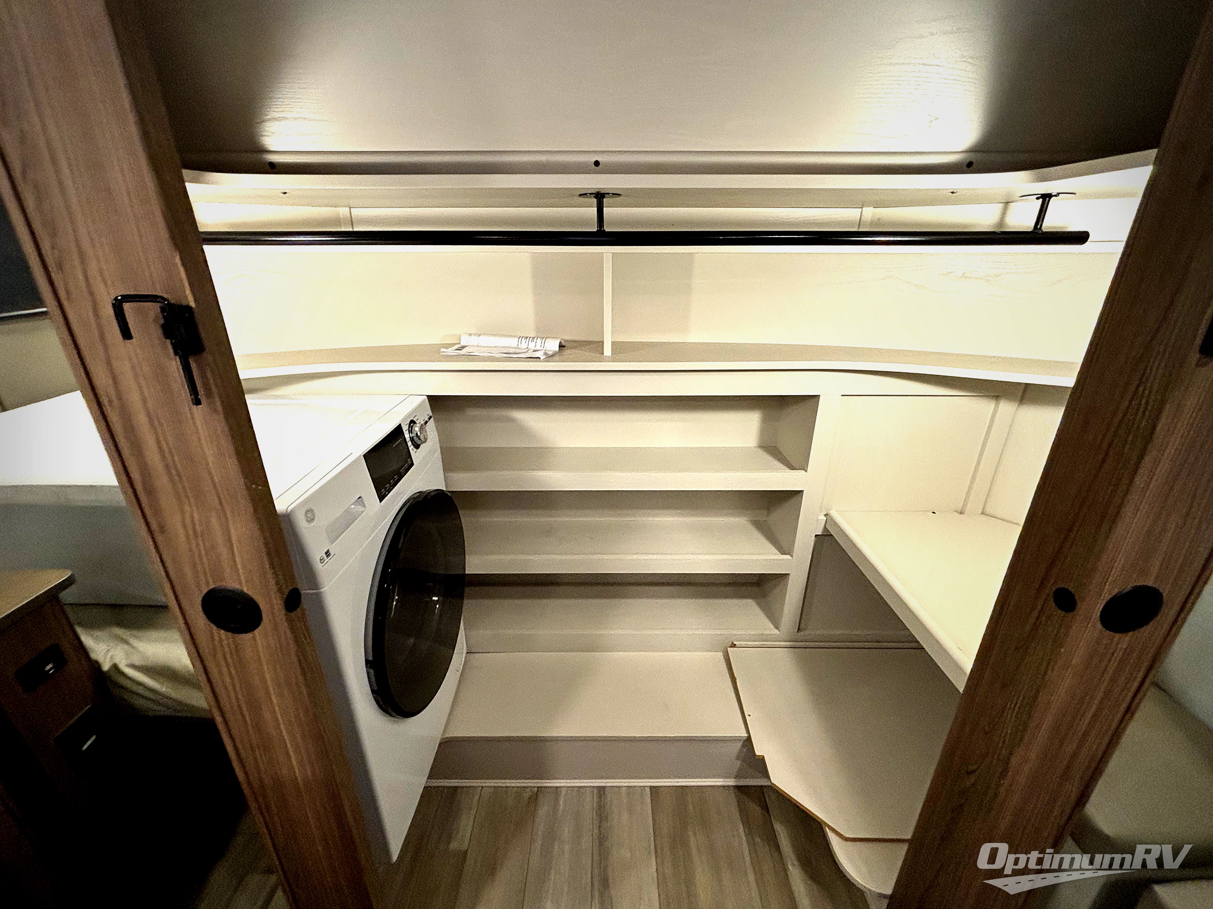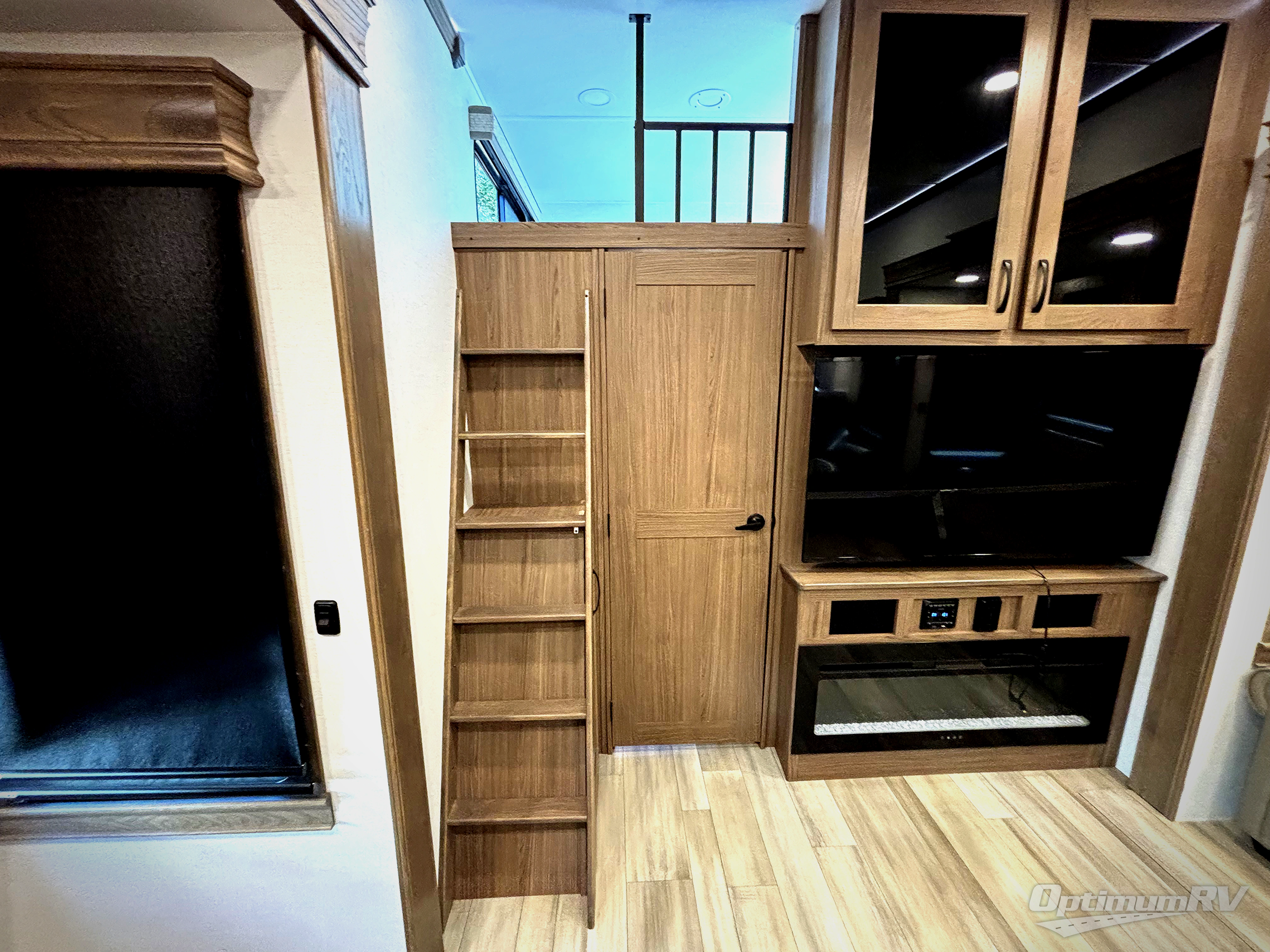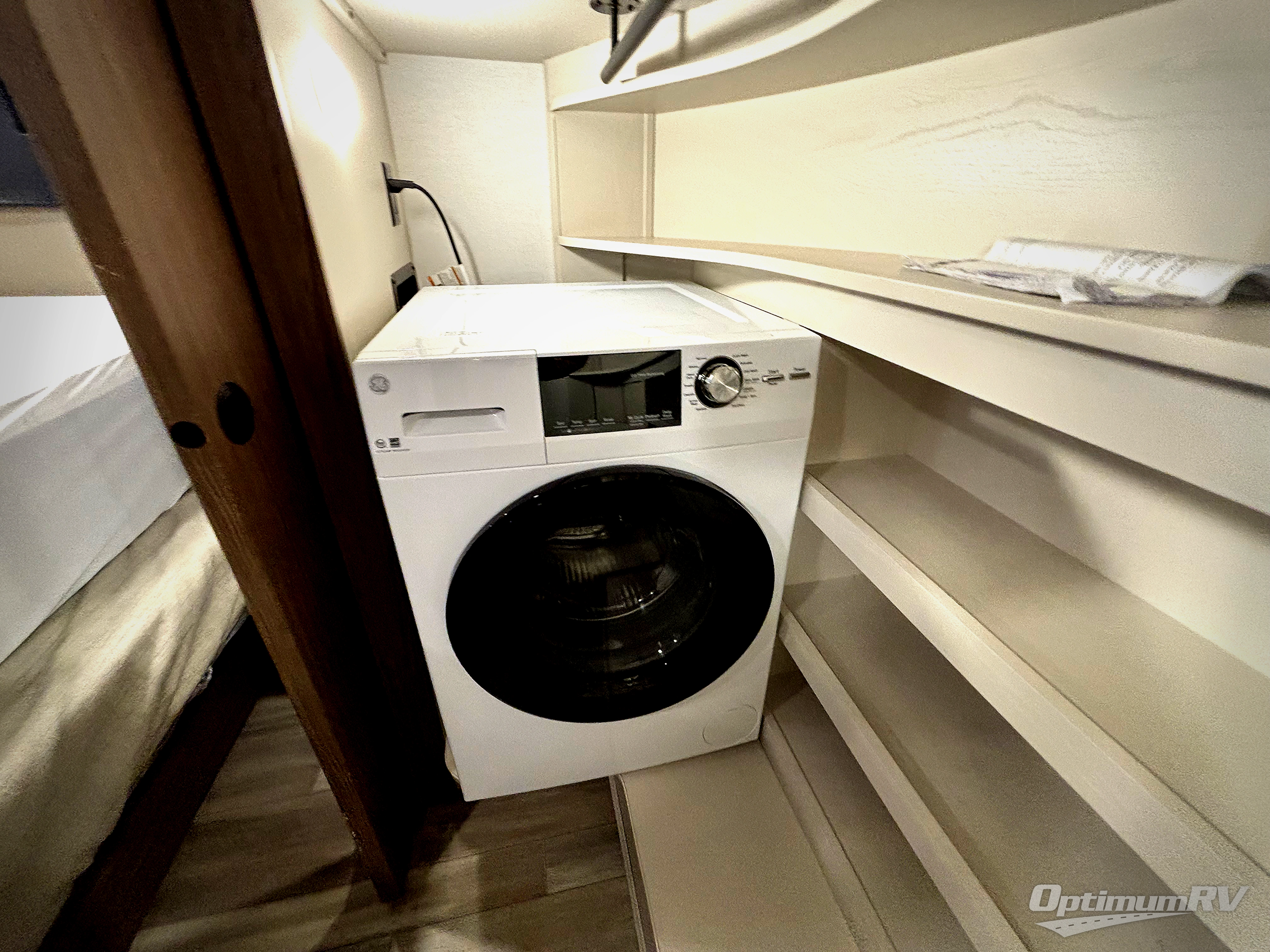 A spacious unit with sleeping for eight with plenty of choices to suit everyone! There is a front private bedroom with a king size bed that offers a large full front closet that has also been prepped for a washer and dryer if you choose that option. The front bath features a 40" x 30" shower and dual entry. Head down to the kitchen and living space at the bottom of the stairs to find a curbside slide that houses the 19 cu. ft. residential refrigerator, a pantry, and a dinette with four chairs. As you continue on toward the rear of this coach, you will find a spacious living area along the roadside with a 50" Smart TV and a fireplace, a sofa sleeper slide, and a dual reclining loveseat. This makes a great gathering place for television watching, game playing, and even added sleeping space if needed at night. The rear private bedroom with its own private bath features a queen bed, two closets, and a Smart TV as well. The multipurpose loft area above can be accessed just before this rear bedroom entry by a ladder, and it is perfect for extra storage, or it can be used for added sleeping that the kiddos are sure to love.