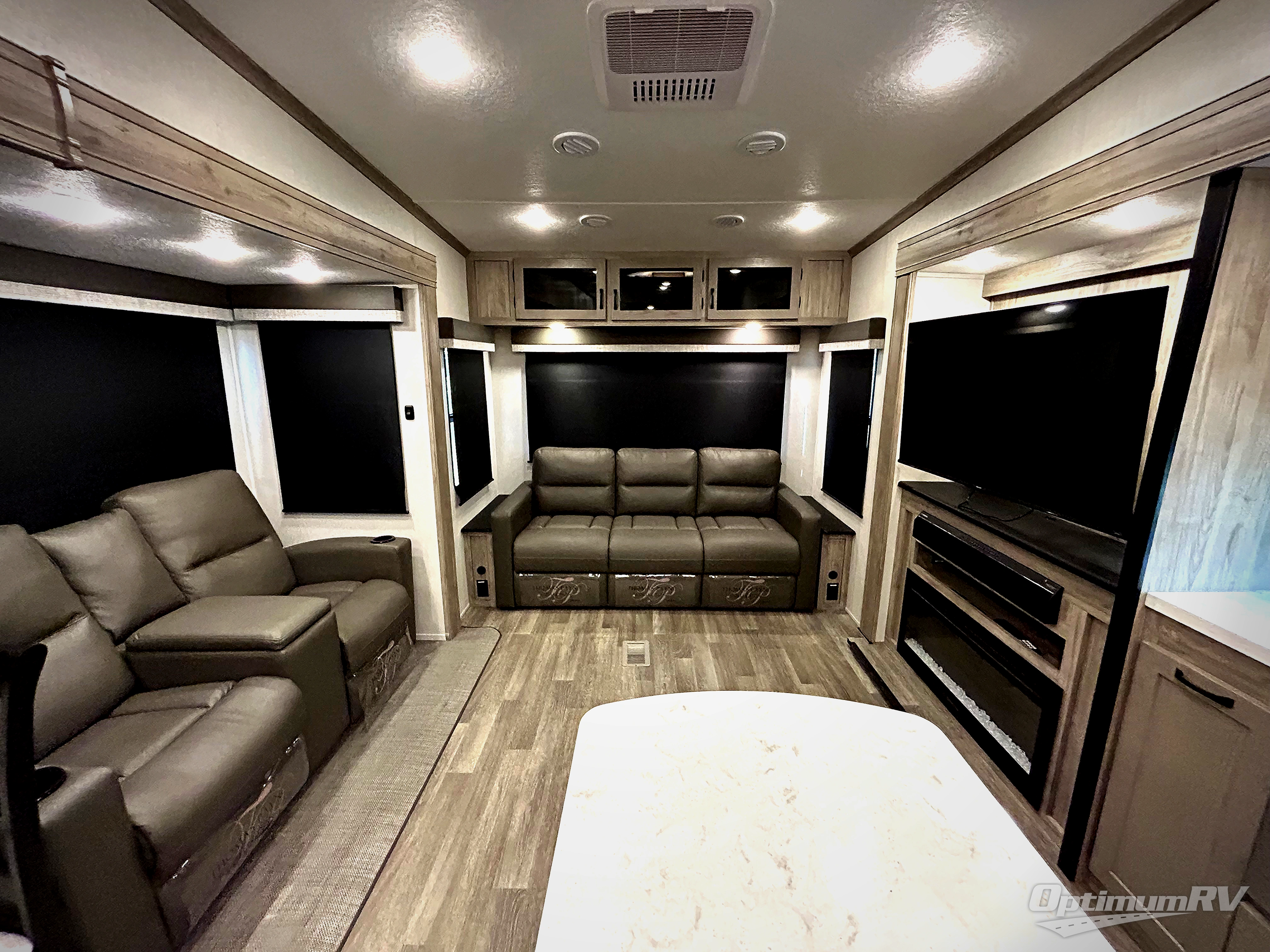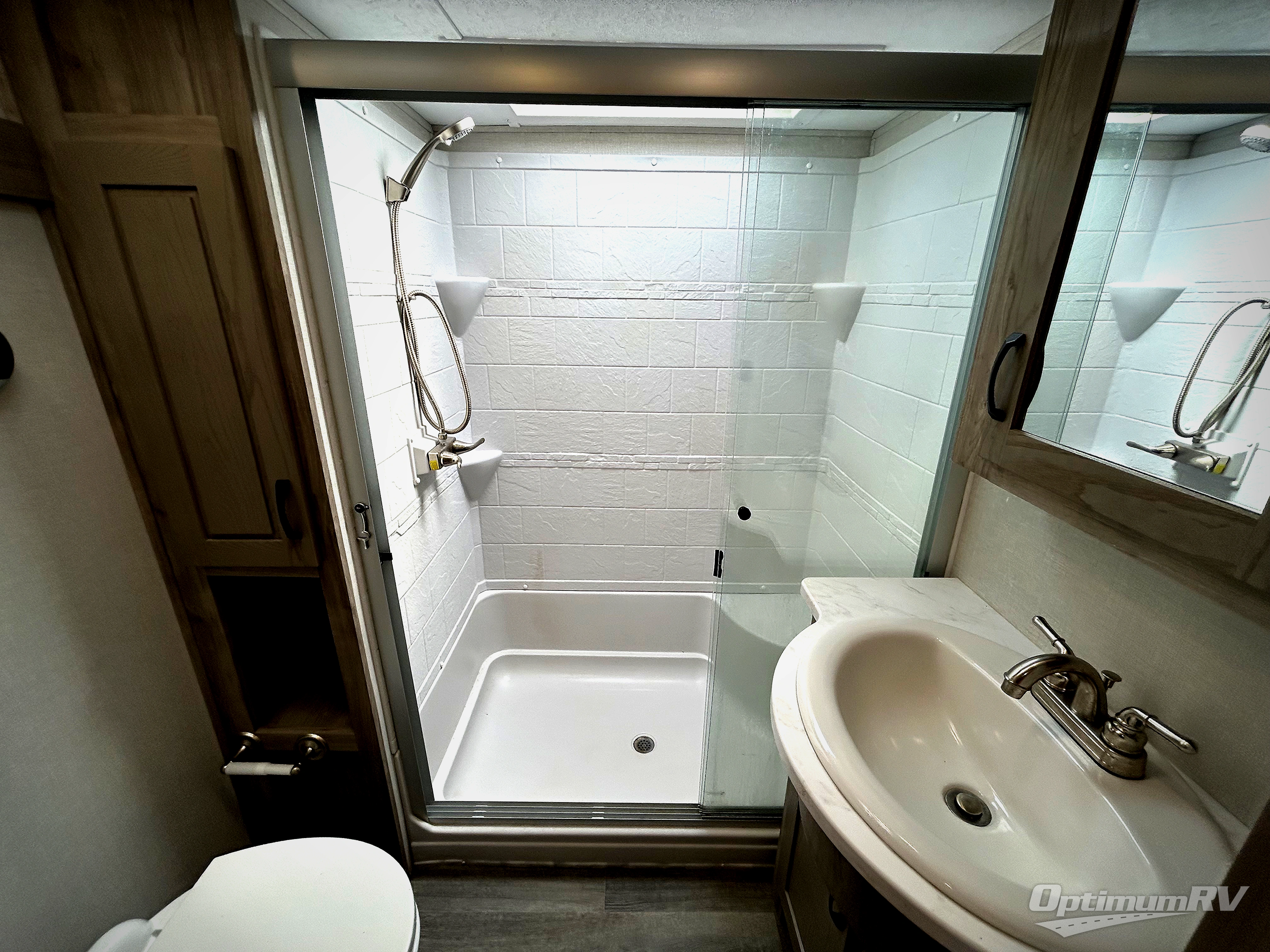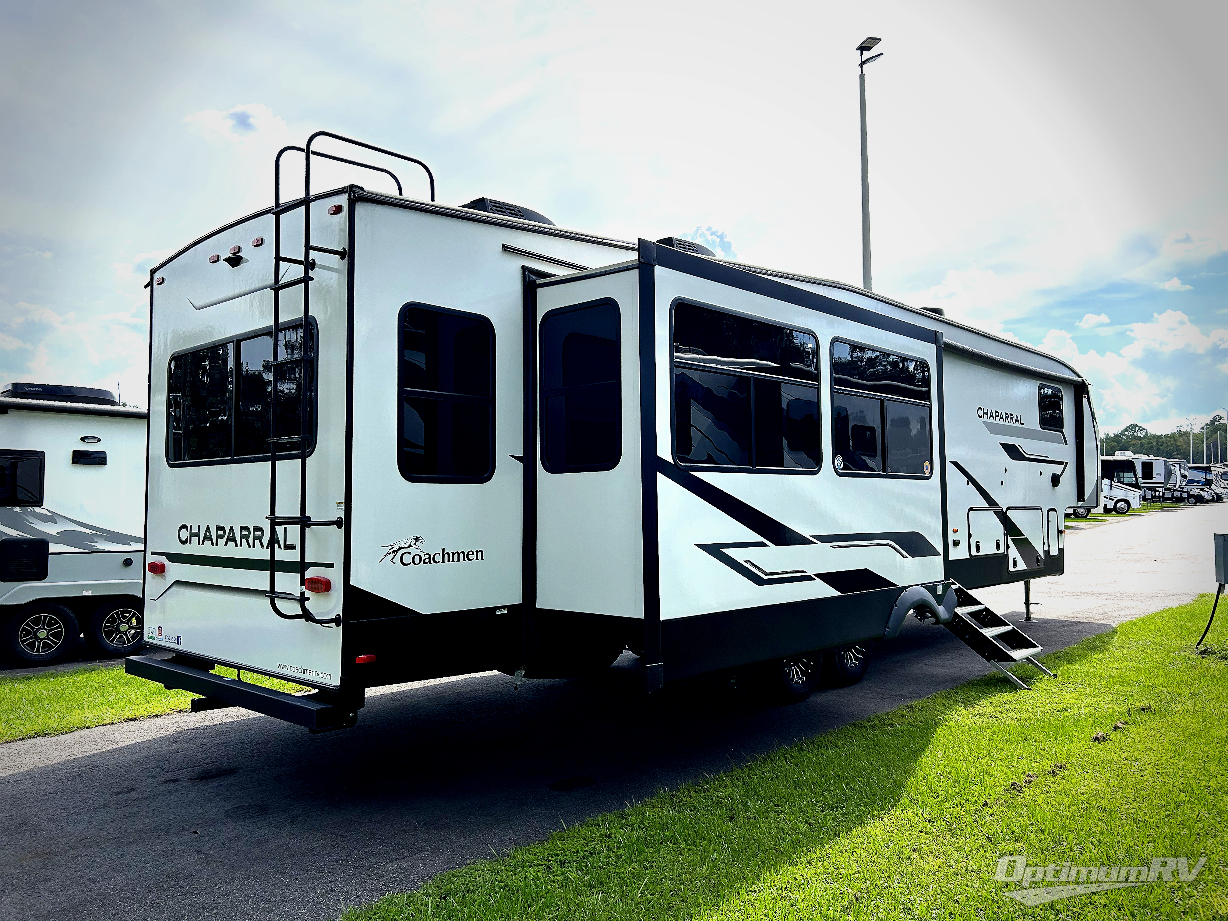 Each Chaparral mid-profile fifth wheel by Coachmen is designed with residential features, loads of storage space, and roomy bedroom suites to make you feel right at home. The durable construction means you can enjoy your RV for years to come. There's 6X double Azdel aluminum cage sidewall system, Weather Shield+ technology, and Tri-Tex powder coated frame technology that will allow you to camp year around. Each model includes a Winegard Air 360 HDTV/radio dome antenna and an AM/FM stereo with Bluetooth and USB ports to keep you entertained, plus roller night shades and a modern electric fireplace to make your space cozy. There is also a large transom window in the kitchen, a modern high-rise faucet, LED motion sensor lights in the bathroom, plus a full-size shower with glass doors and a seat. Now that's what I call luxury! Choose a Chaparral fifth wheel today!