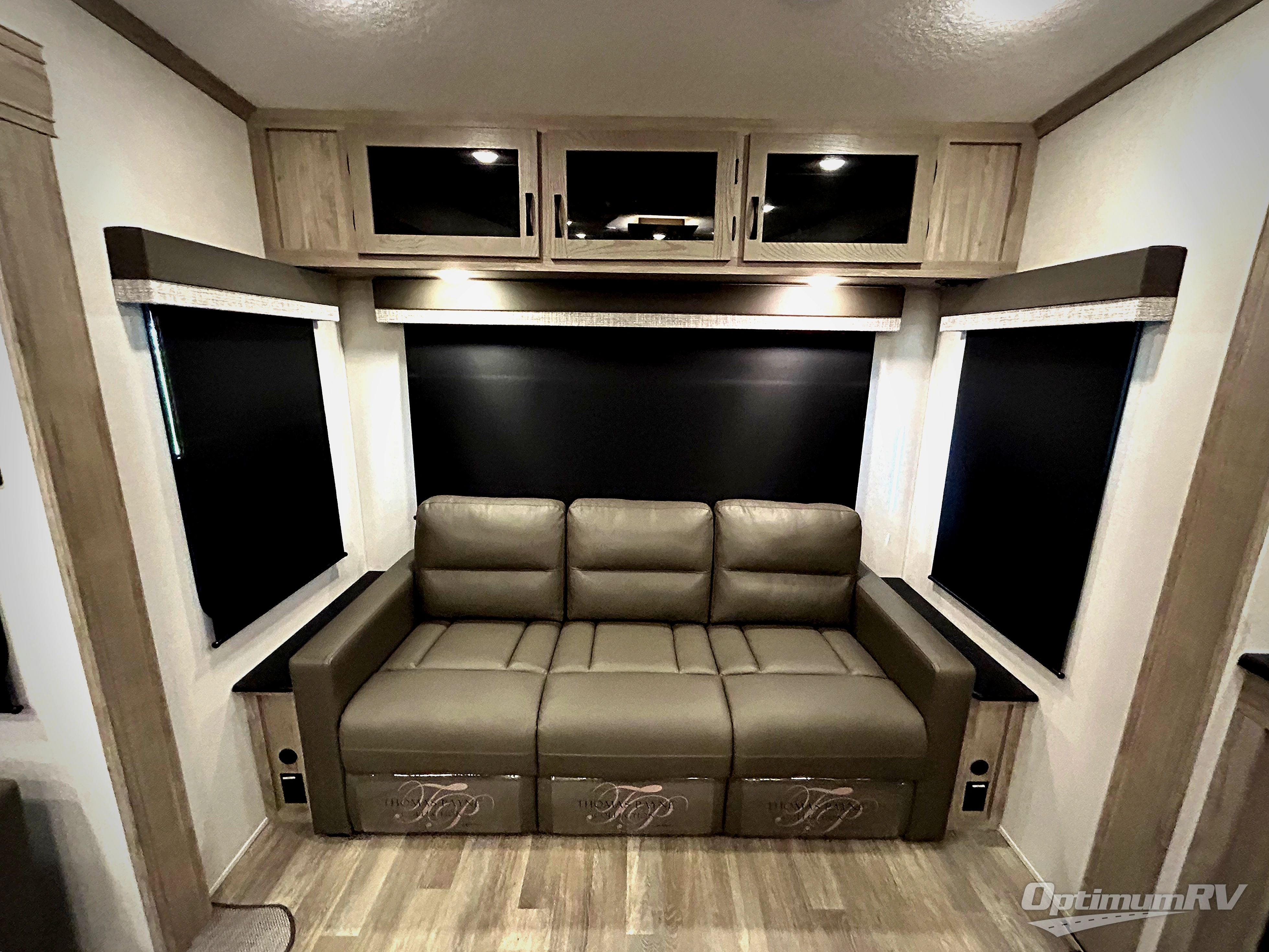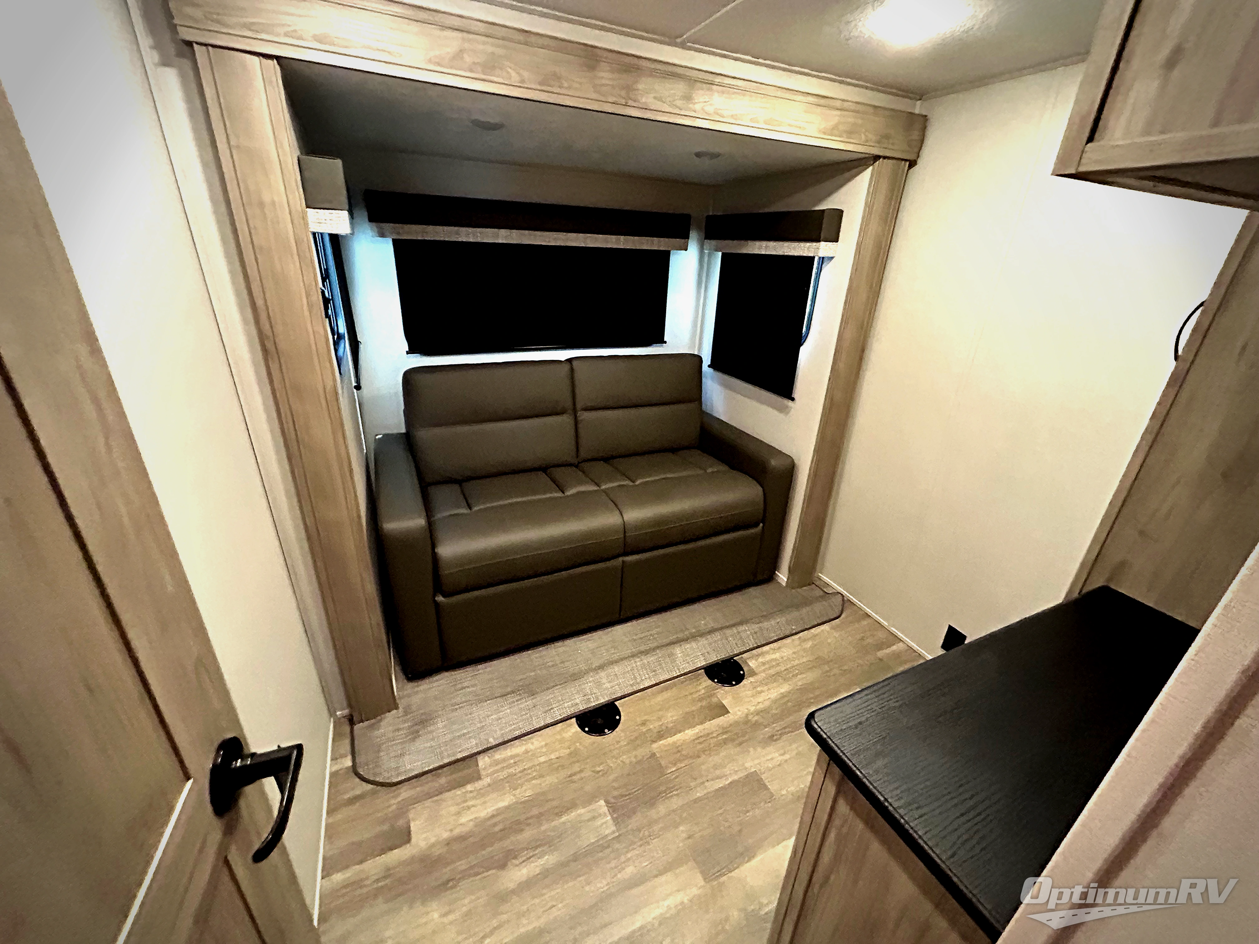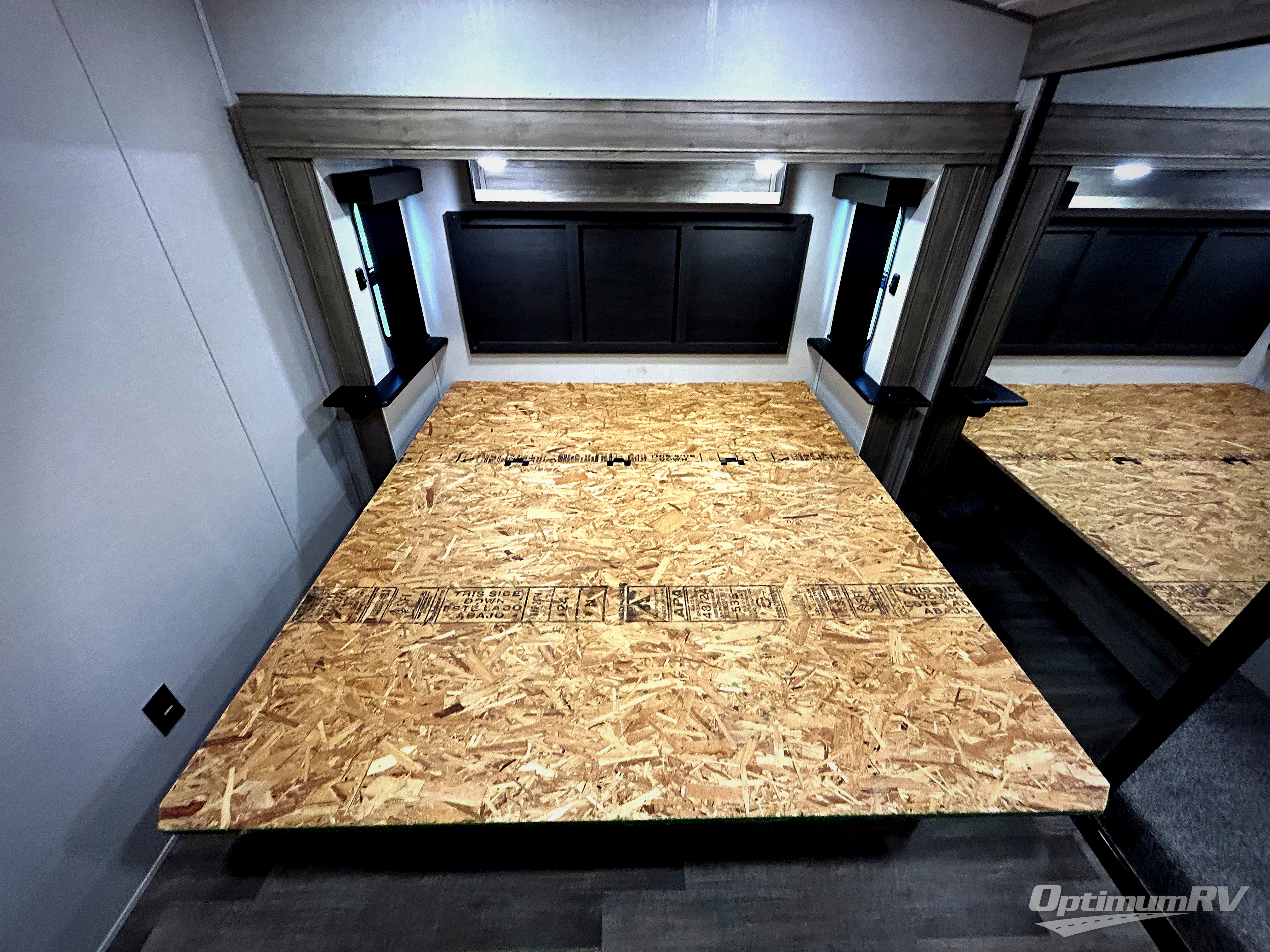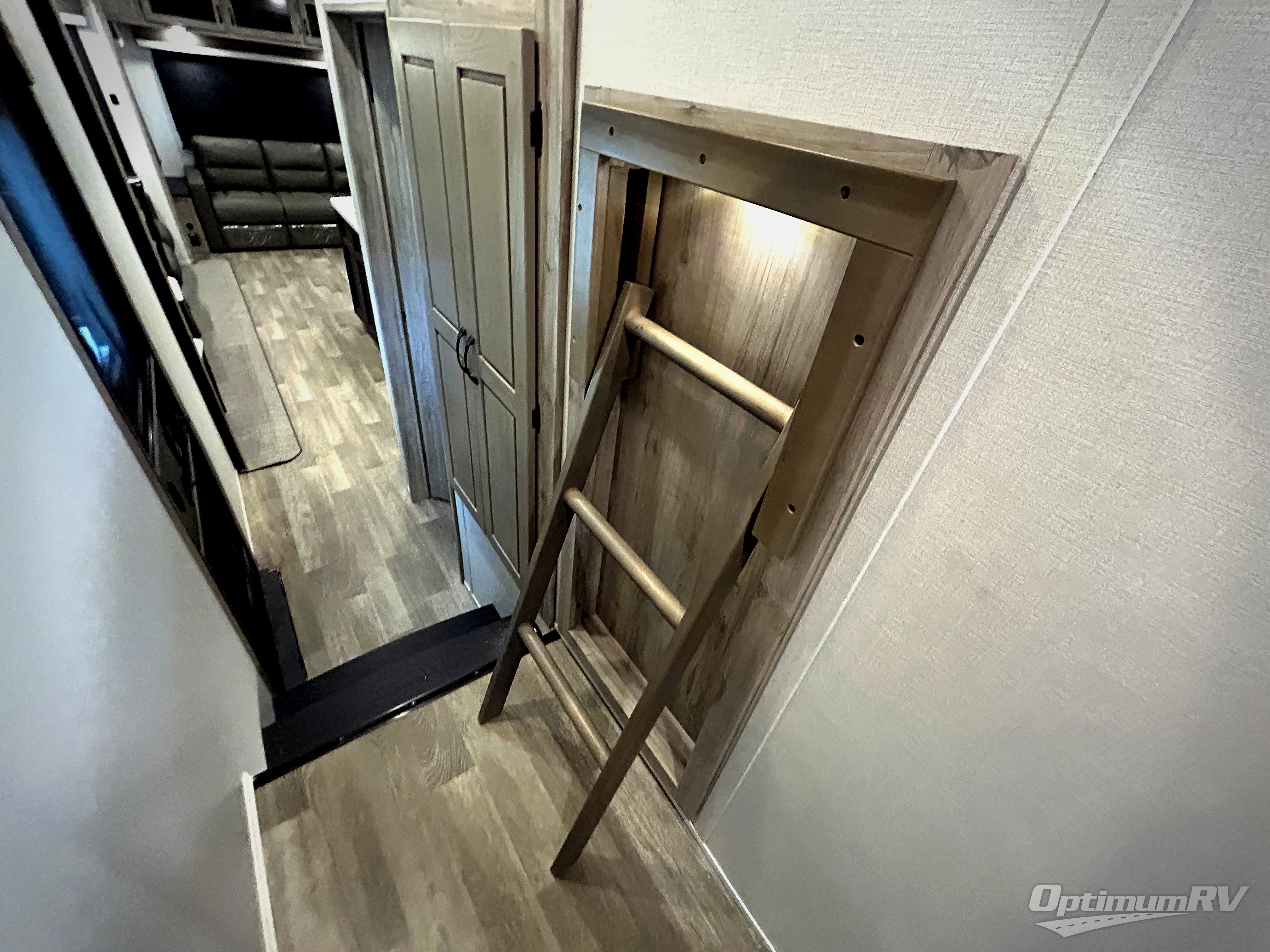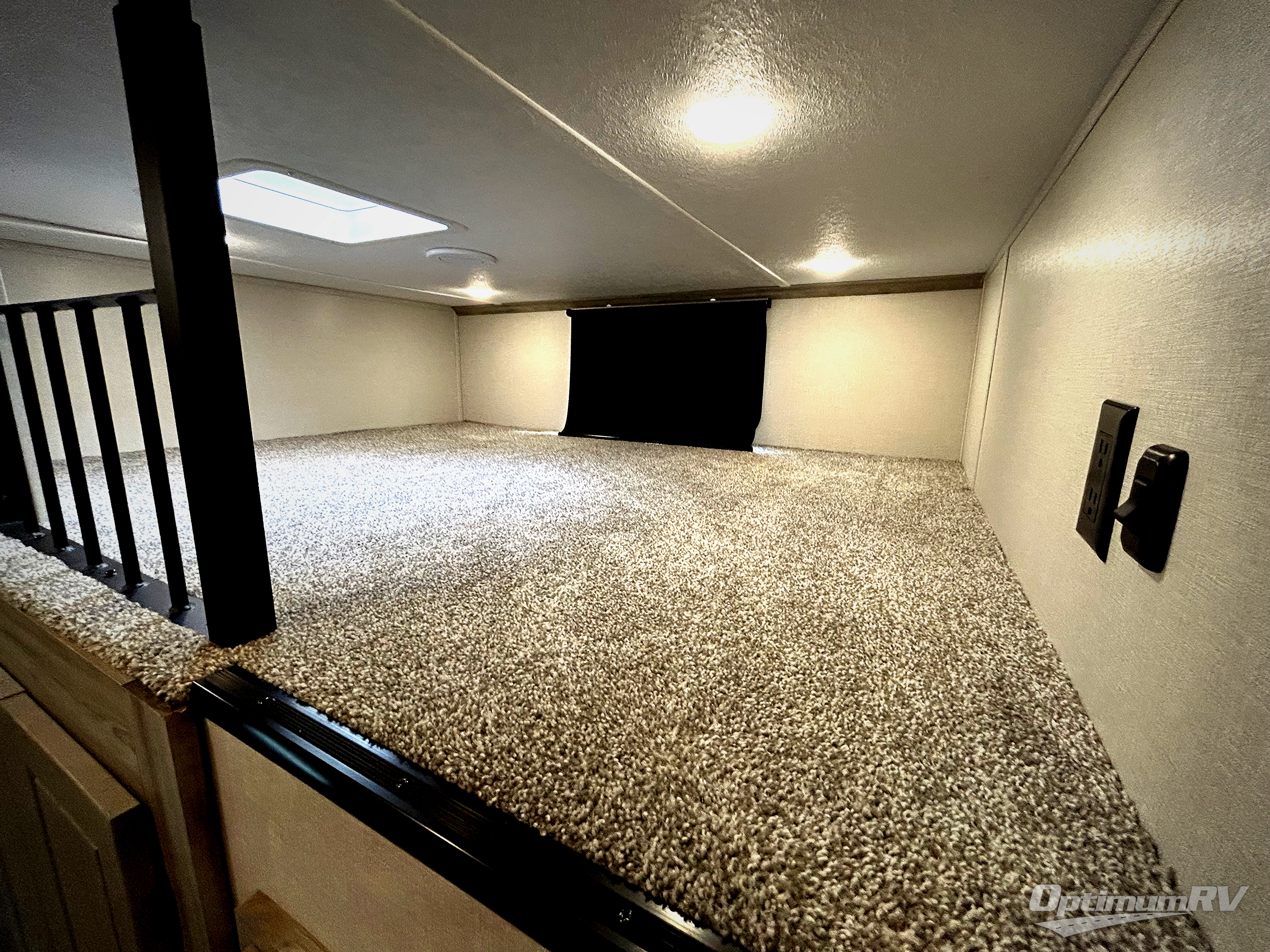 Spend your days at the lake and your evenings relaxing in this fifth wheel with four slide outs for tons of space. Your guests can claim the middle den to themselves that includes a tri-fold hide-a-bed sofa with a removable table, a wardrobe for their things, plus a loft above for the little ones. The chef of your crew will appreciate the kitchen island for extra counter space, and there are stainless steel appliances for added luxury. After dinner is cleaned up, relax on the theatre seating or on the rear tri-fold hide-a-bed sofa, or you may just want to be outside with the power to enjoy the evening air. This model also includes a front private bedroom with a king bed slide out, a dresser, plus a large wardrobe with washer and dryer prep. You may just decide to go full-time in this fifth wheel!