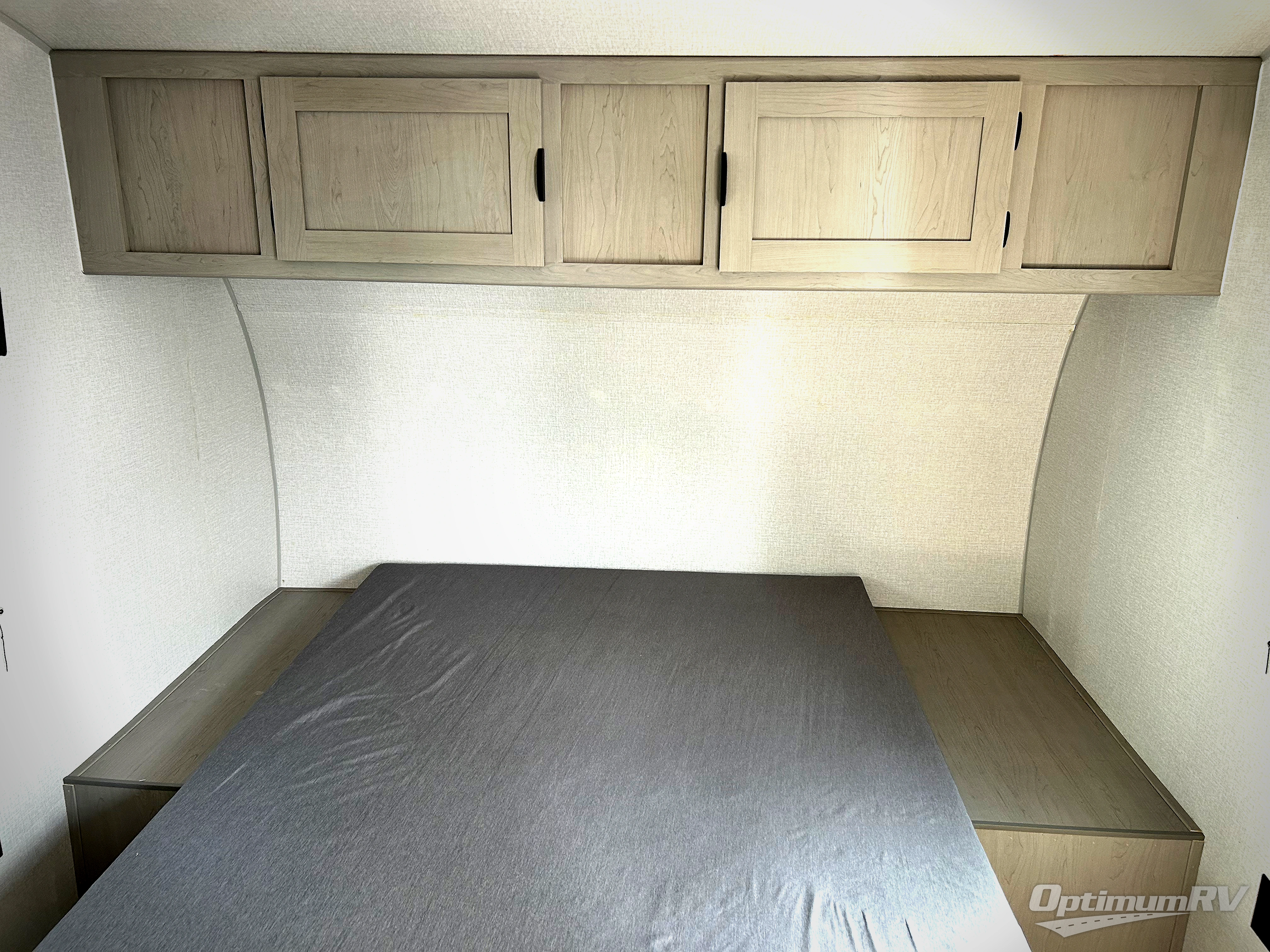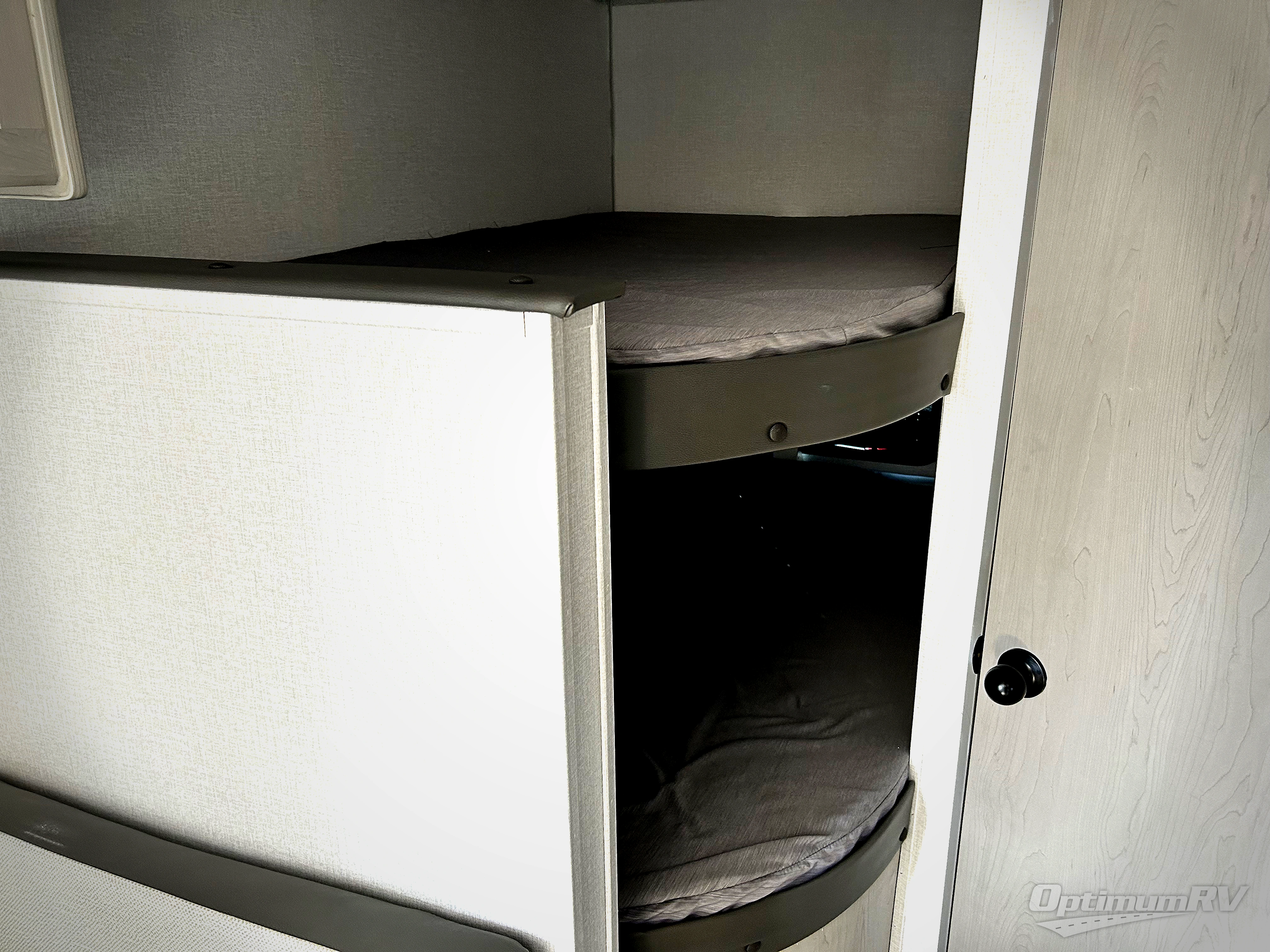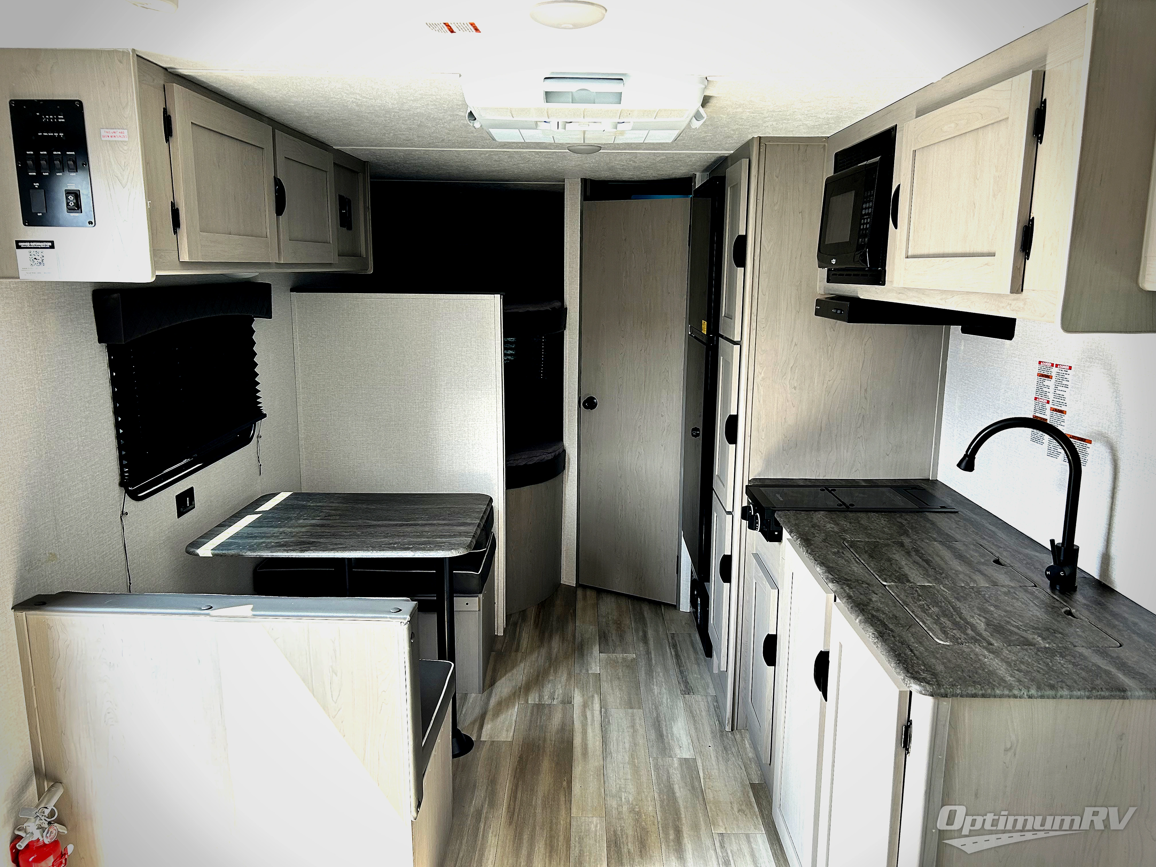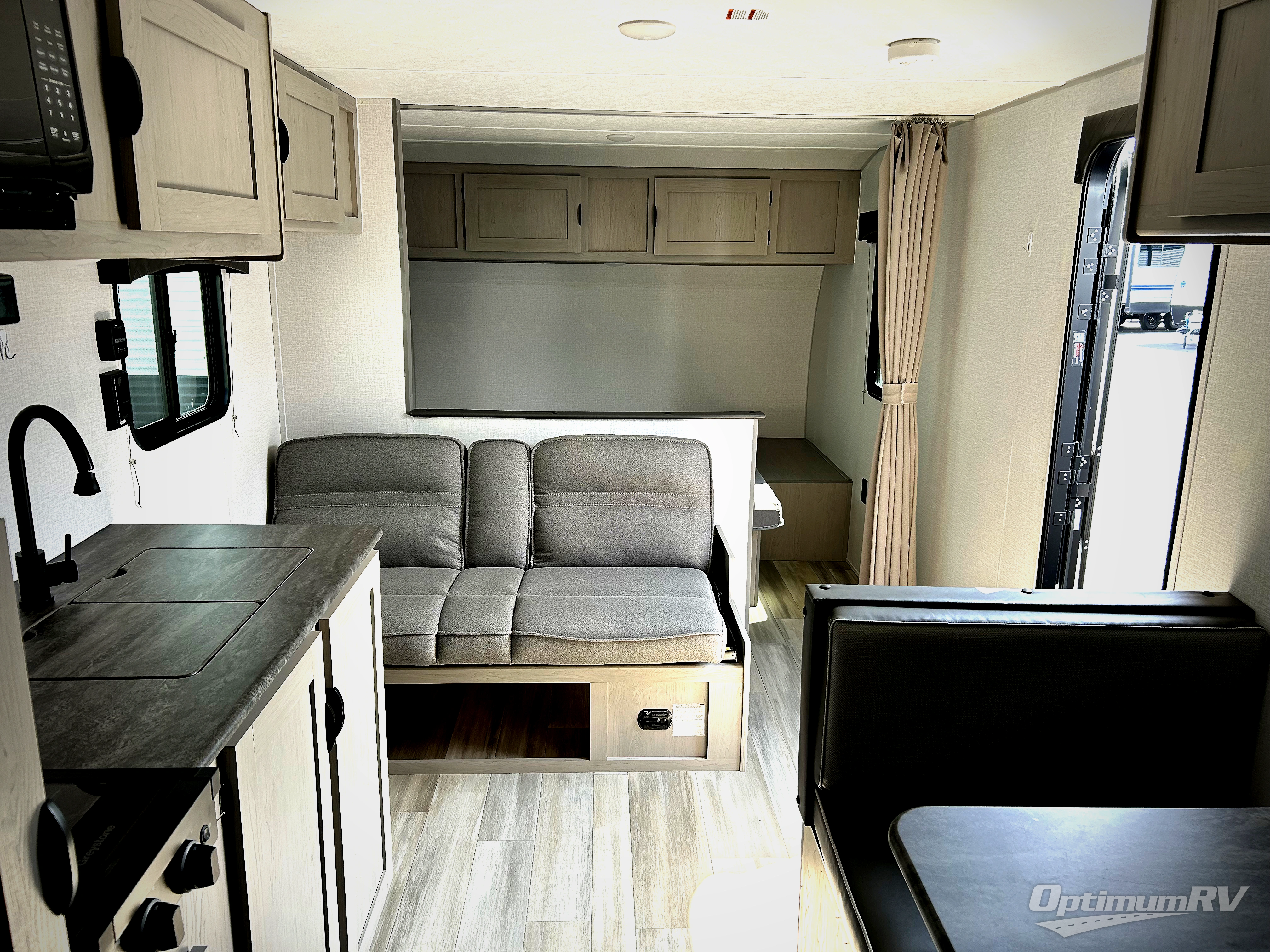 Bring the whole family with you in this travel trailer! The kiddos can sleep on the rear corner set of double bed bunks. The opposite rear corner features a full bath including a 24" x 36" shower, linen cabinet, toilet, and vanity with medicine cabinet overhead. In the main living space you will find plenty of seating with a booth dinette and jackknife sofa which can also transform into an extra sleeping space if needed. Everyone's bellies will stay full with the two burner cooktop, 11 cu. ft. 12-volt refrigerator, and microwave which you can use to pop a bag of popcorn for movie night. You will enjoy the front bedroom for a bit of privacy including a queen bed and large overhead cabinet for your things. On the outside, a large front pass-through for lawn chairs and camp gear. There is more storage beneath the double bed bunks in back and a nice 10' awning to provide protection from the elements when outdoors.