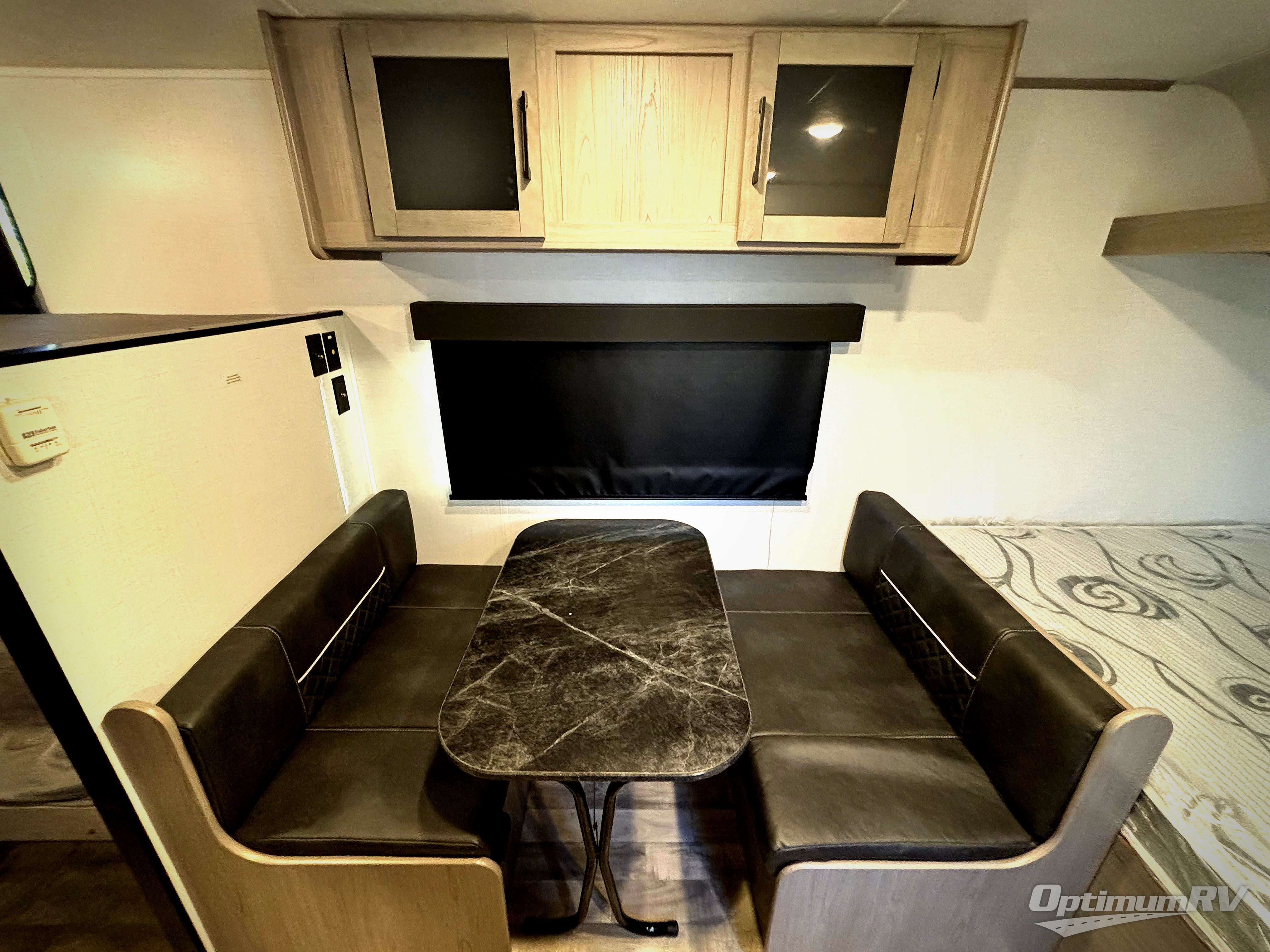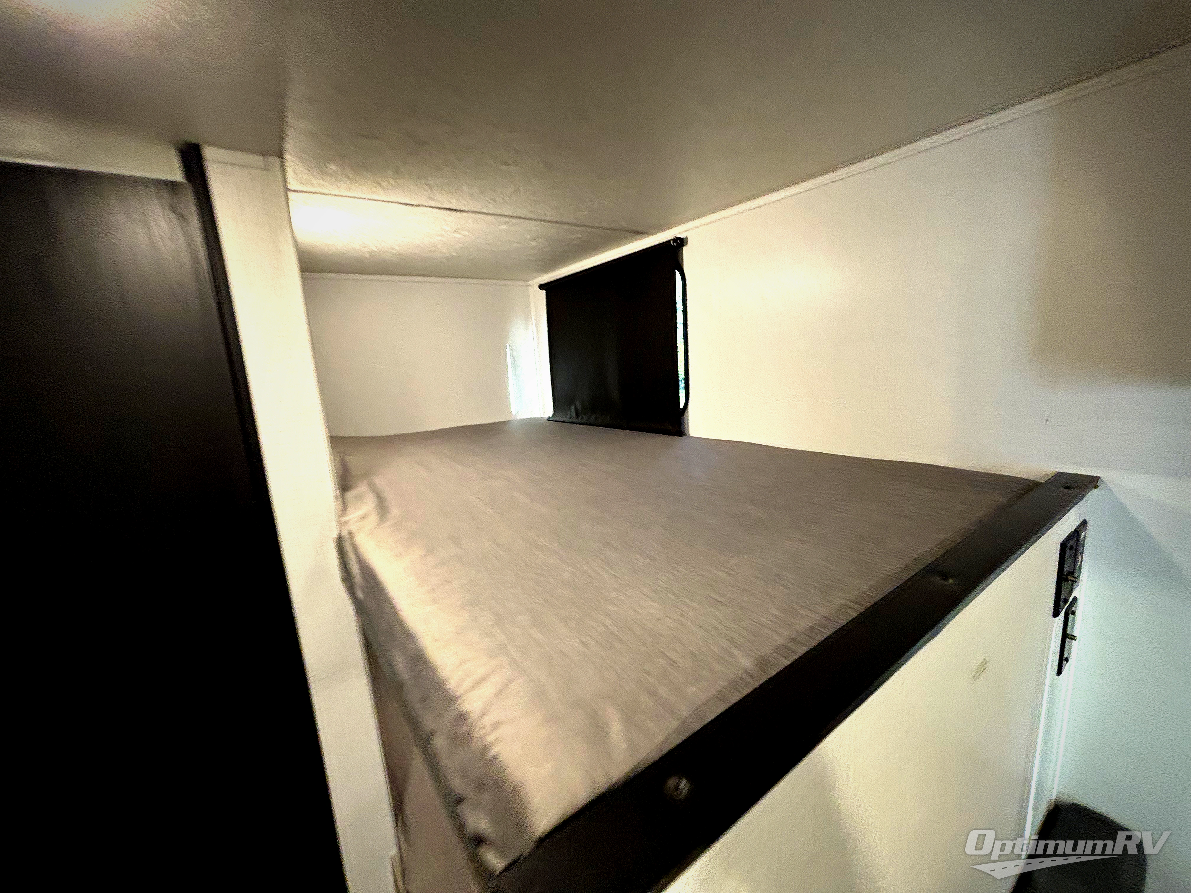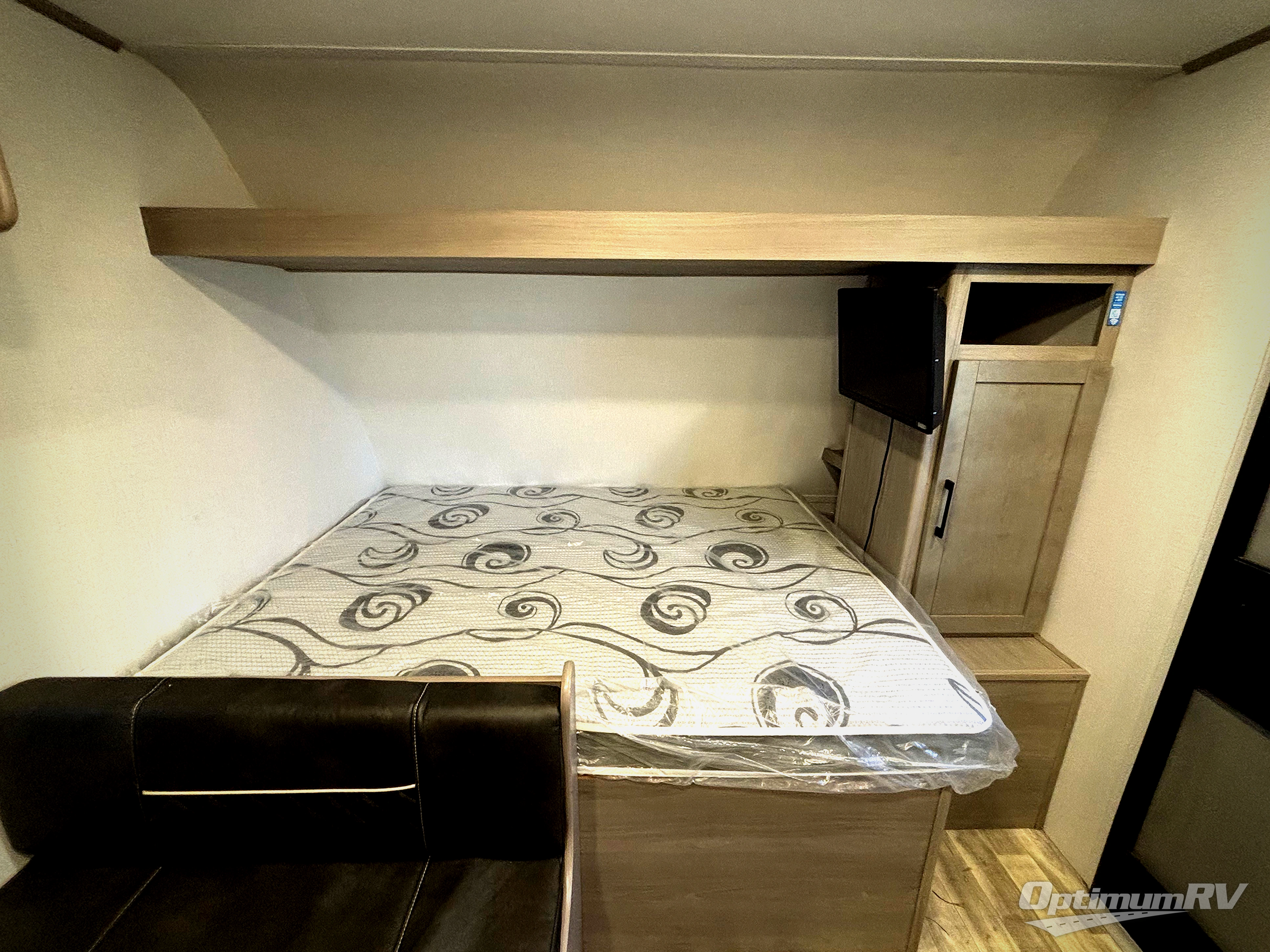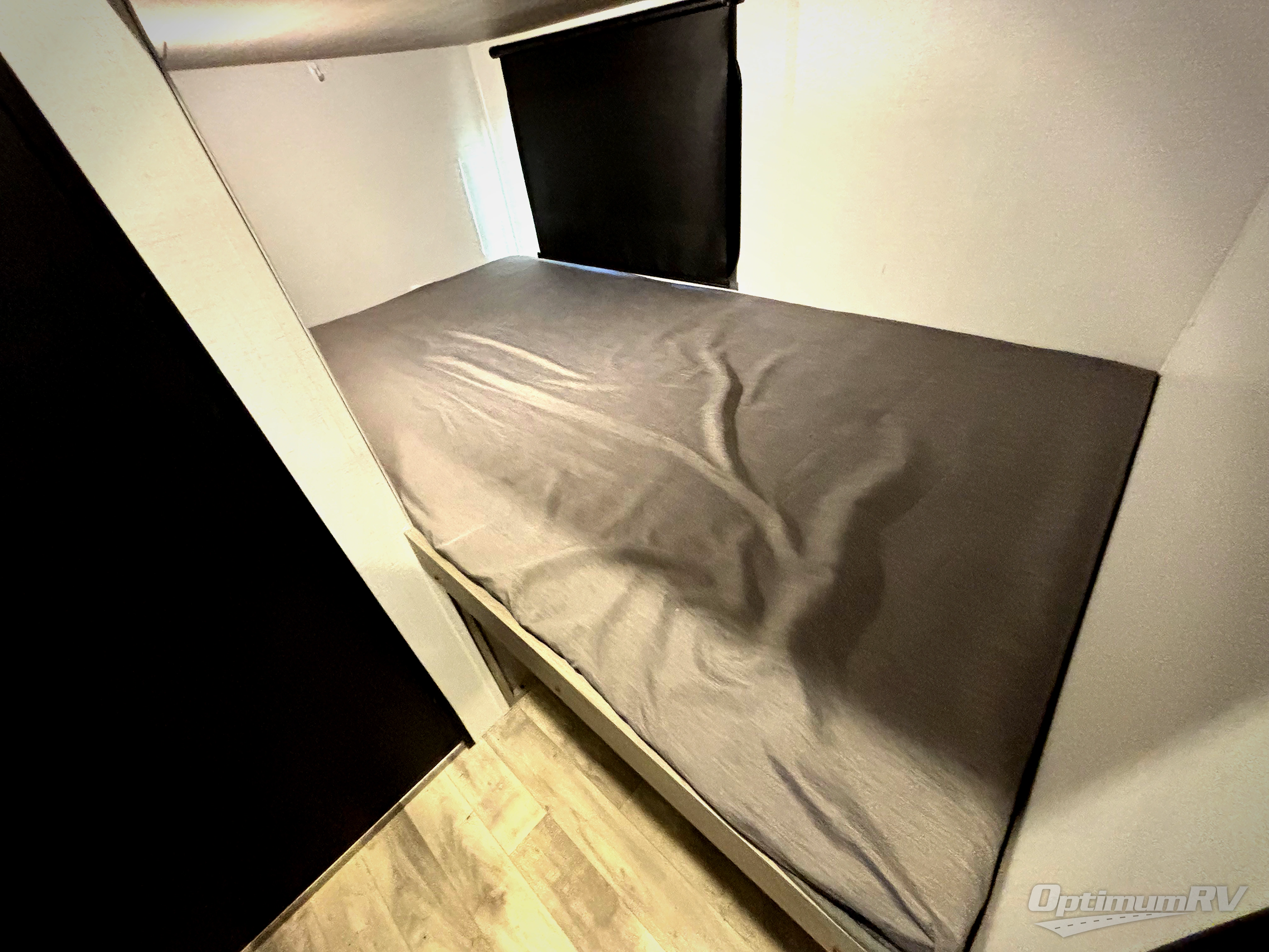 A perfect trailer for your family of three to five featuring a set of bunk beds for the kids, a queen bed up front for you, and the booth dinette that can be converted to sleep one or two more depending on size. This unit is cozy and convenient providing you just what you need to enjoy a little adventure away from home. For meals, there is a two burner cooktop and sink, plus a 10 cu. ft. 12V refrigerator for your perishables. Overhead cabinetry can be found along both sides for your dishes and things. You will all appreciate the convenience of having your own private shower and toilet so that you don't need to use the campground facilities at night. If you enjoy spending time outside, a 13' awning is available to provide even more living space outdoors!