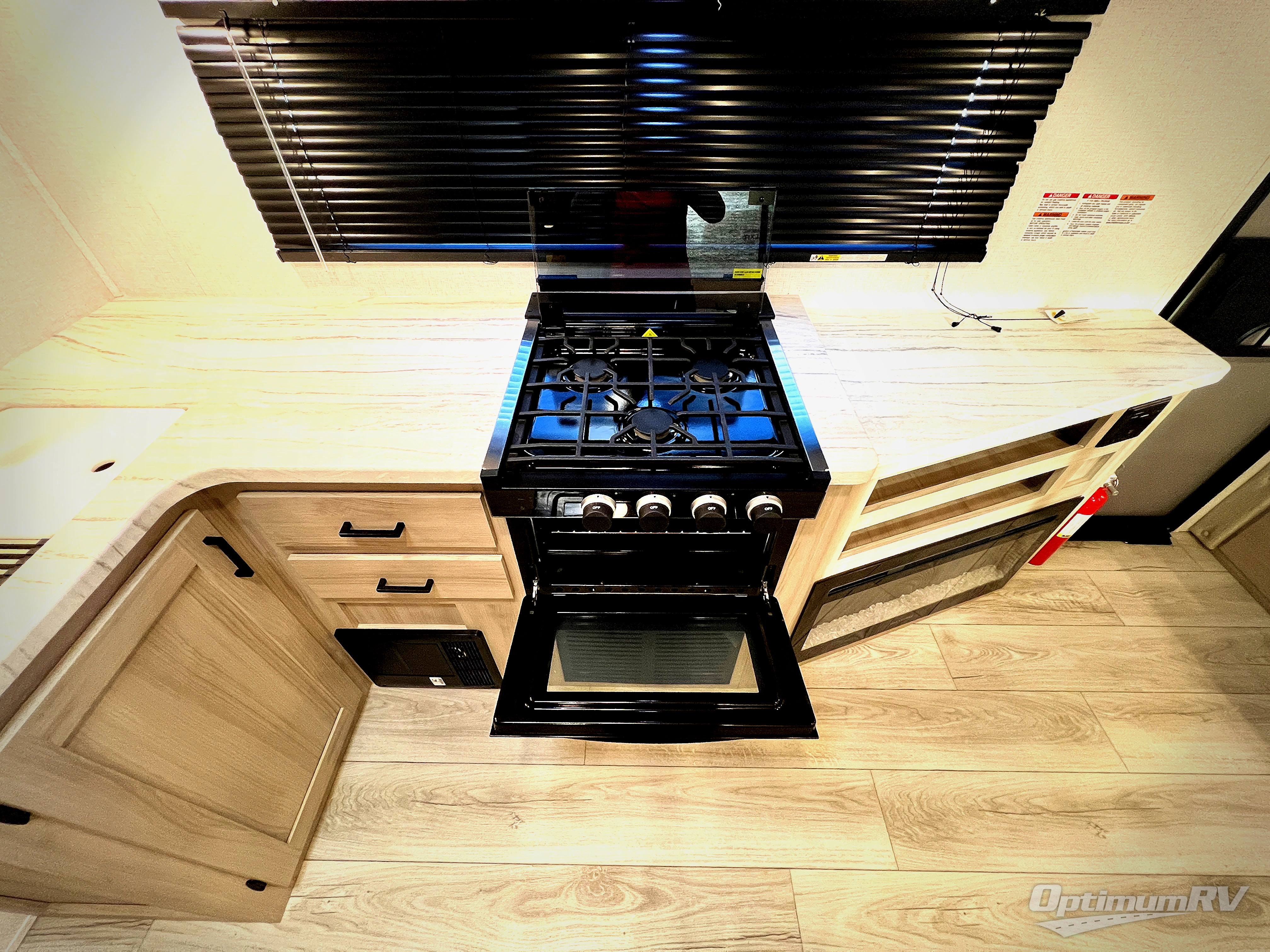 When you are wanting a little more interior space in your next travel trailer, take a look inside! This large slide out widens the main living space so you can easily make meals using full amenities without having to move for someone walking from the front bedroom and walk-through bath to the u-shaped dinette in the back. For sleeping, there is a king-size bed with storage on both sides at the very front of this unit giving you privacy from the rest, and even a private second entry/exit door from within the bedroom. You will find storage beneath the bed for larger items or extra blankets, plus a space saving sliding door. The U-shaped dinette and jack knife sofa offer comfortable seating as well as extra sleeping space for overnight guests, and the fireplace is just a nice feature to enjoy. On the outside, an 18' awning provides a large outdoor living area protected from the elements, and the oversized pass-through will house all of your exterior gear like lawn chairs, outdoor games and rugs, plus so much more!