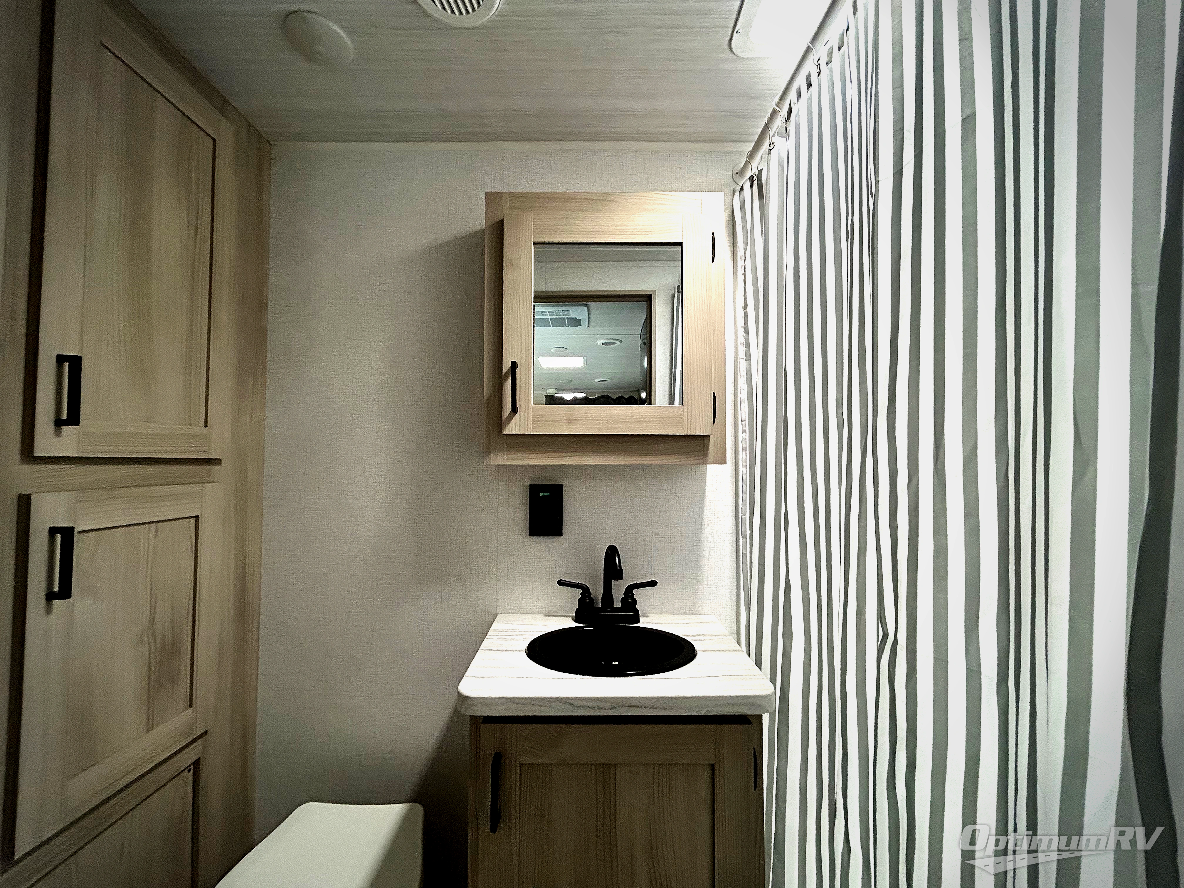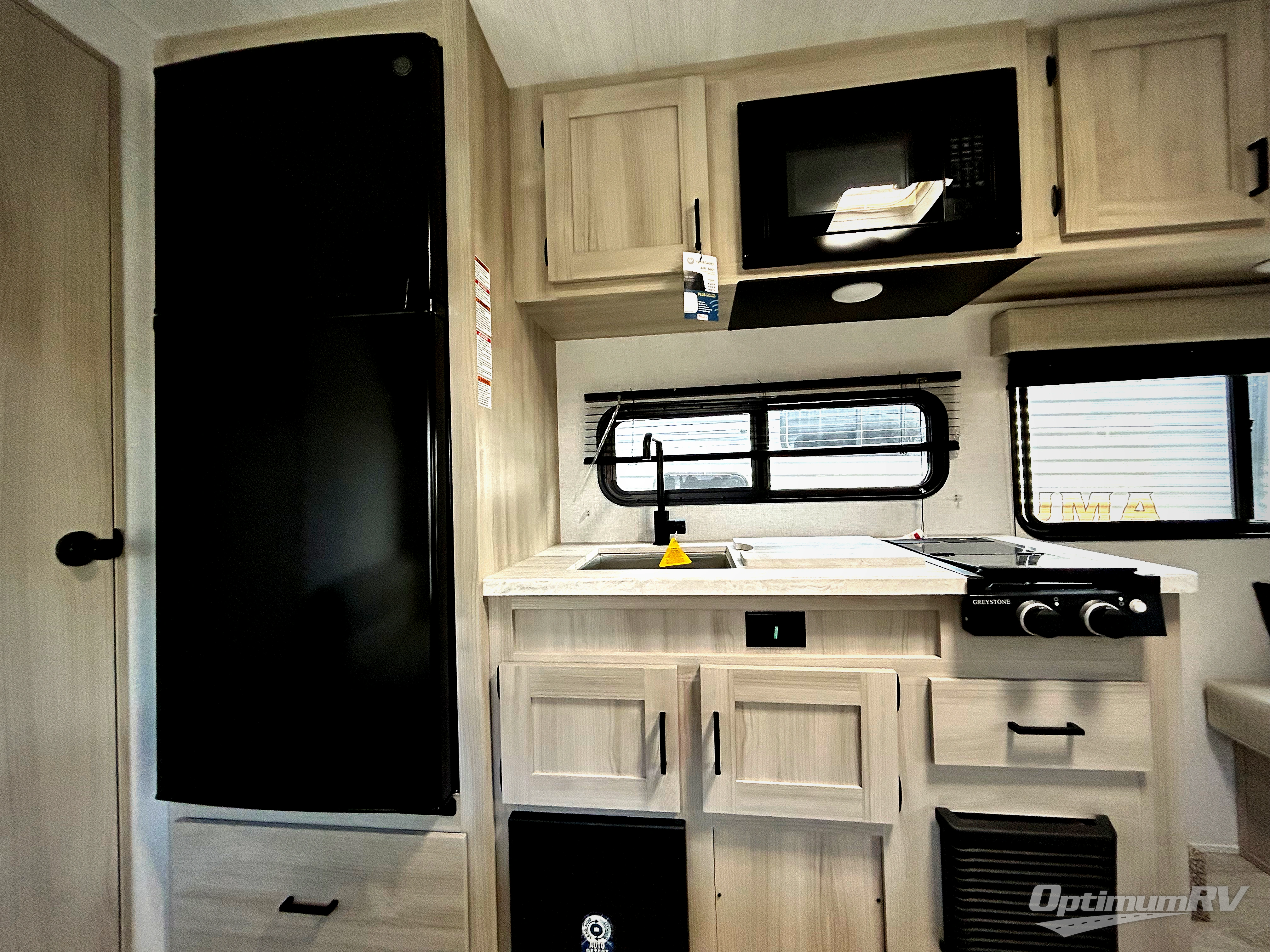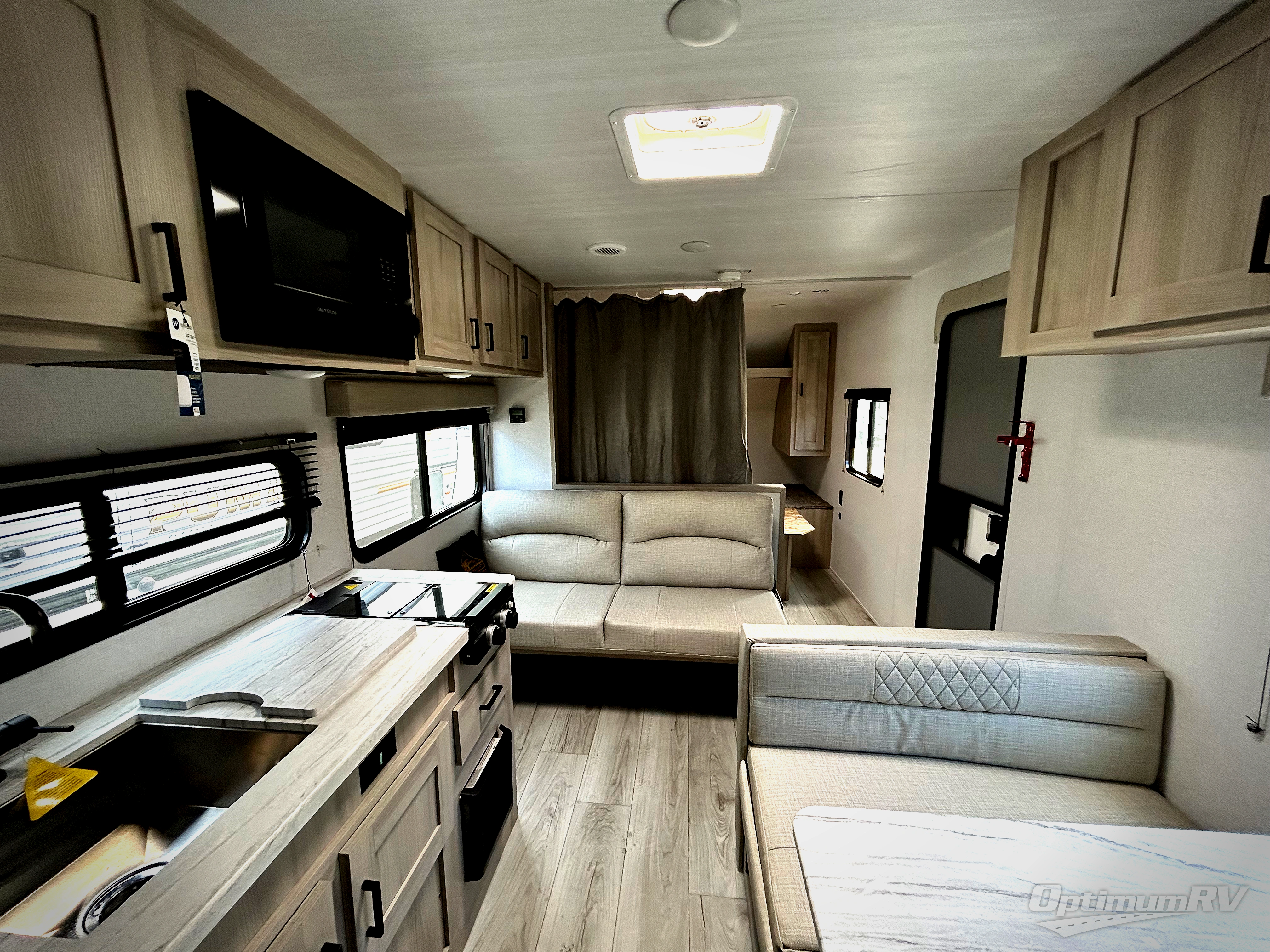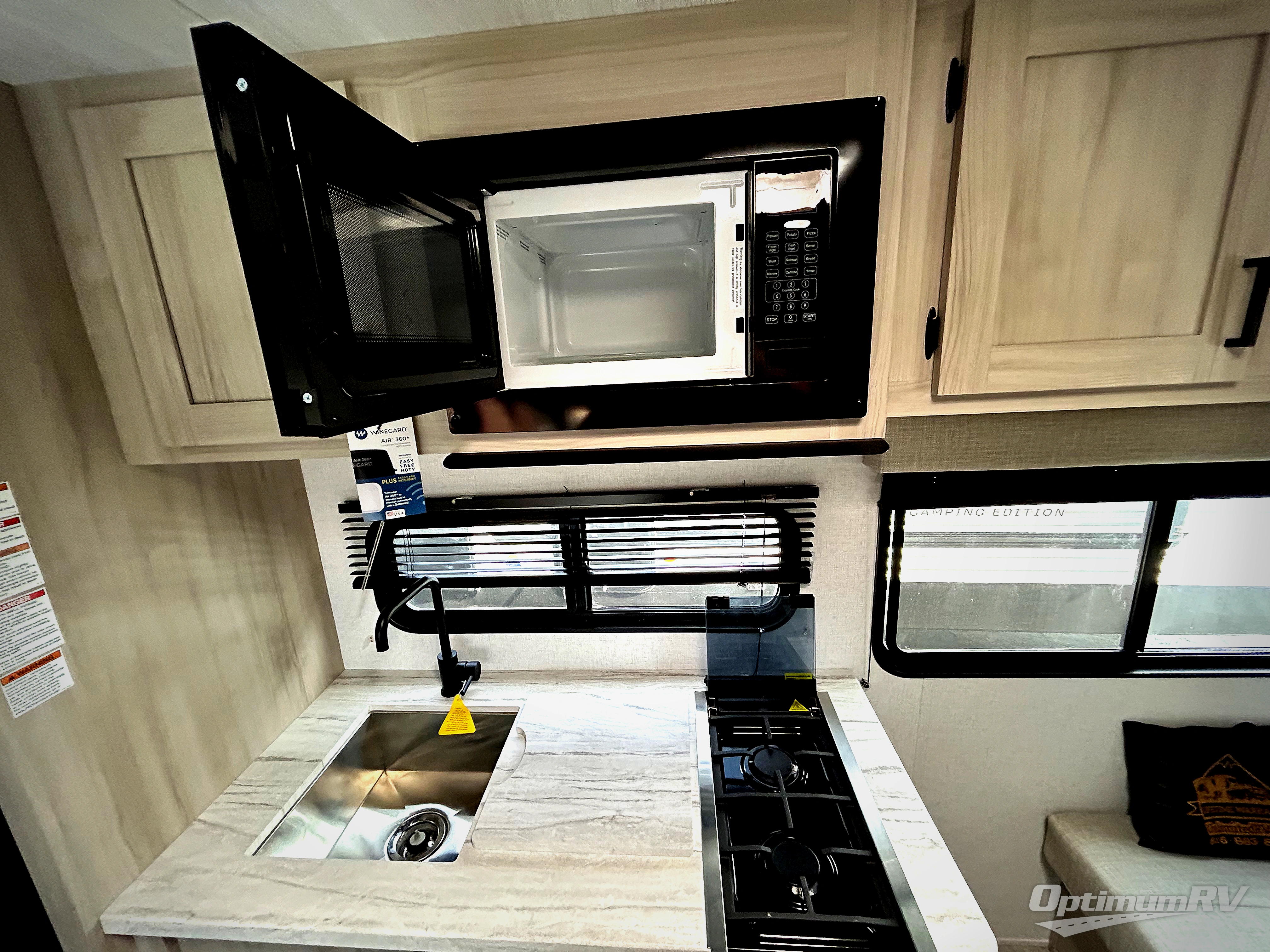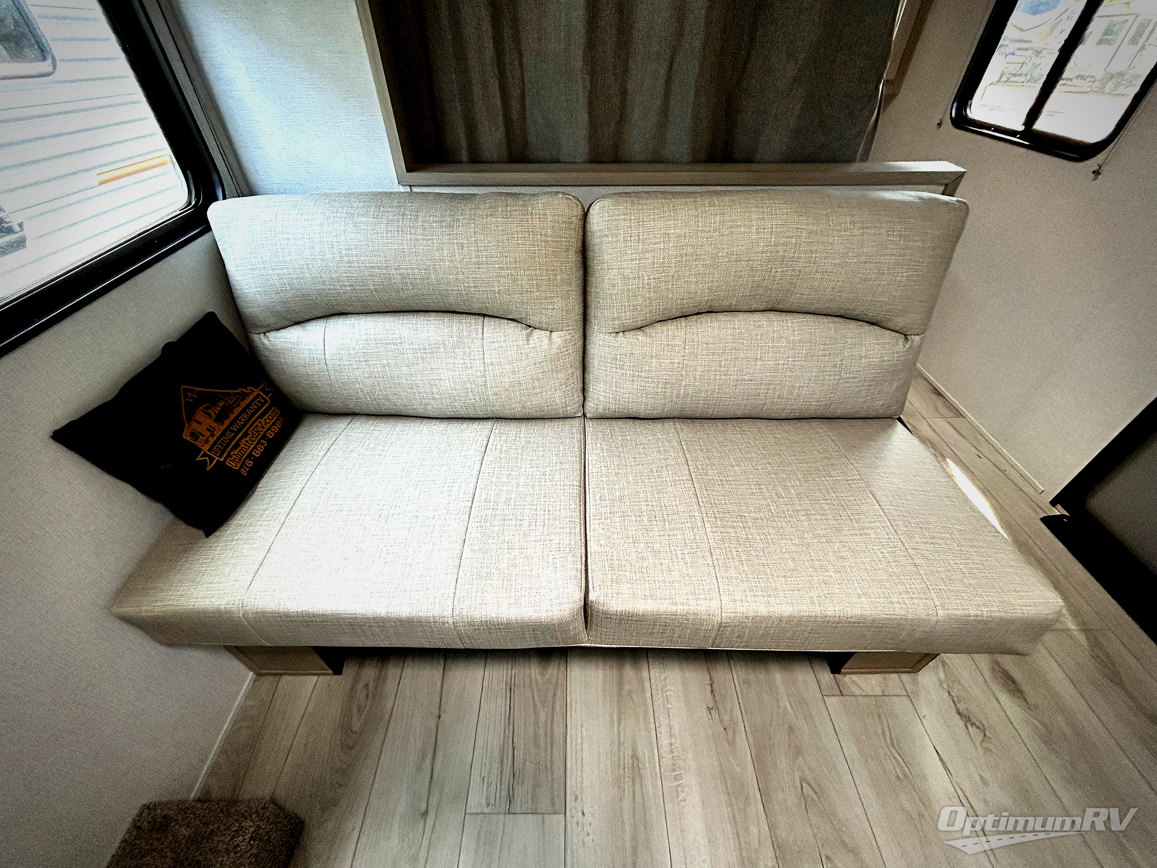 Head to your favorite camping spot in this travel trailer for four to five campers! You will love waking up each morning on the 72" x 80" king bed that includes storage underneath plus dual wardrobes to keep your clothes wrinkle-free. The full rear bath with a 24" x 40" walk-in shower will let you freshen up, and the linen closet here is convenient for towels and toiletries. Head to the kitchen where you can make breakfast on the two burner cooktop or make instant oatmeal in the microwave oven. There is a booth dinette and jack knife sofa for seating space, or you might just want to sit outdoors under the 15' power awning!
