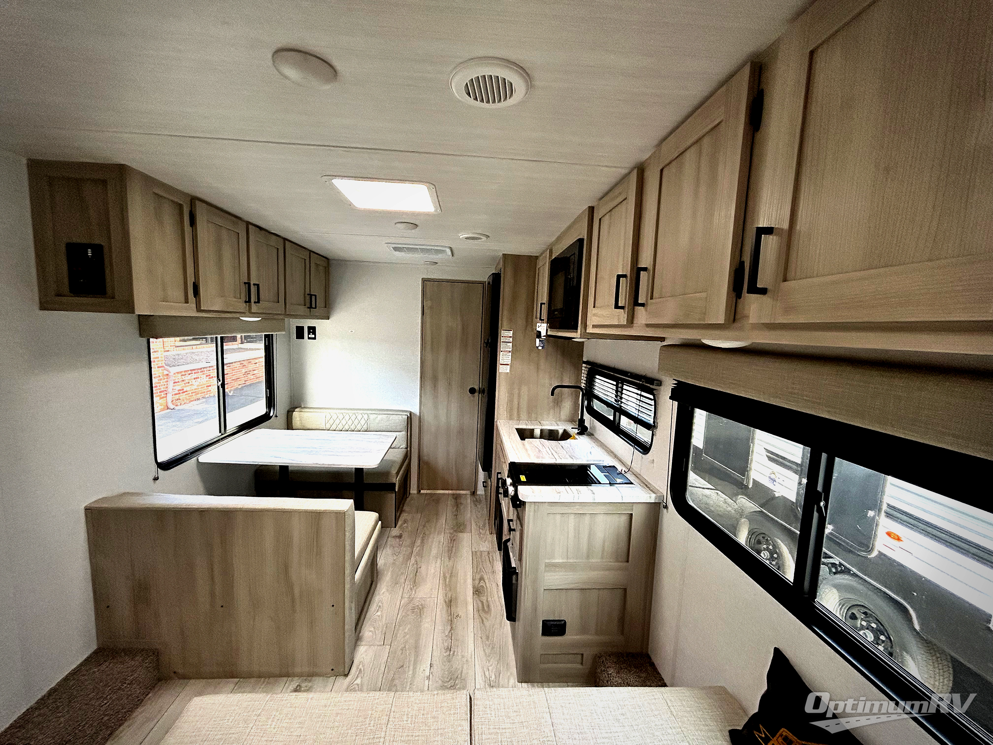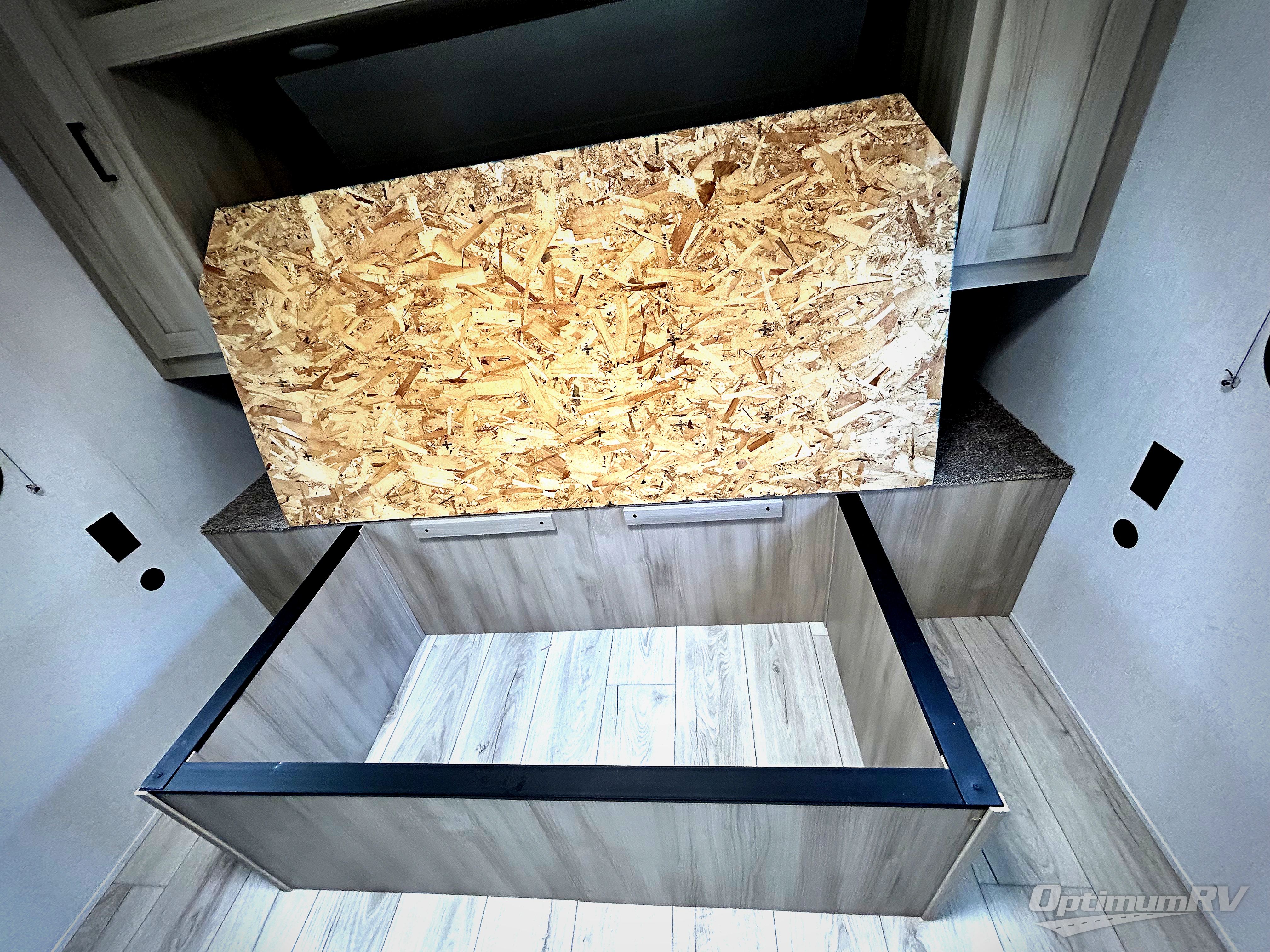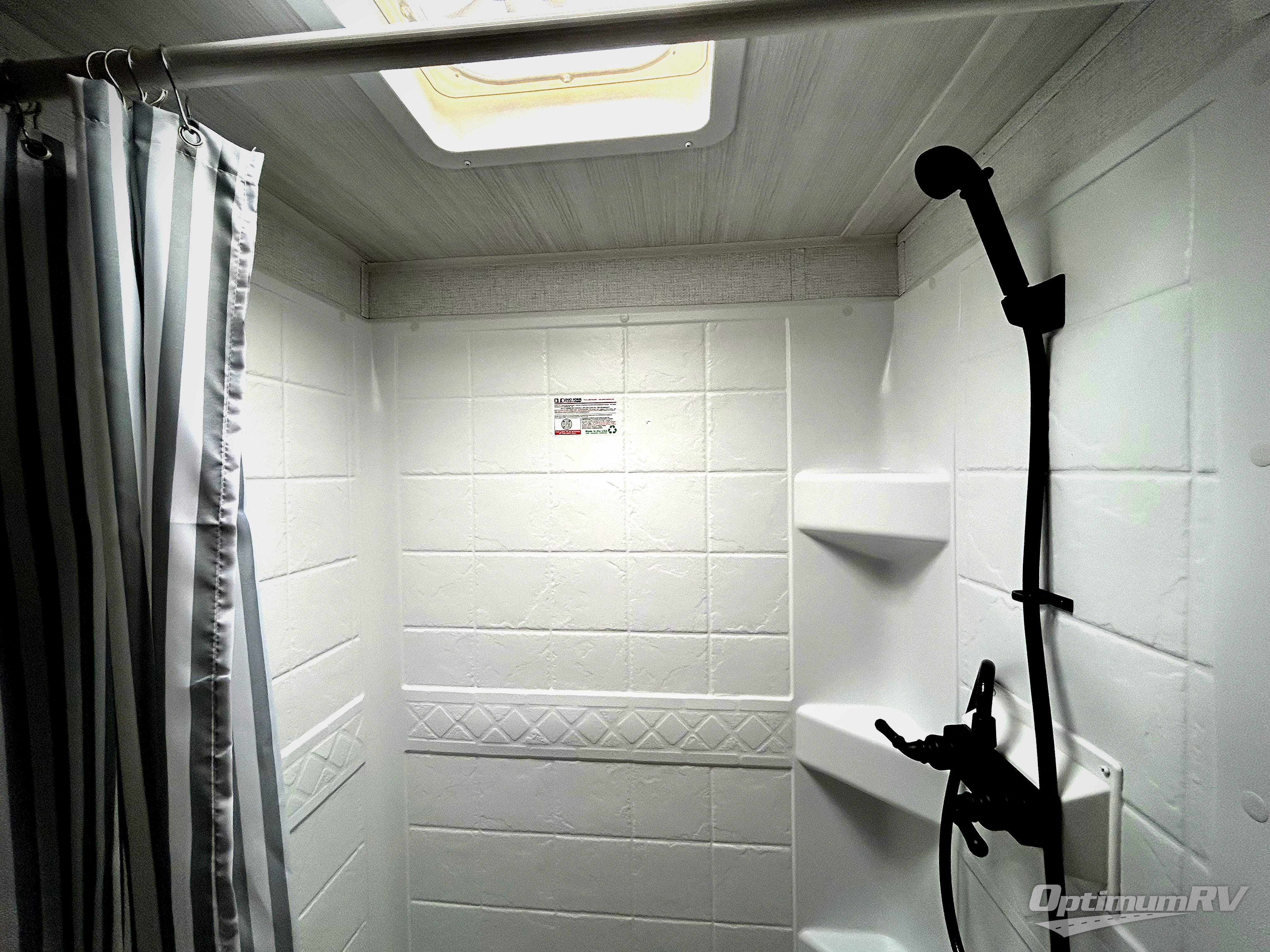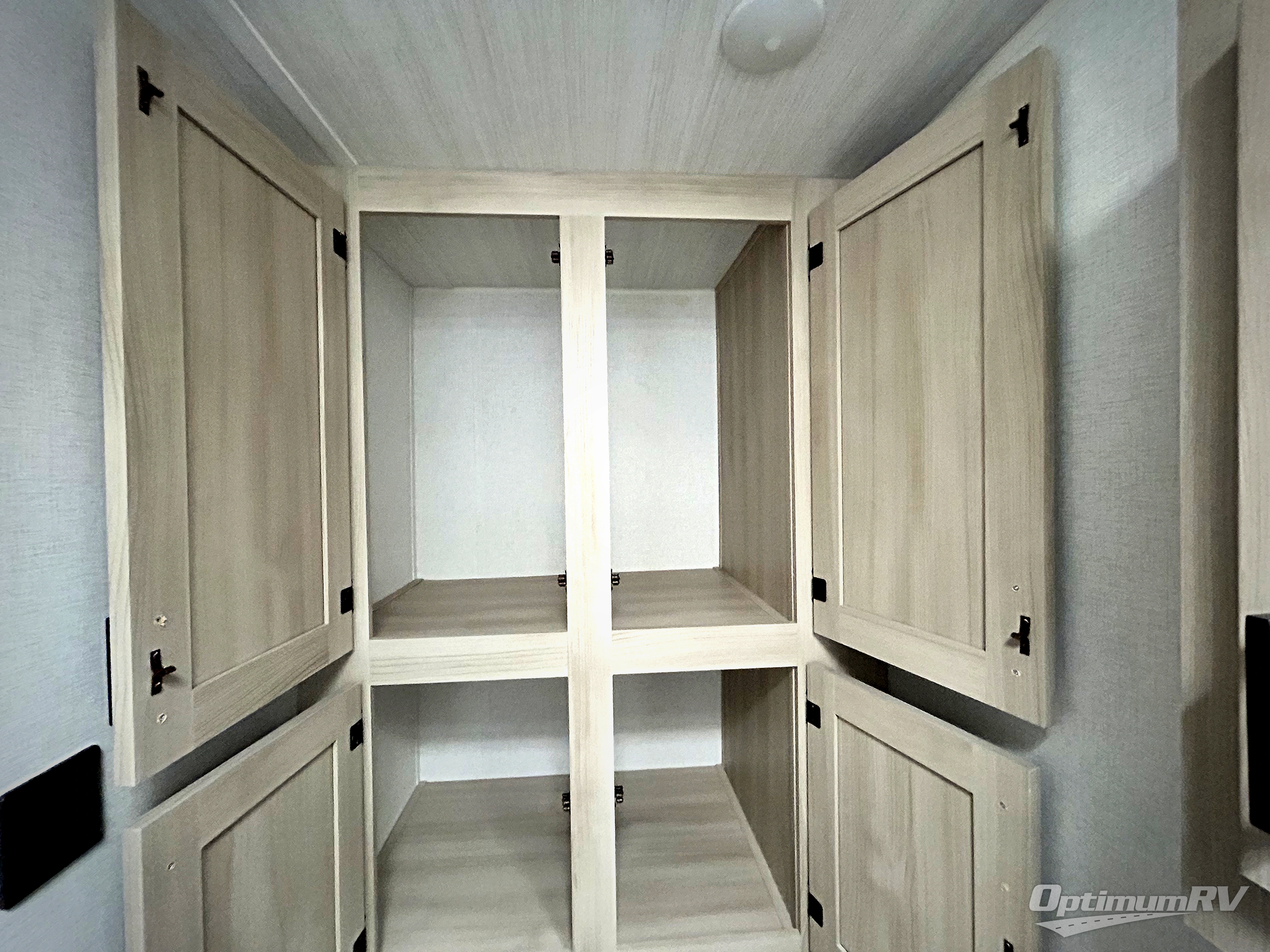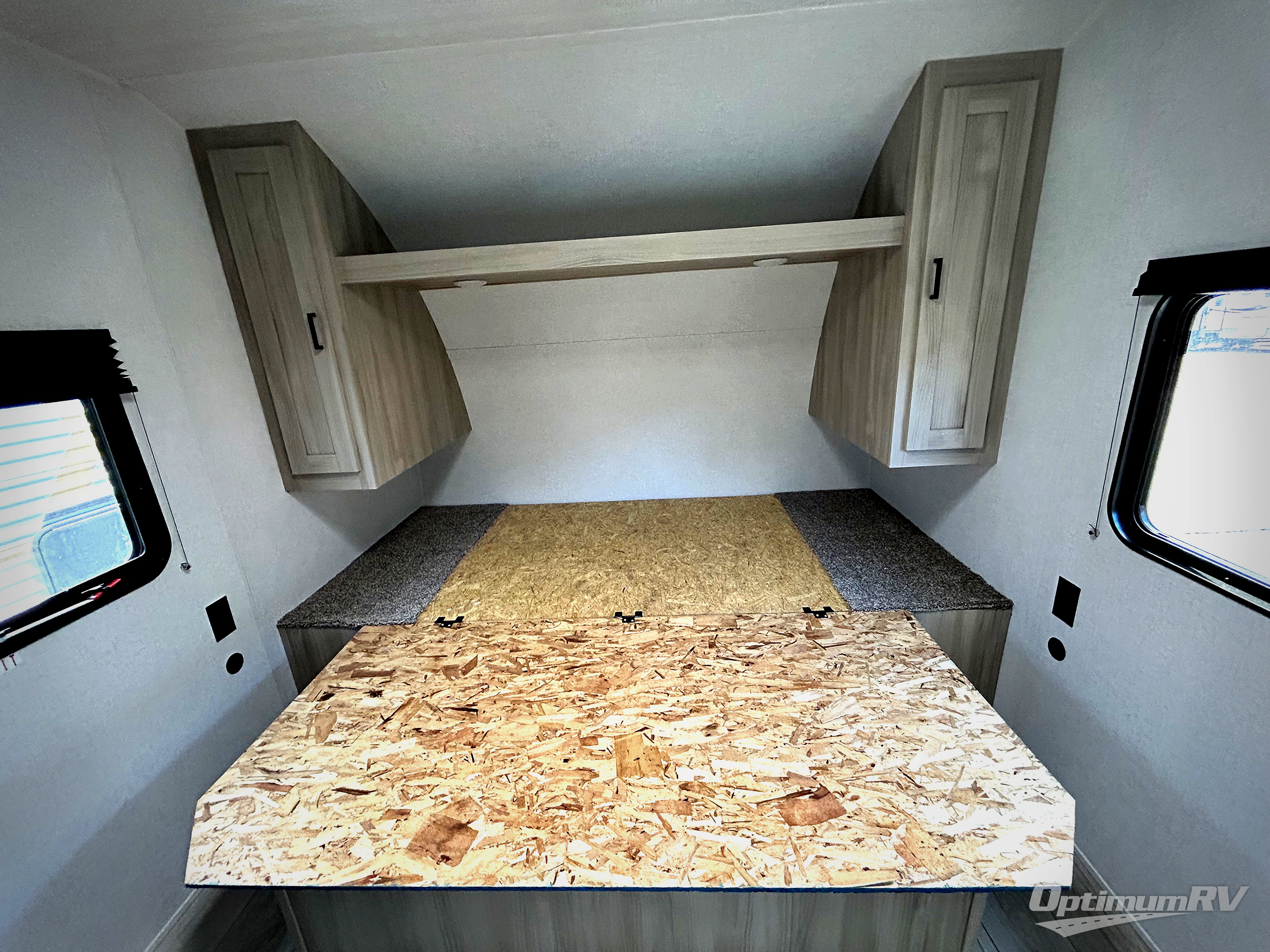 Head to your favorite camping spot in this travel trailer for four to five campers! You will love waking up each morning on the 72" x 80" king bed that includes storage underneath plus dual wardrobes to keep your clothes wrinkle-free. The full rear bath with a 24" x 40" walk-in shower will let you freshen up, and the linen closet here is convenient for towels and toiletries. Head to the kitchen where you can make breakfast on the two burner cooktop or make instant oatmeal in the microwave oven. There is a booth dinette and jack knife sofa for seating space, or you might just want to sit outdoors under the 15' power awning!